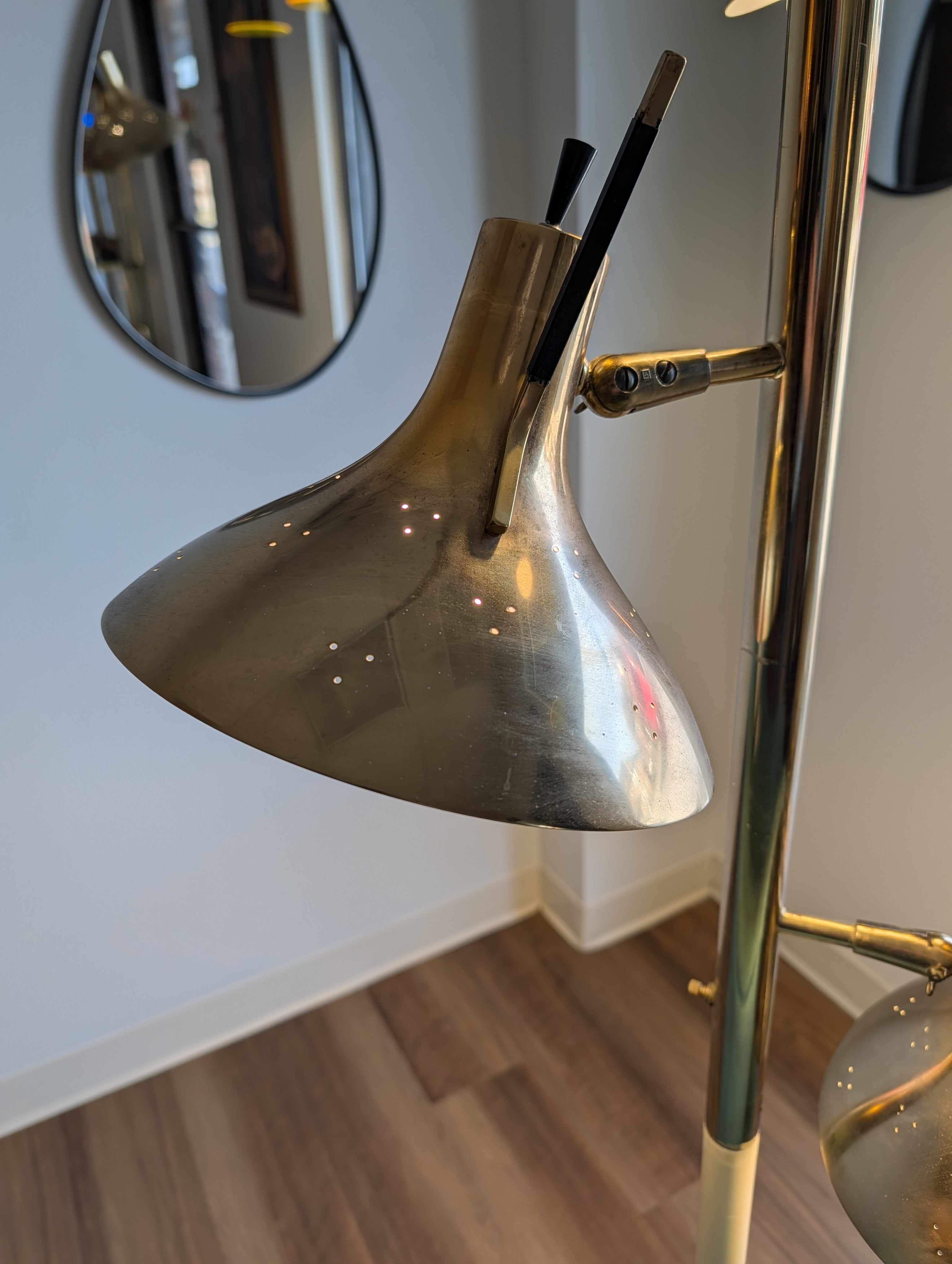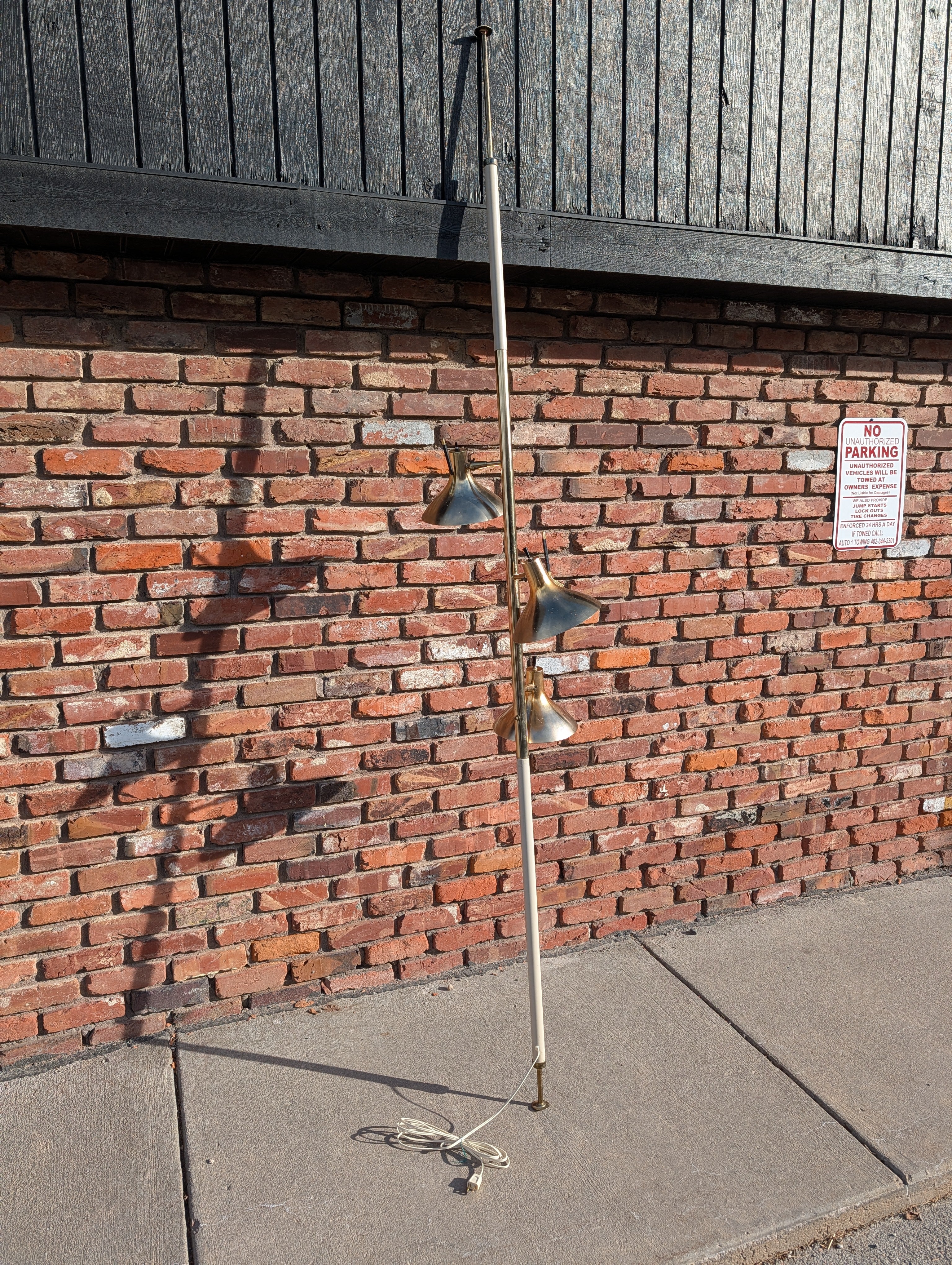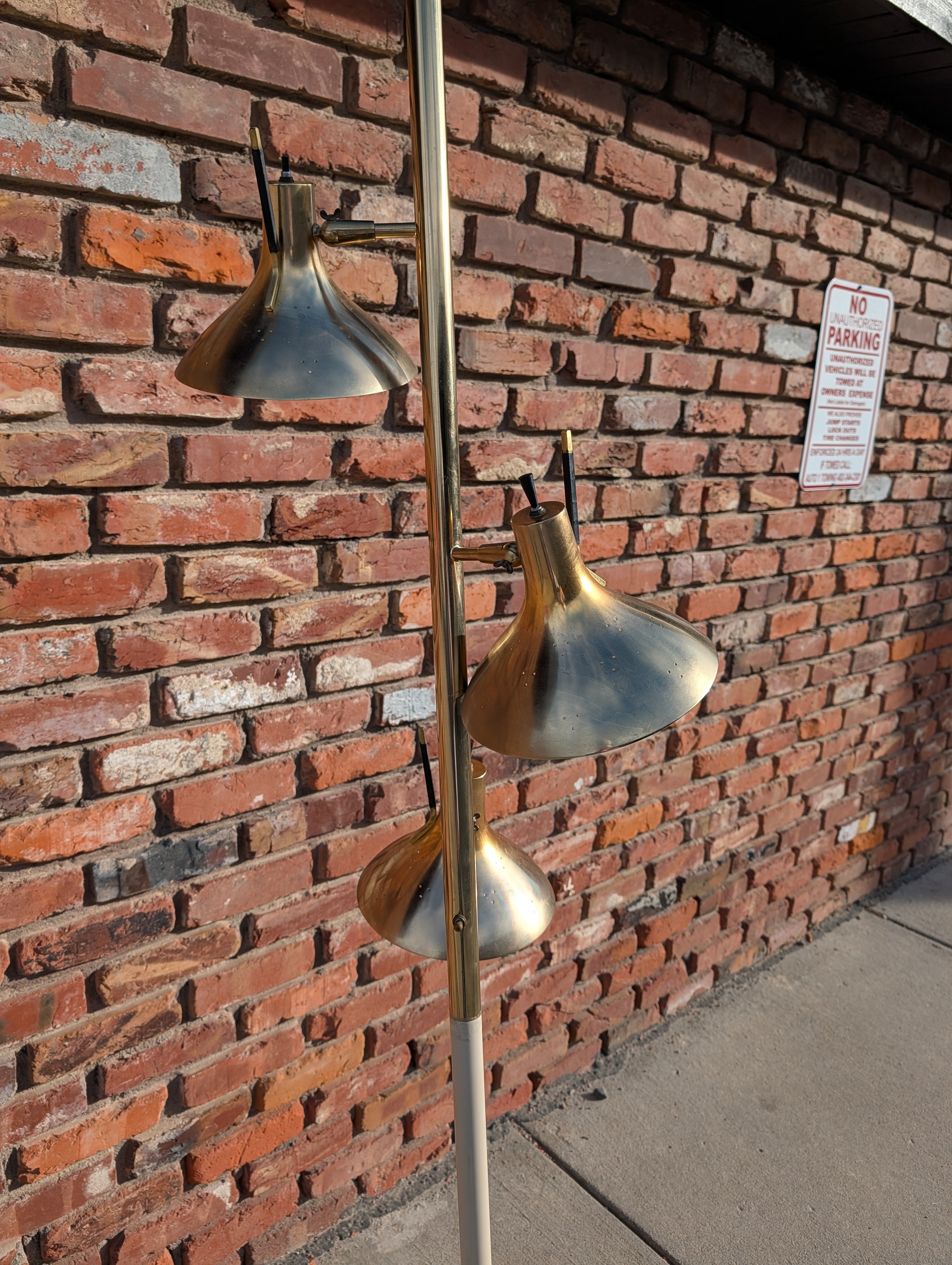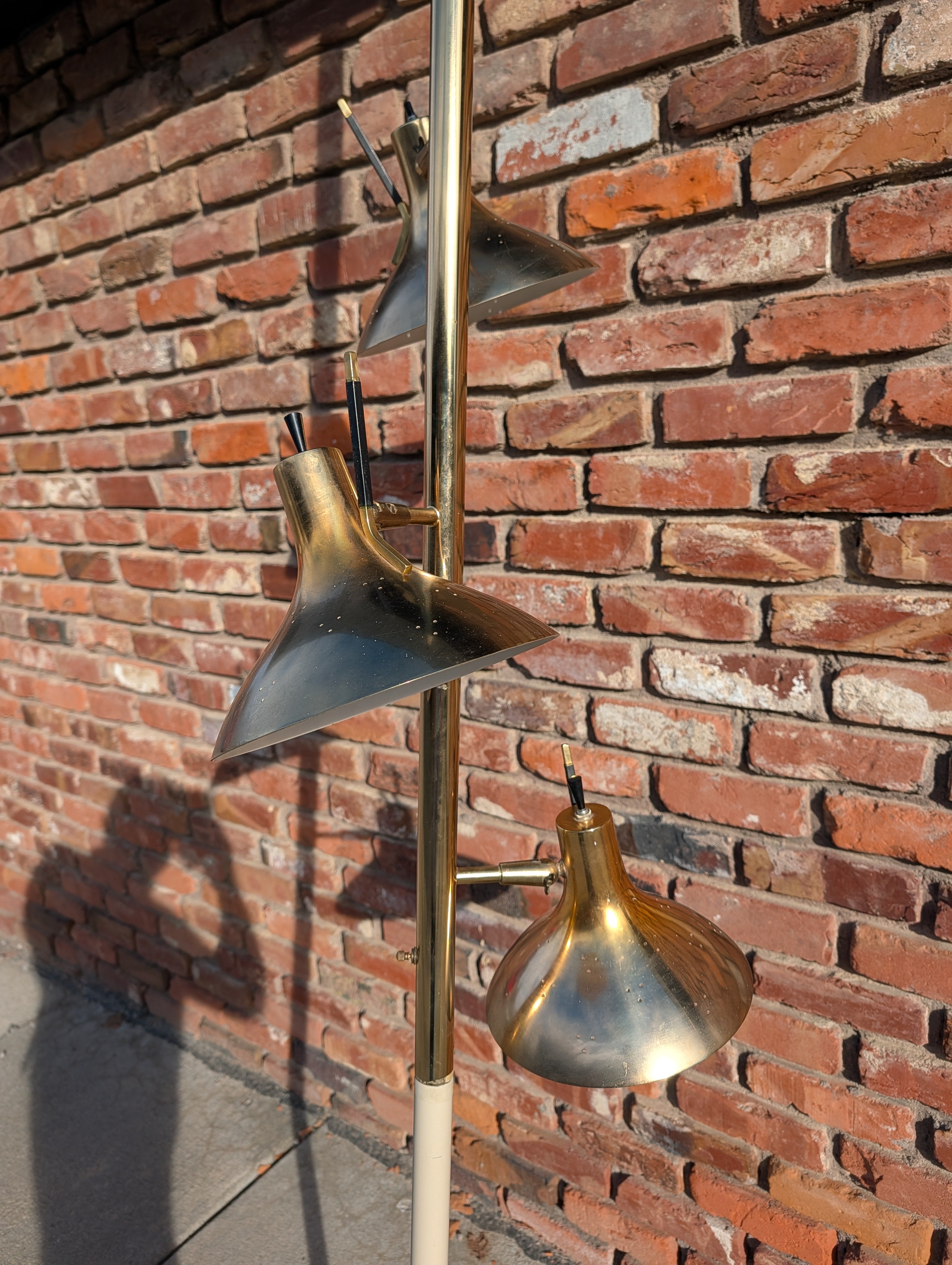 Illuminate your space with this multi-level gorgeous pole lamp! There are three shapely brass shades on the brass and painted pole. Illuminate one bulb at a time, or all three. All three shades articulate, swivel, aim them where you'd like light! Has a new cord and plug and LED bulbs.