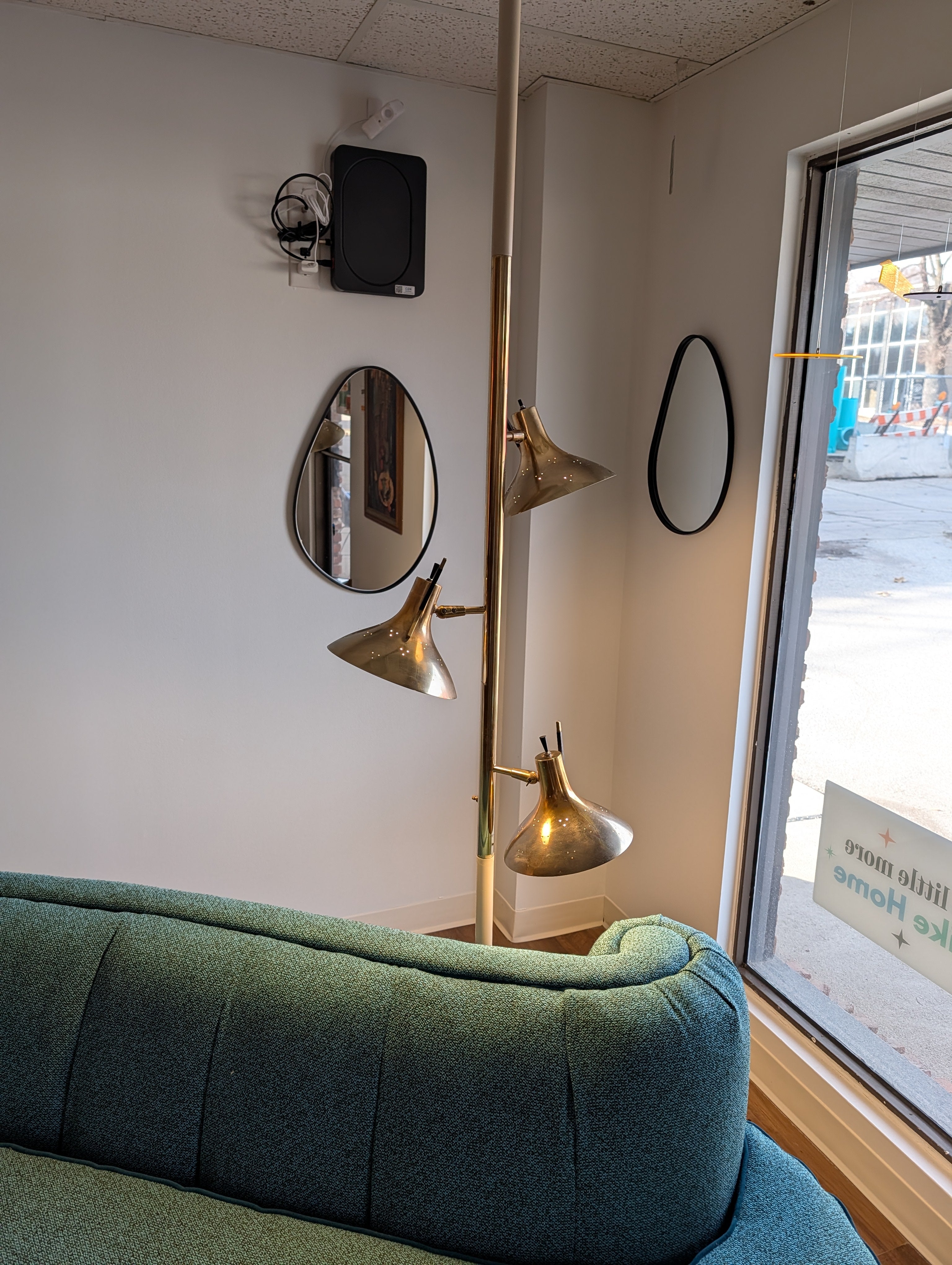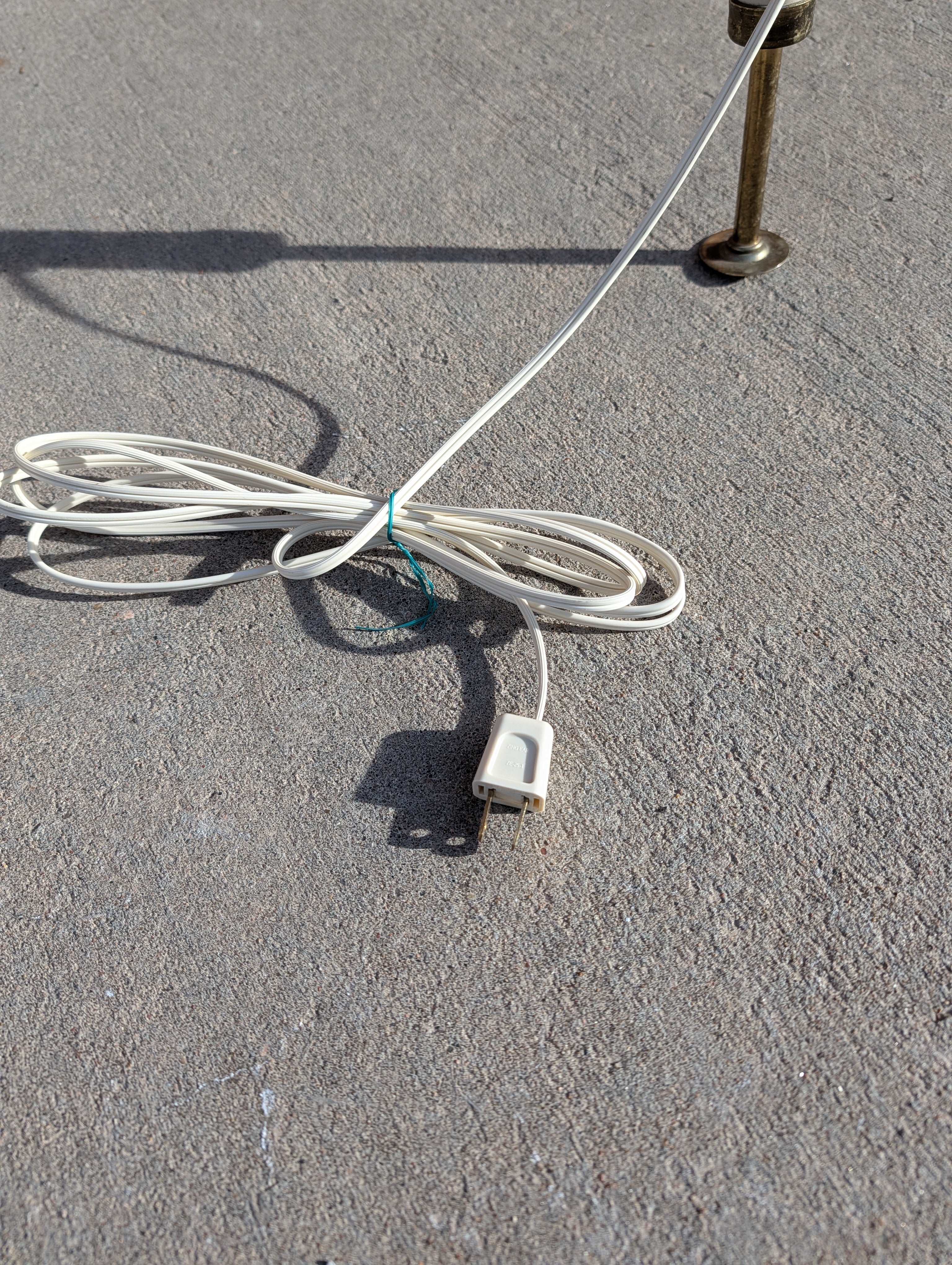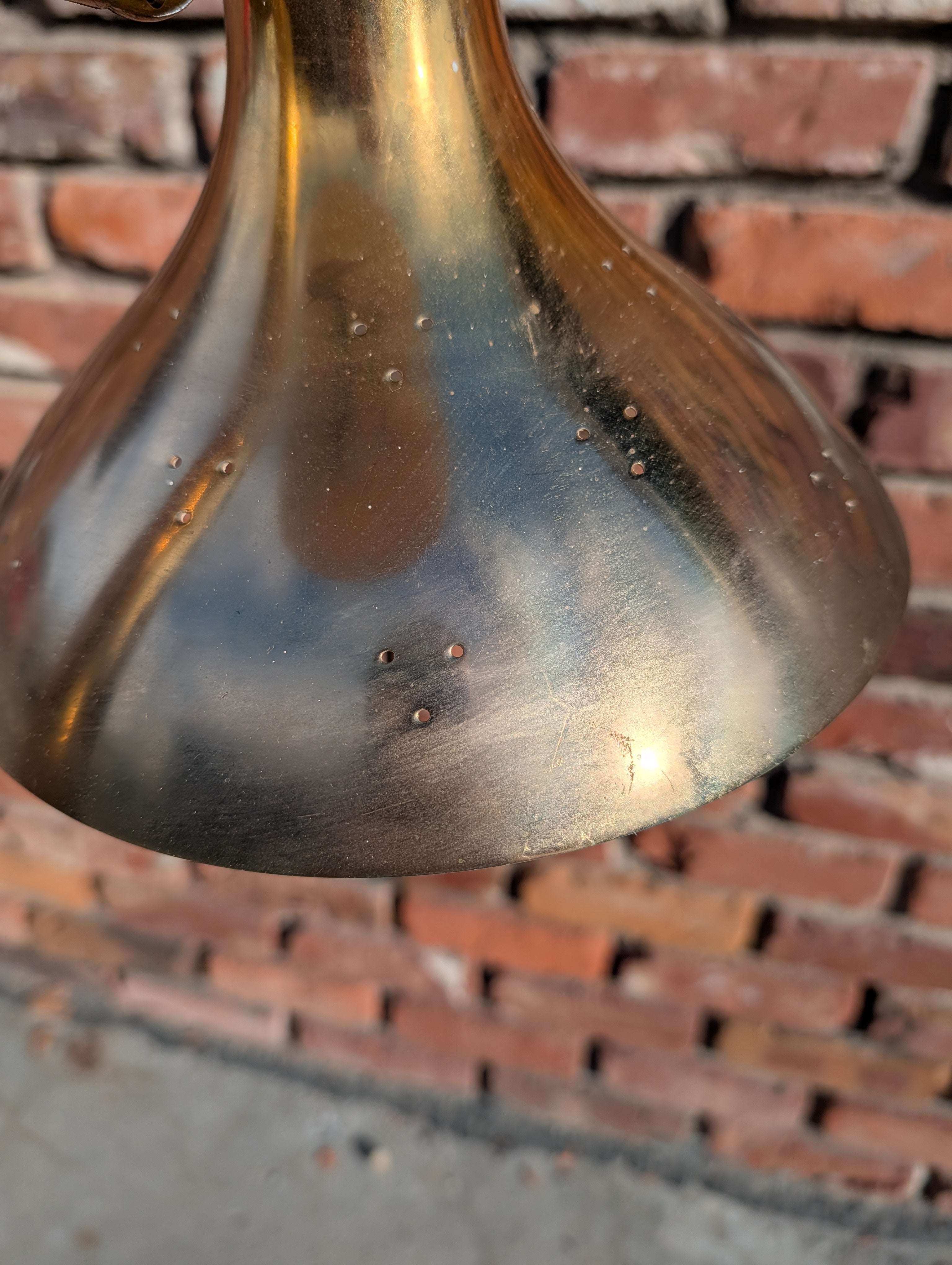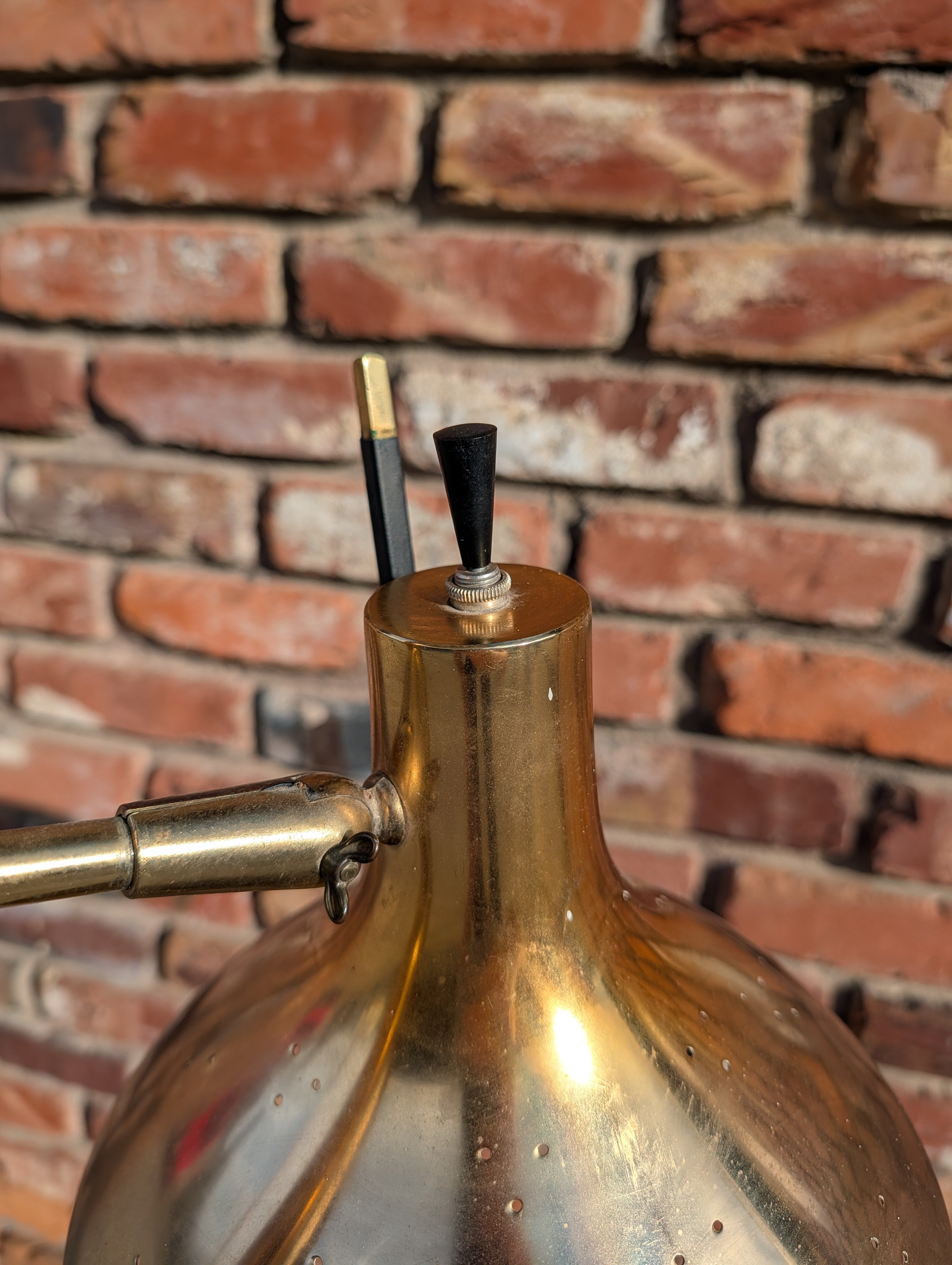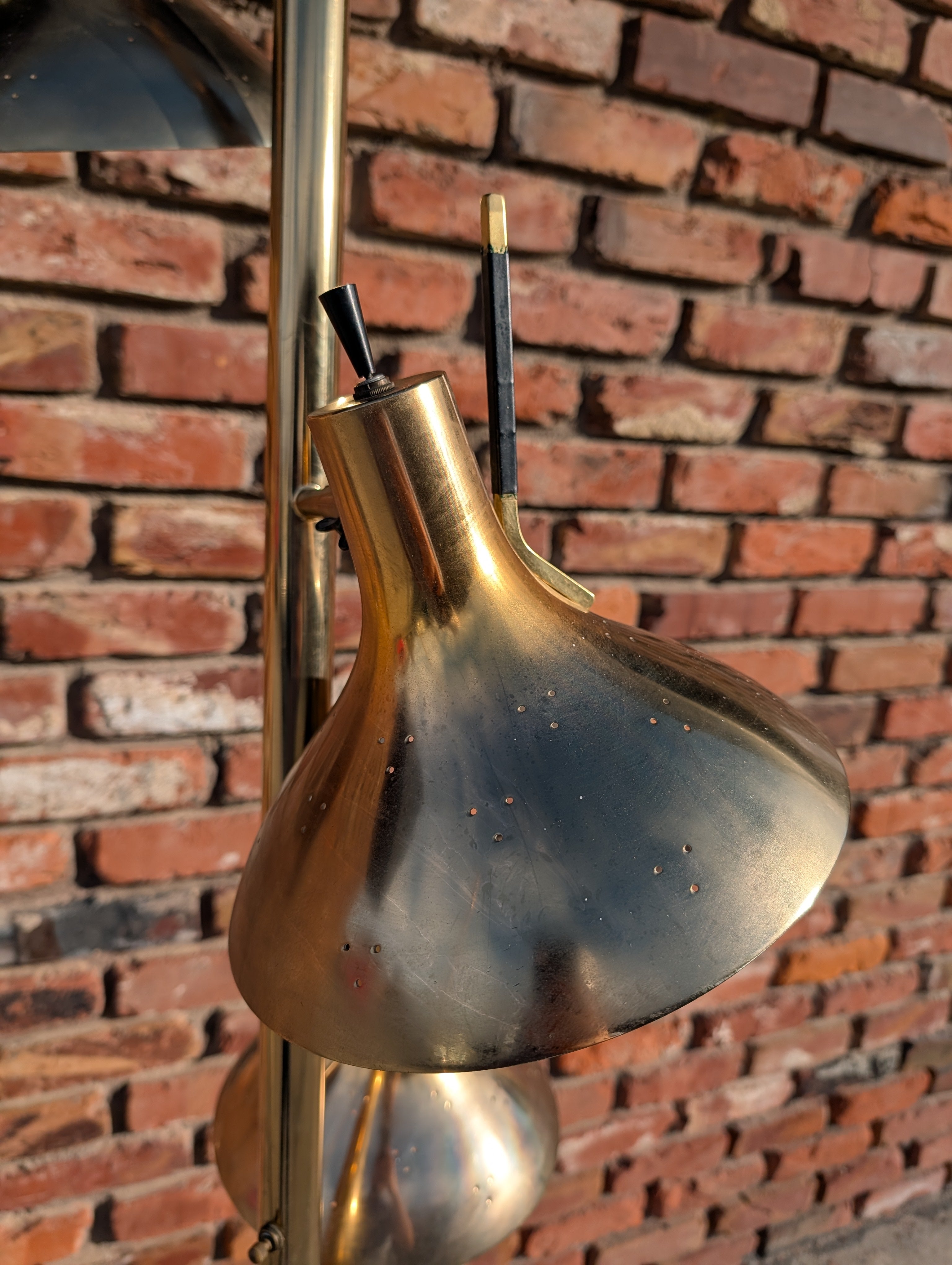 Illuminate your space with this multi-level gorgeous pole lamp! There are three shapely brass shades on the brass and painted pole. Illuminate one bulb at a time, or all three. All three shades articulate, swivel, aim them where you'd like light! Has a new cord and plug and LED bulbs.