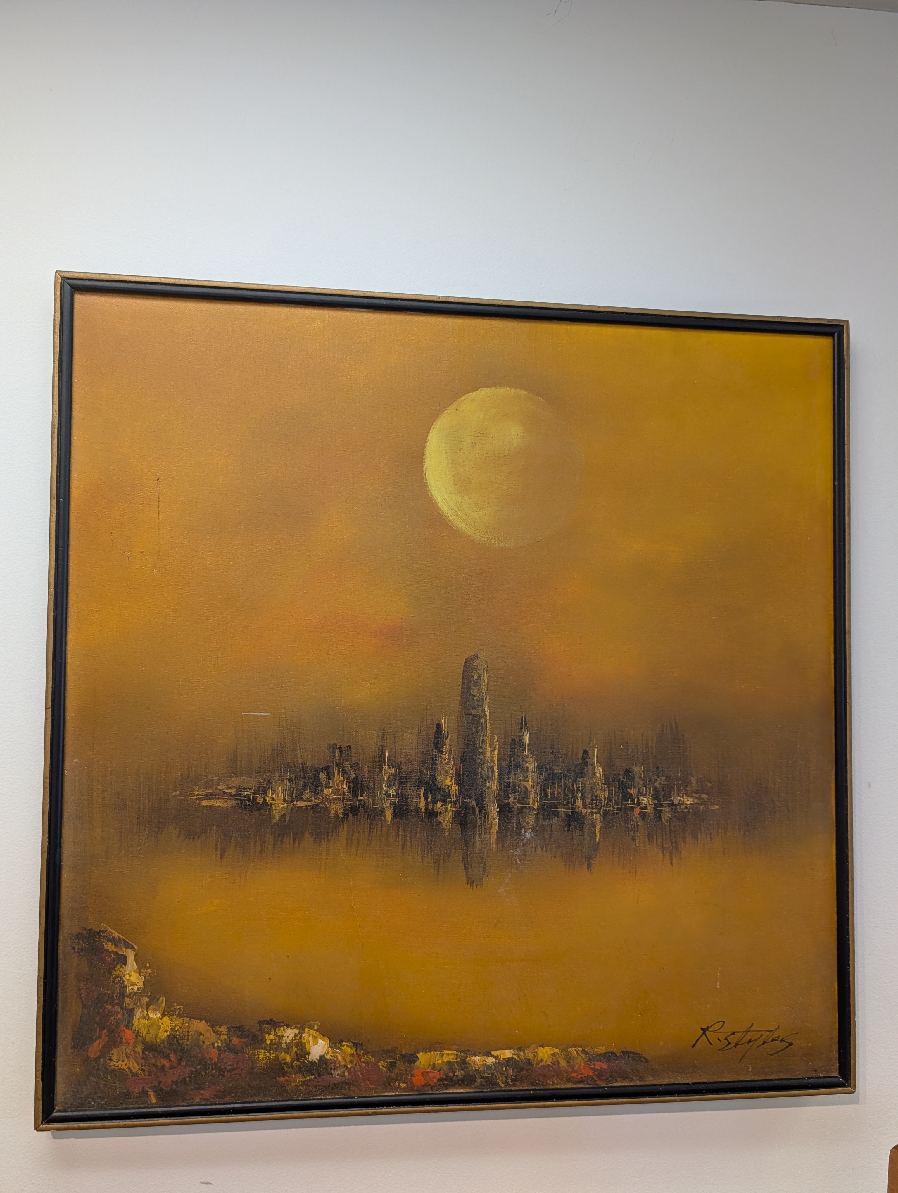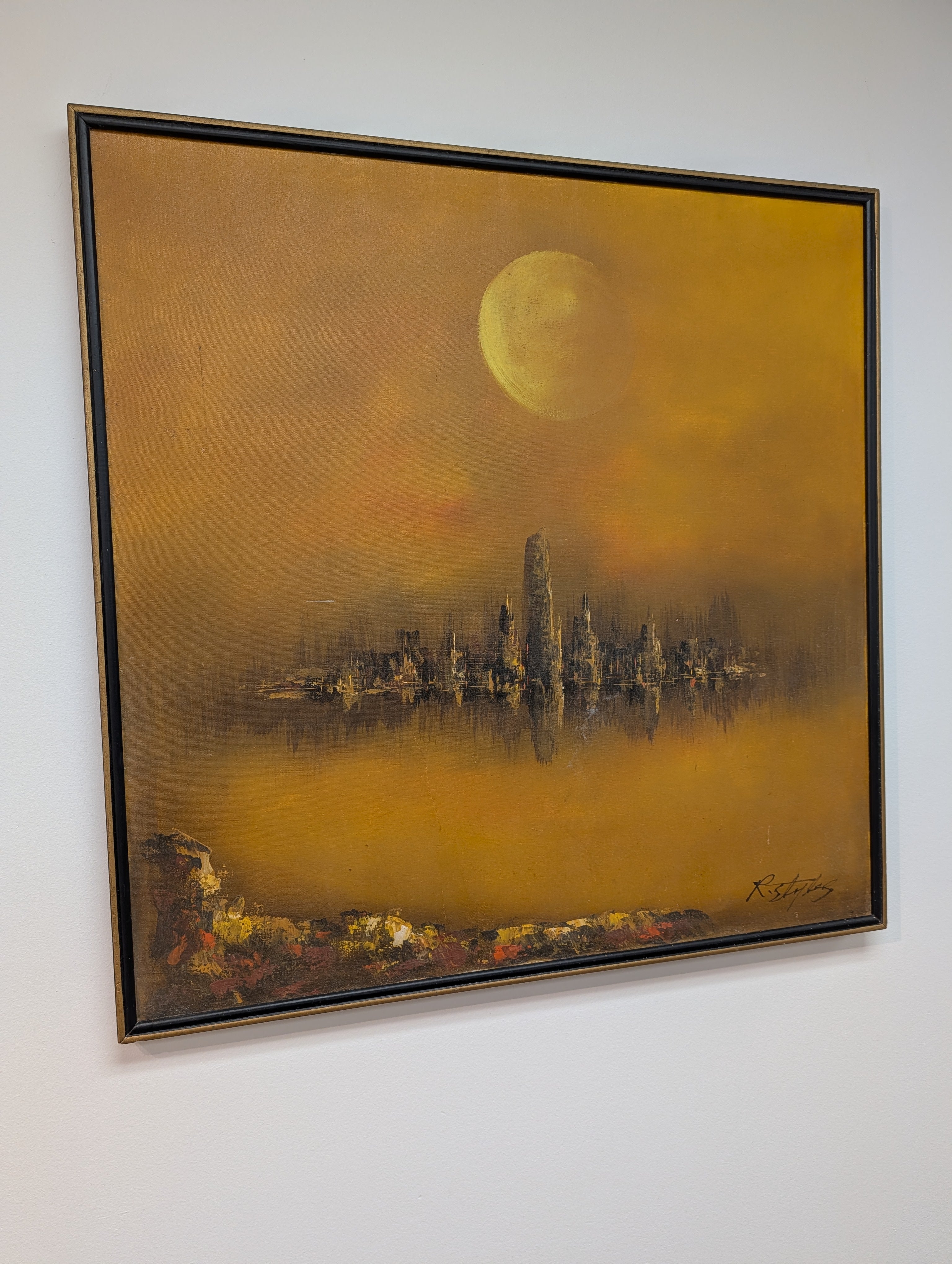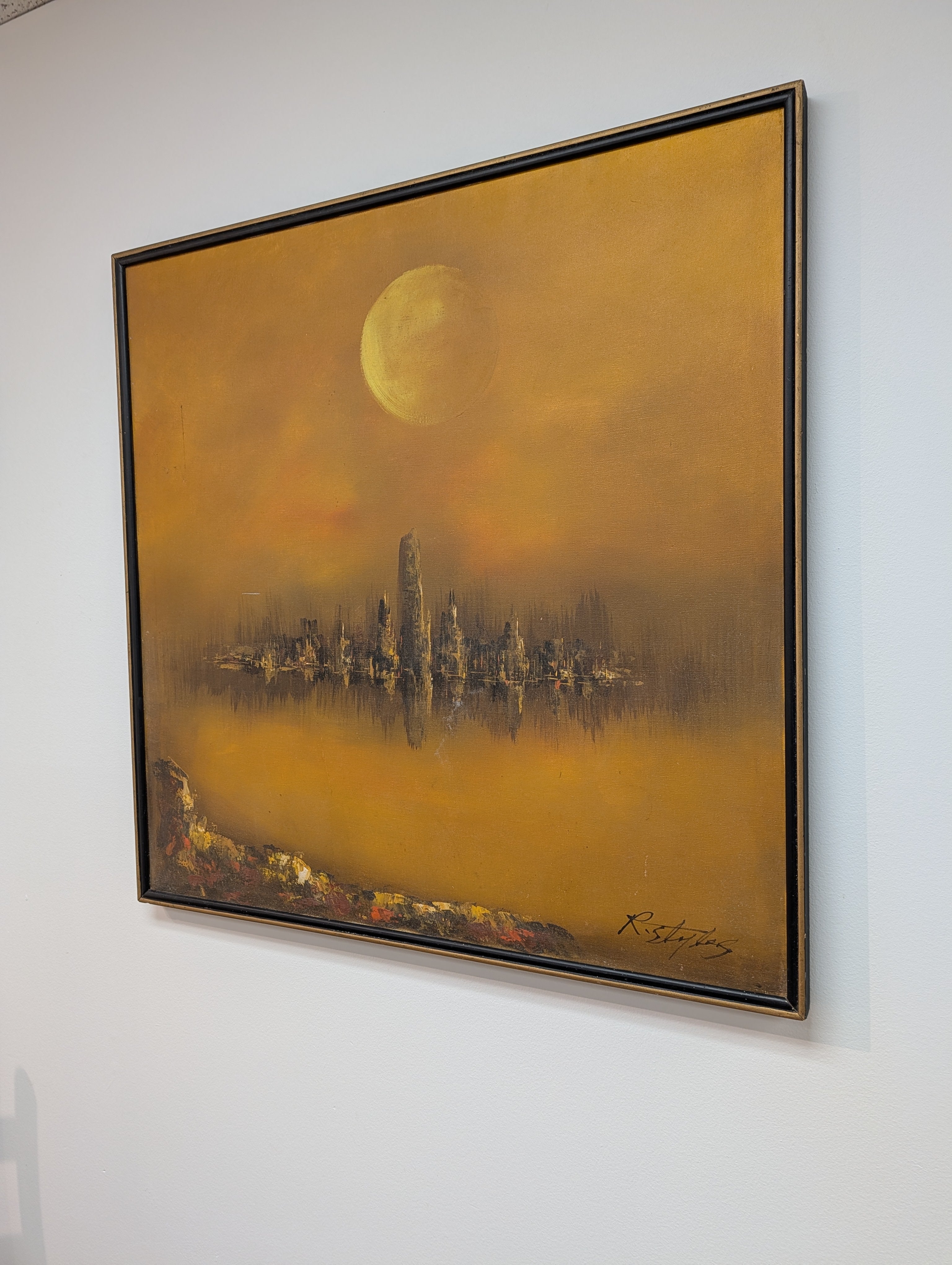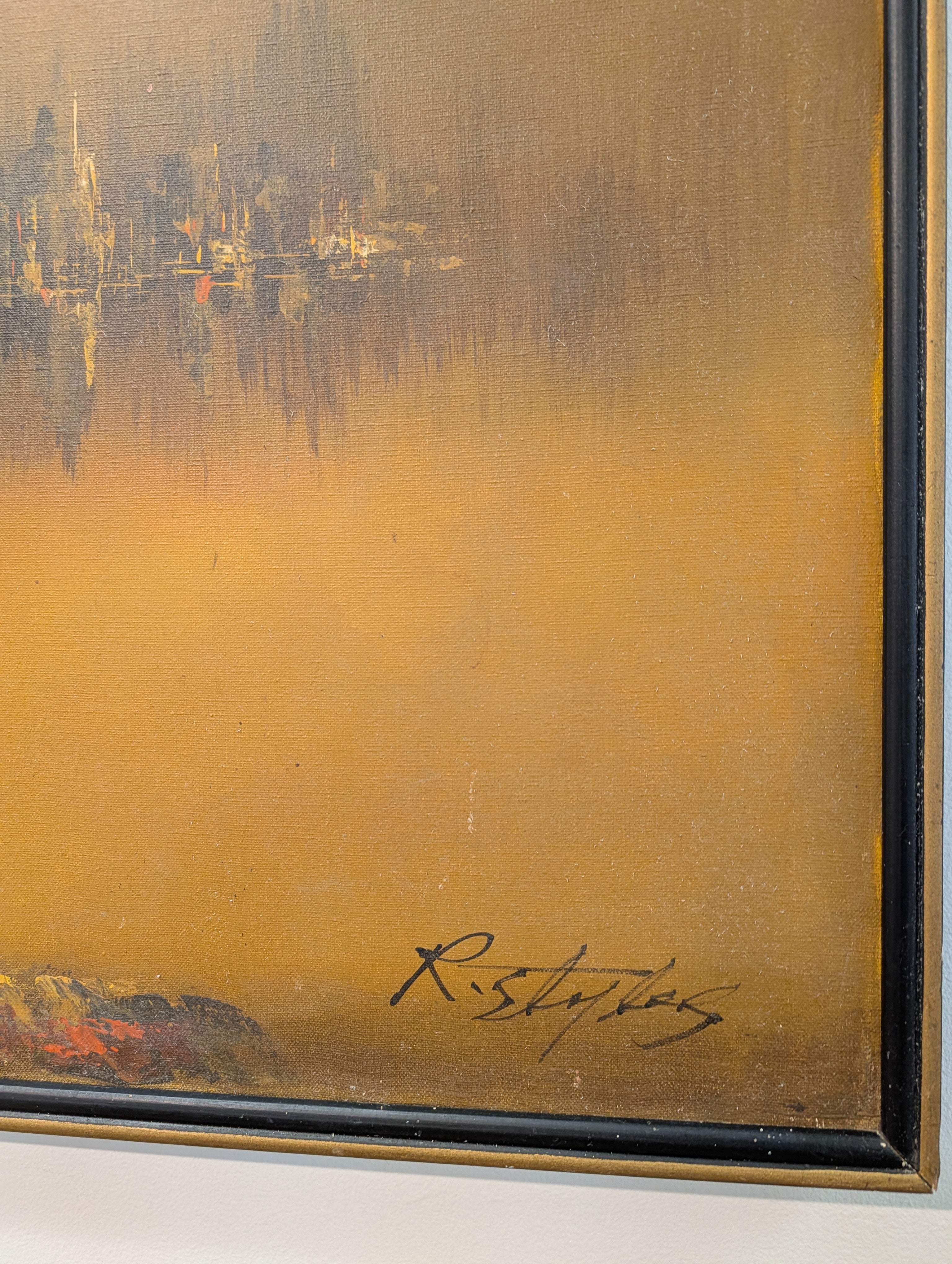 This amber colored cityscape features an abstract, stylized skyline looking out over a large body of water, with a rocky crag in the foreground and the setting sun(?) overhead. It is signed "R. Styles".