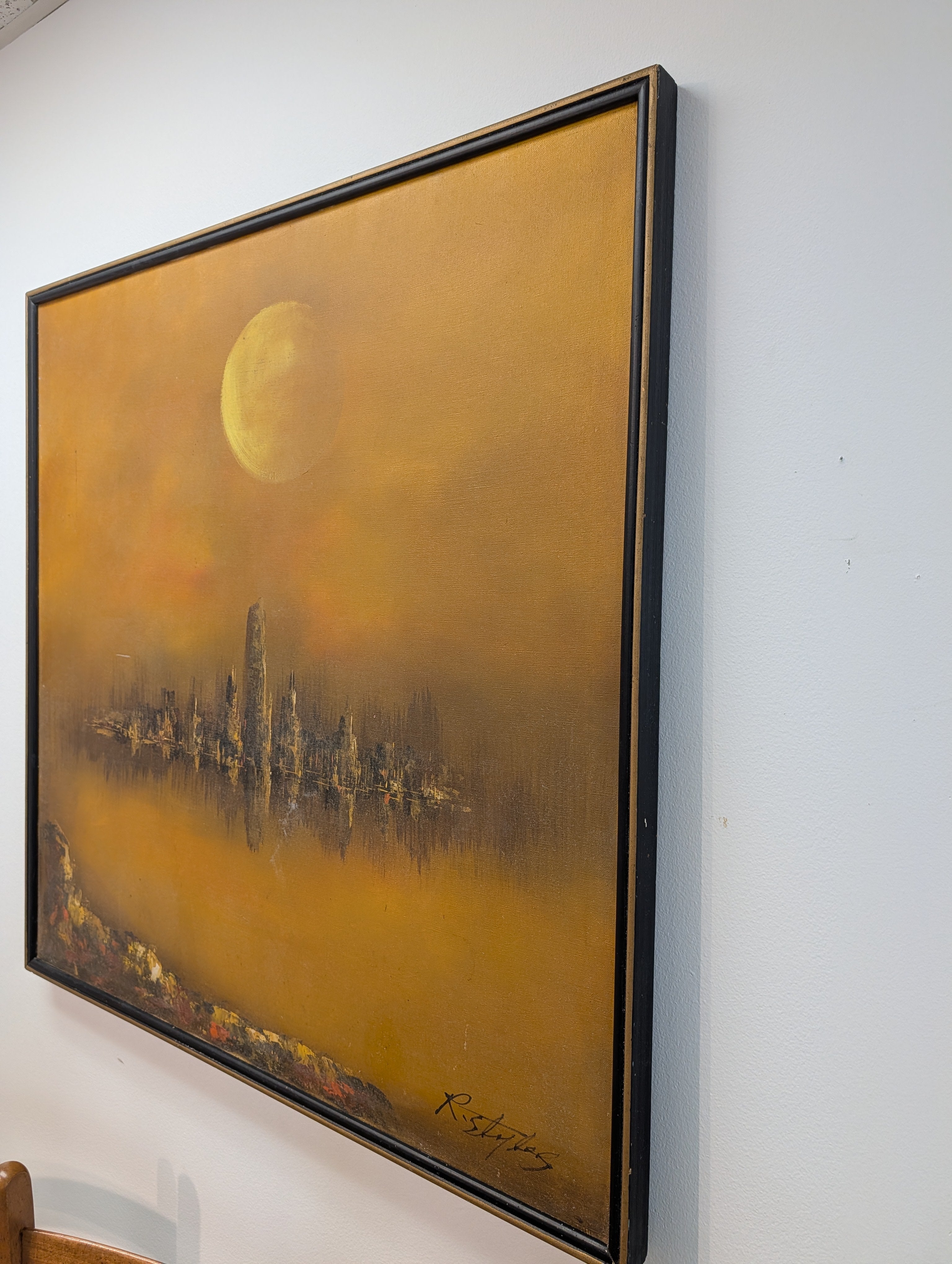 Large Framed Mid Century Cityscape Signed Painting | Signed R. Styles