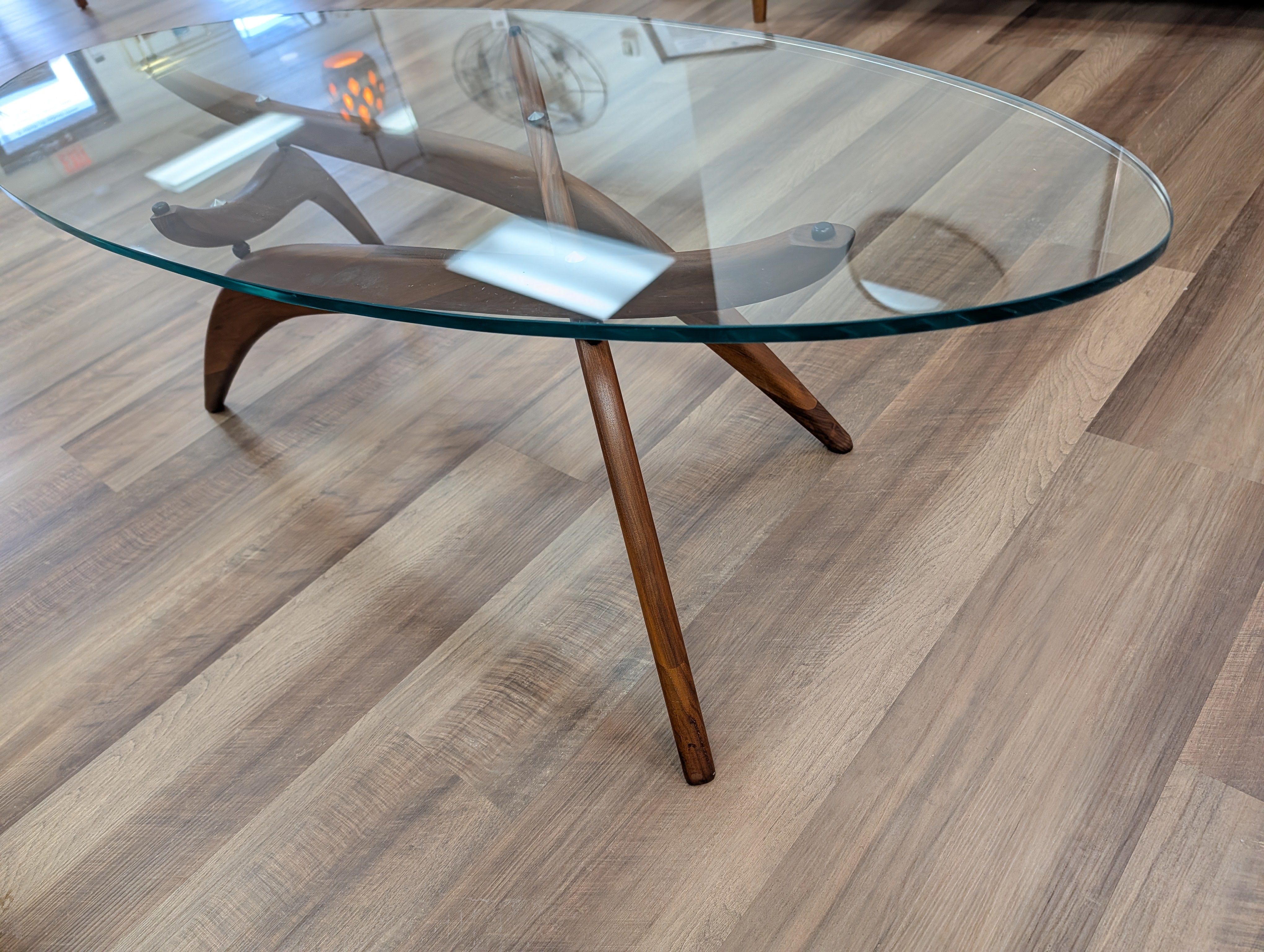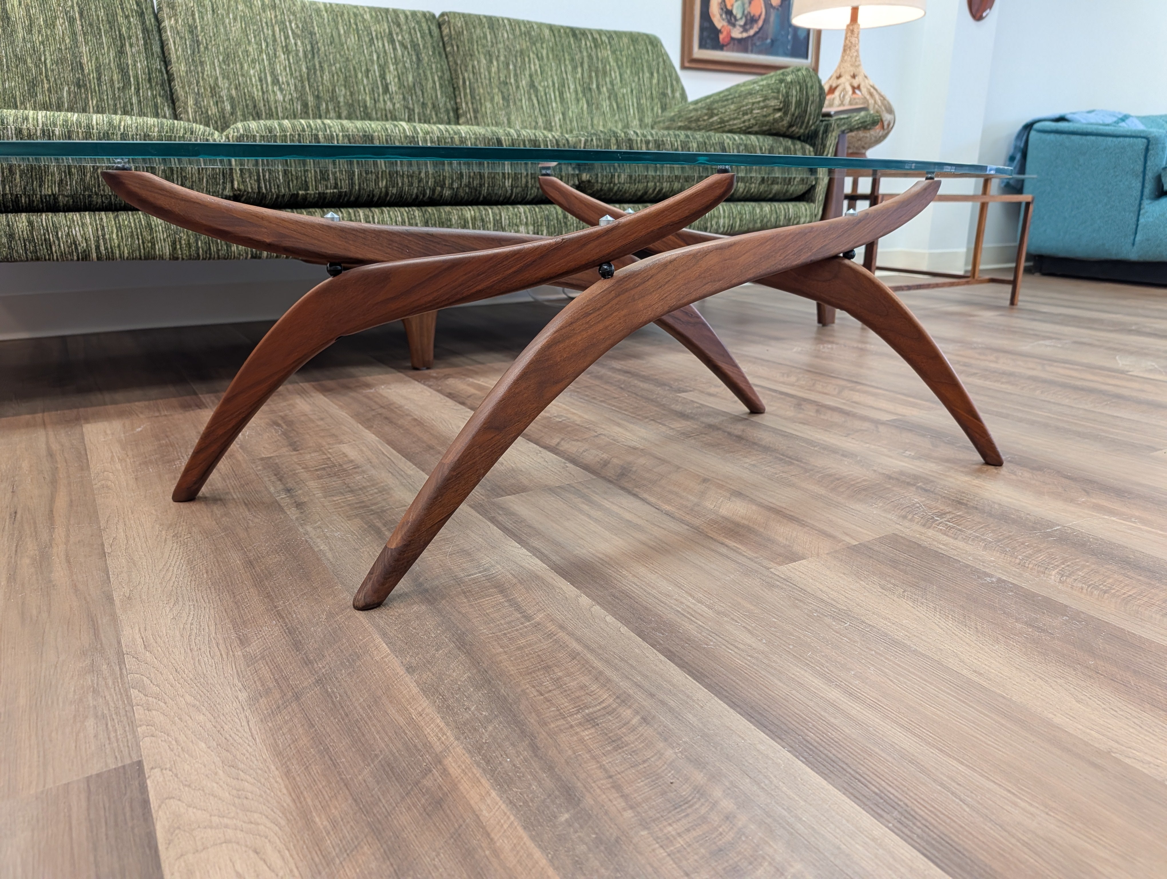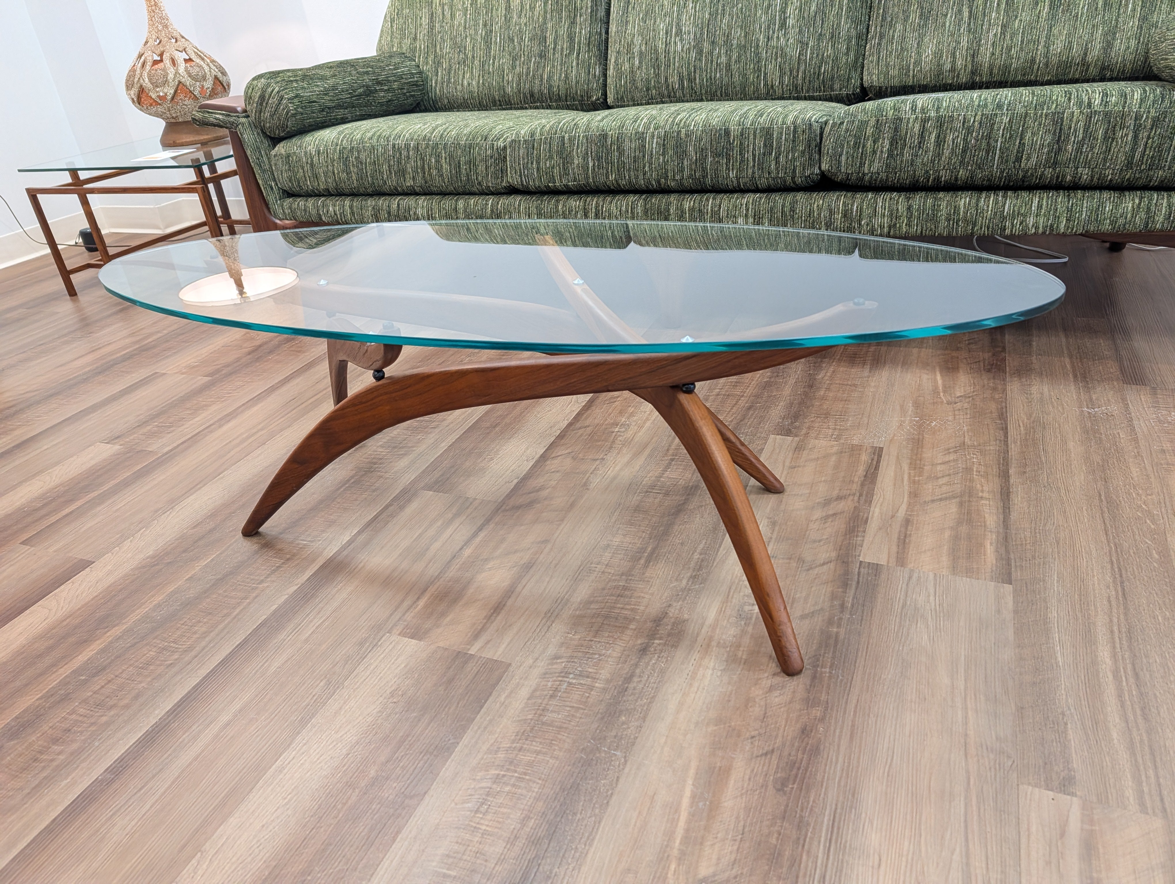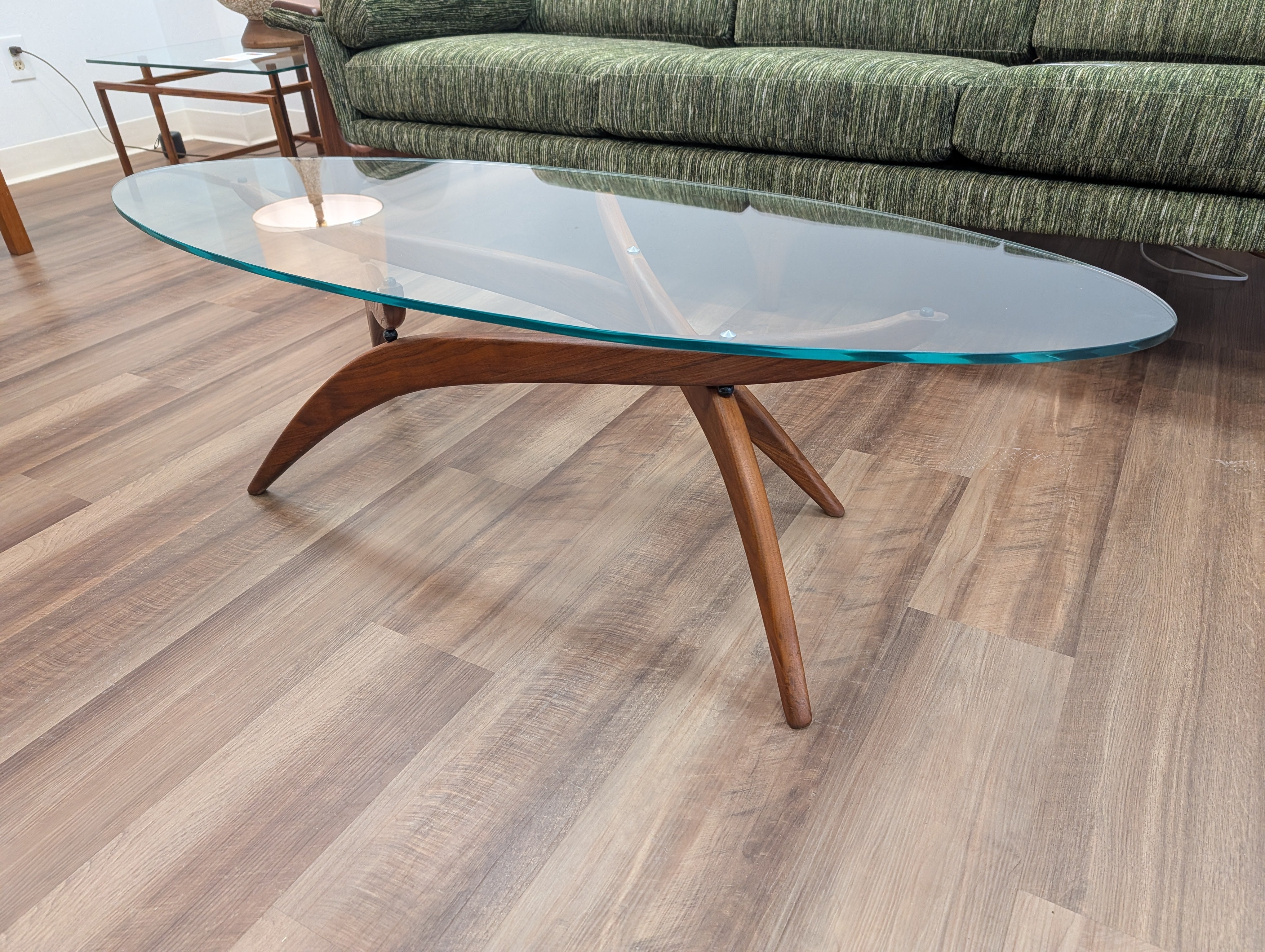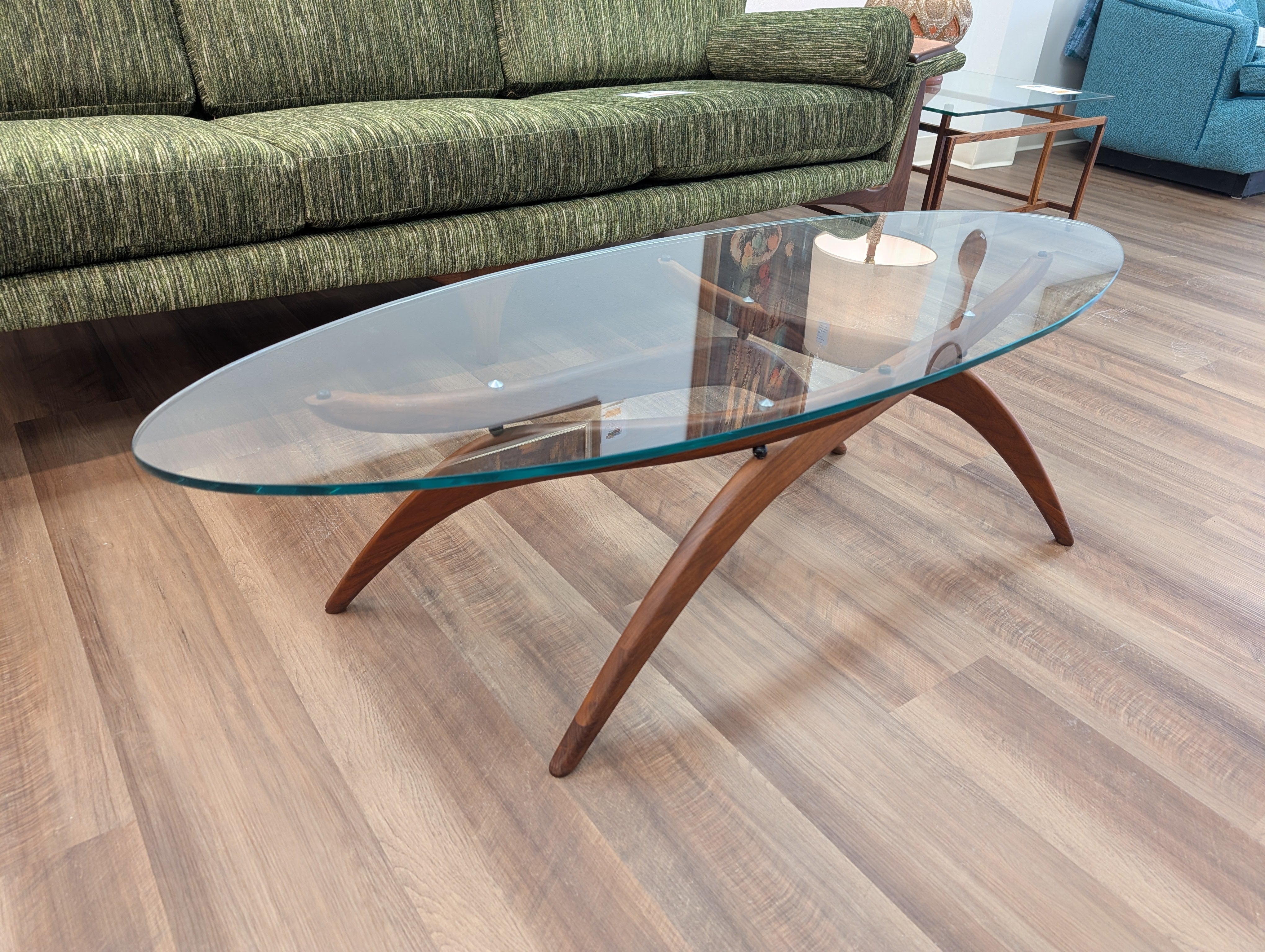 This Forest Wilson coffee table comes from our personal collection! The glass top allows you to admire the sculpted, expanding walnut base. Pairs beautifully with the Adrian Pearsall sofa currently in the shop!