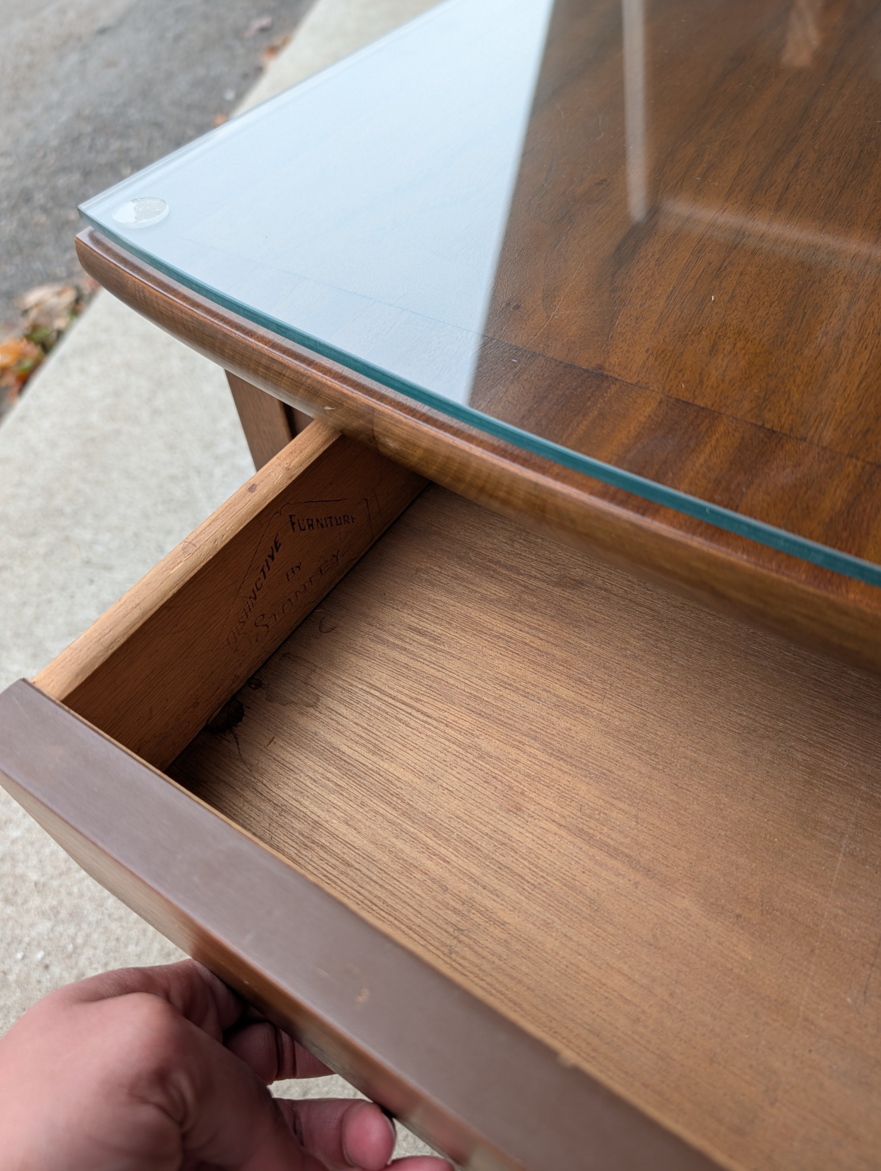 This is a lovely Stanley two-step end table that retains its original finish, but has no notable flaws! It has two removable glass top pieces for worry free use!
