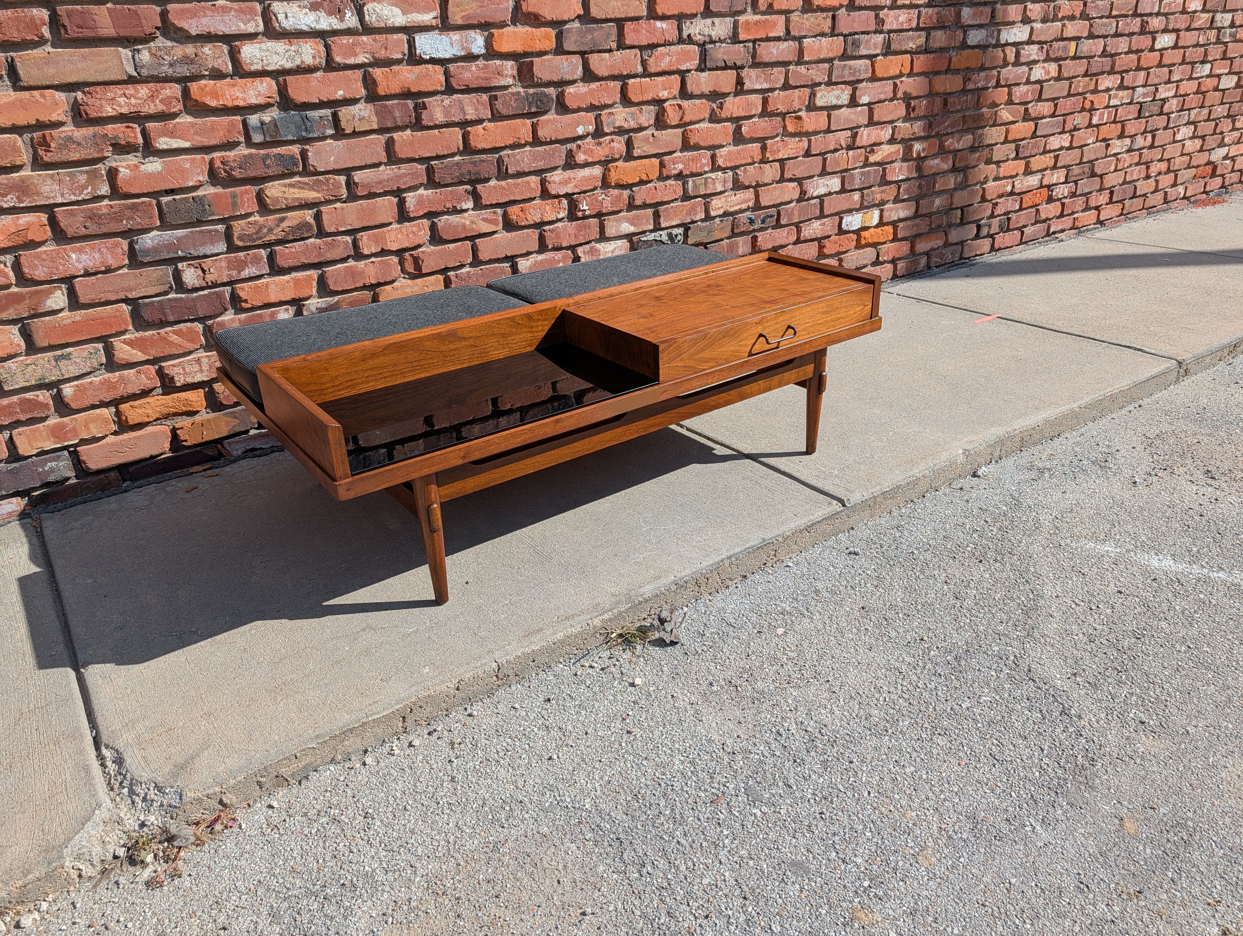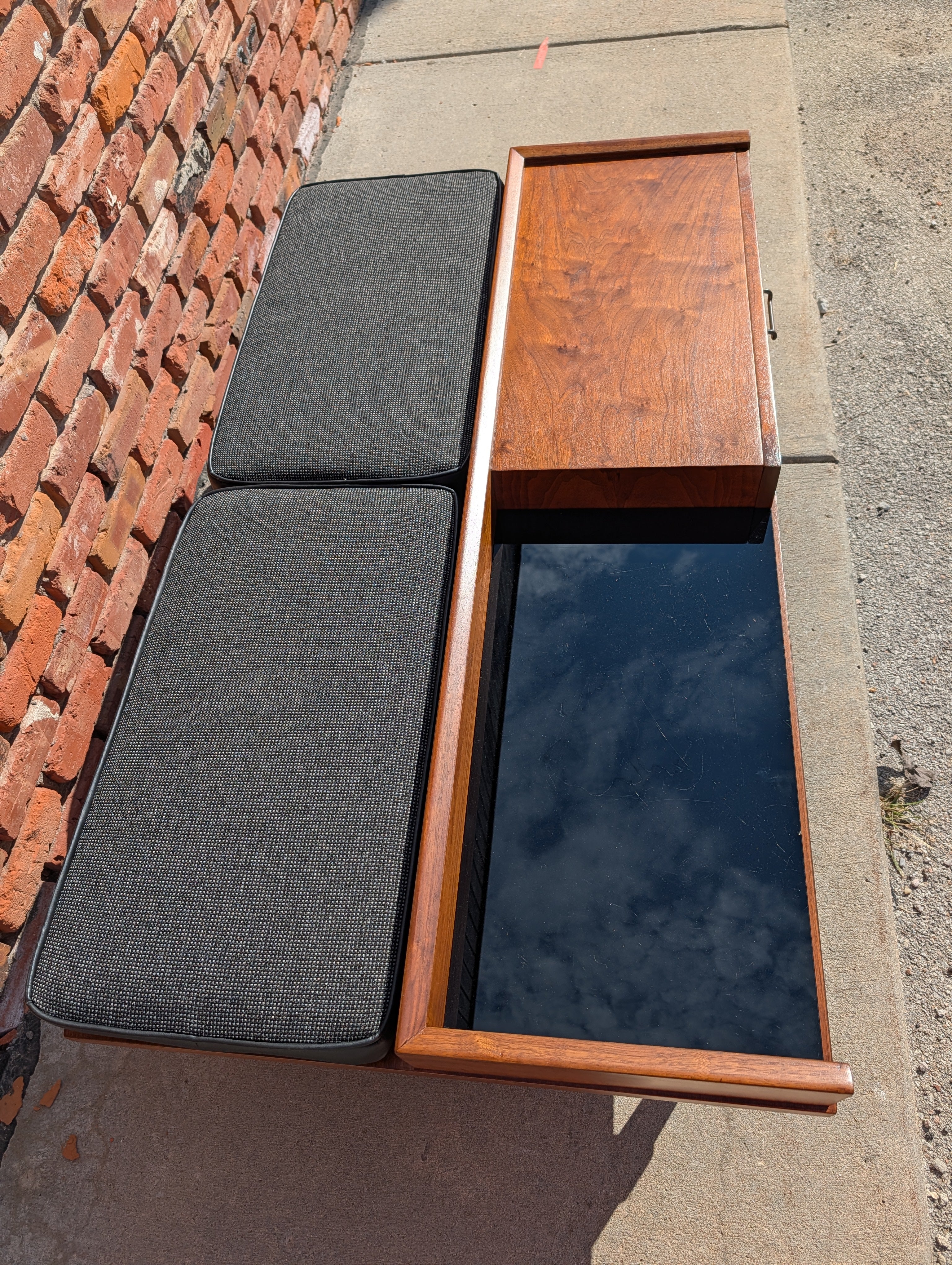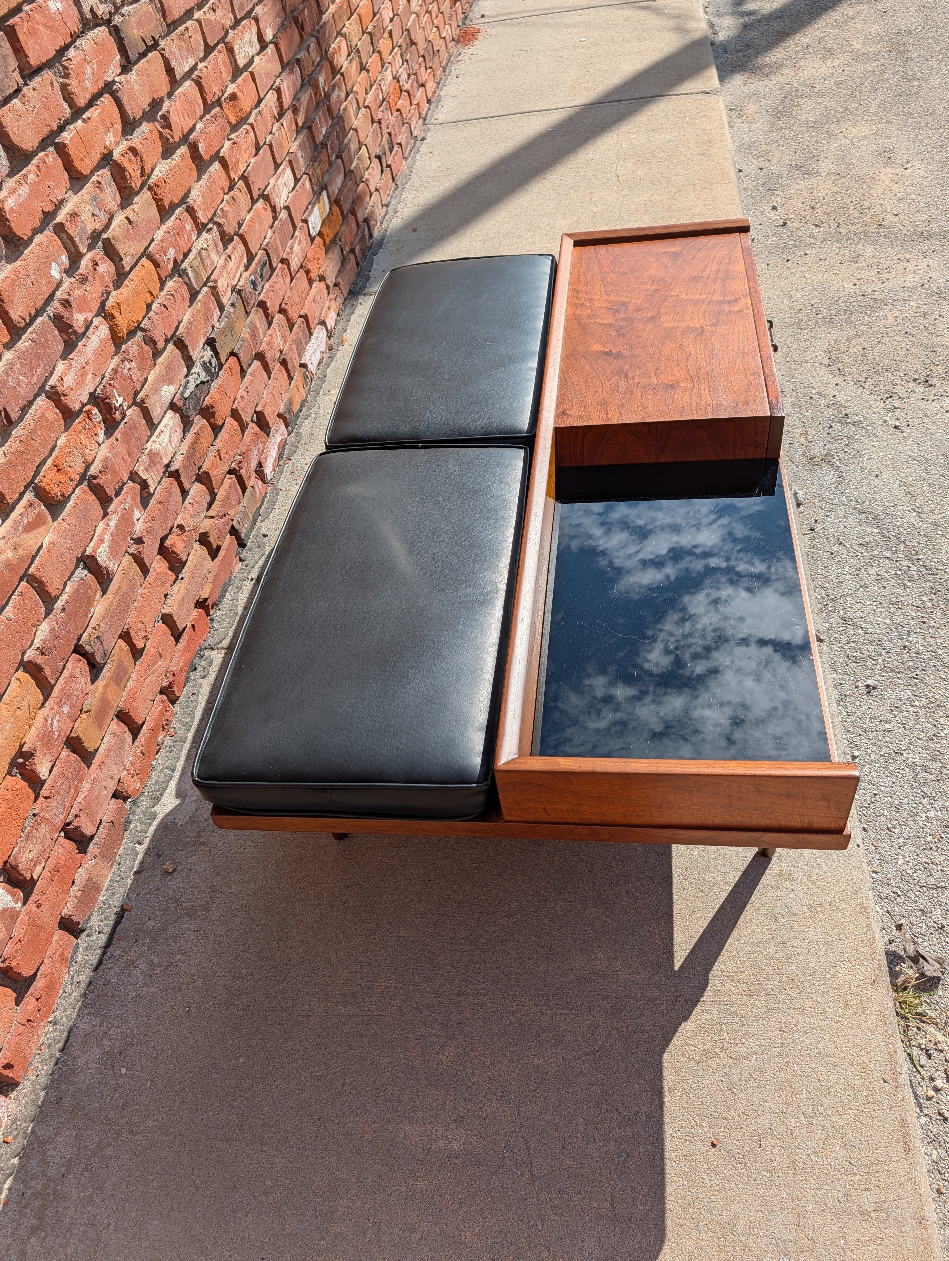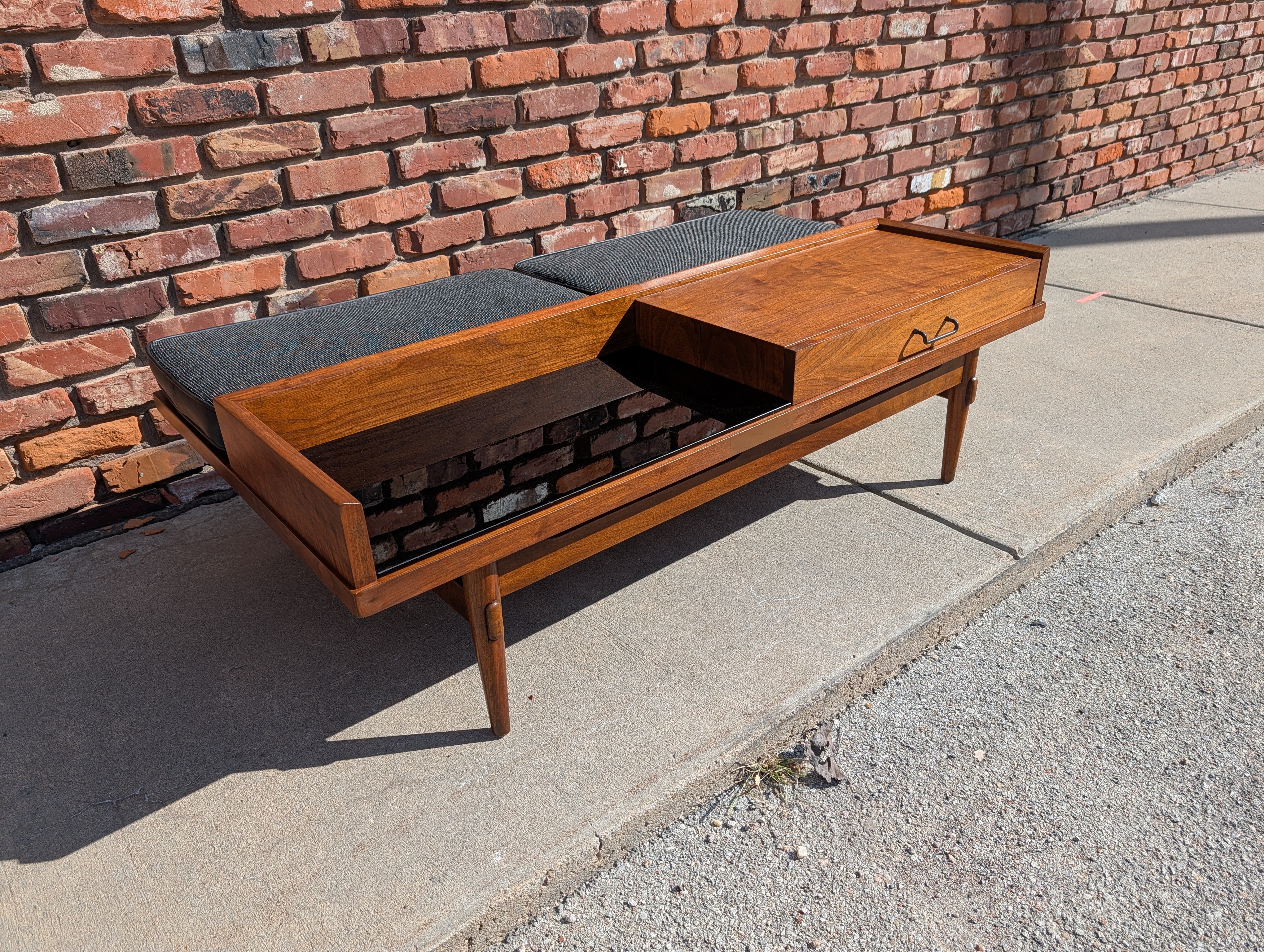 This is a spectacular and rare versatile piece from American of Martinsville's "Dania" line, designed by Merton Gershun. So versatile, it could be used as a coffee table or entry bench in your foyer. It has been professionally refinished and includes two original reversible black cushions in excellent condition and a smoked black glass topper that can be placed on two different sections of the table. There is a large front drawer.