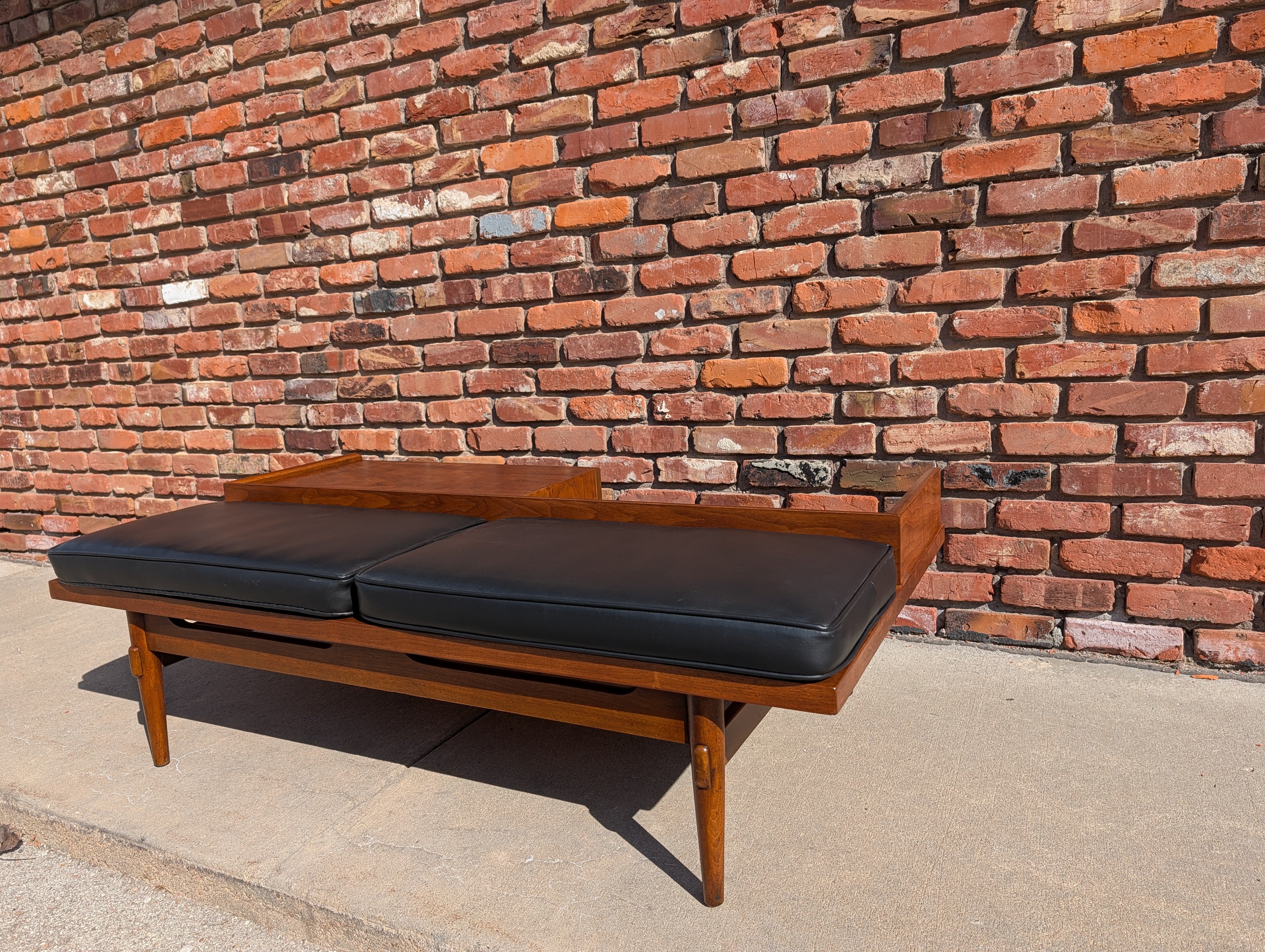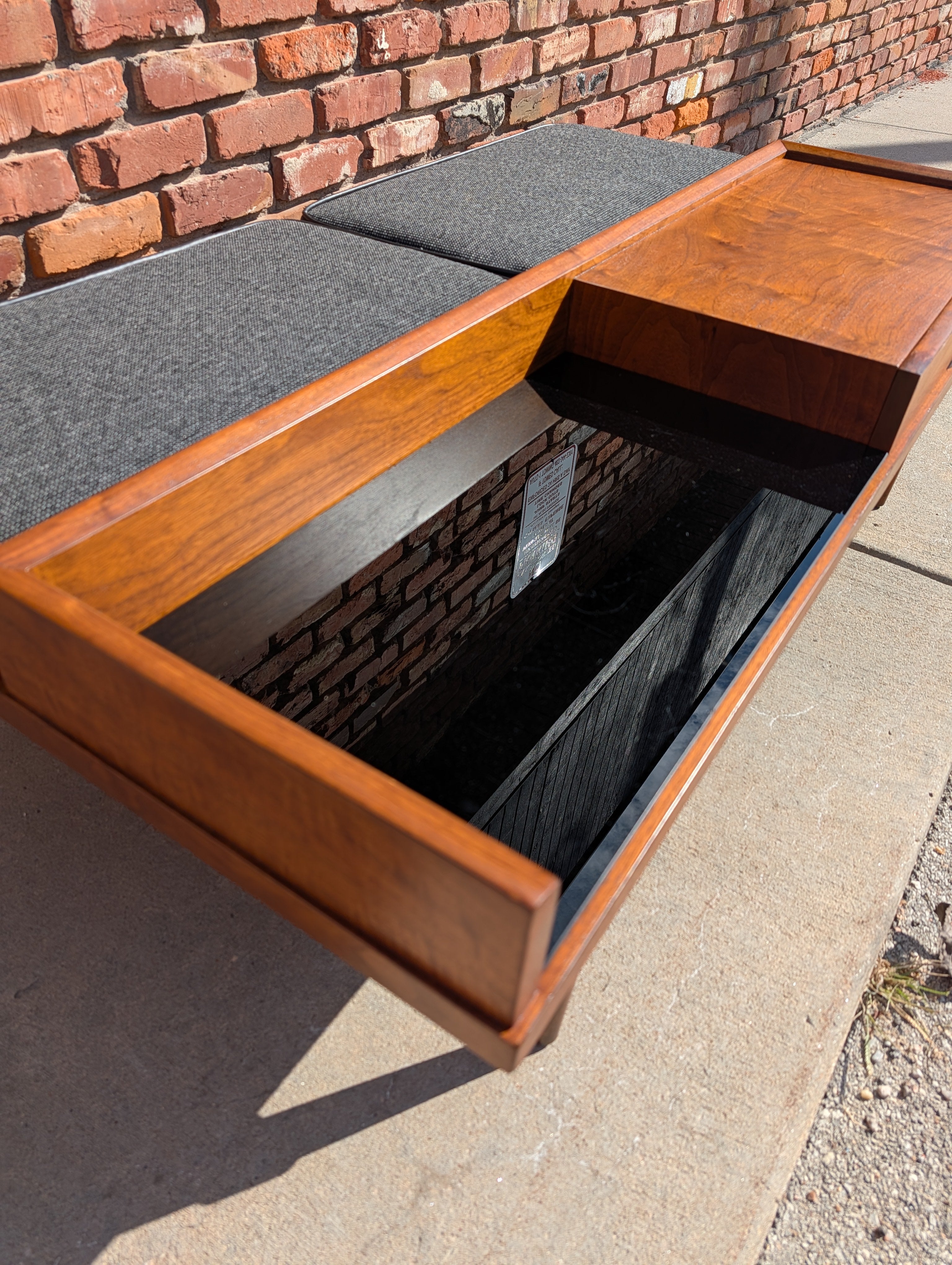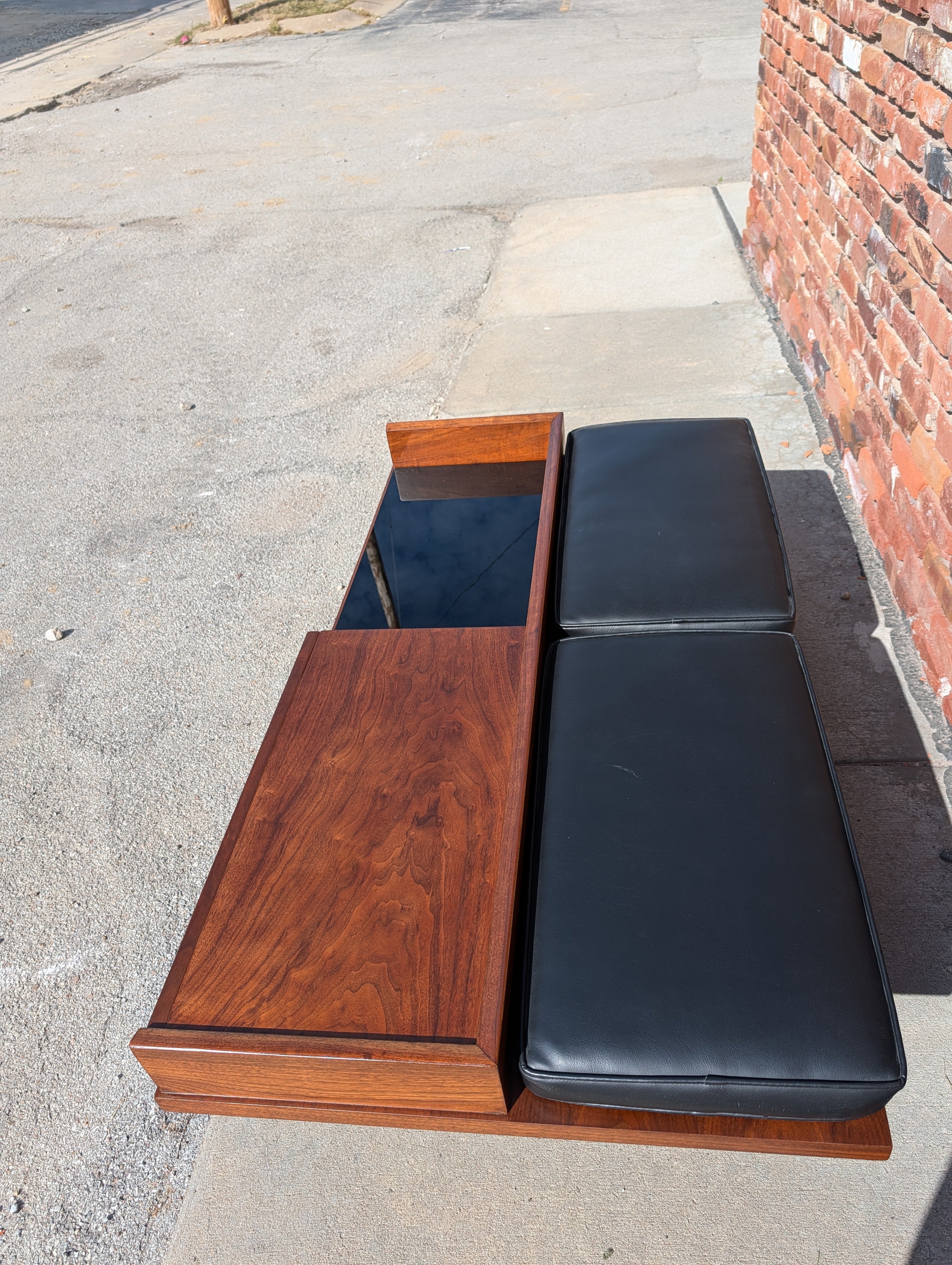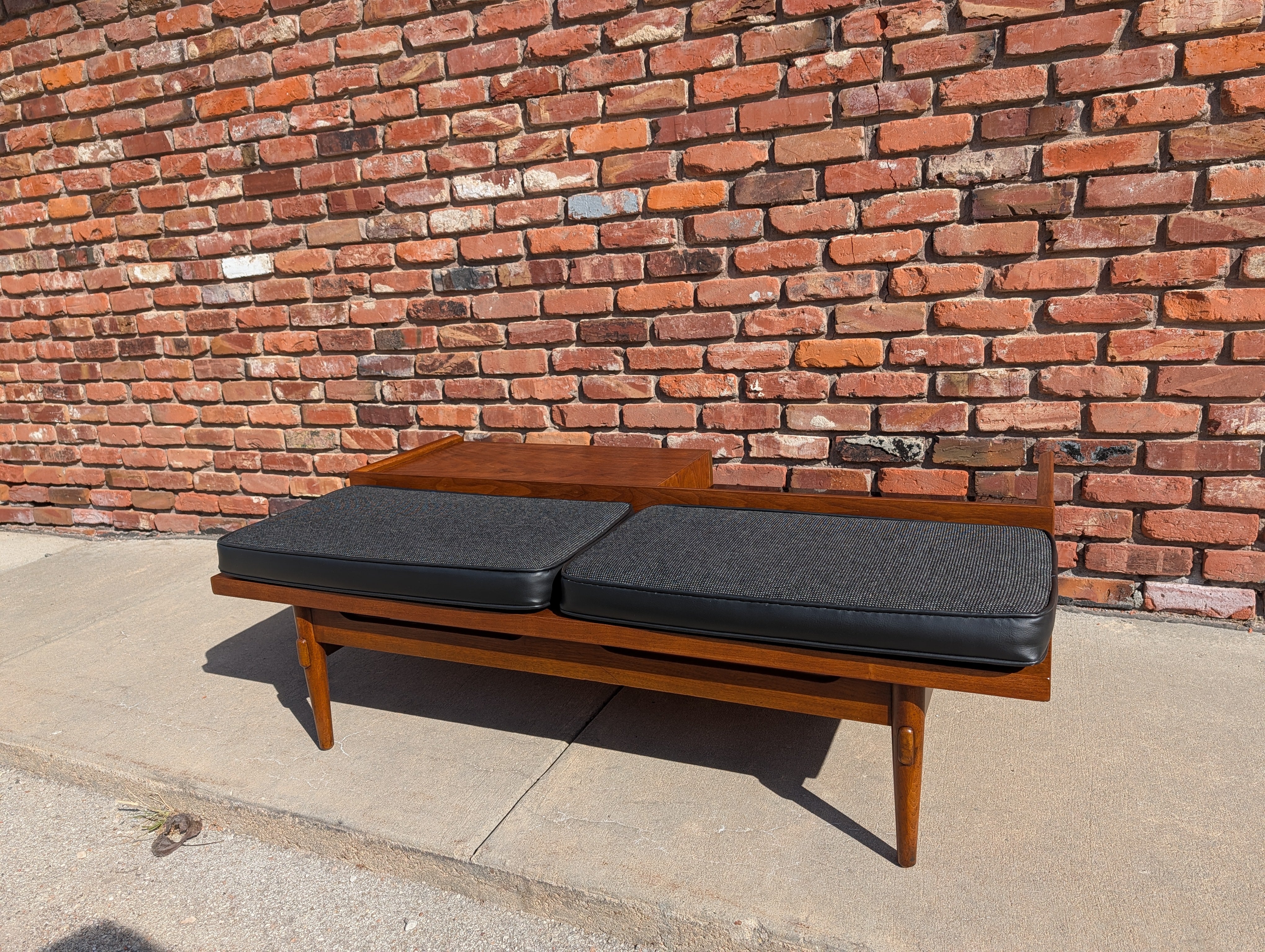 This is a spectacular and rare versatile piece from American of Martinsville's "Dania" line, designed by Merton Gershun. So versatile, it could be used as a coffee table or entry bench in your foyer. It has been professionally refinished and includes two original reversible black cushions in excellent condition and a smoked black glass topper that can be placed on two different sections of the table. There is a large front drawer.