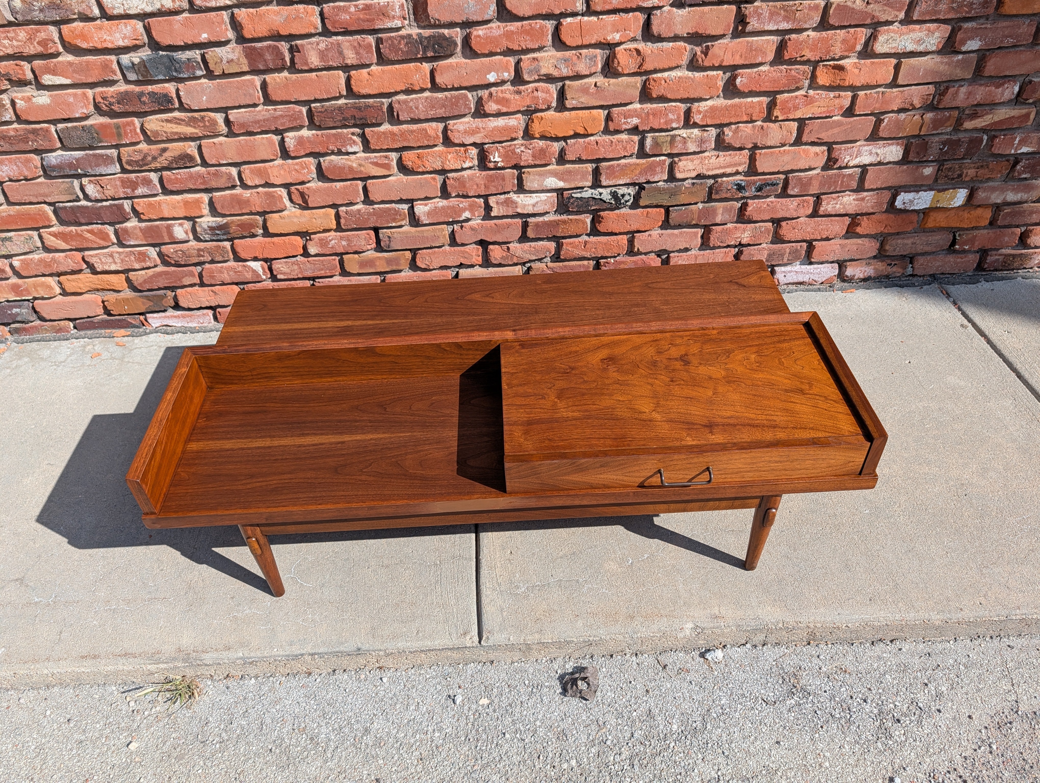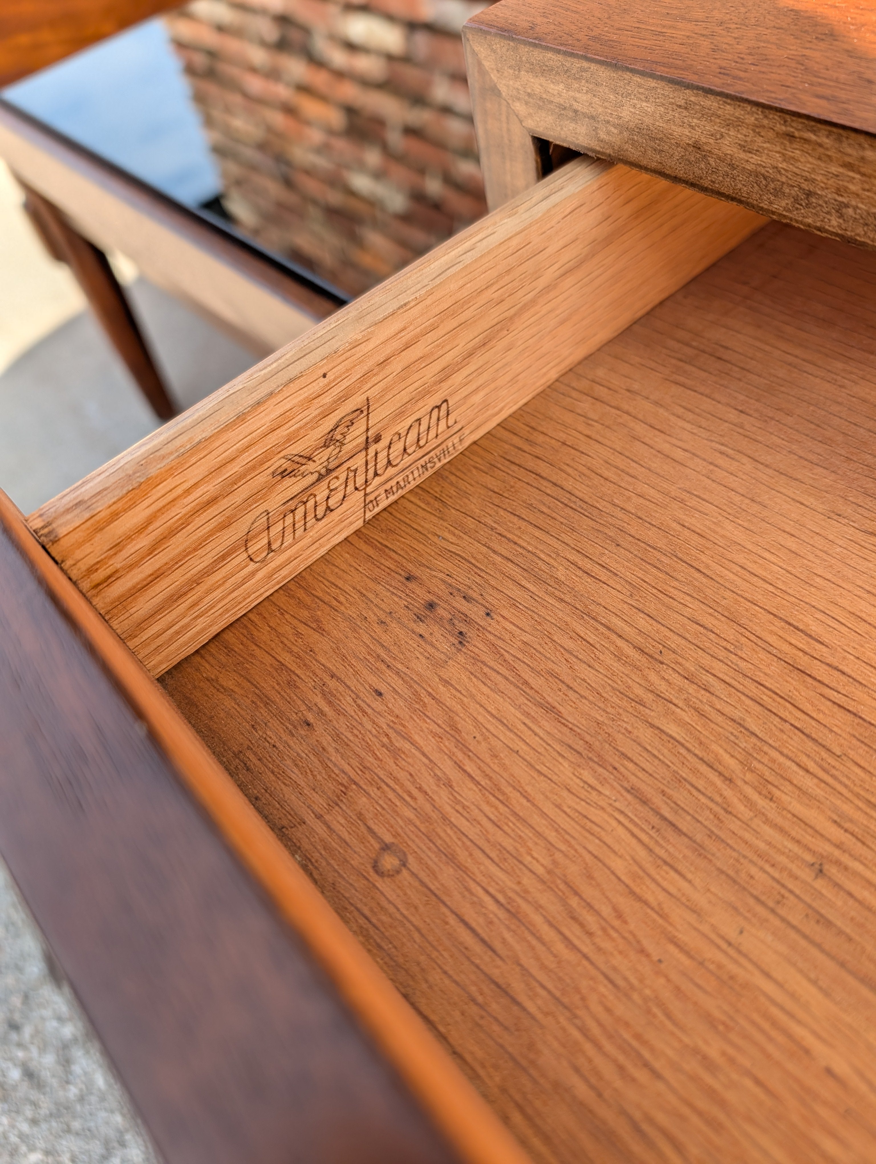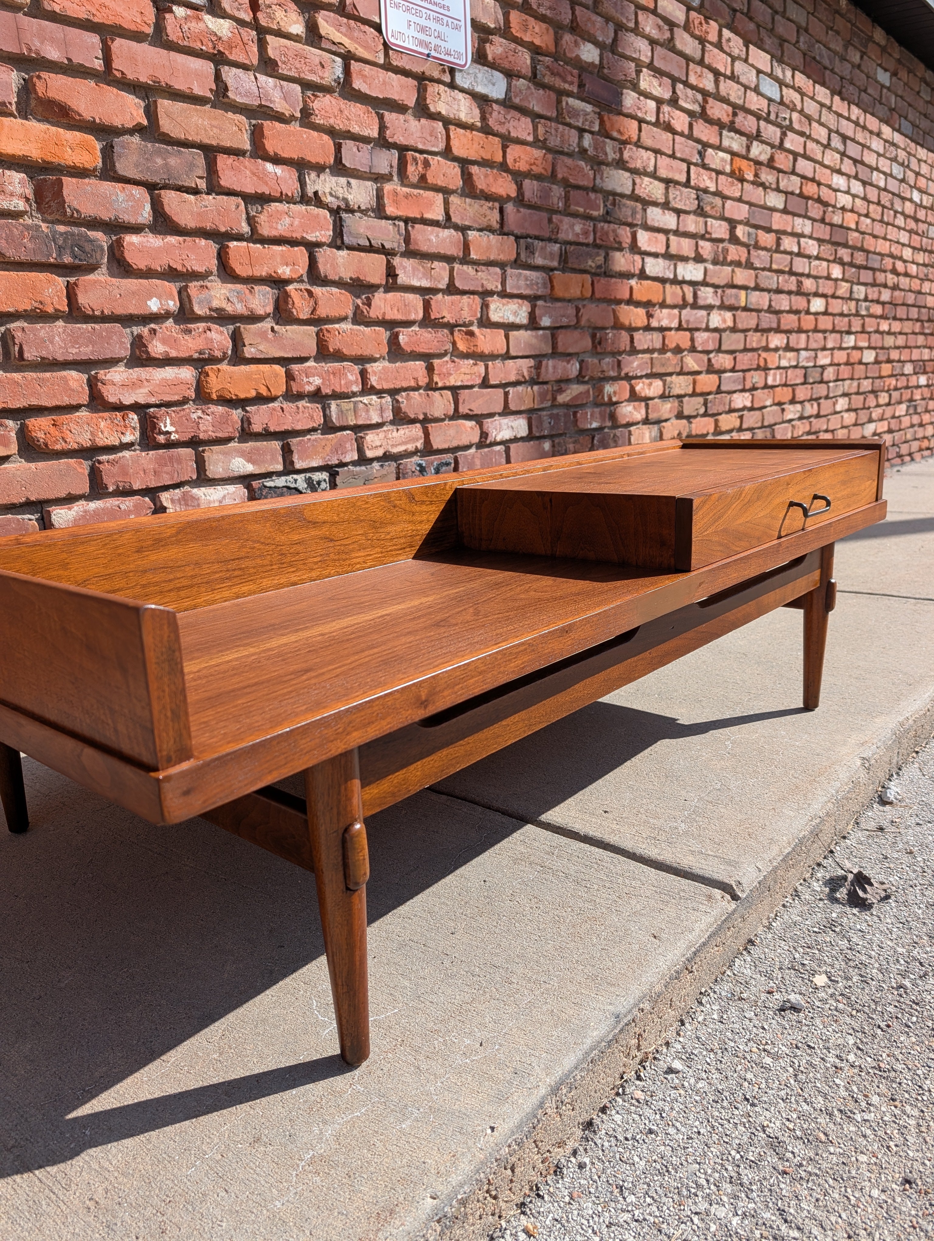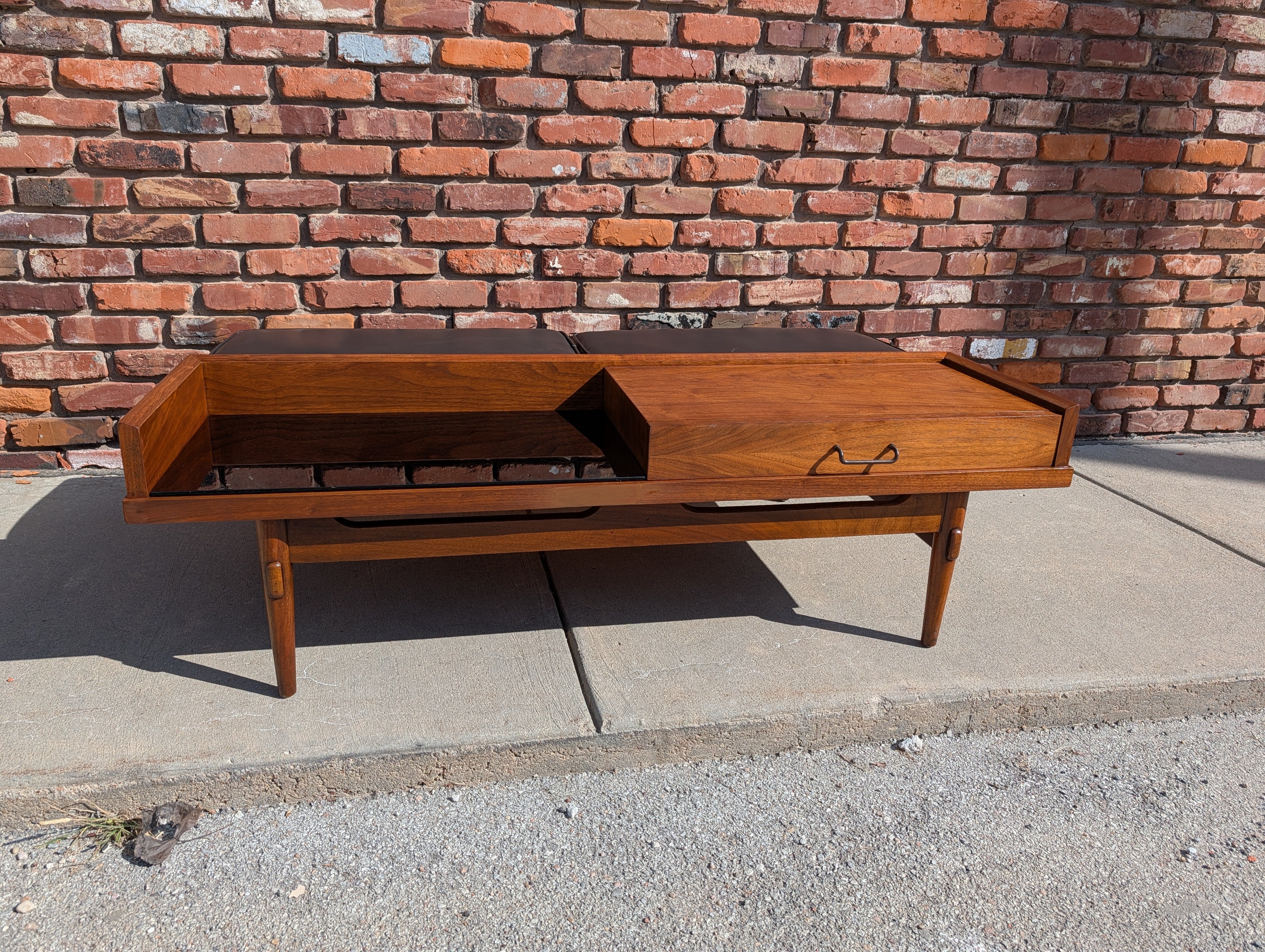 This is a spectacular and rare versatile piece from American of Martinsville's "Dania" line, designed by Merton Gershun. So versatile, it could be used as a coffee table or entry bench in your foyer. It has been professionally refinished and includes two original reversible black cushions in excellent condition and a smoked black glass topper that can be placed on two different sections of the table. There is a large front drawer.