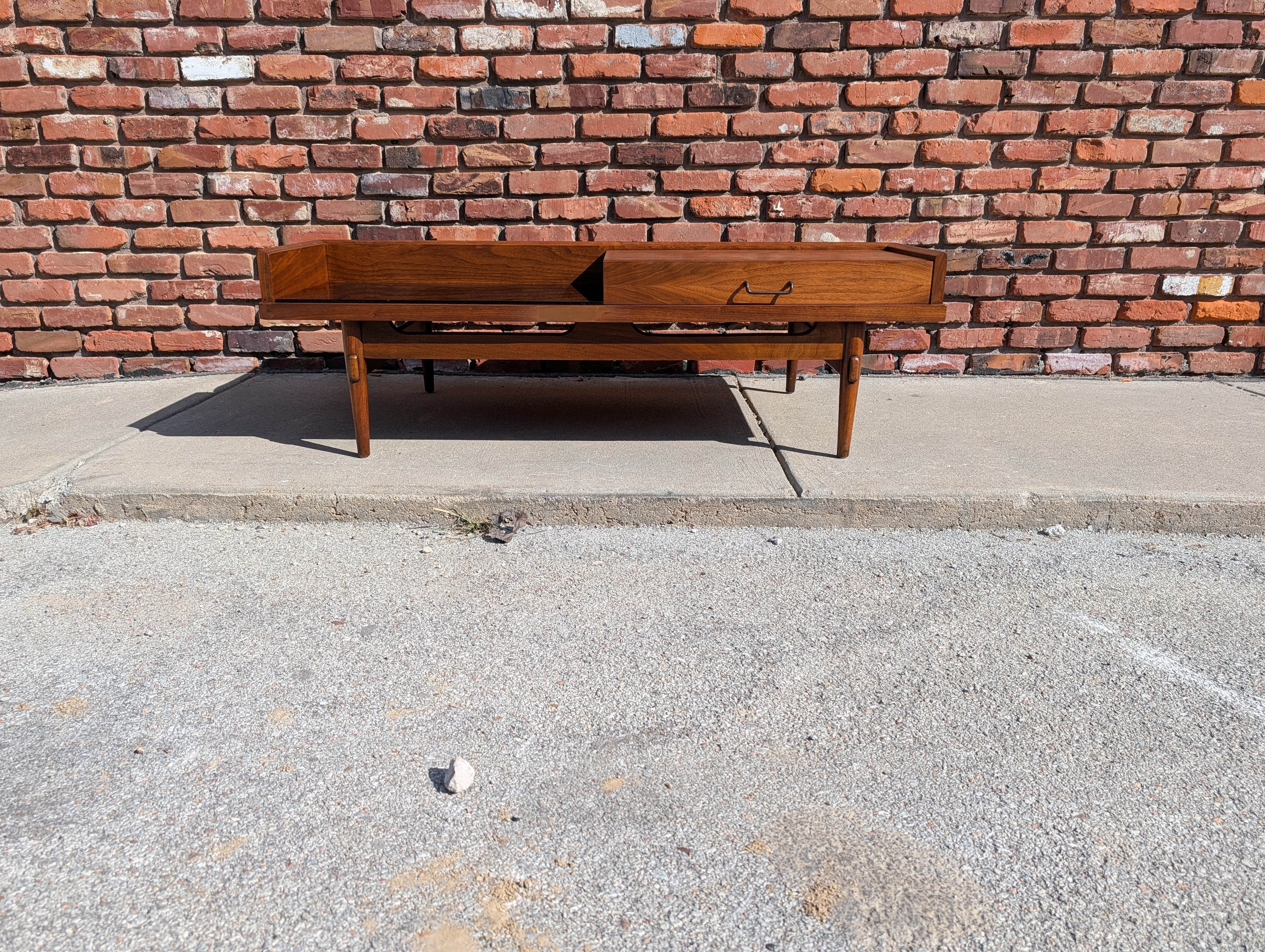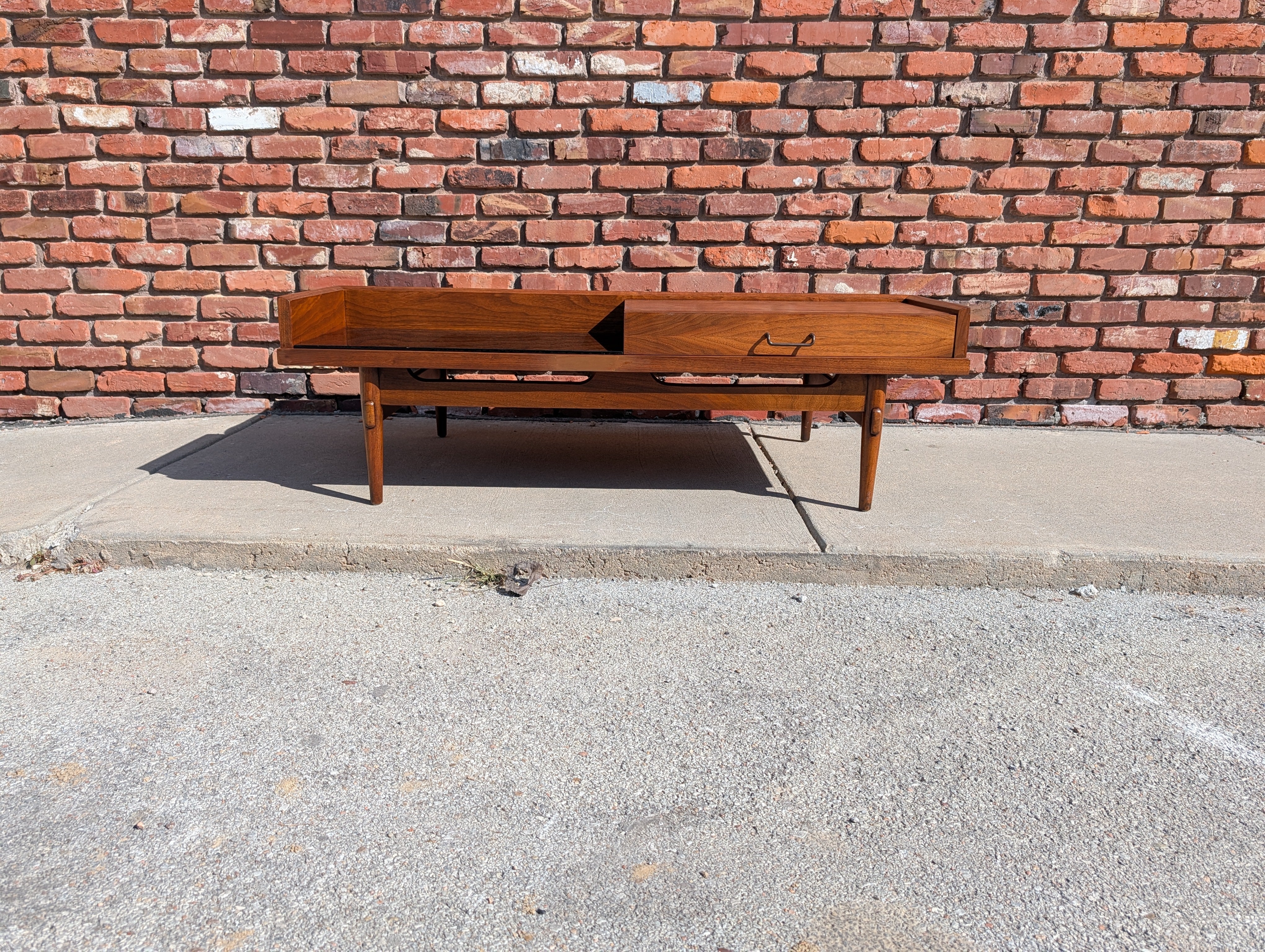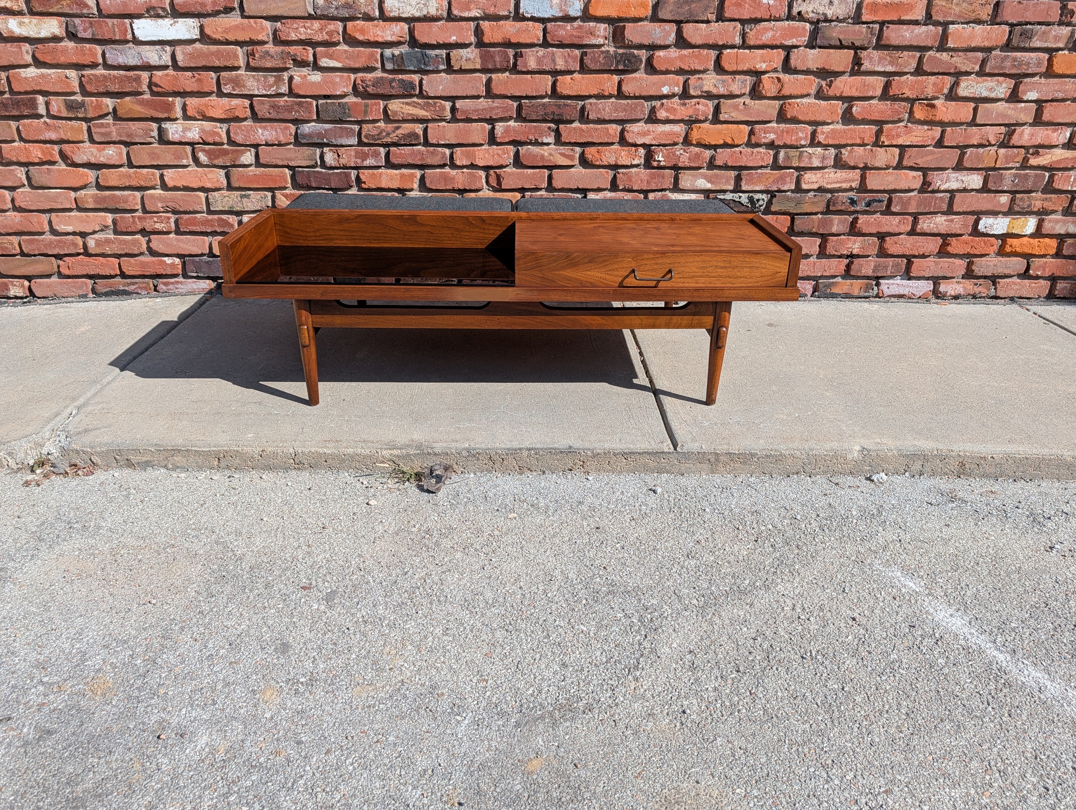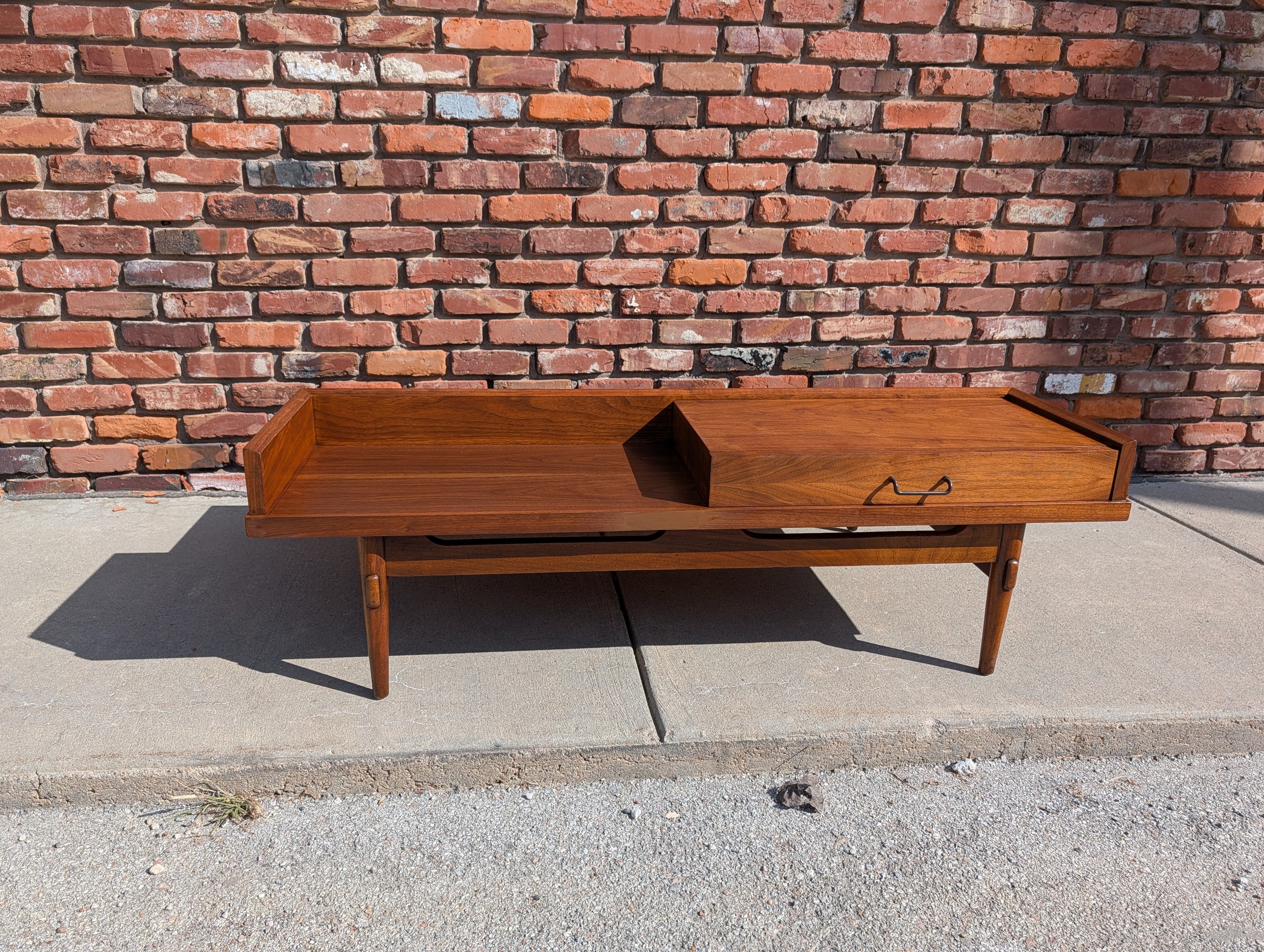 This is a spectacular and rare versatile piece from American of Martinsville's "Dania" line, designed by Merton Gershun. So versatile, it could be used as a coffee table or entry bench in your foyer. It has been professionally refinished and includes two original reversible black cushions in excellent condition and a smoked black glass topper that can be placed on two different sections of the table. There is a large front drawer.