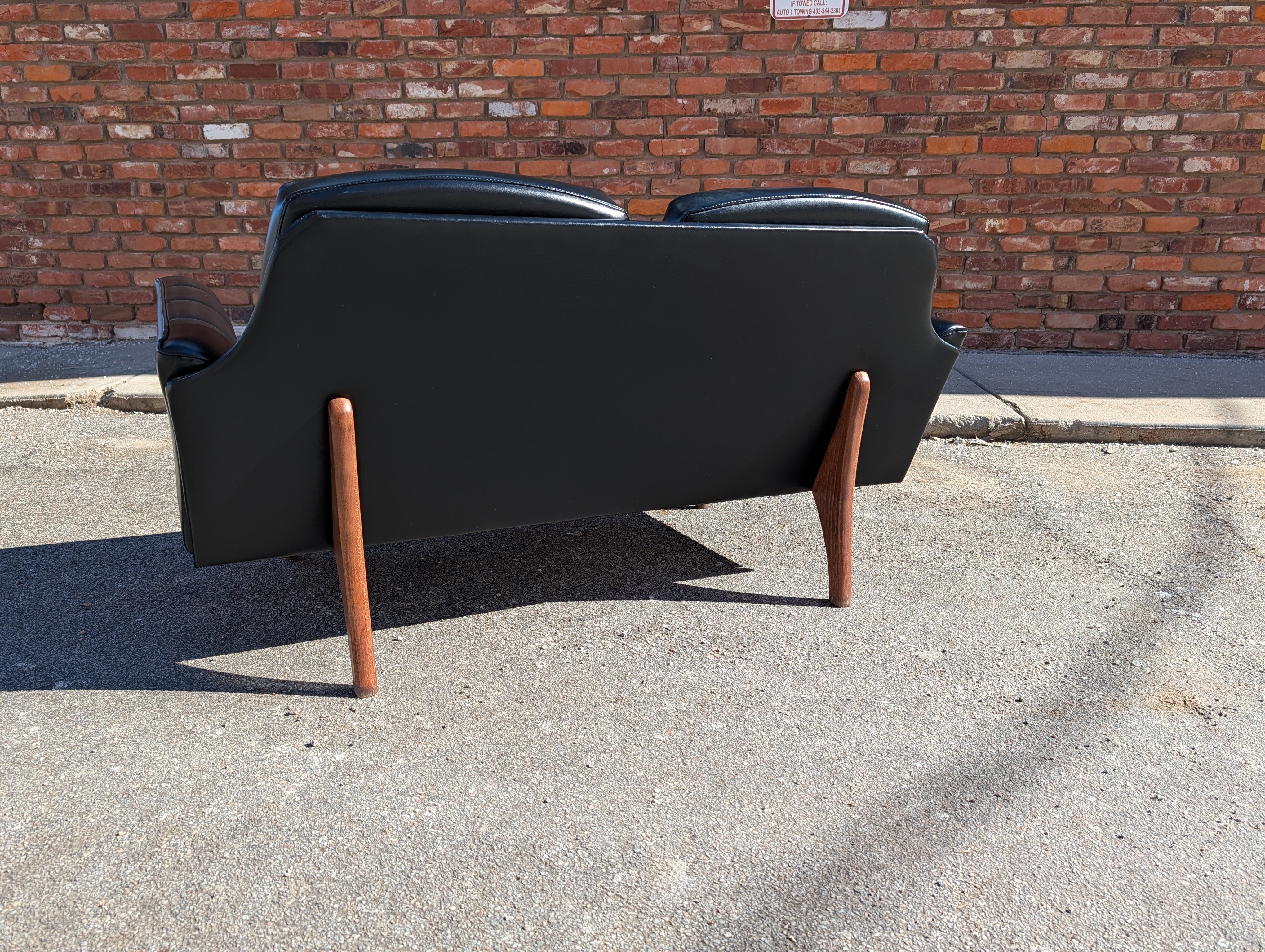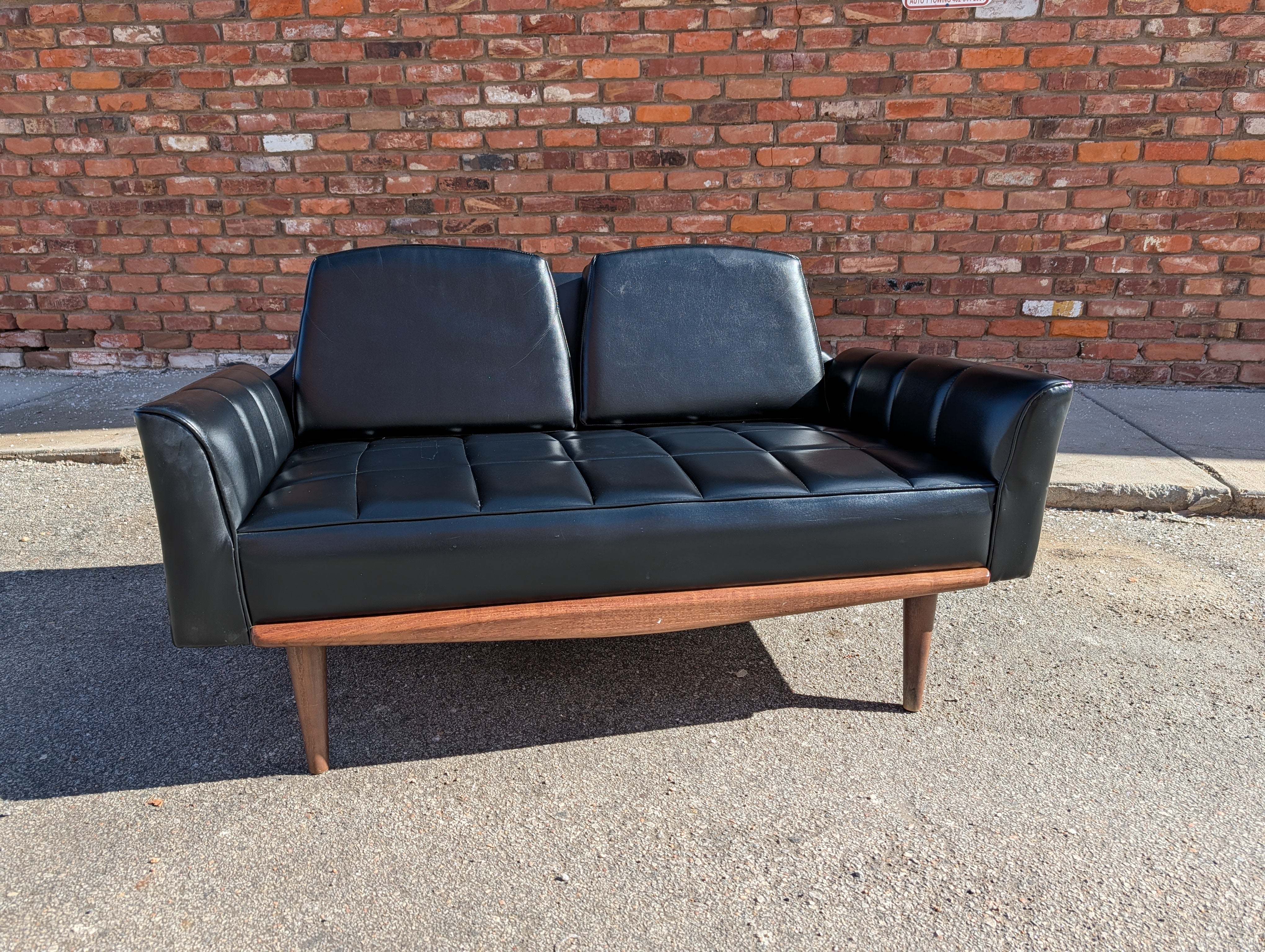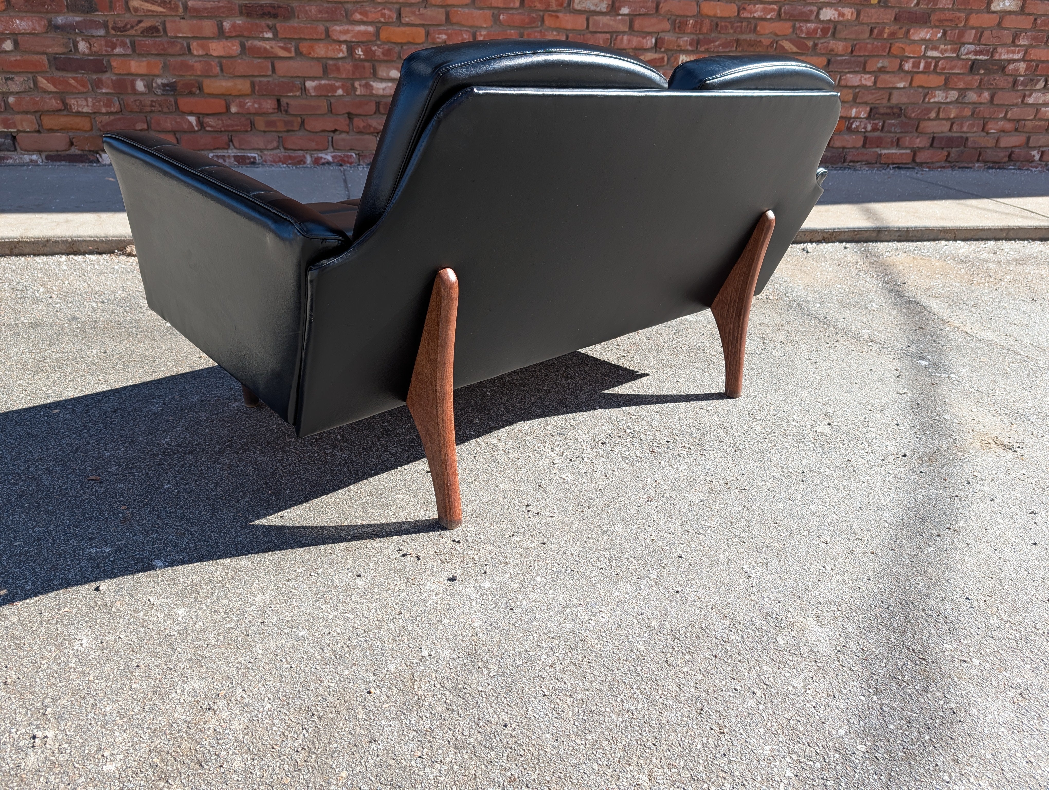 Achieve a sleek, mid century look to your home at an affordable price! This black vegan leather loveseat retains its original upholstery and is in excellent condition besides a few minor scuffs. No makers mark, but this is a cool piece that will easily fit into a living room, office or anywhere else you need comfy, stylish seating.