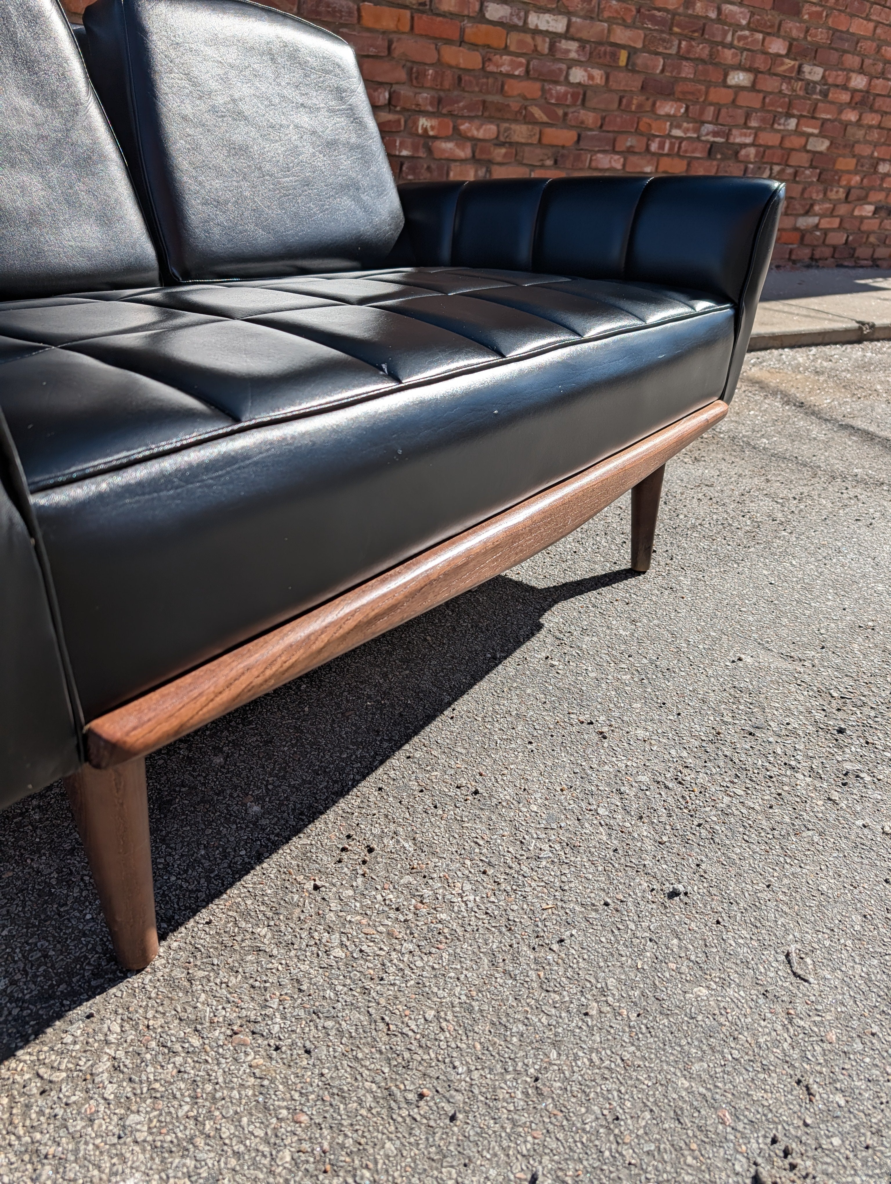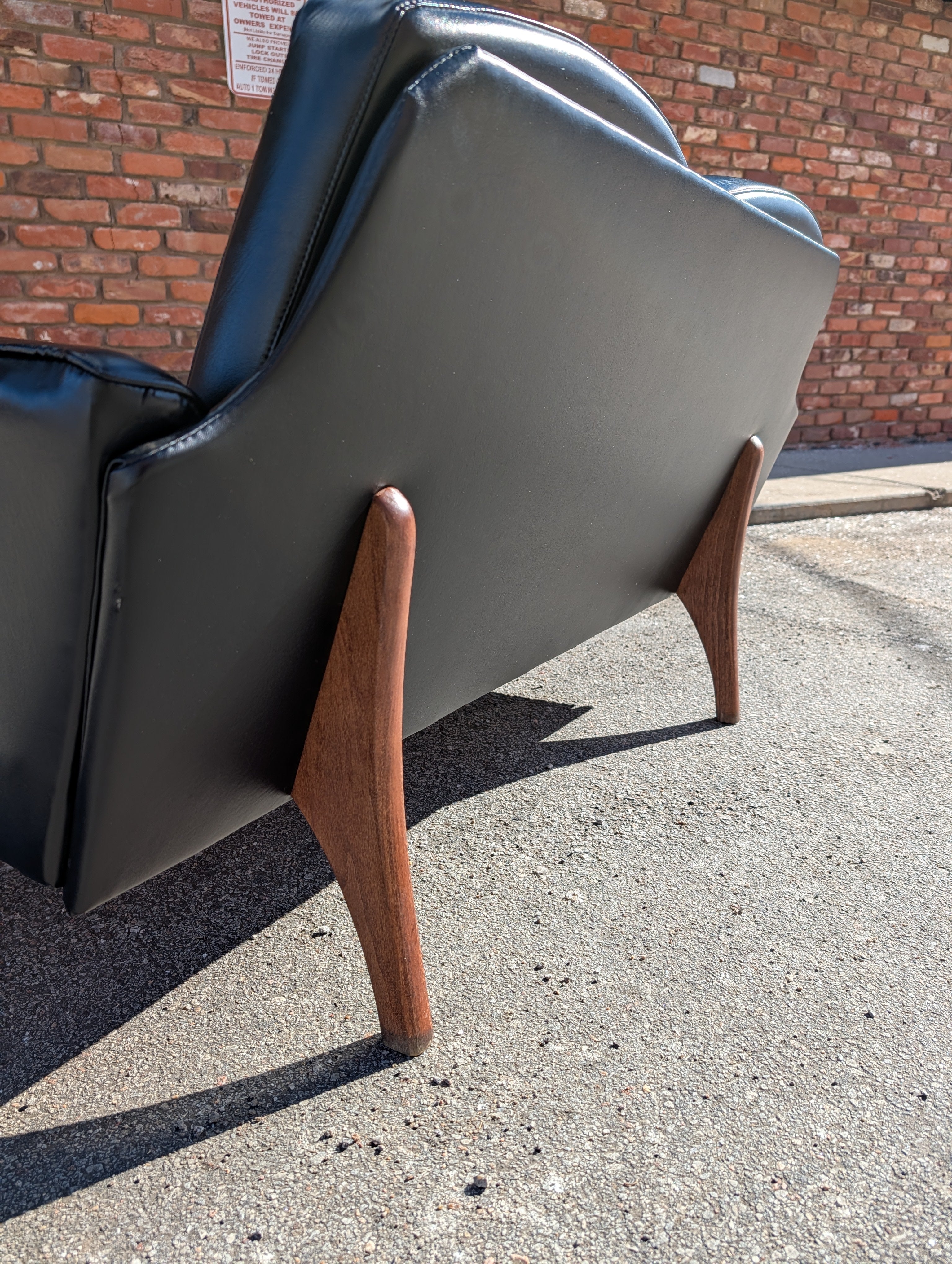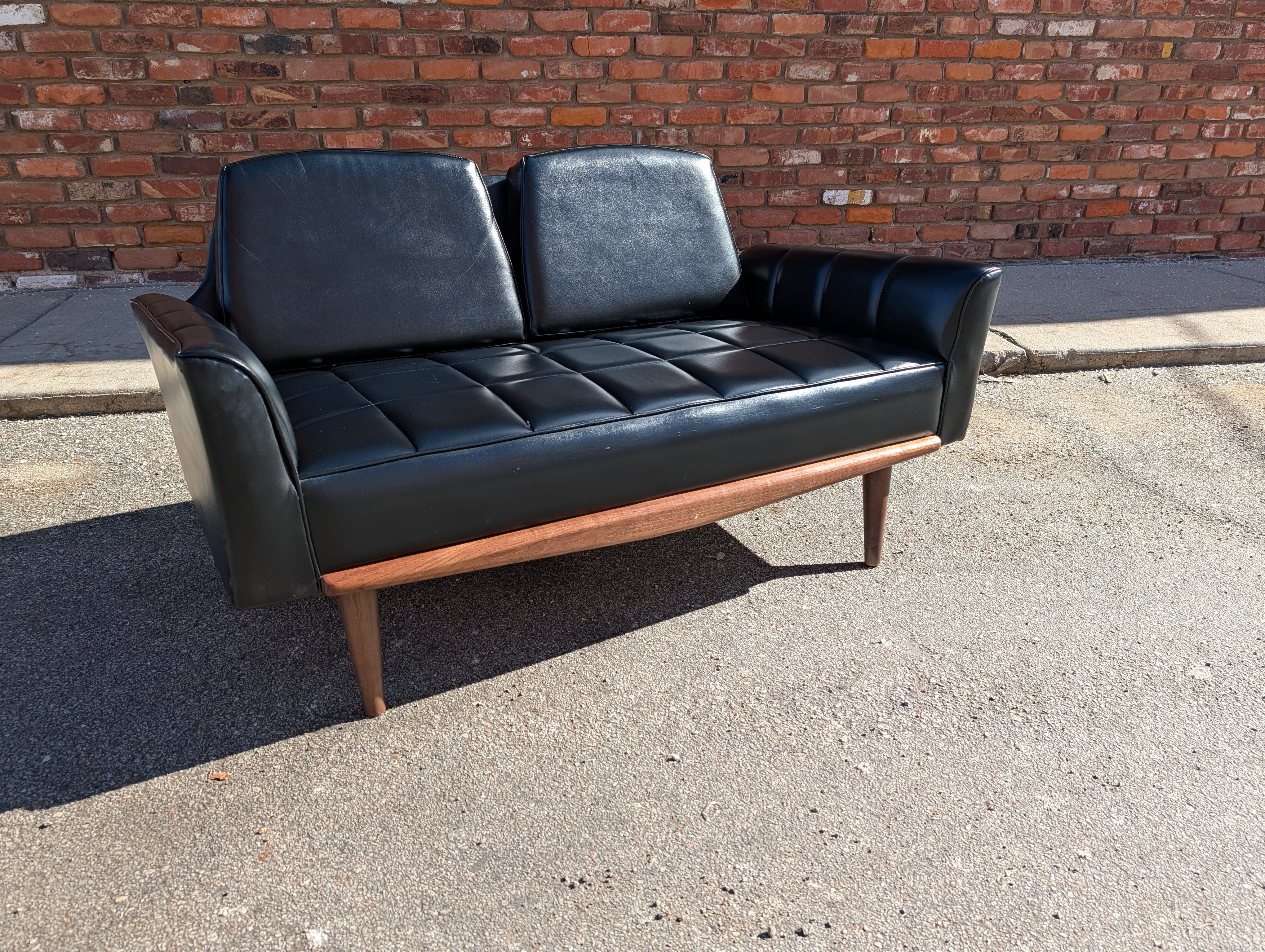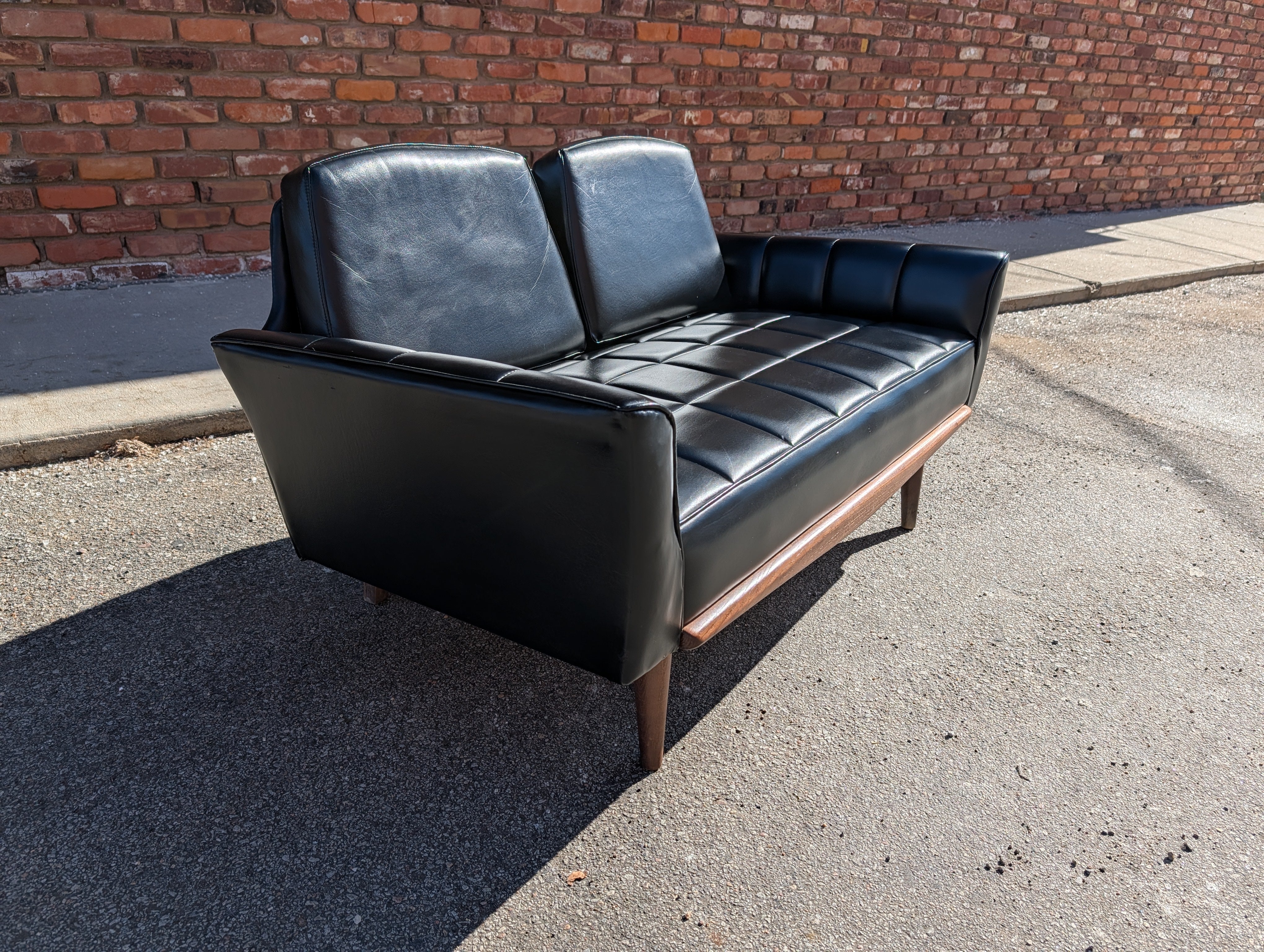 Achieve a sleek, mid century look to your home at an affordable price! This black vegan leather loveseat retains its original upholstery and is in excellent condition besides a few minor scuffs. No makers mark, but this is a cool piece that will easily fit into a living room, office or anywhere else you need comfy, stylish seating.