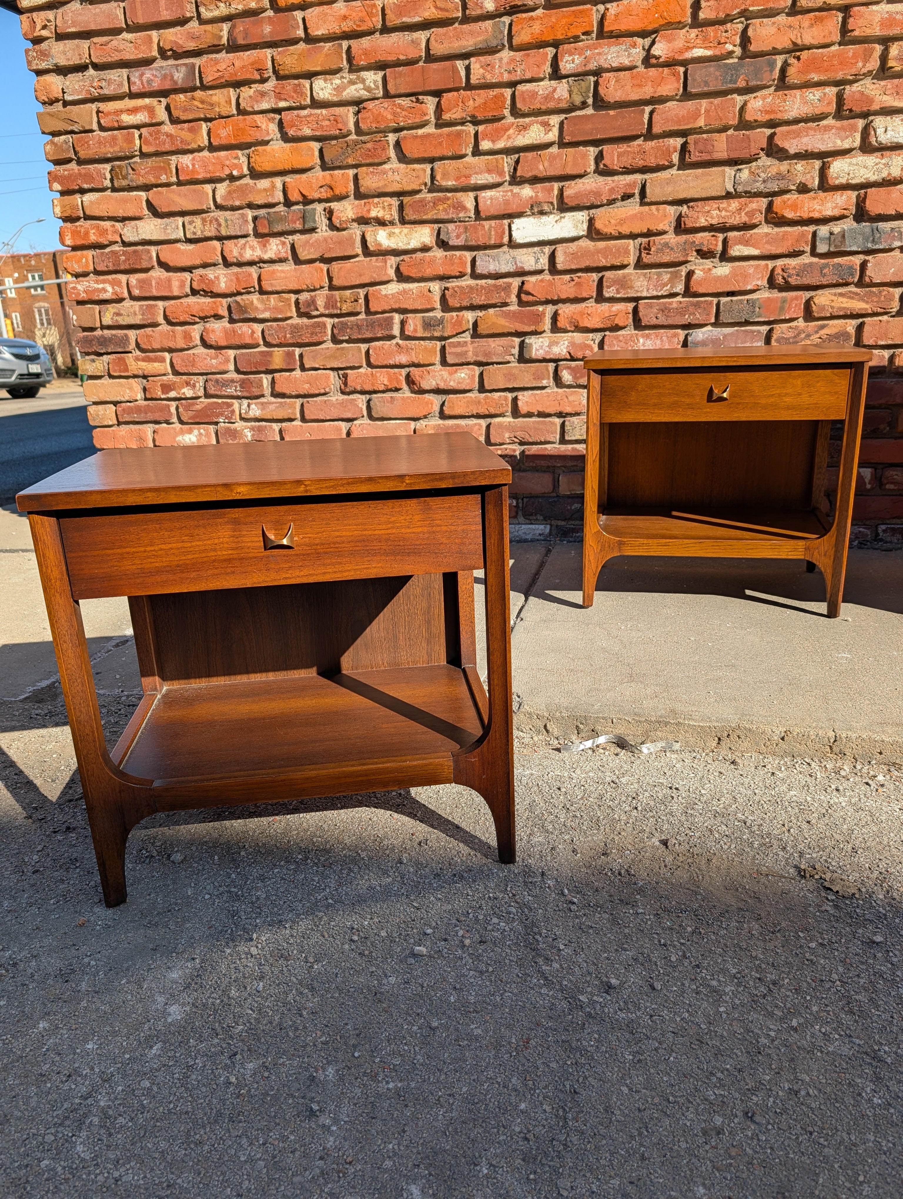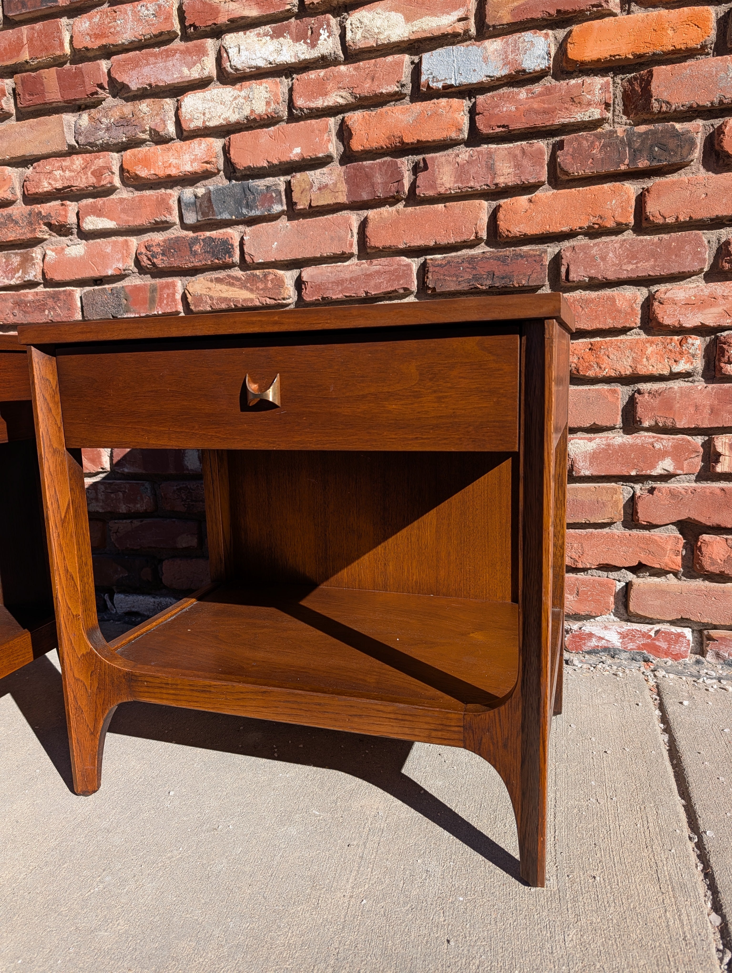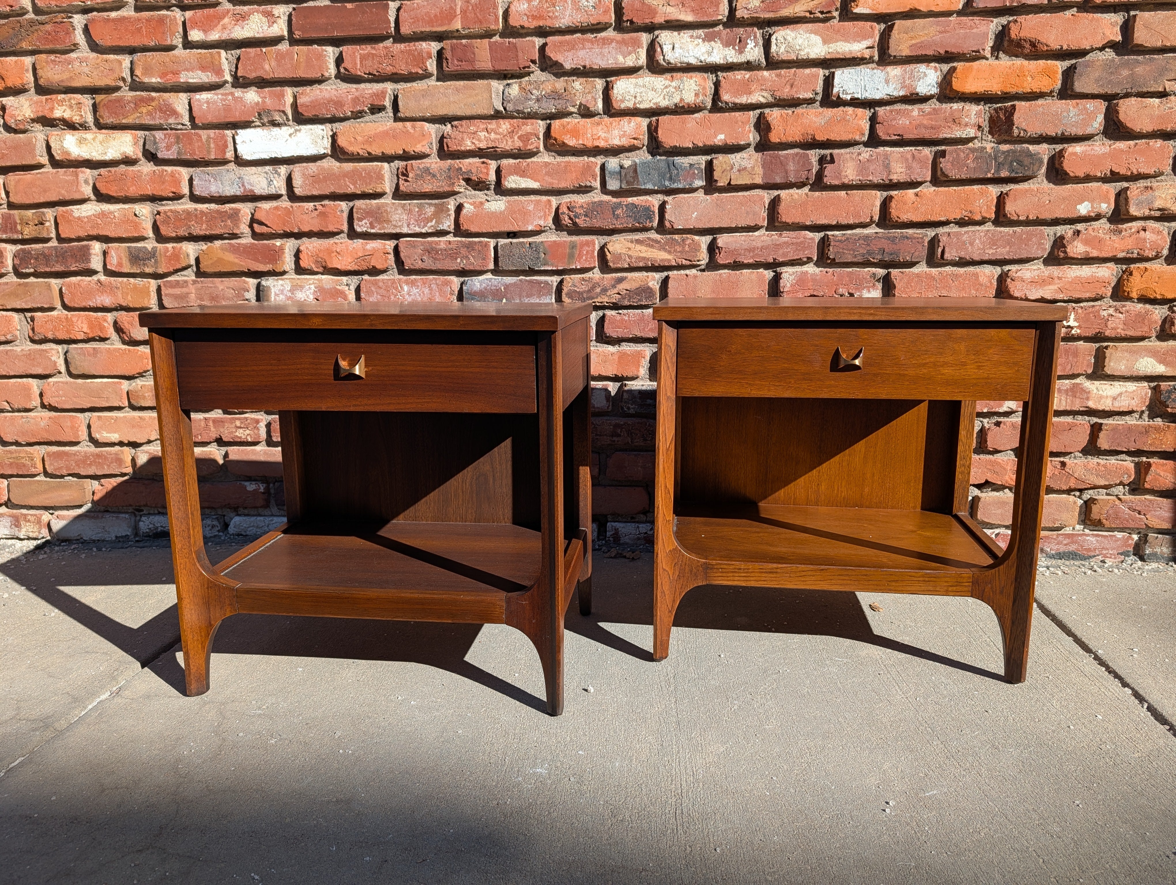 This pair of Broyhill "Brasilia" nightstands have been professionally refinished (tops and touch up) and are in like new condition! They both feature a single drawer with the recognizable brass arc pull. Snag this set while you can!