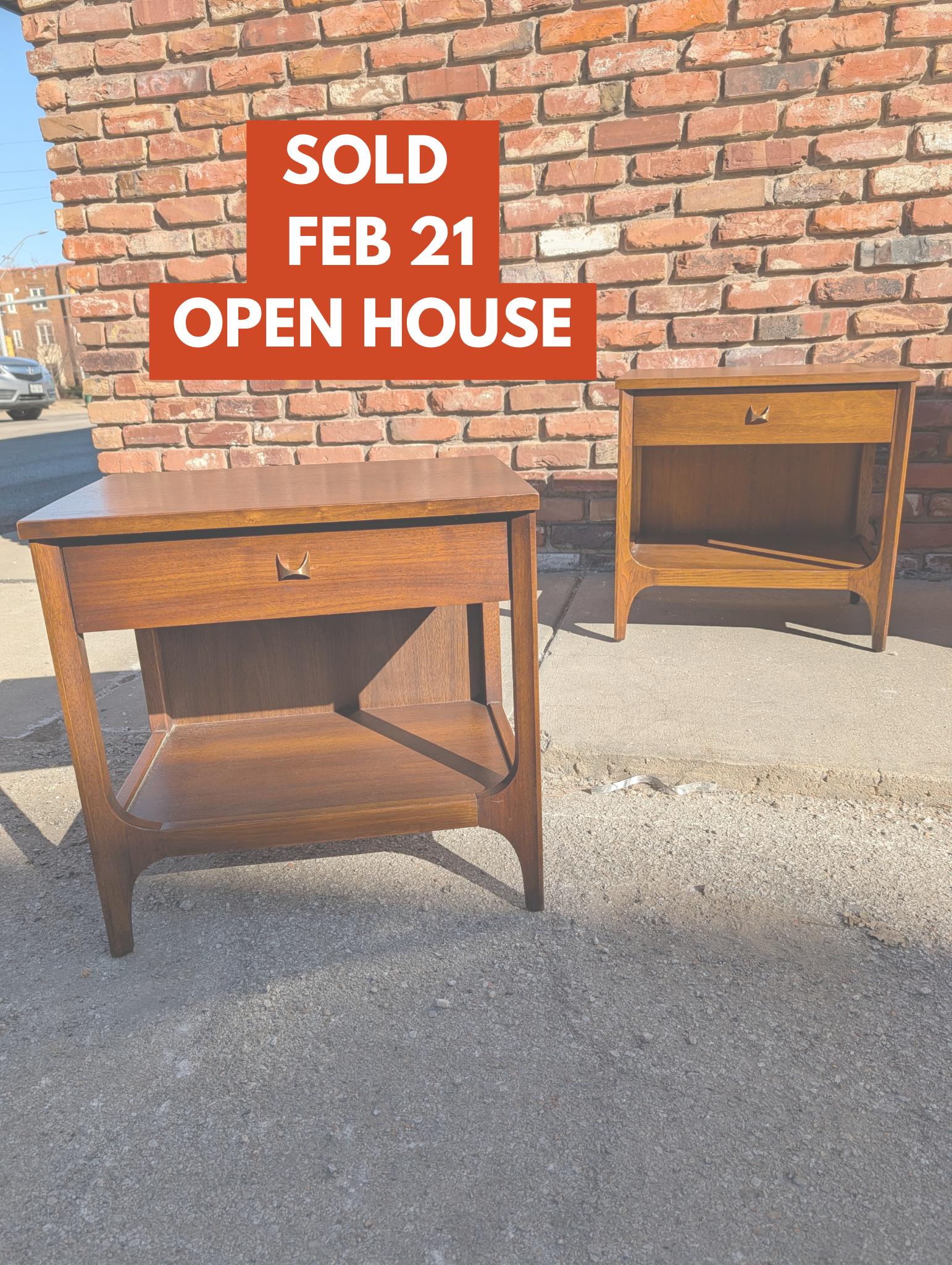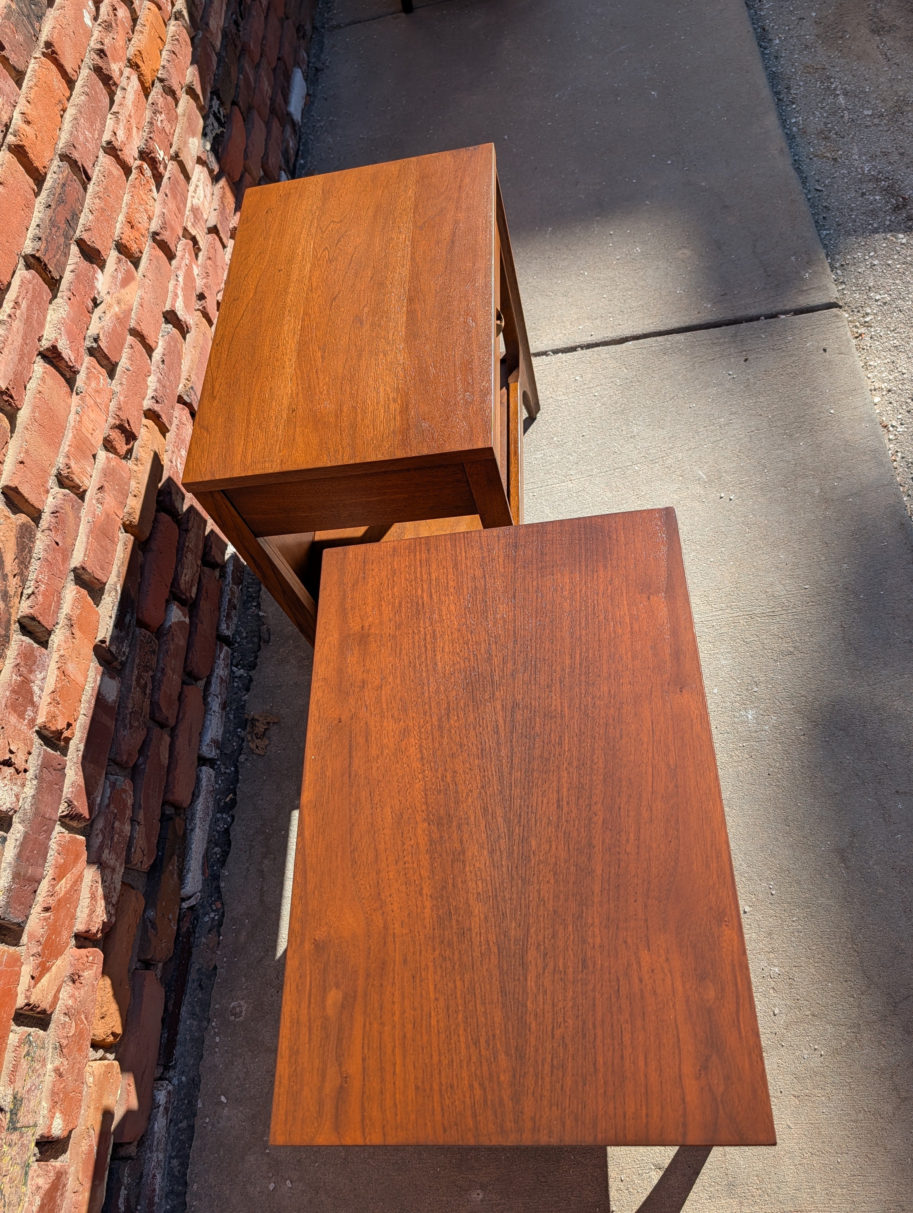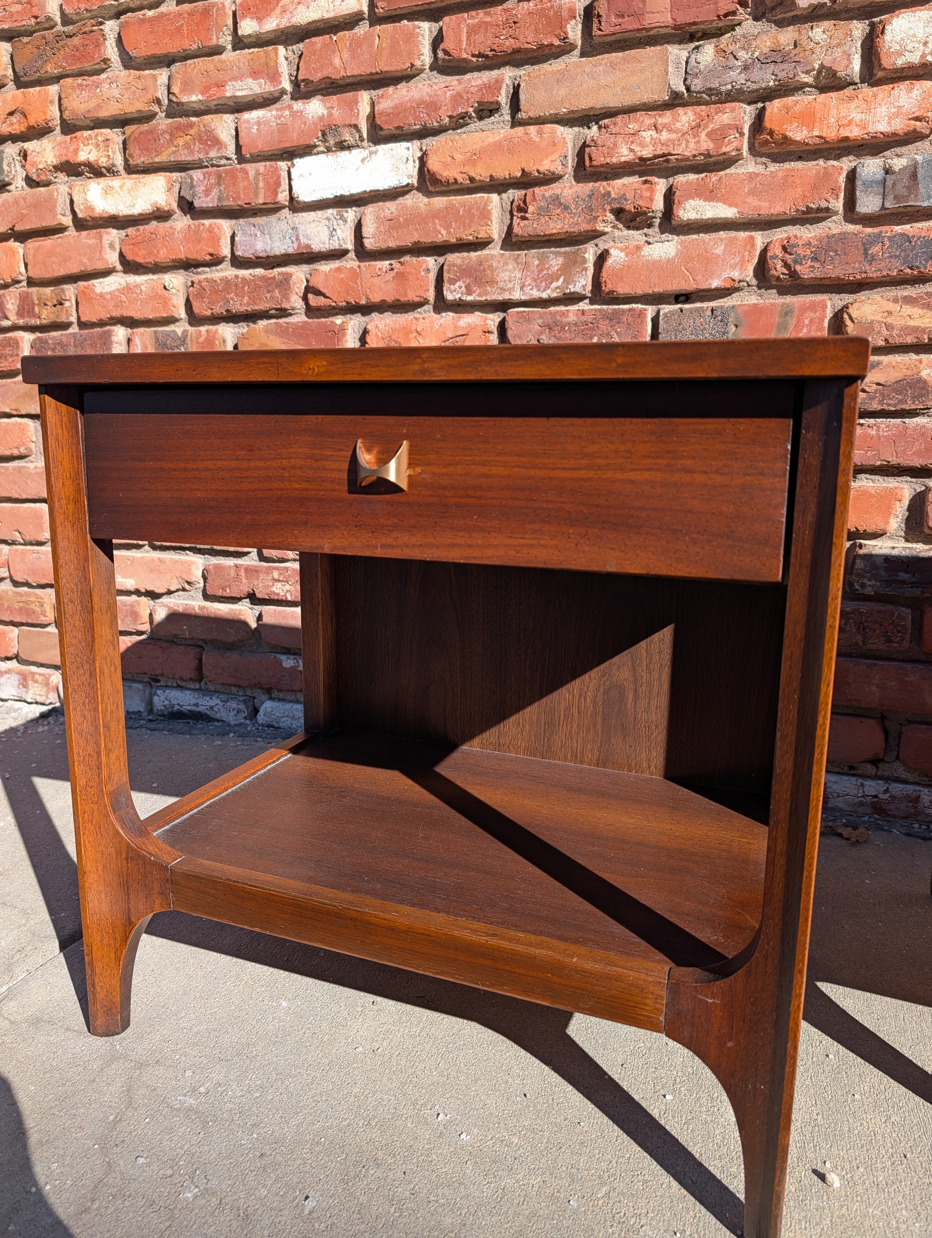 This pair of Broyhill "Brasilia" nightstands have been professionally refinished (tops and touch up) and are in like new condition! They both feature a single drawer with the recognizable brass arc pull. Snag this set while you can!
