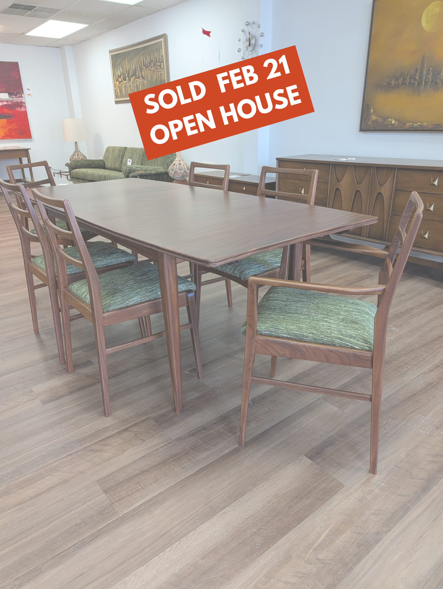 You've probably seen American mid century modern and maybe Danish - but what about British mid century modern! We're pleased to present a fully restored dining set crafted in solid Afromosia wood, designed by Richard Hornby for Fyne Ladye Furniture in the 1960s! This set is special, not only because it not often seen in the United States, but also because of the way it was designed. The leaf nests easily within the table and you can even remove the table top on either side! The 6 chairs include two captains chairs and four side chairs. Refreshed with new green chenille upholstery, you can actually pop the seats on and off of a single dowel.