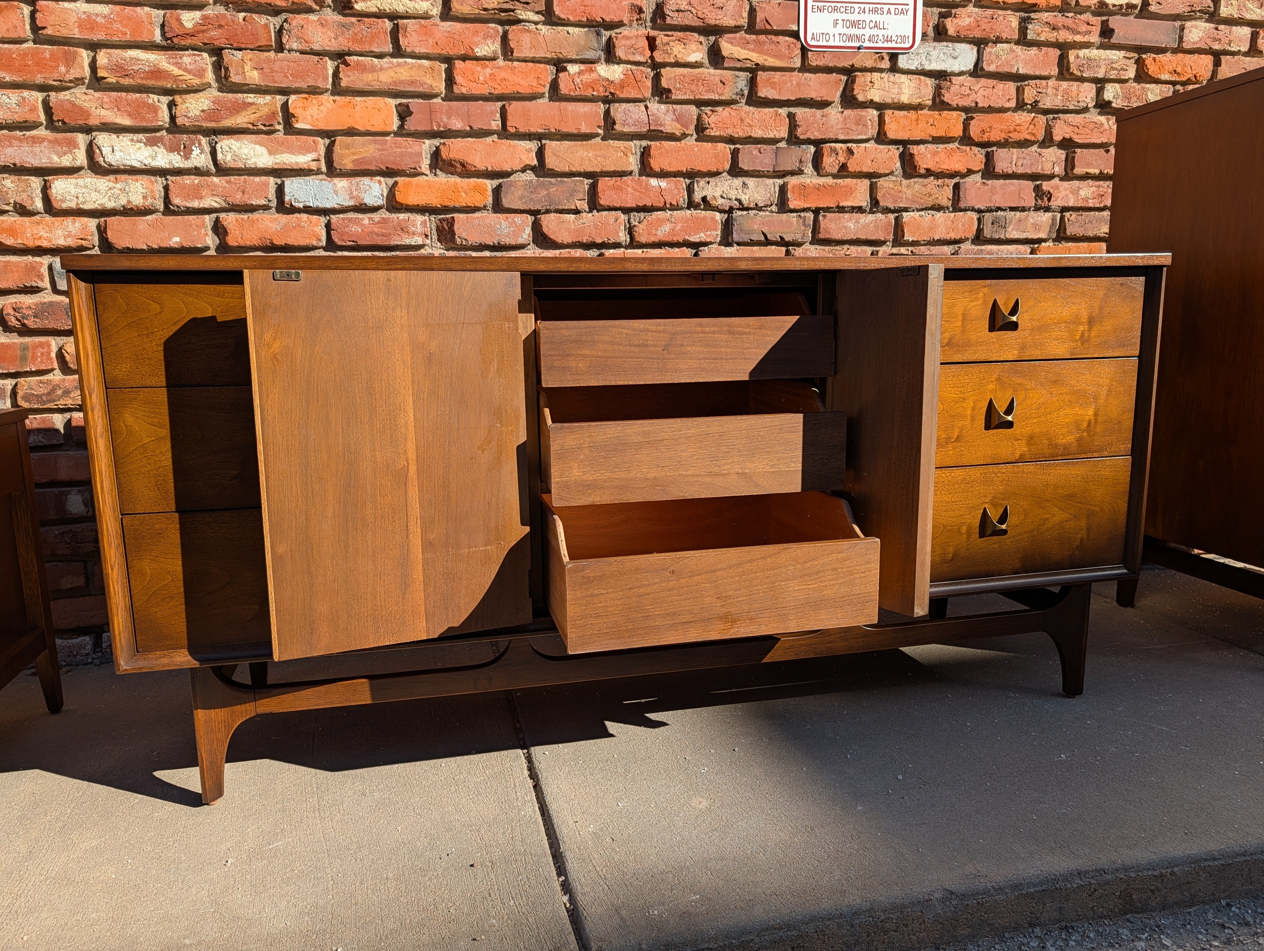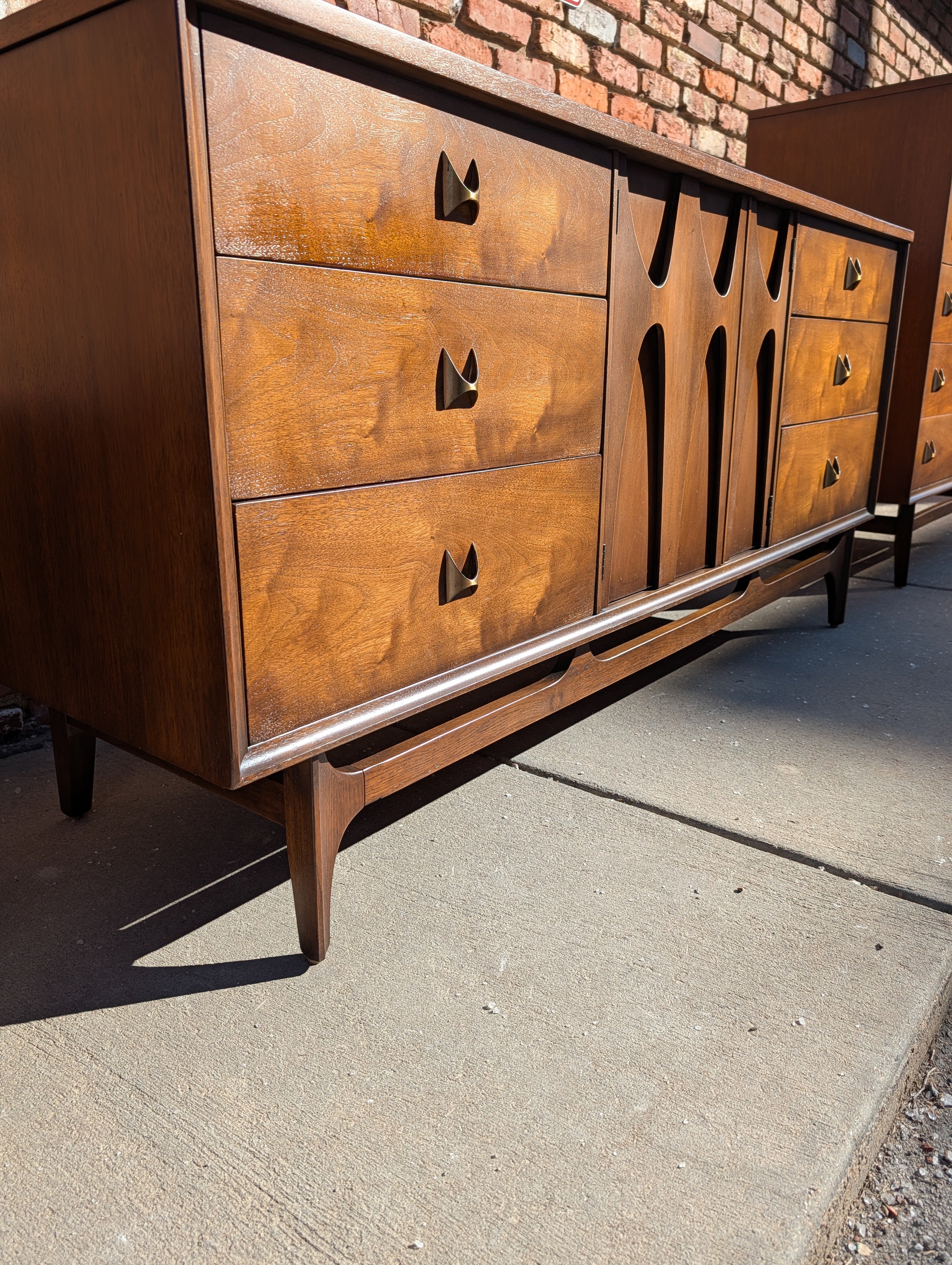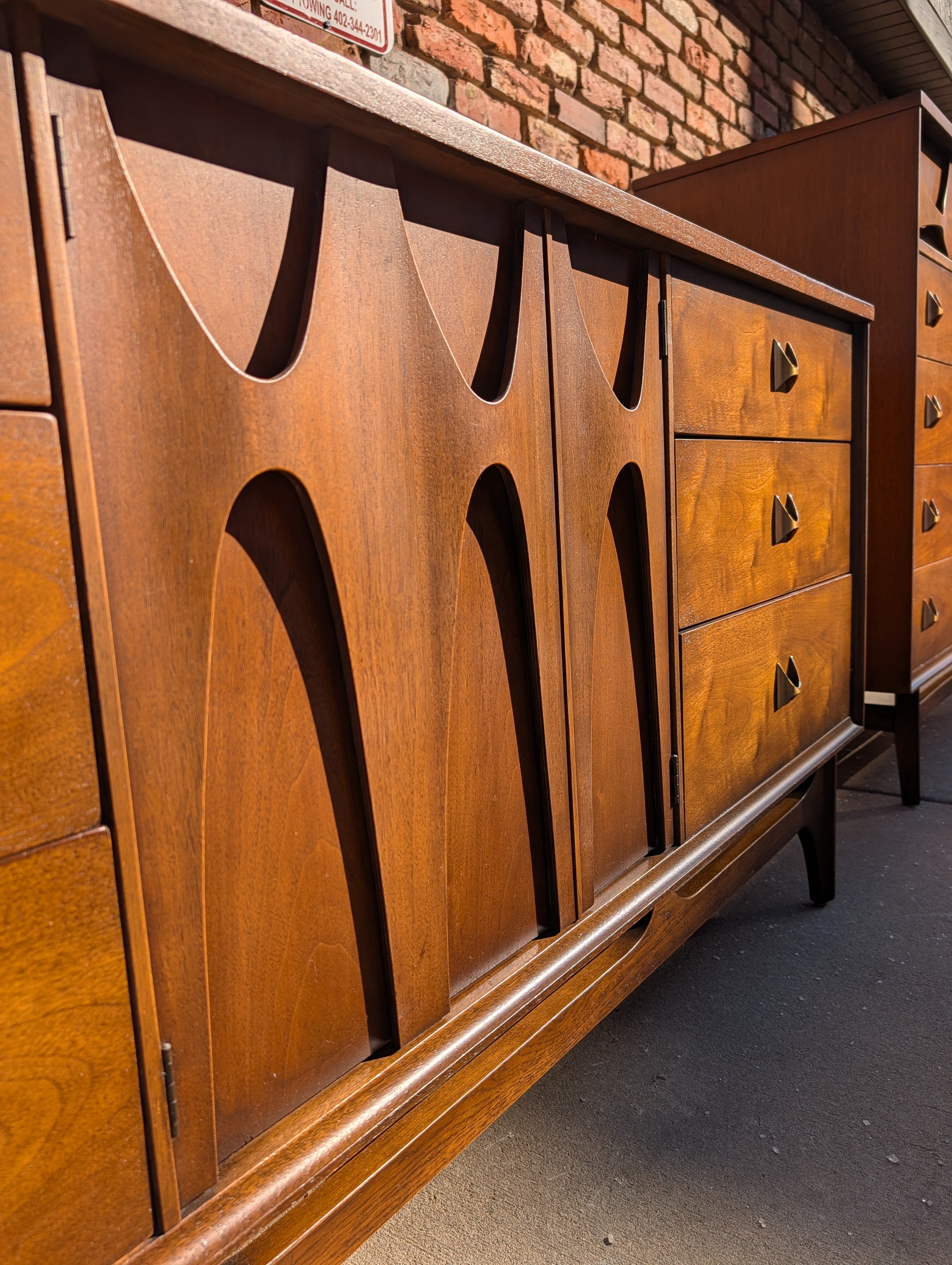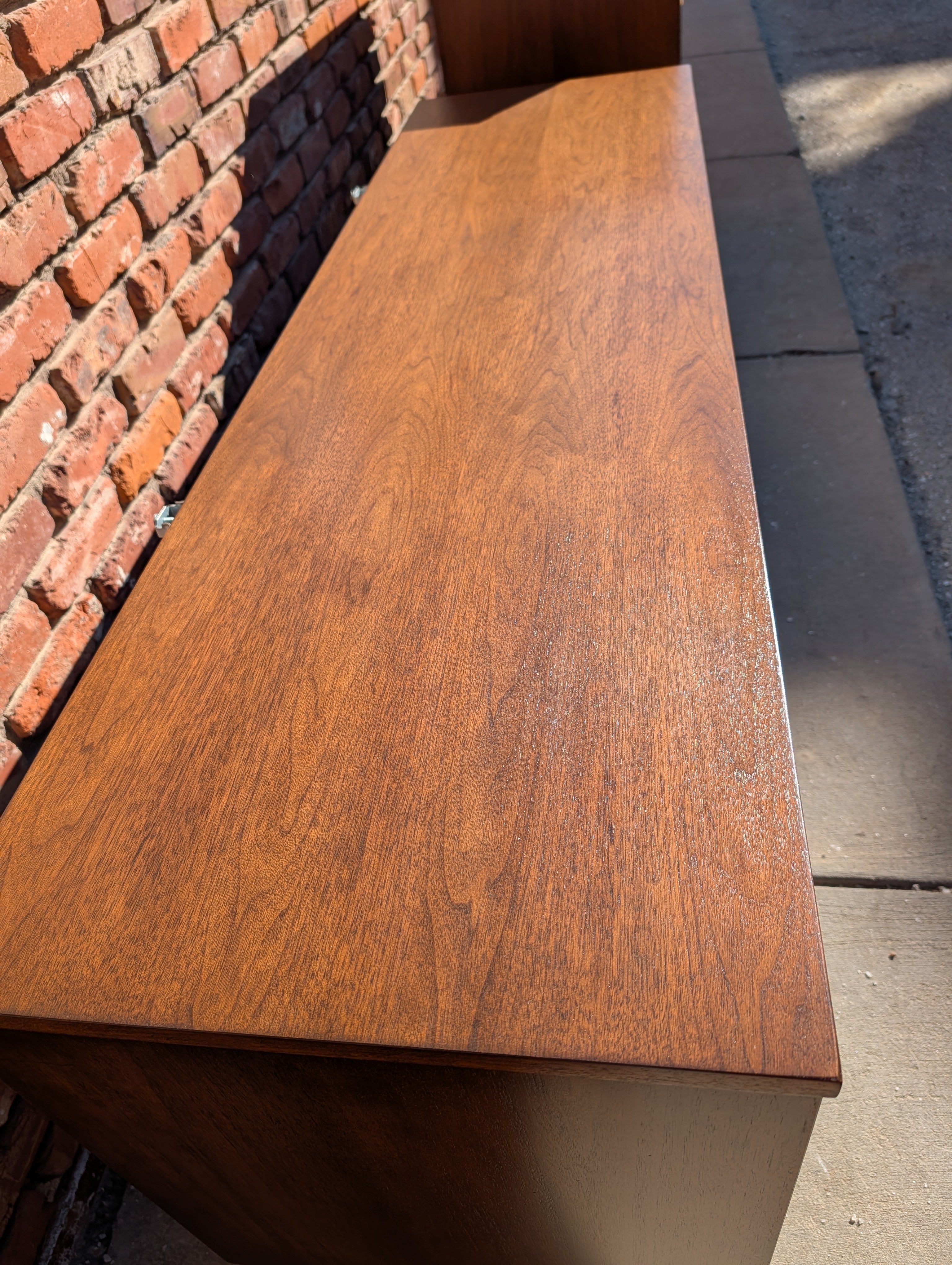 This lowboy nine drawer Broyhill Brasilia dresser has been professionally refinished. It is accompanied by a large matching mirror (Bonus!)