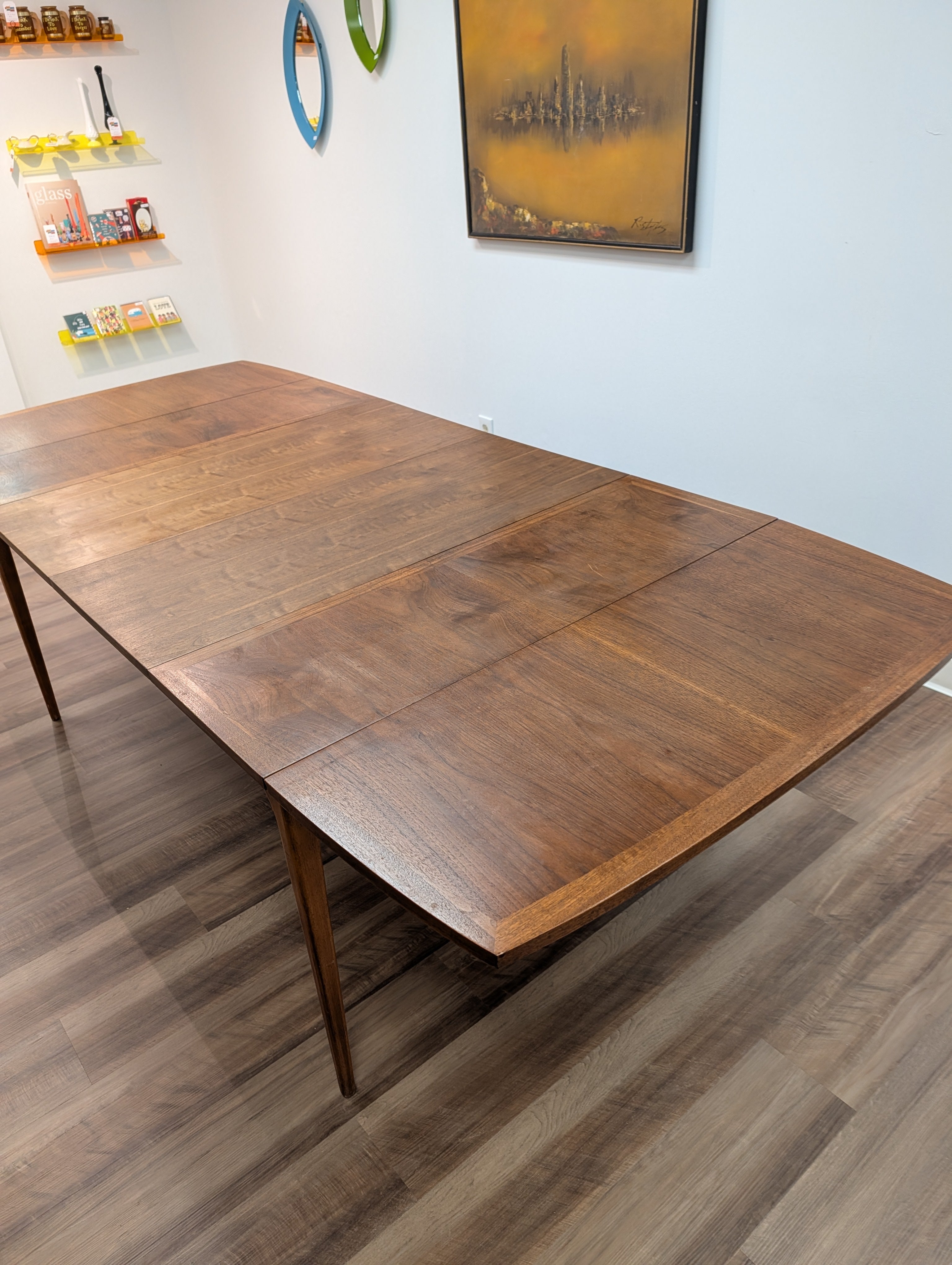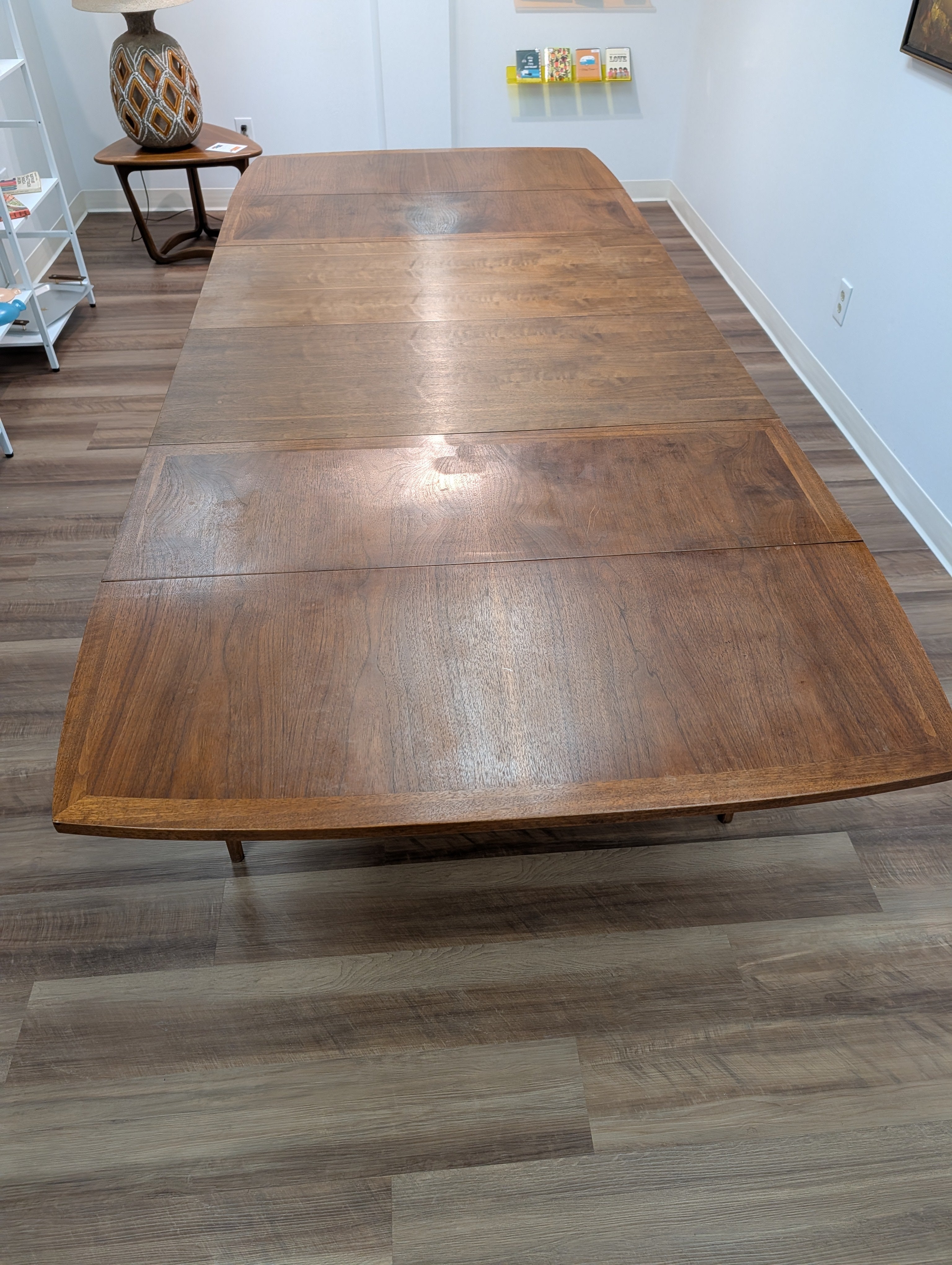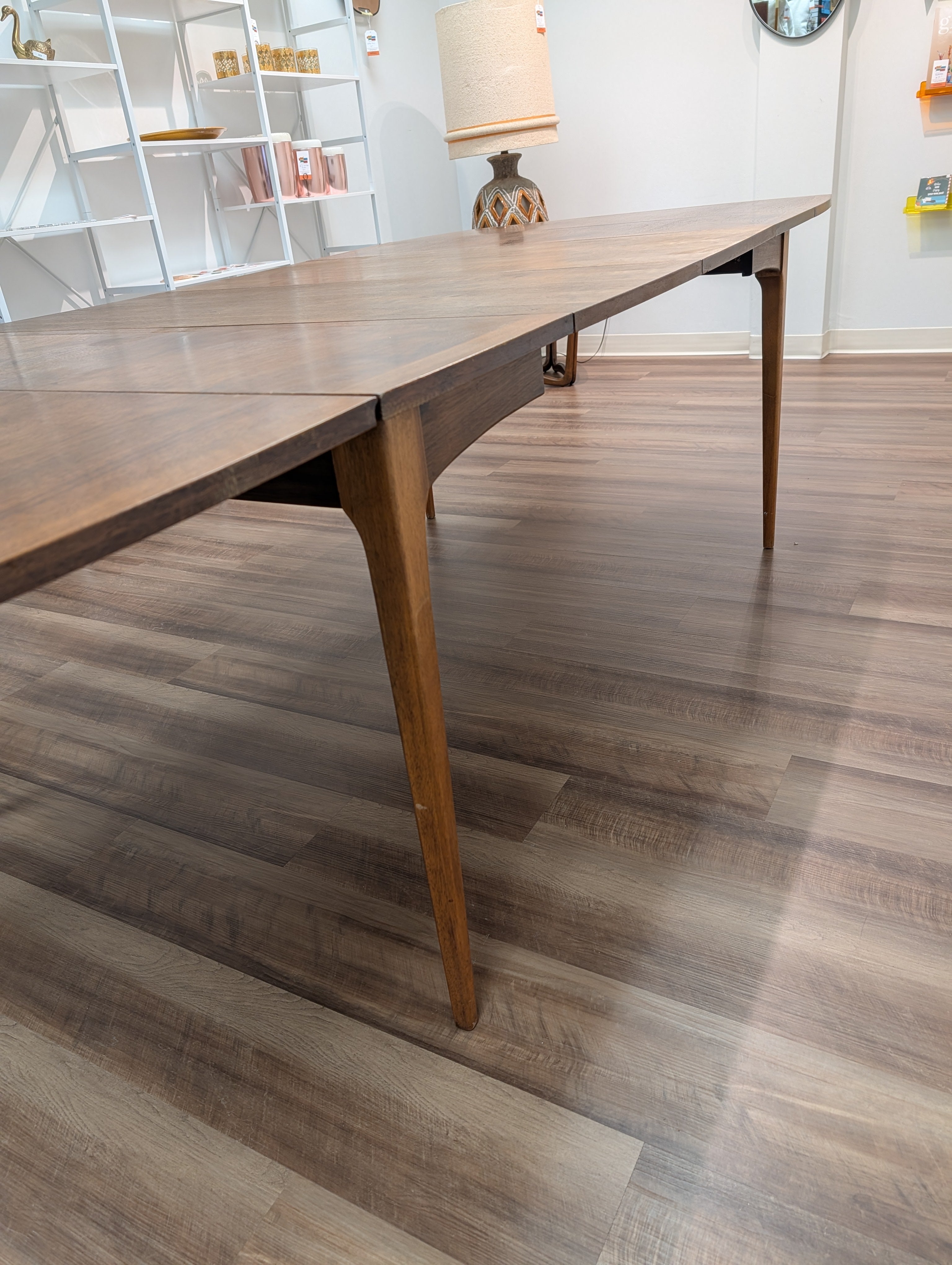 This is a large Lane "Rhythm" dropleaf table with two leaves that retains its original finish. If you would like to add restoration services, our refinishing quote is an additional $600 to get this table looking like new! If interested contact us!