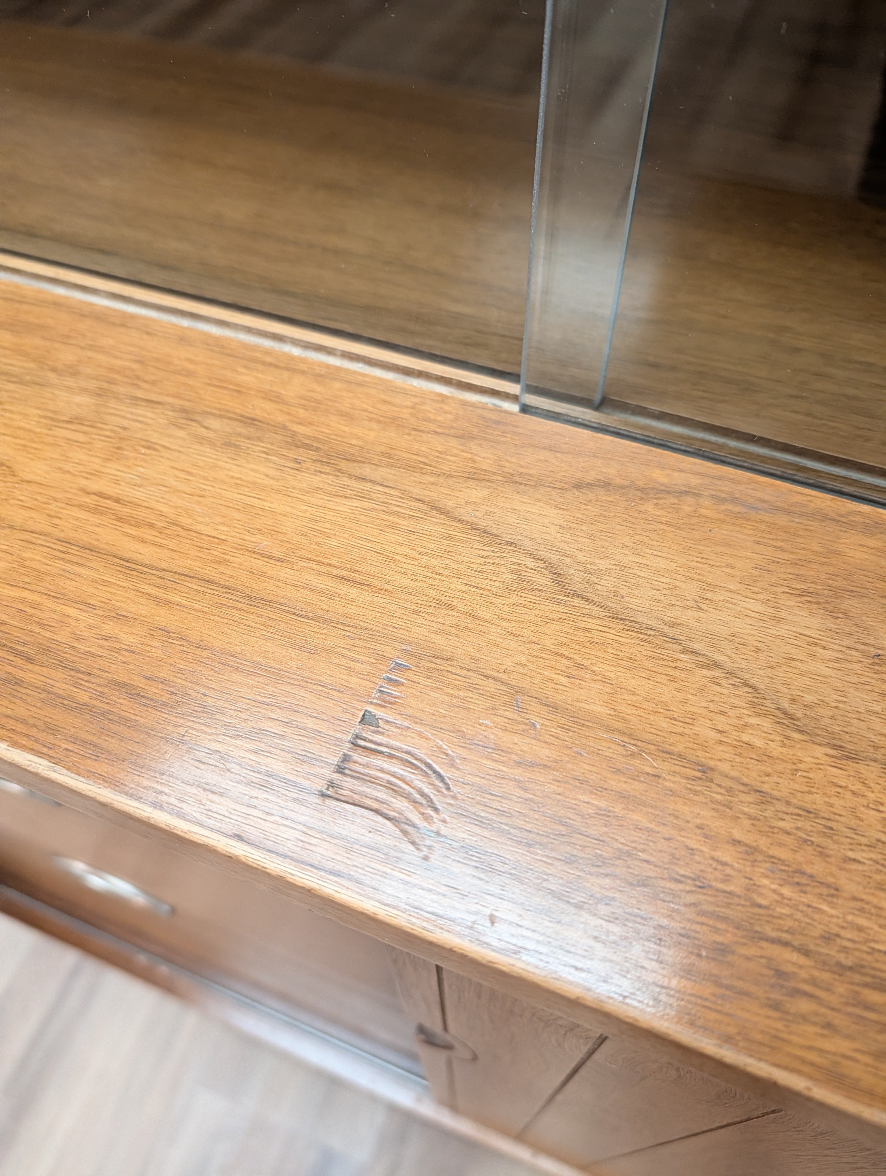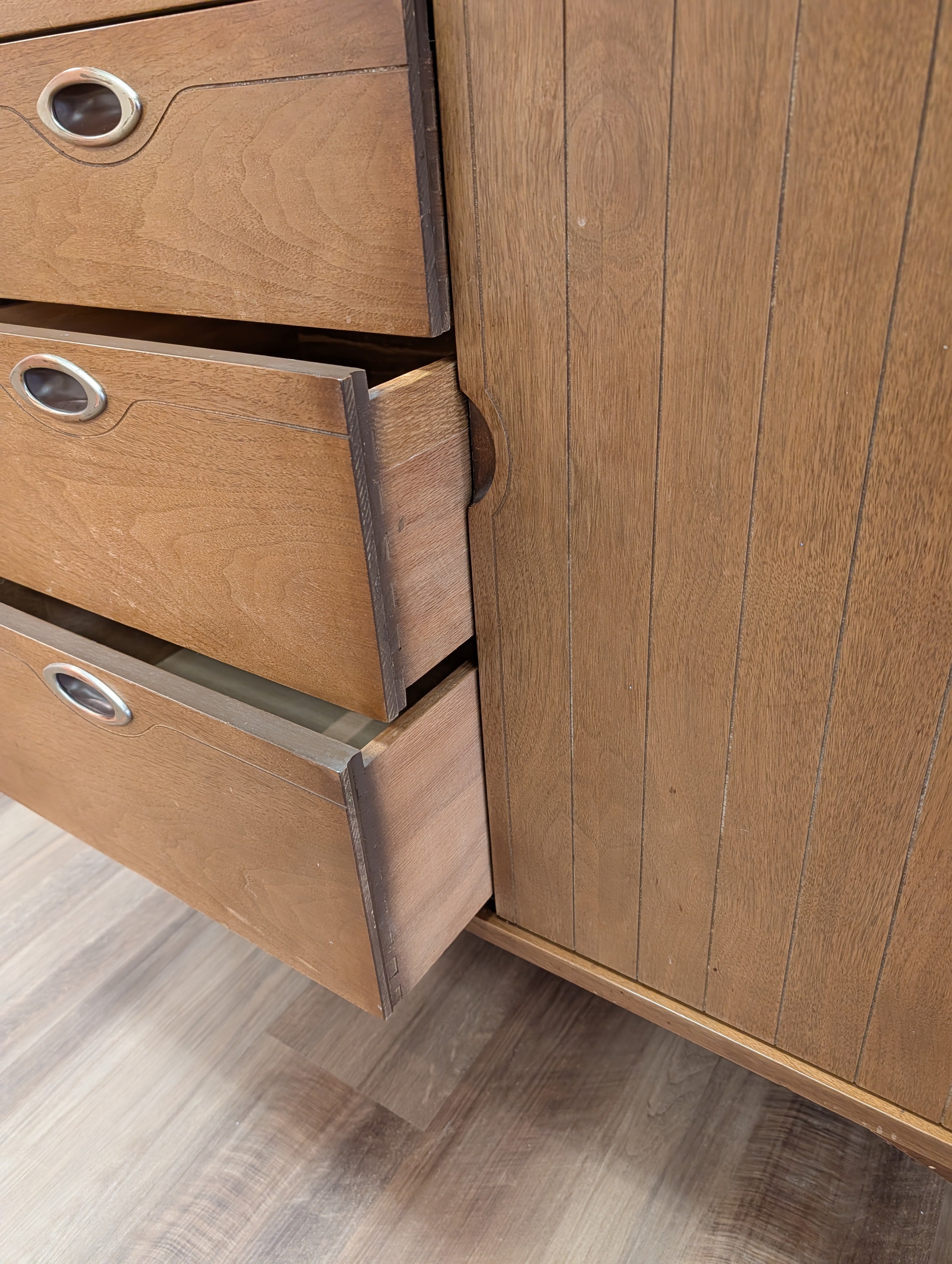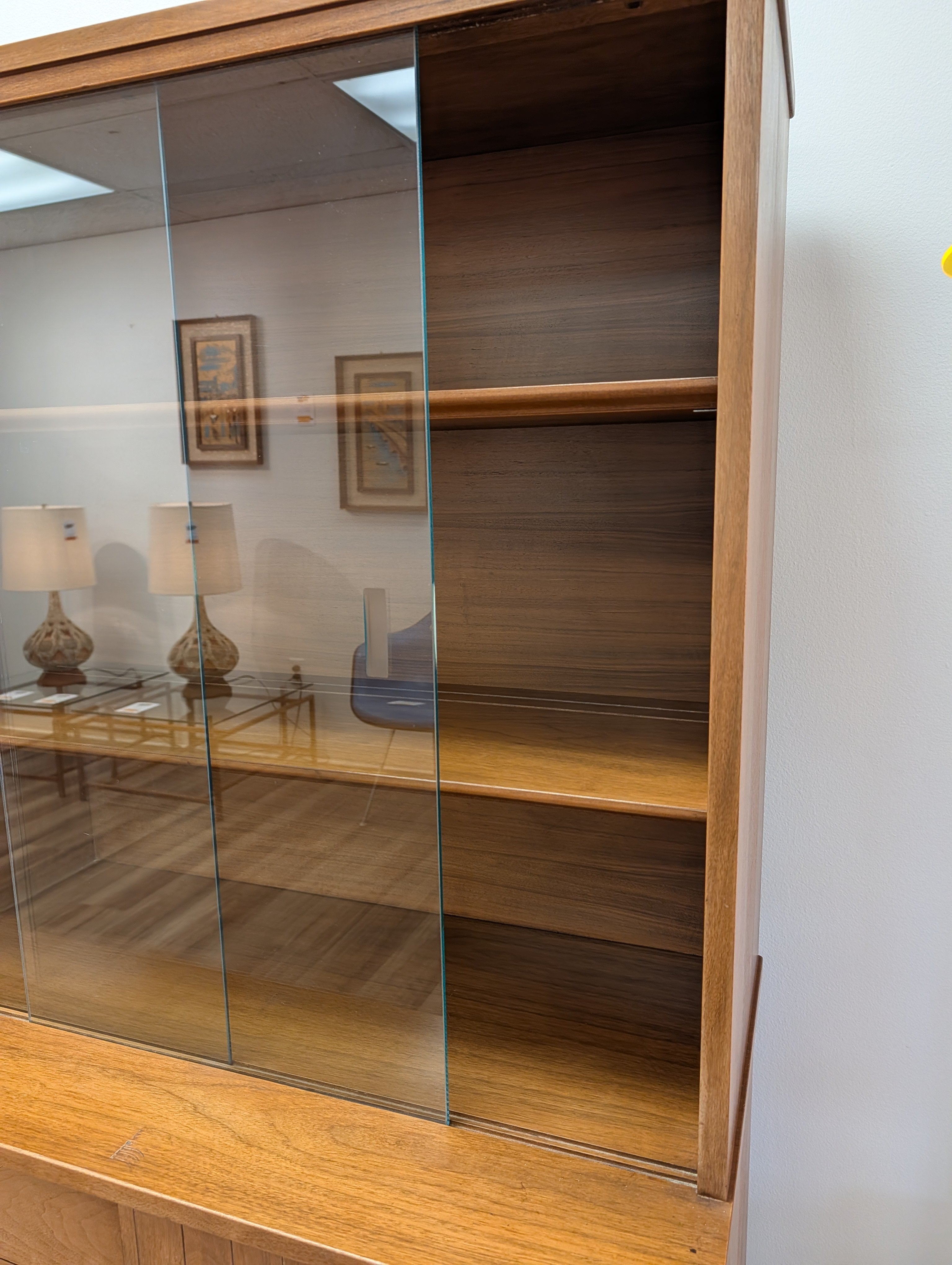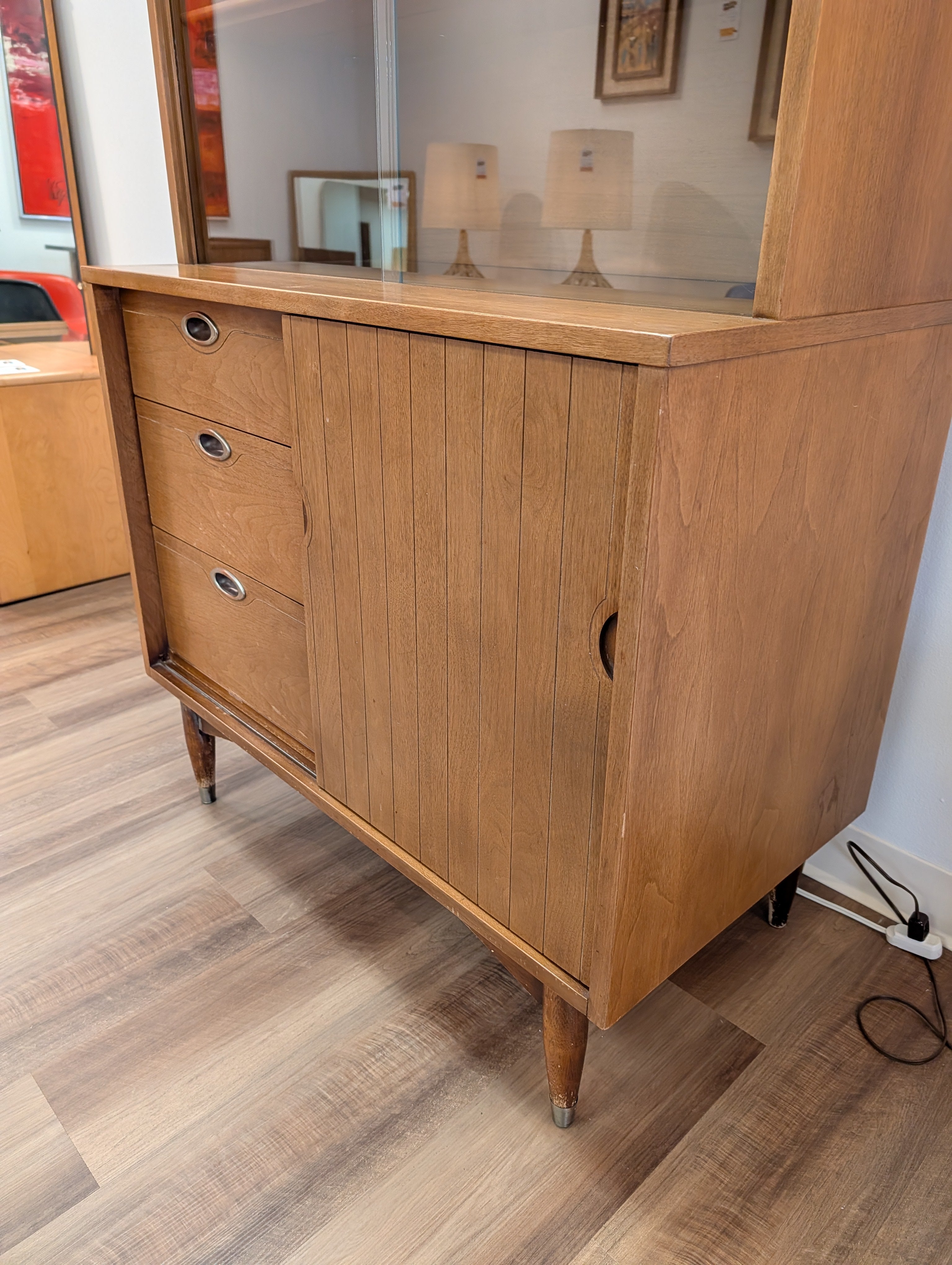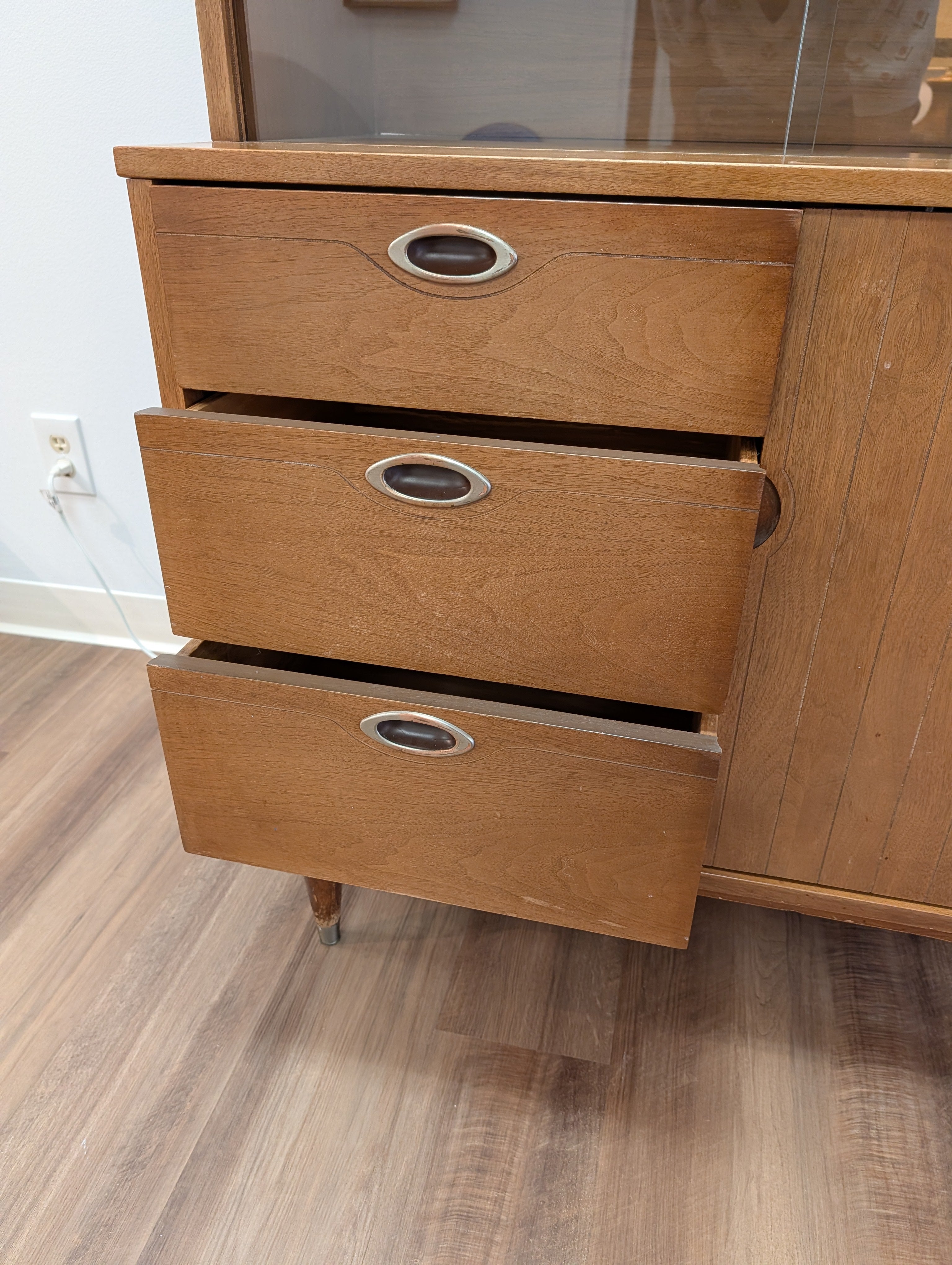 This is a one piece hutch from Mainline by Hooker. It features two glass sliding panels on the top section, with two removable wood shelves behind the glass, the lower section has three drawers on the left side and a single drawer on the right side, and a removable wood sliding panel. Some minor signs of wear, as pictured.