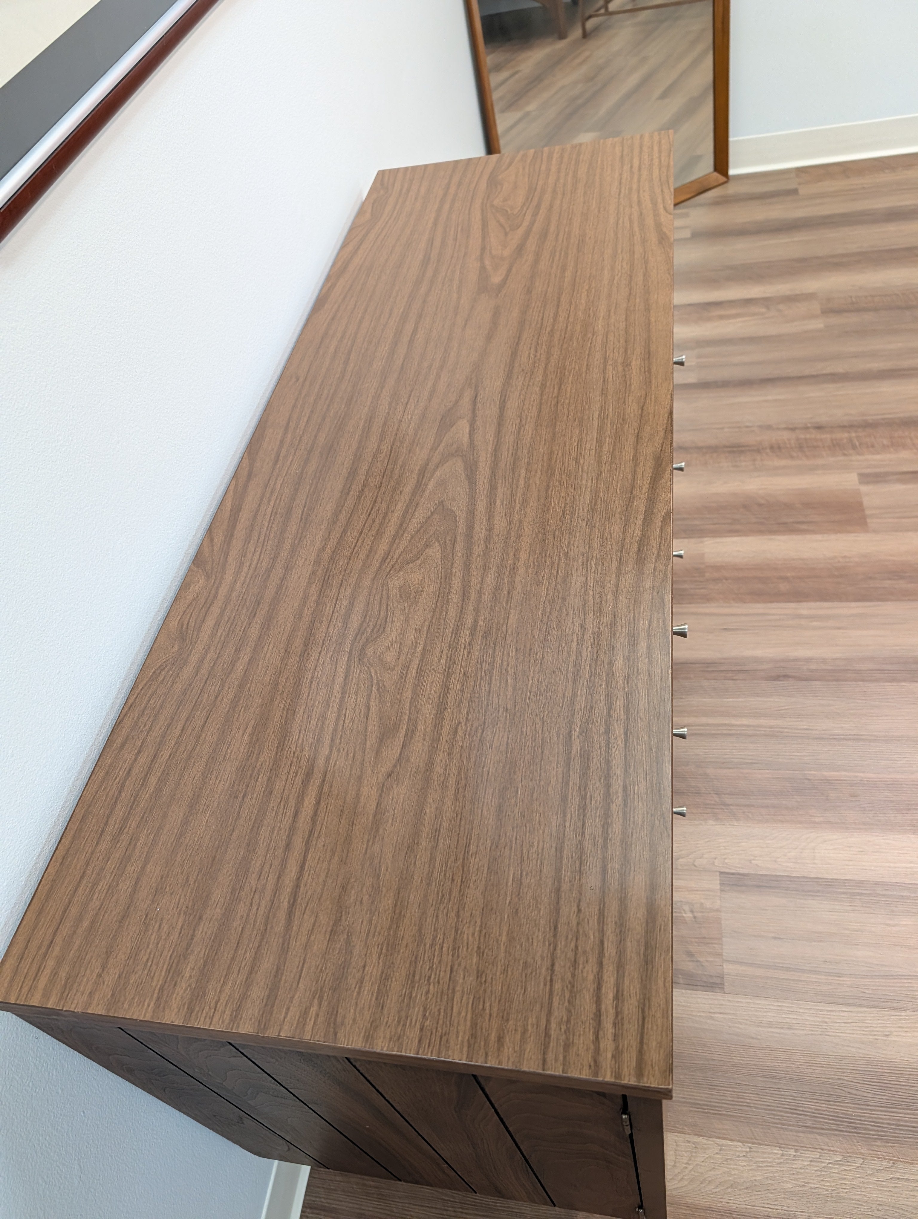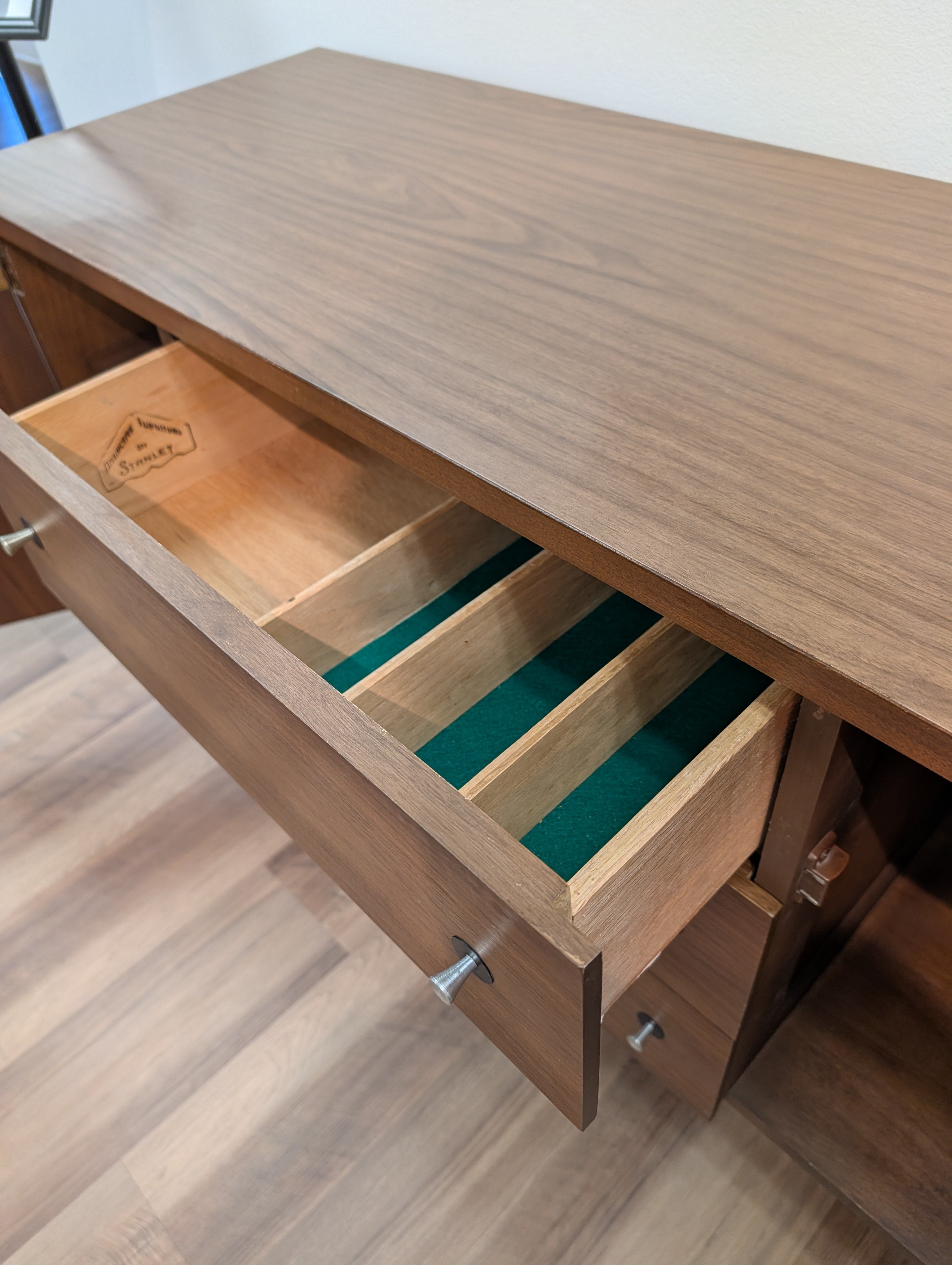 This is a Stanley credenza with a durable laminate top. The credenza has two side cabinet doors that open to reveal two shelves. There are three center drawers with aluminum pulls. The top drawer has a silverware organizer, that could be used to organize pens or other small items.