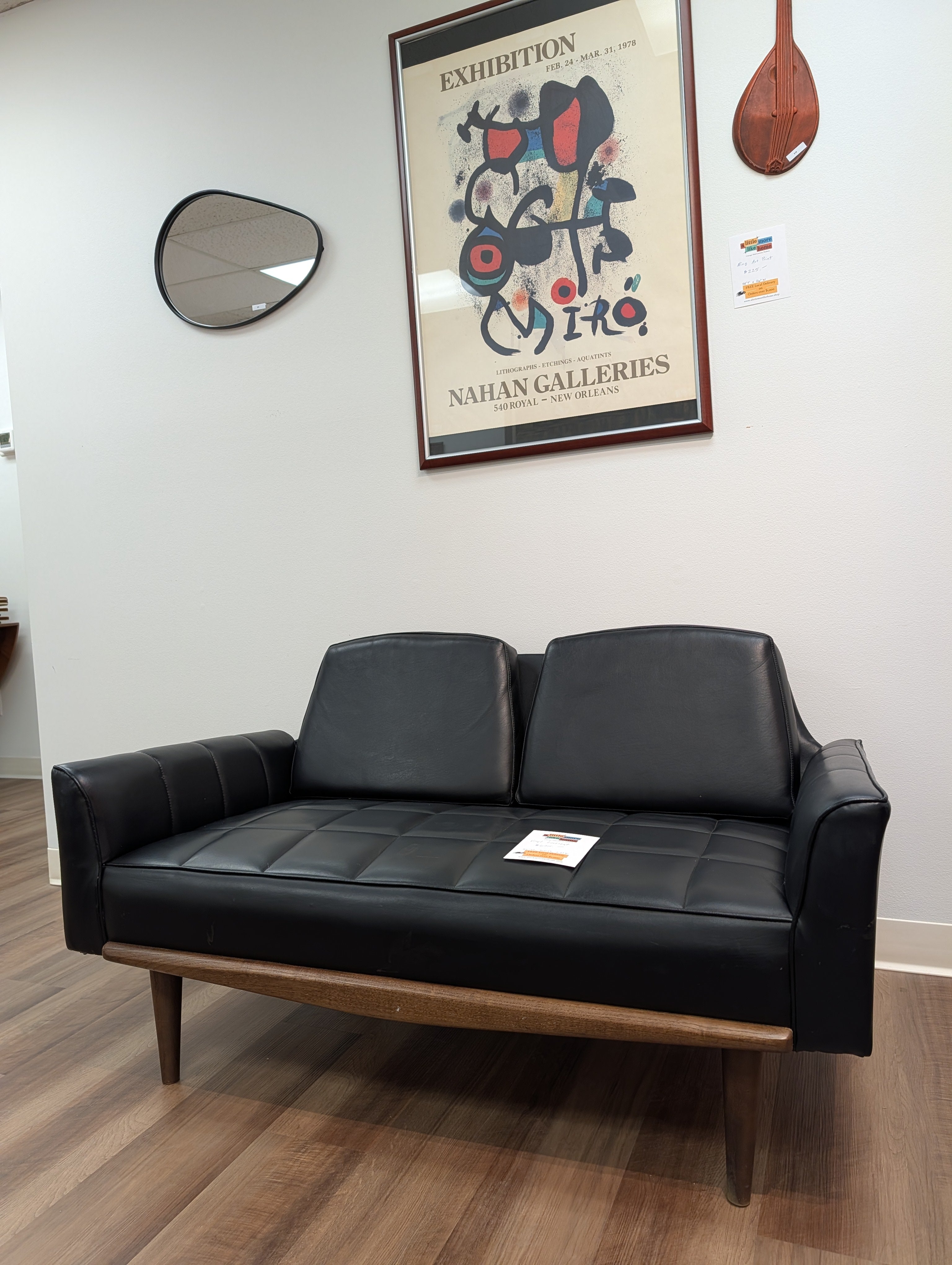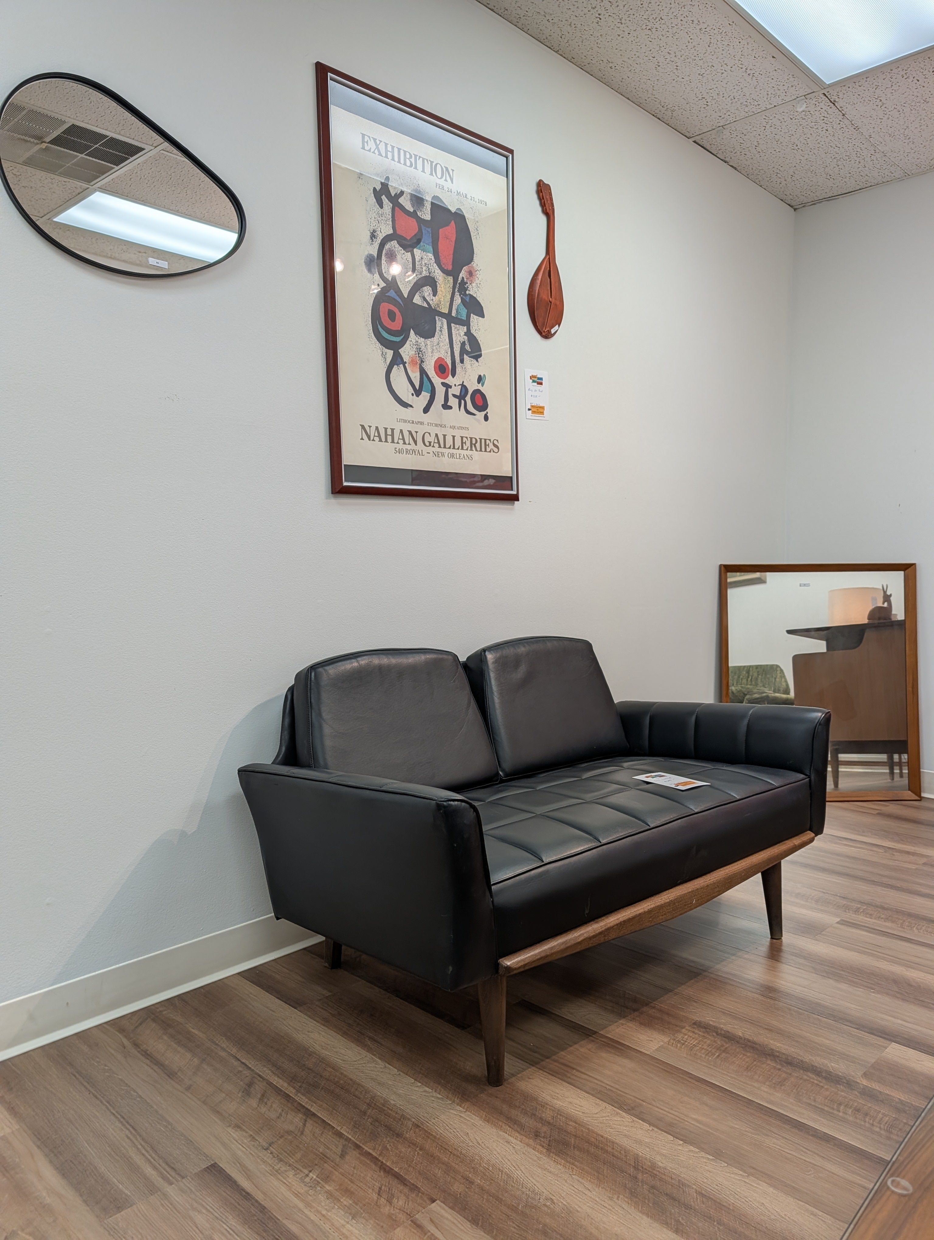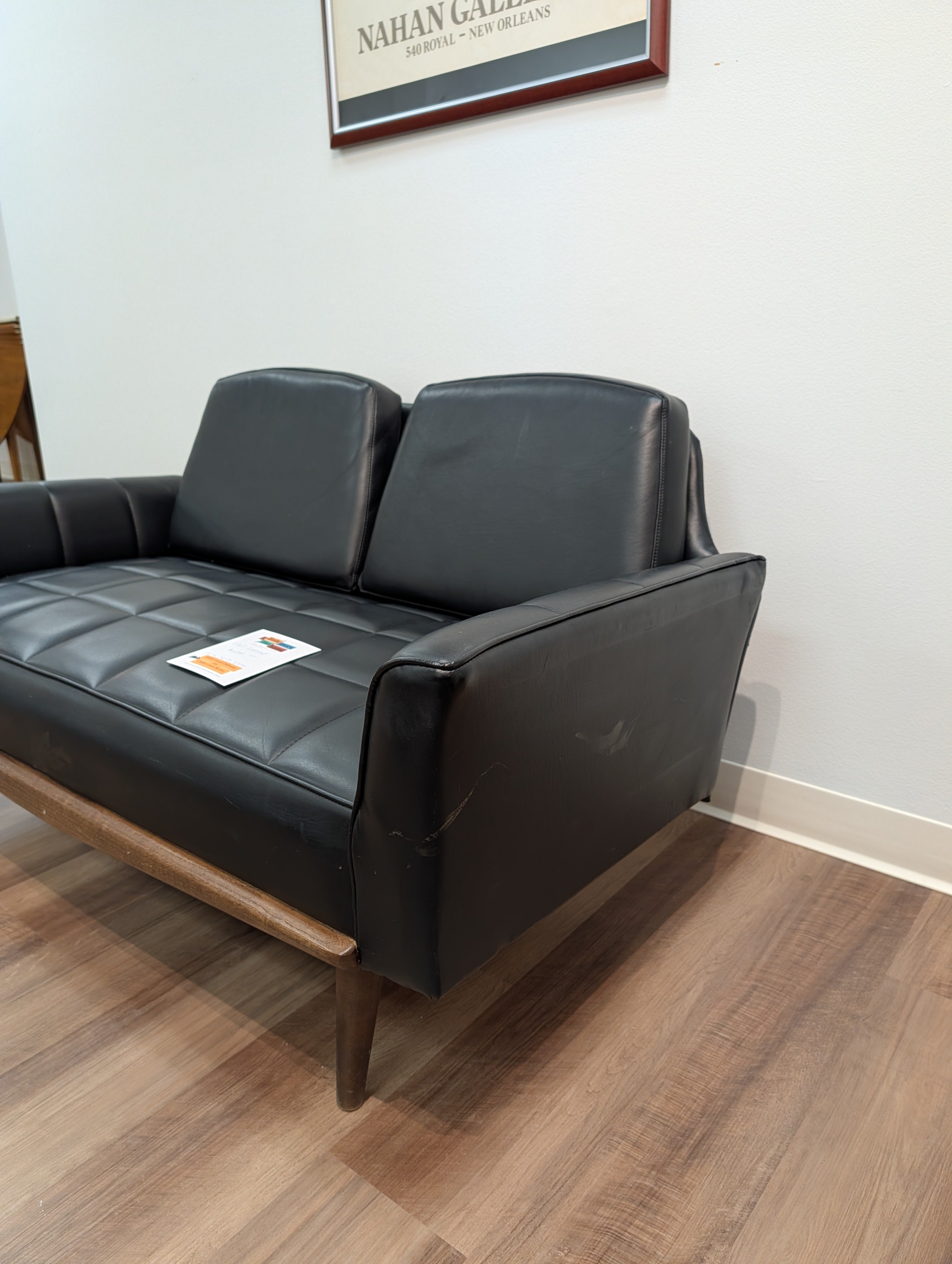 Achieve a sleek, mid century look to your home at an affordable price! This black vegan leather loveseat retains its original upholstery and is in excellent condition besides a few minor scuffs. No makers mark, but this is a cool piece that will easily fit into a living room, office or anywhere else you need comfy, stylish seating.