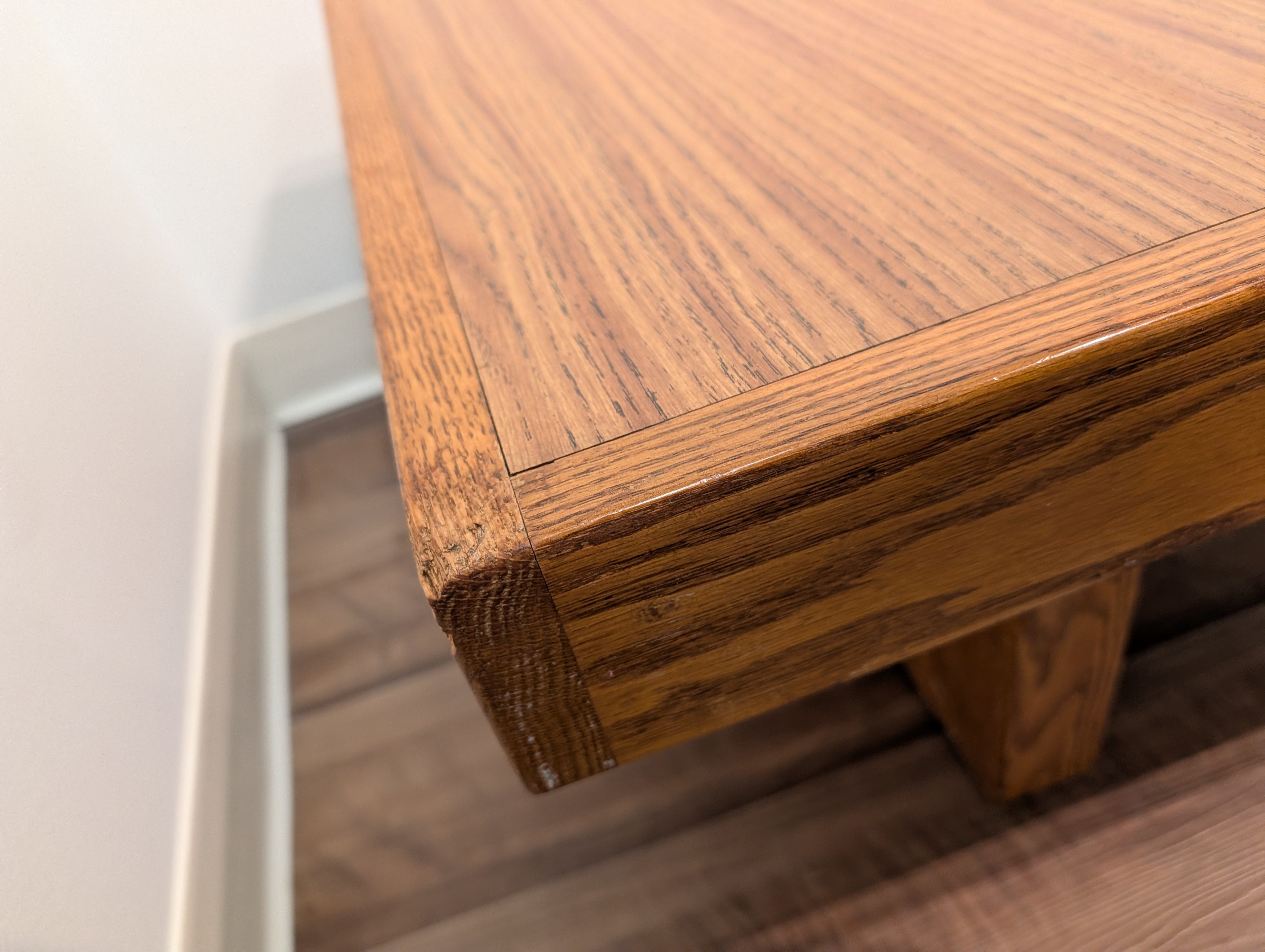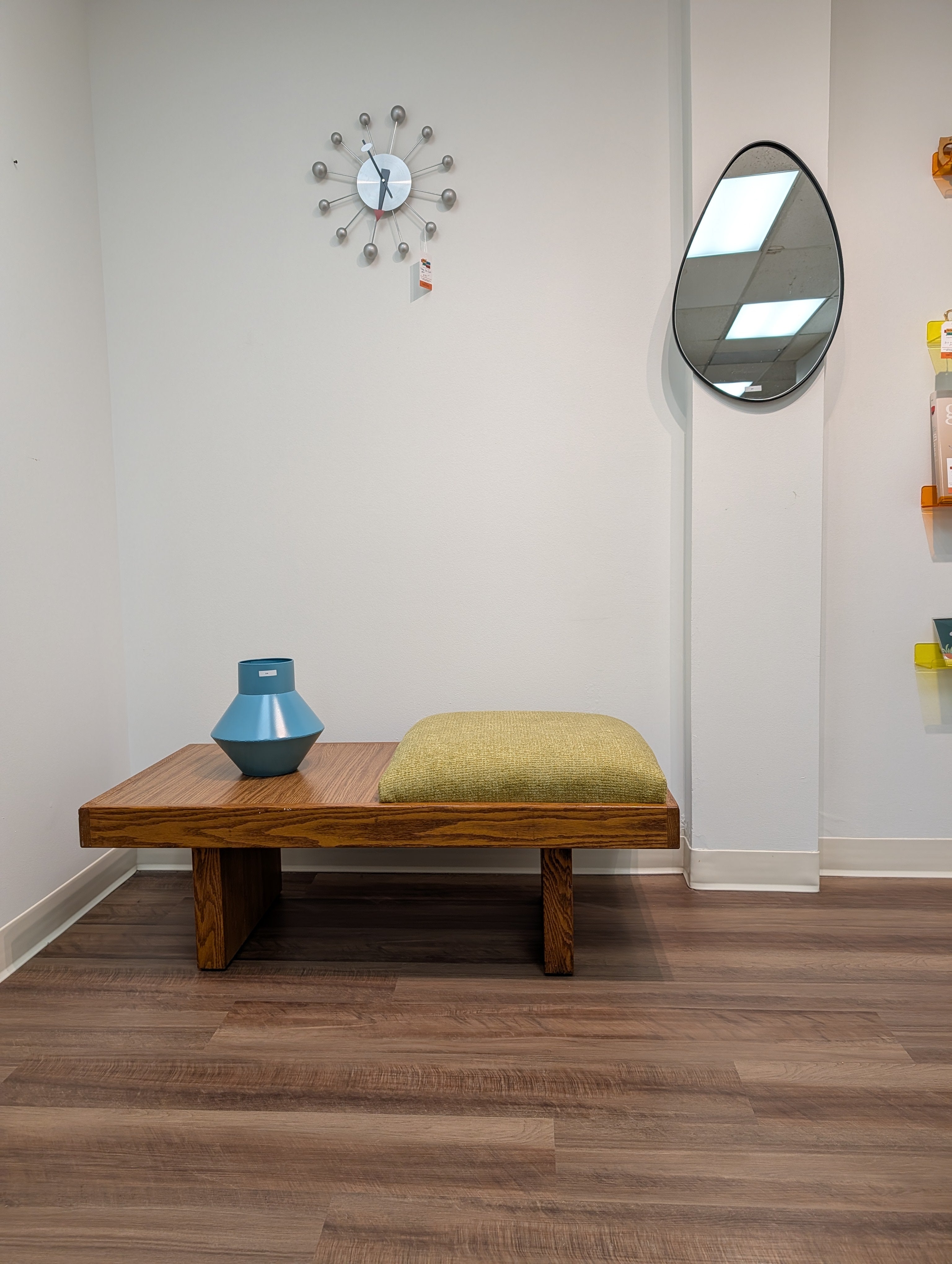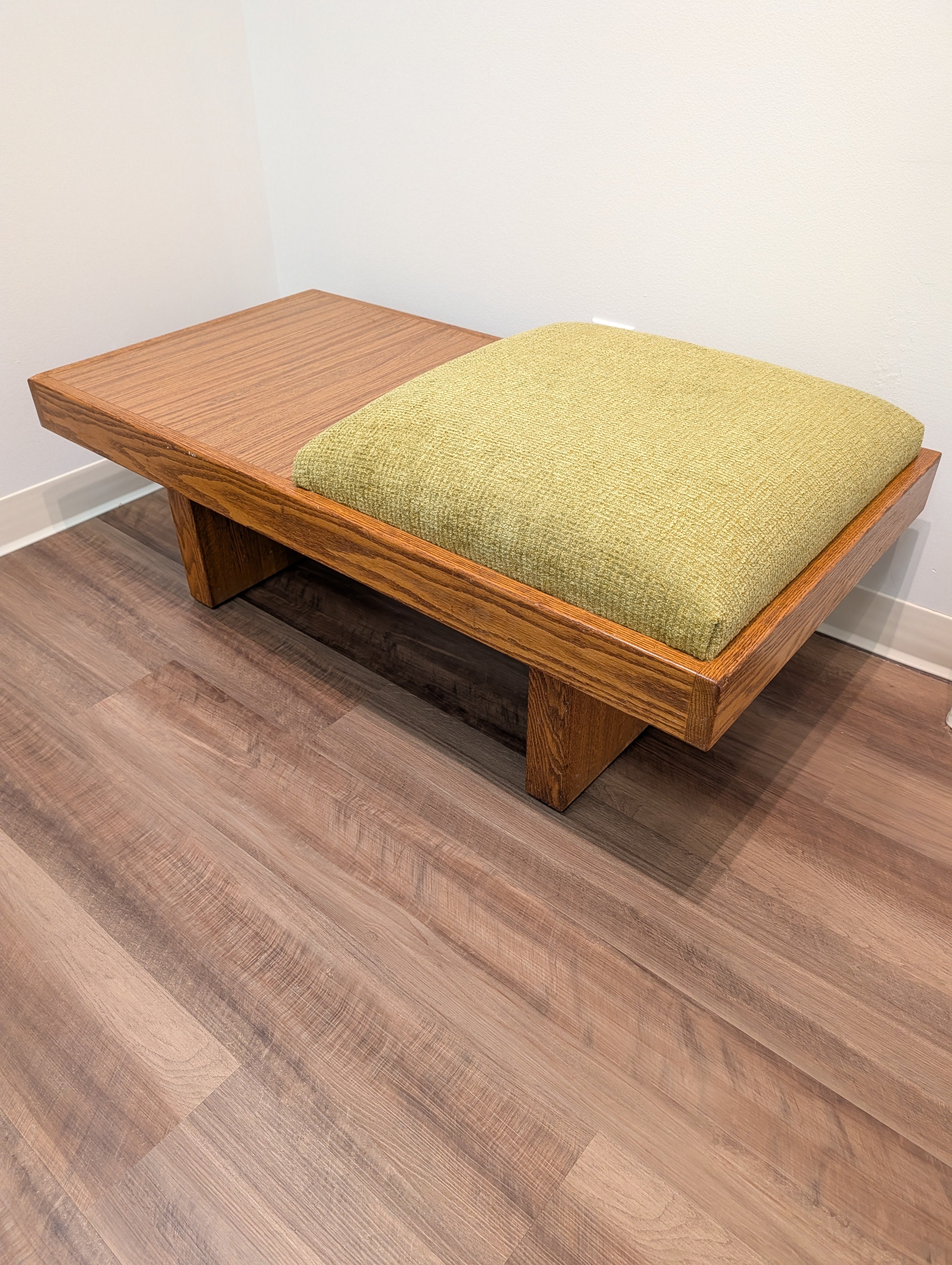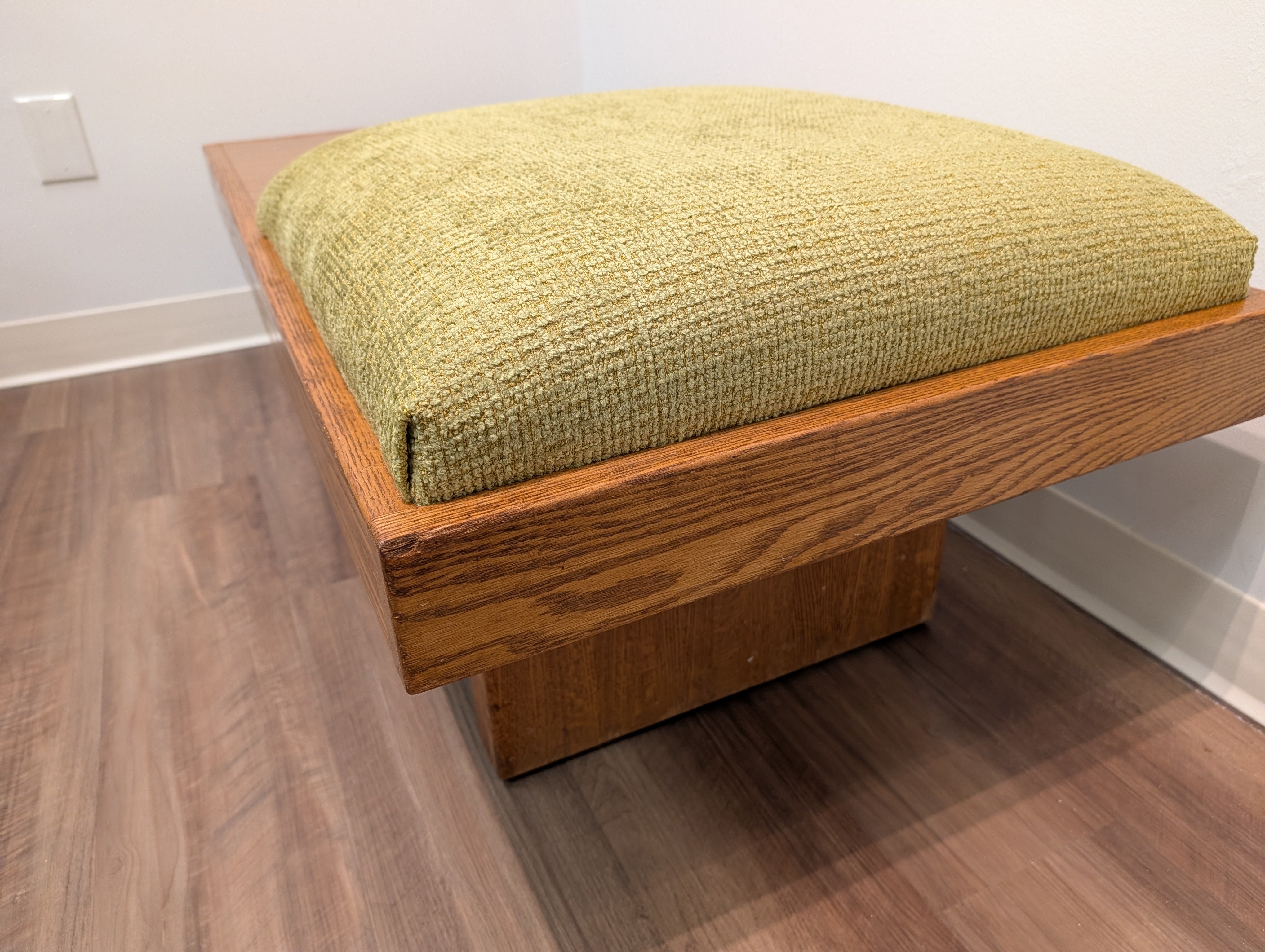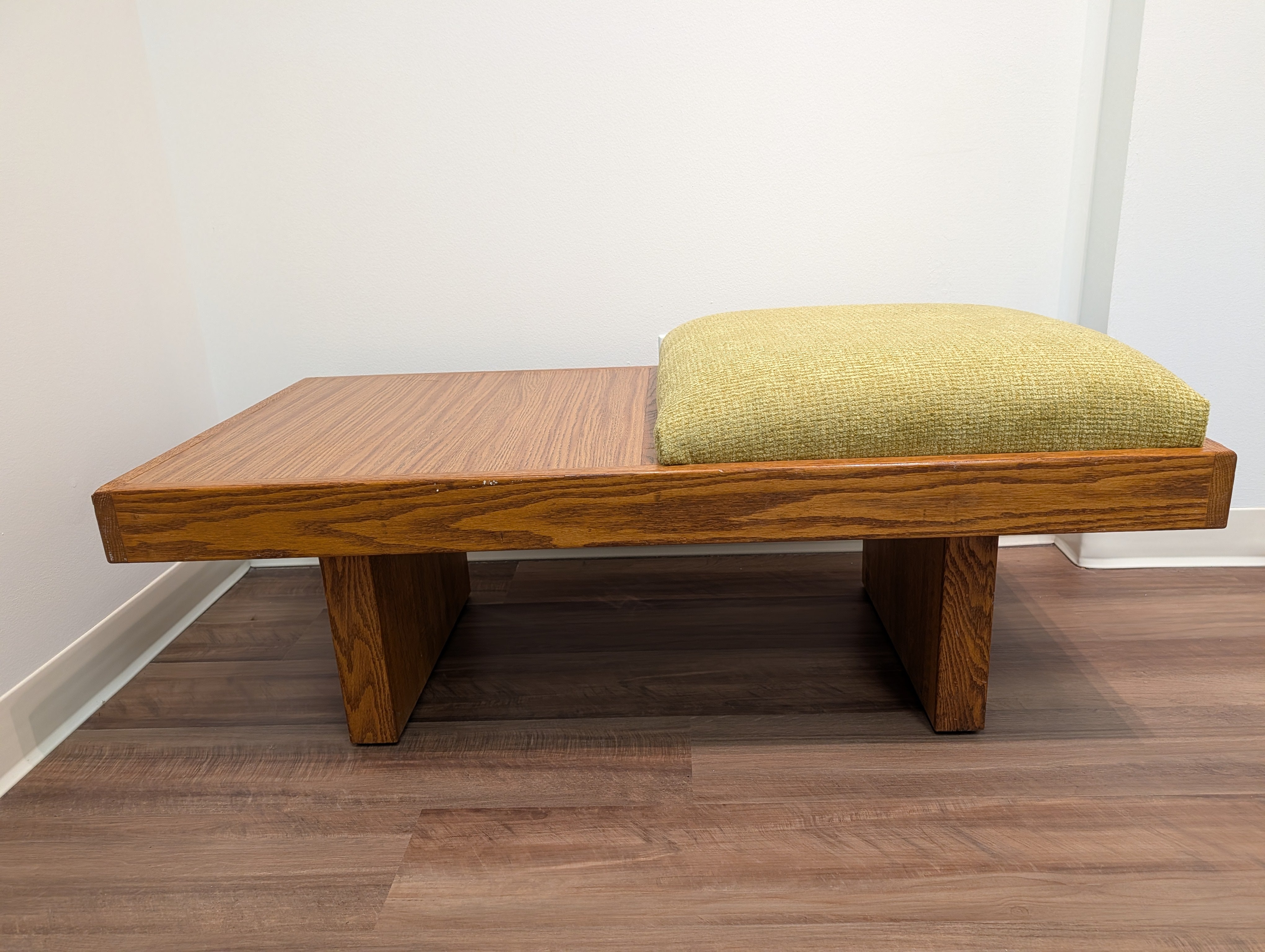 This is a solid wood oak bench with an upholstered seat cushion. It would make a great entryway bench, window seat or extra seating! Minimal signs of wear.