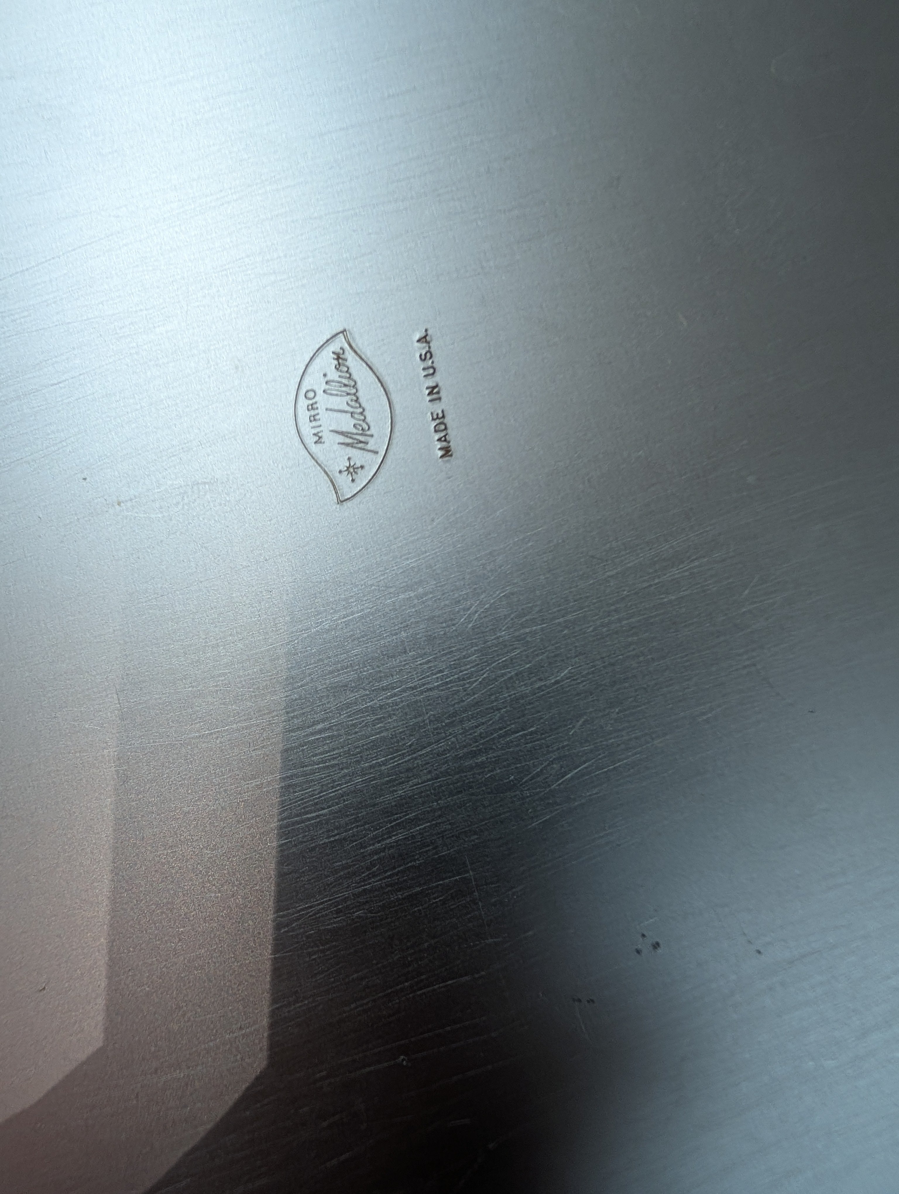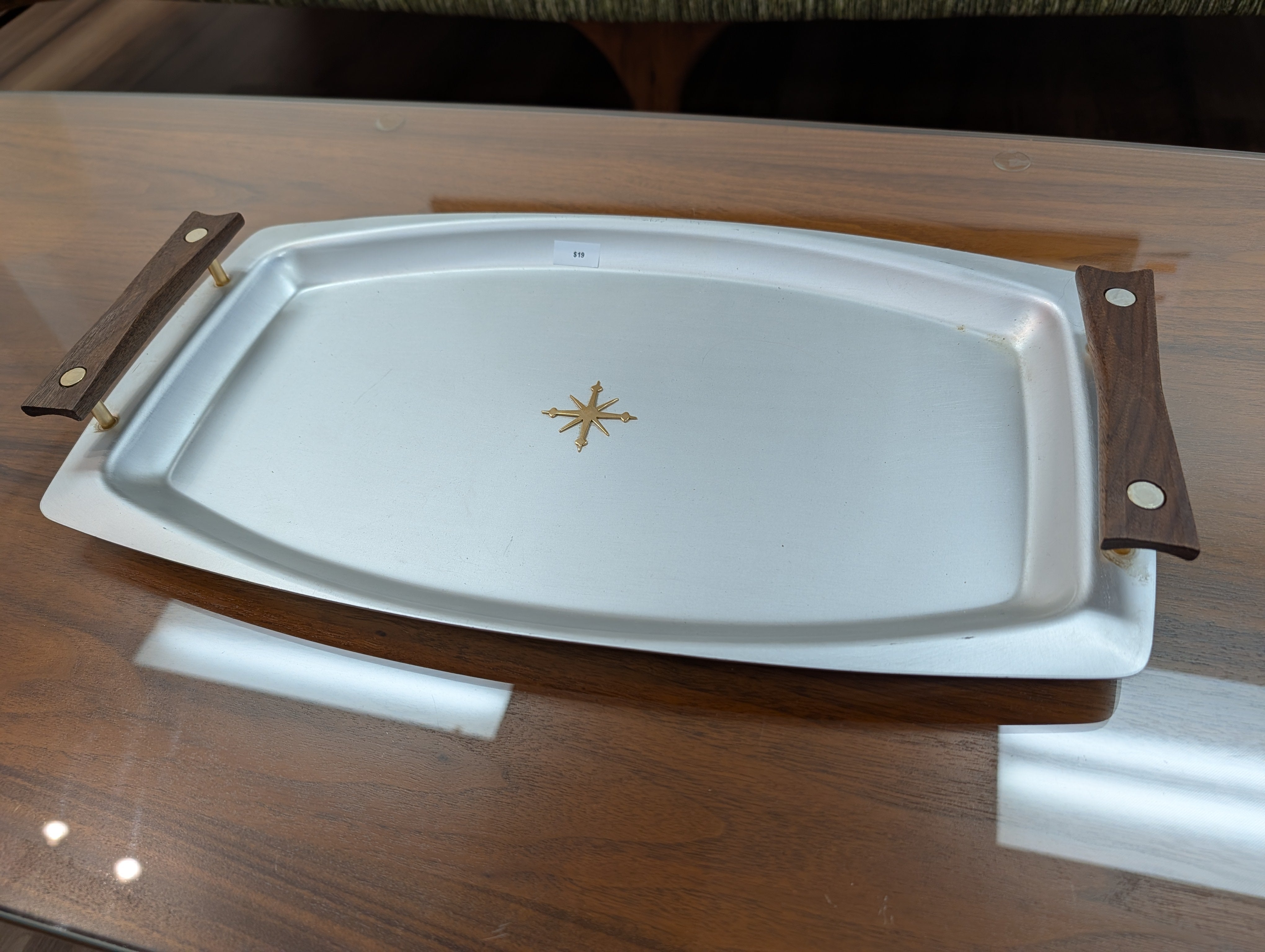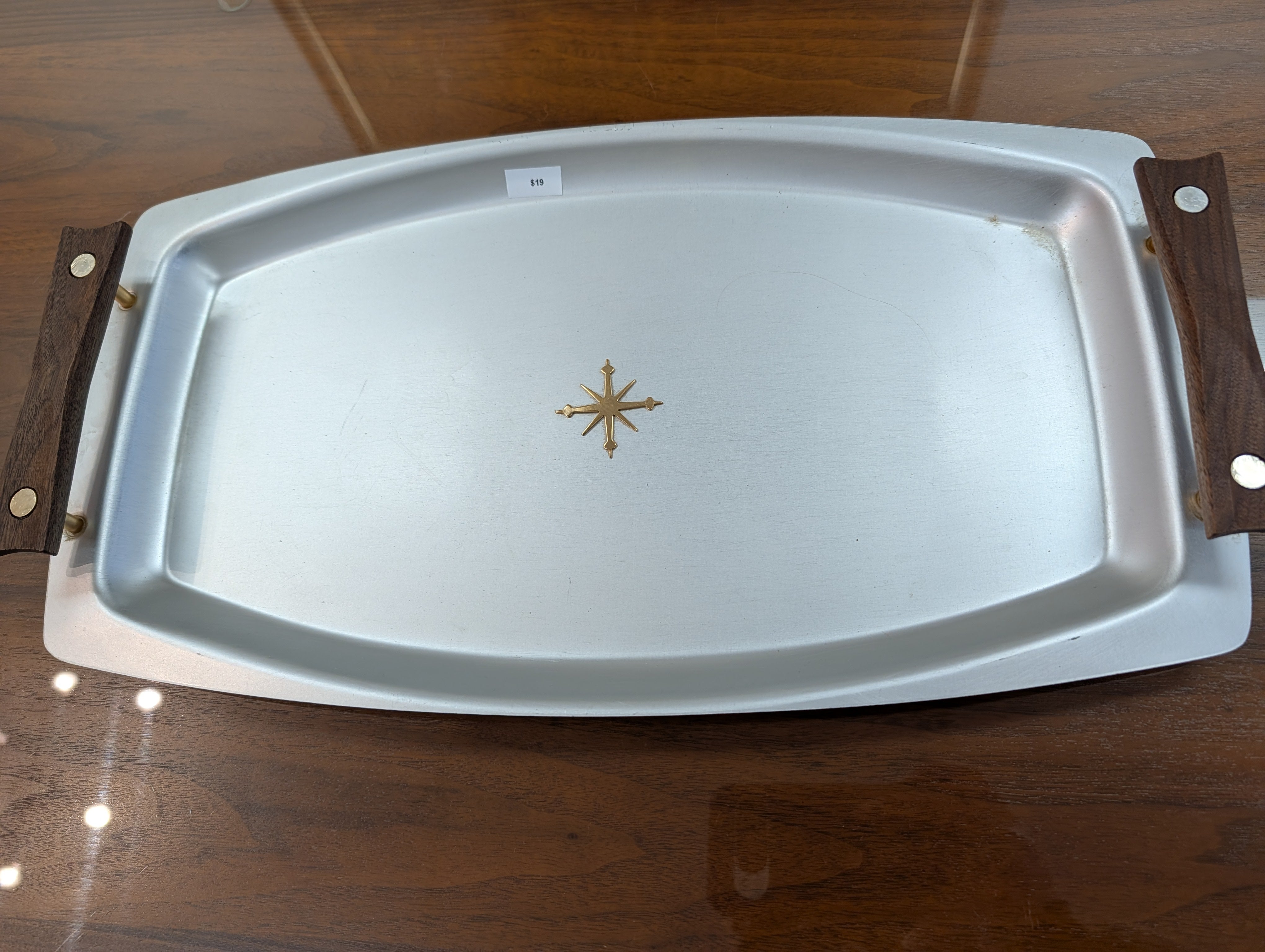 Atomic vintage serving tray by Mirro Medallion has wood handles.