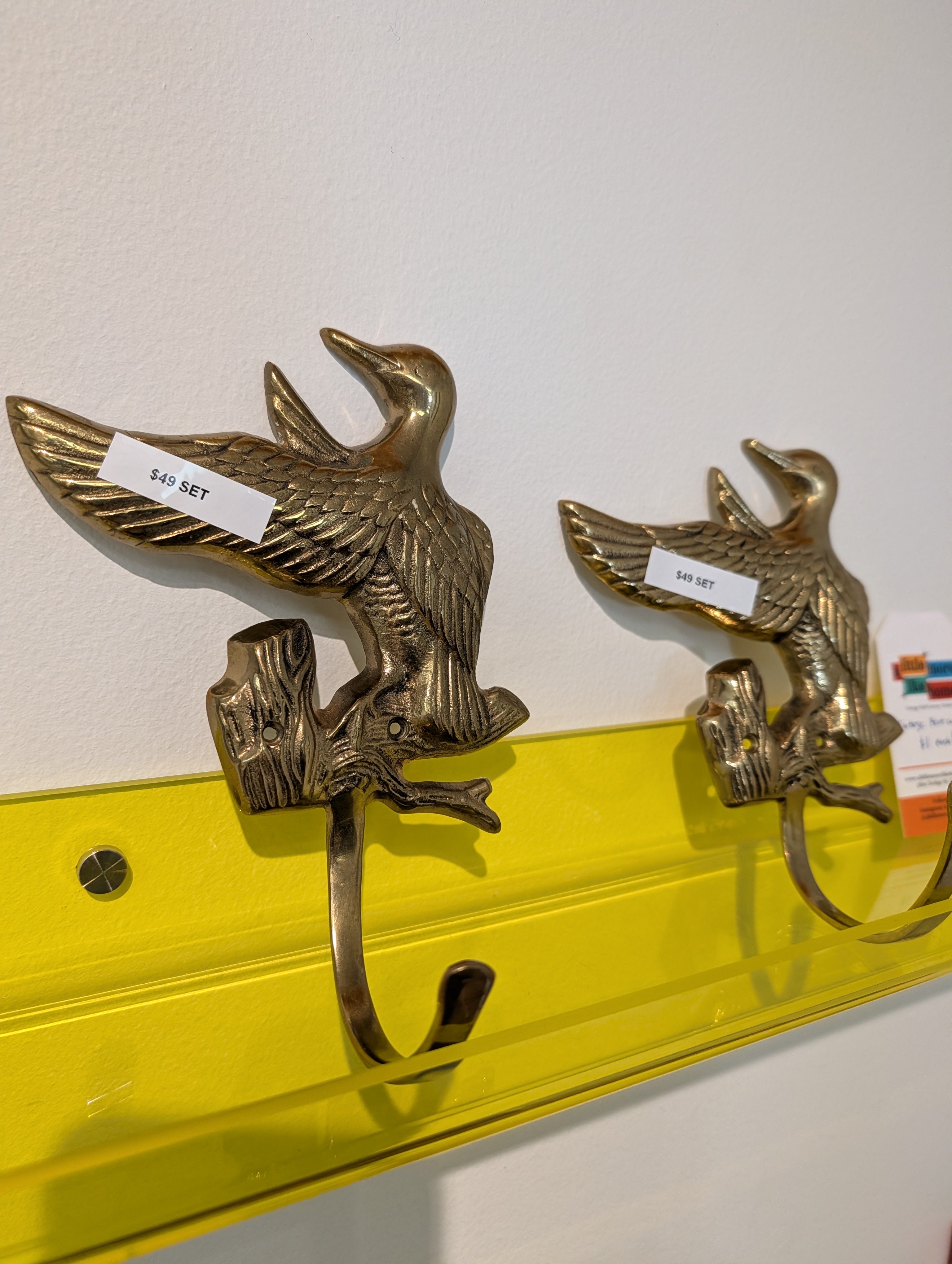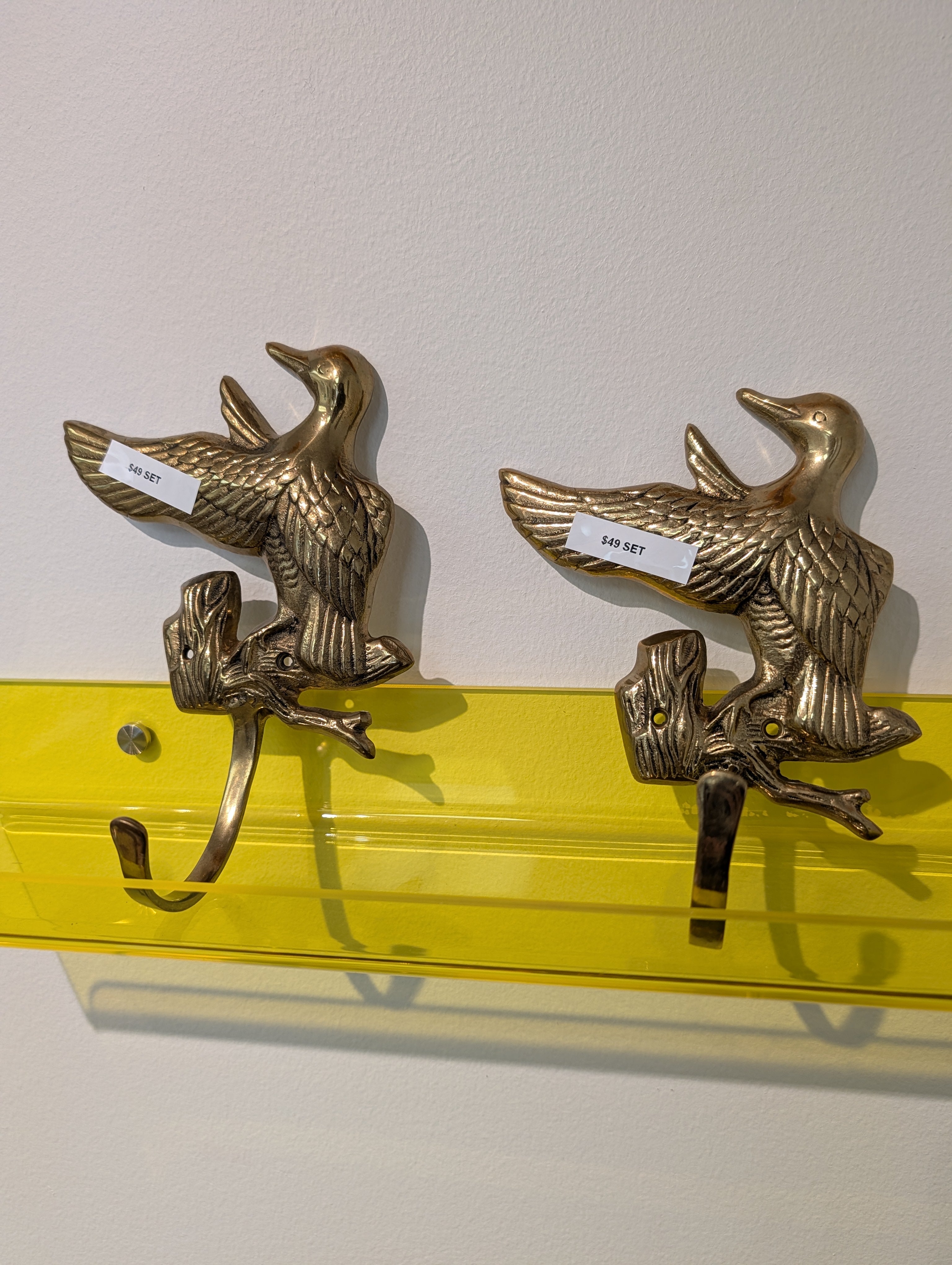 This is a pair of brass duck wall hooks. Great for coat hooks or to hold bags in the entryway. Price is for the pair.