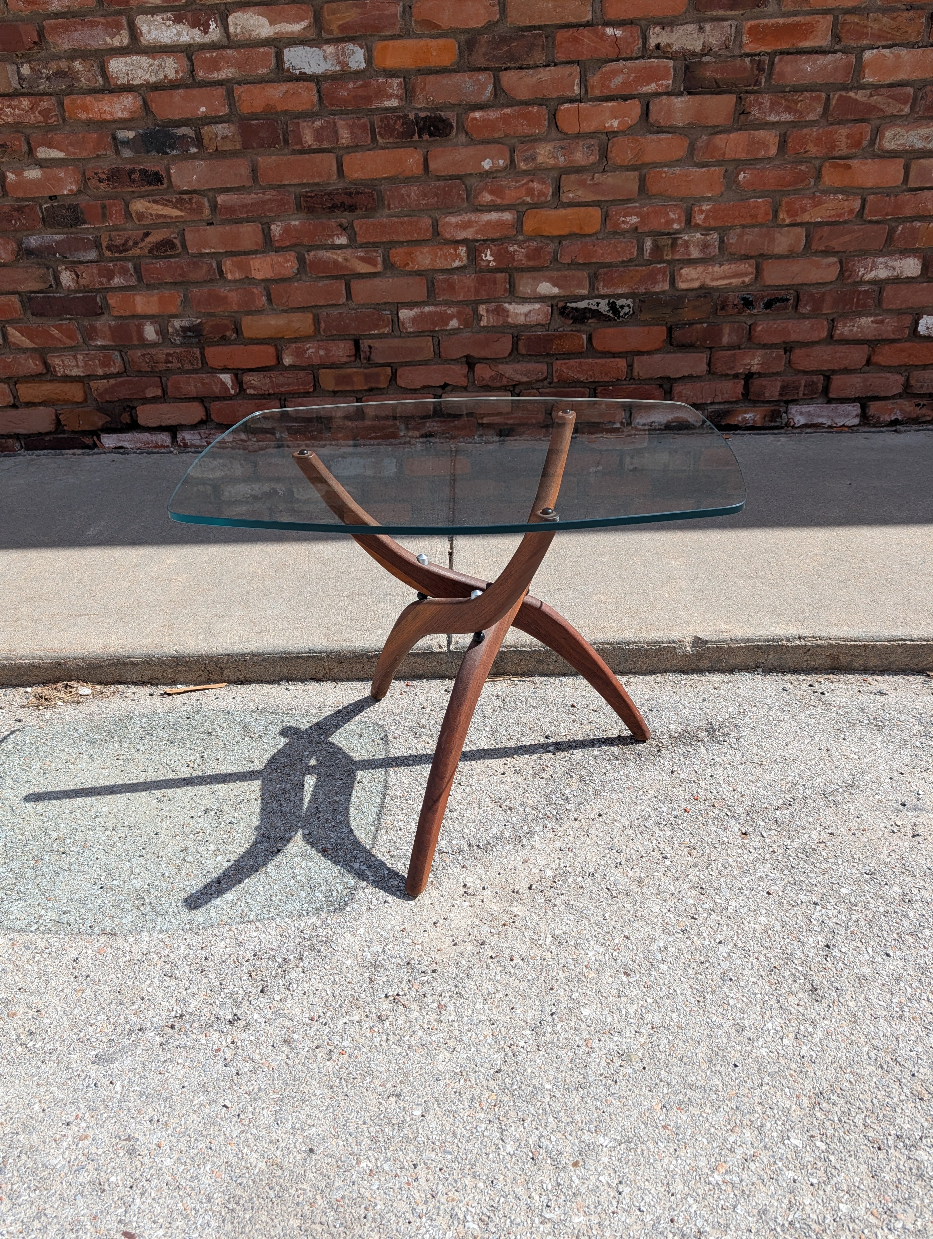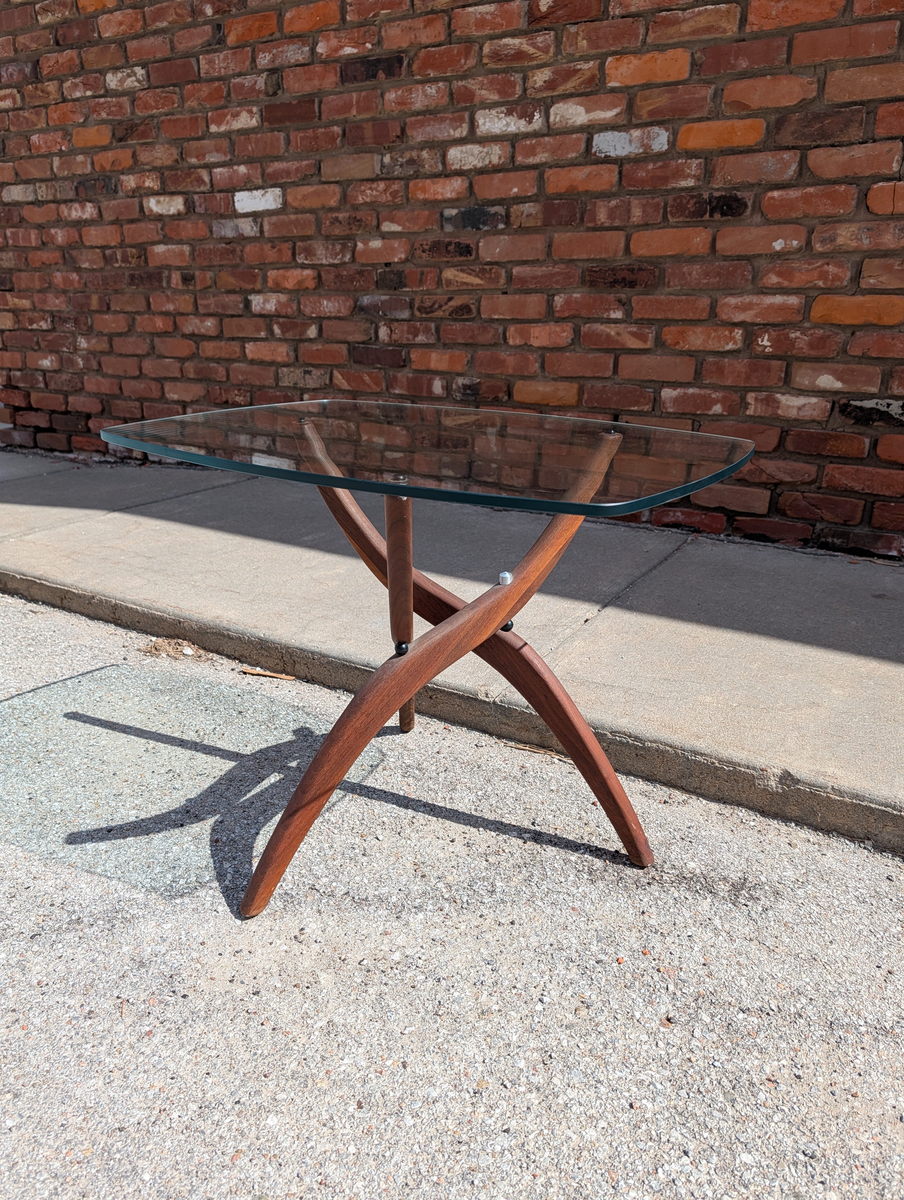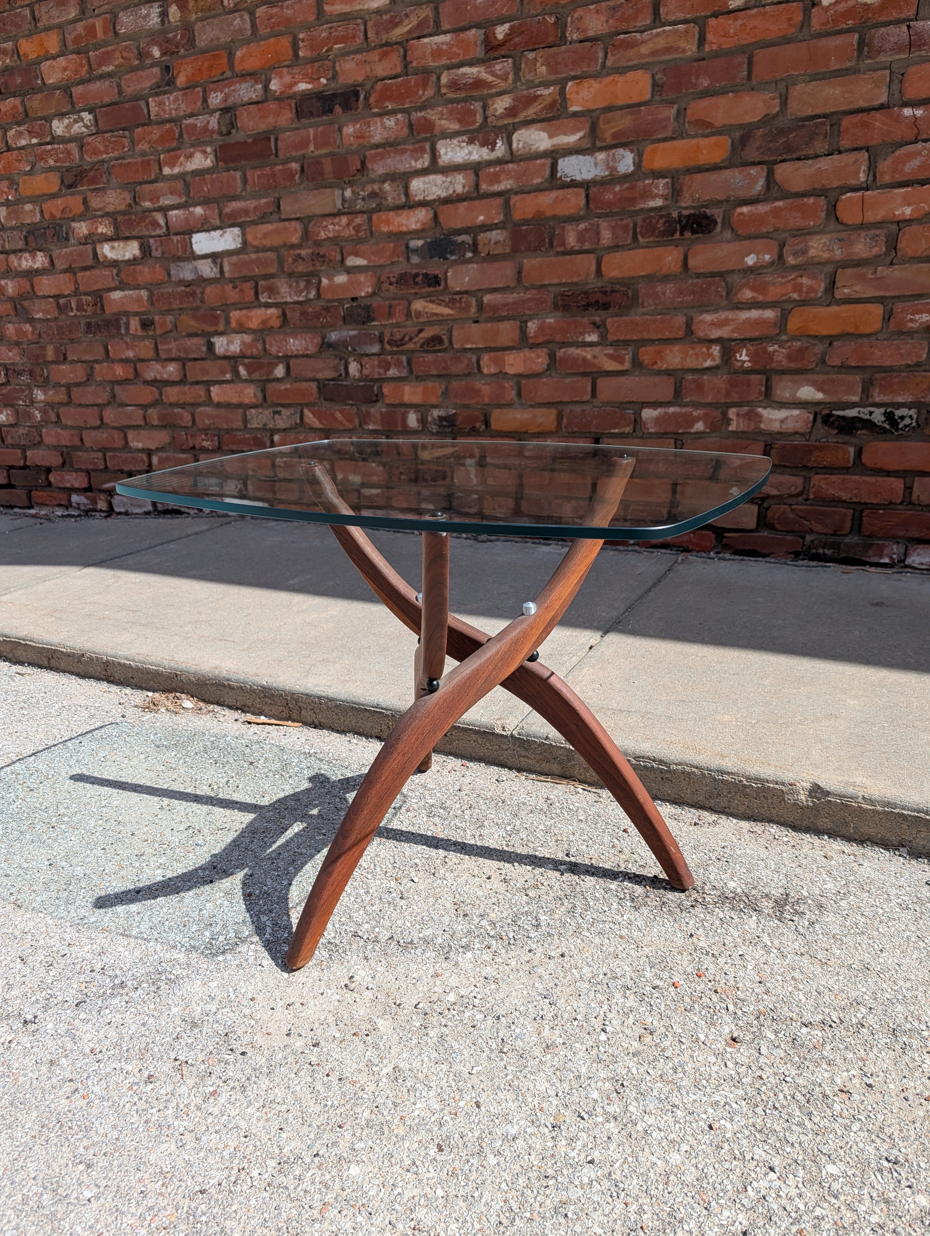 This Forest Wilson end table comes from our personal collection! The glass top allows you to admire the sculpted, expanding walnut base. Featuring its original finish - in excellent condition!
