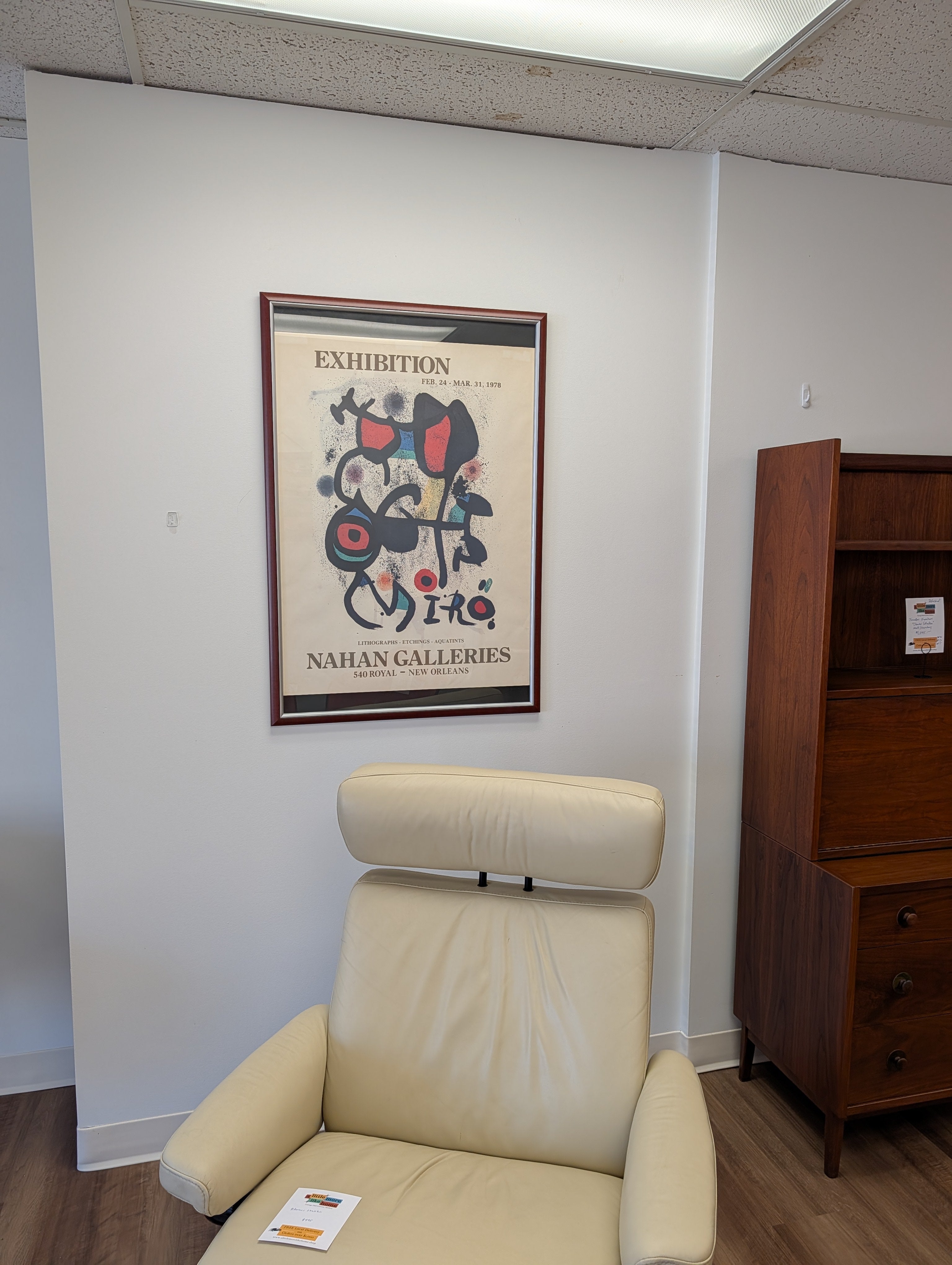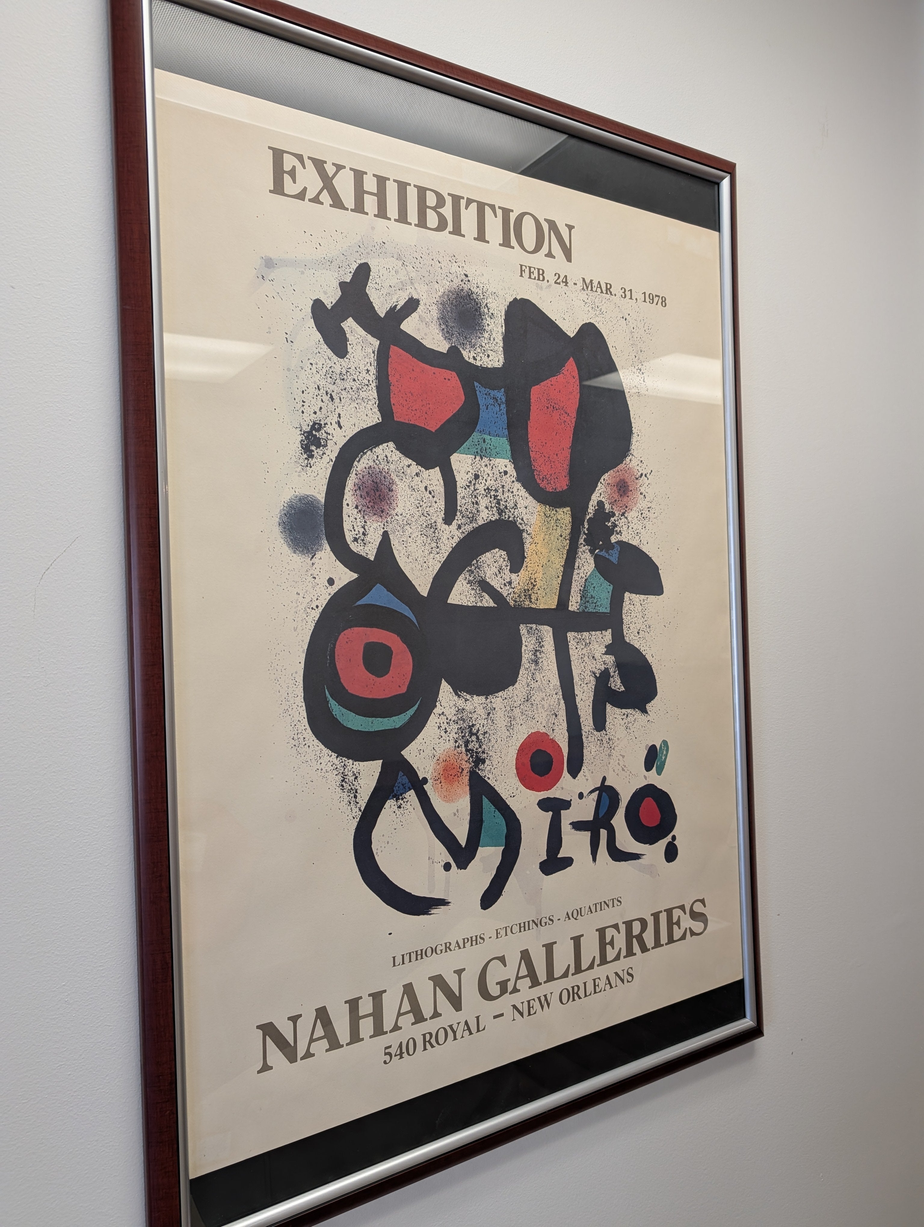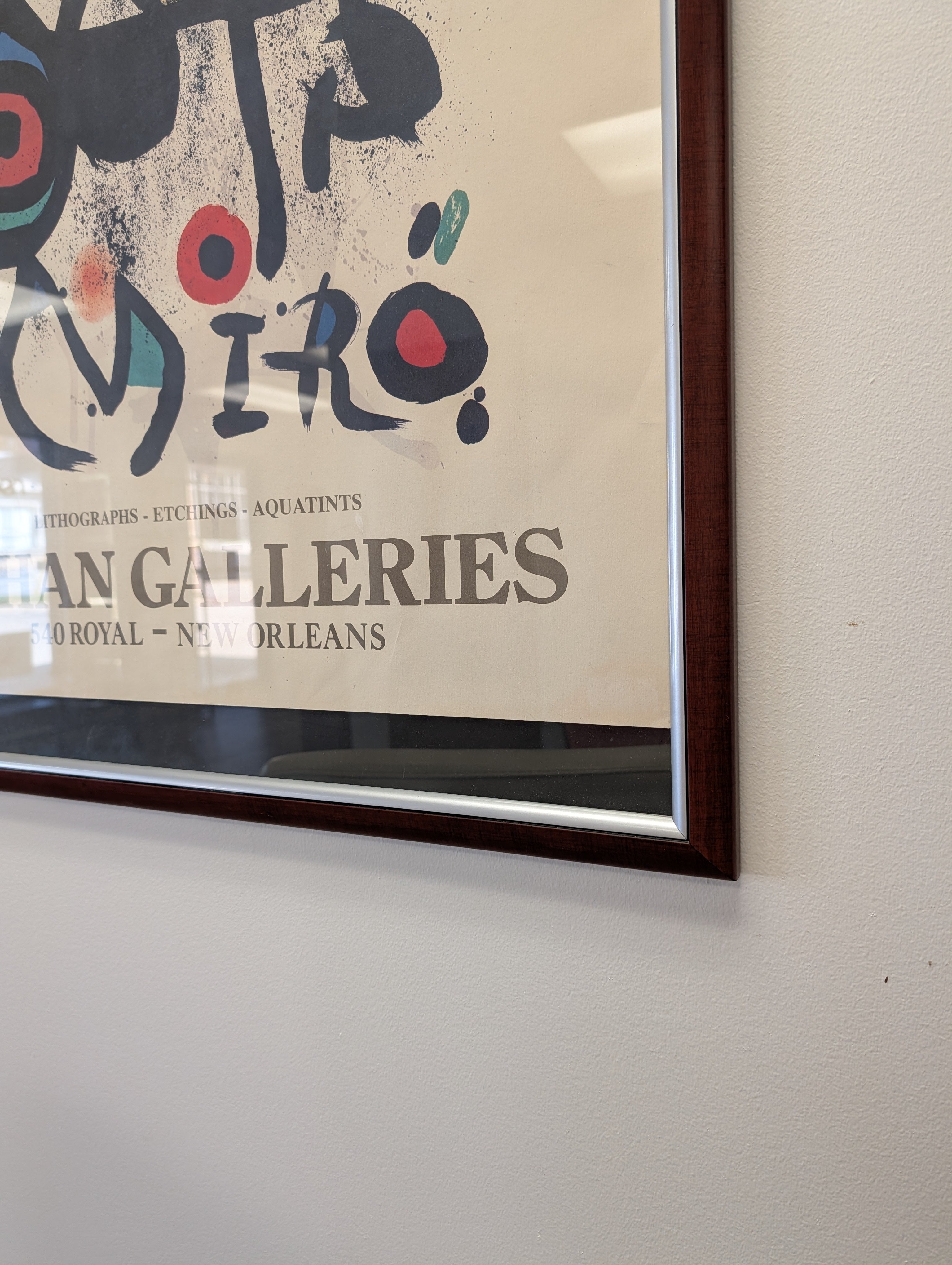 Are you a fan of Joan Miró?  He was a famous painter and sculptor, active during the mid century and known for his dream like abstract paintings.  Add this large Exhibition print to your space and spark conversation with your guests.  In a nice, sleek frame which hangs on a wire.
