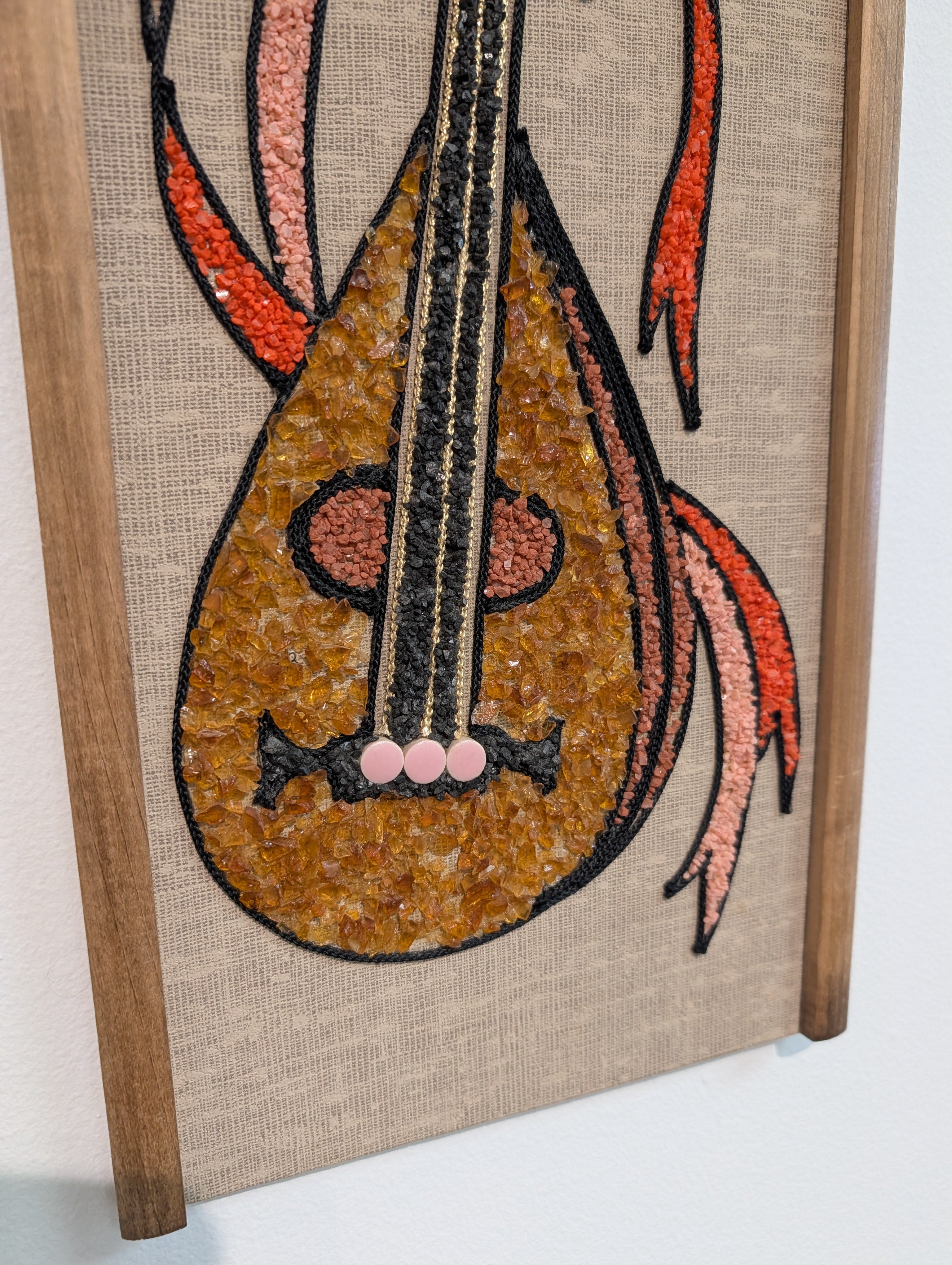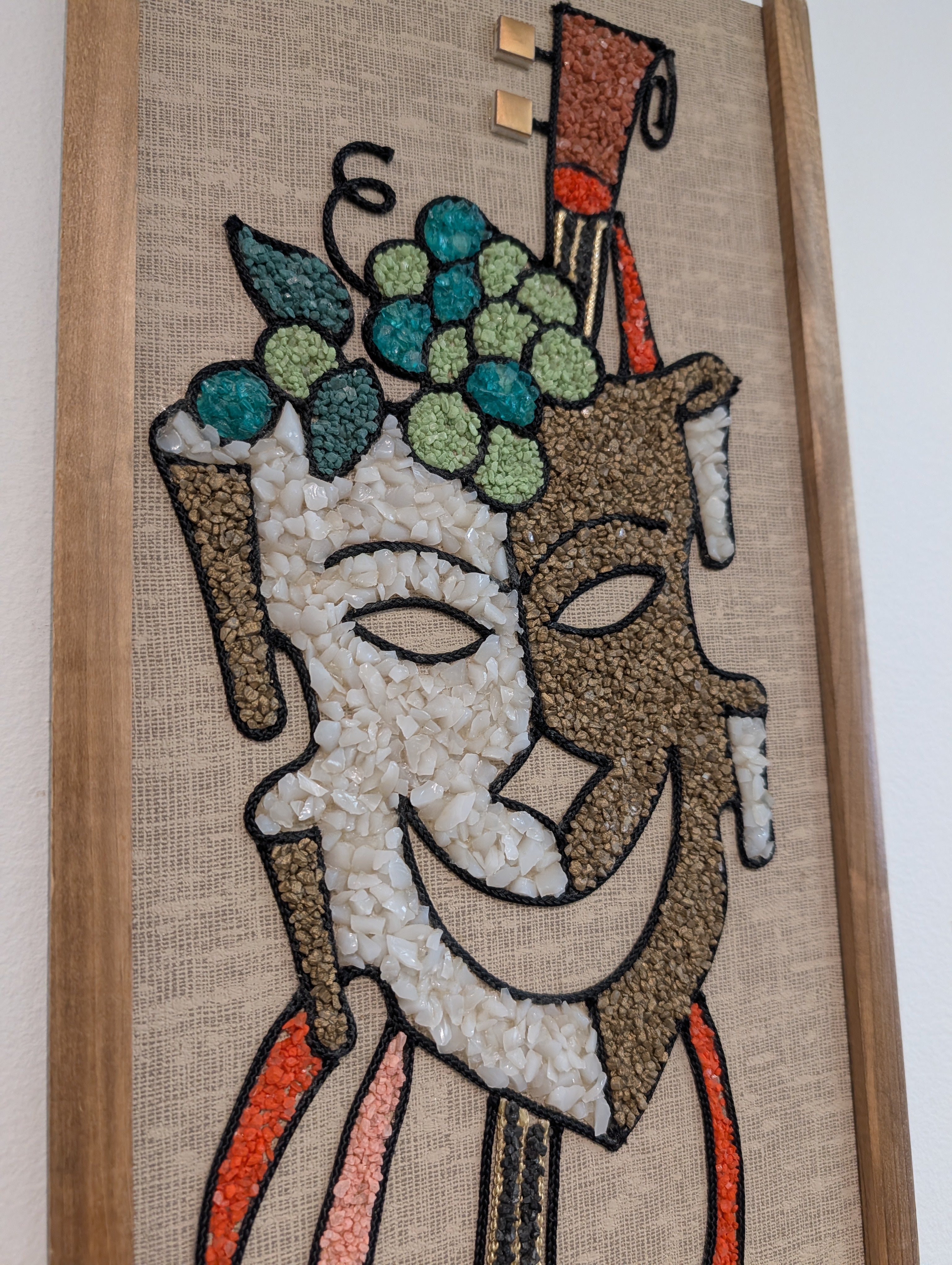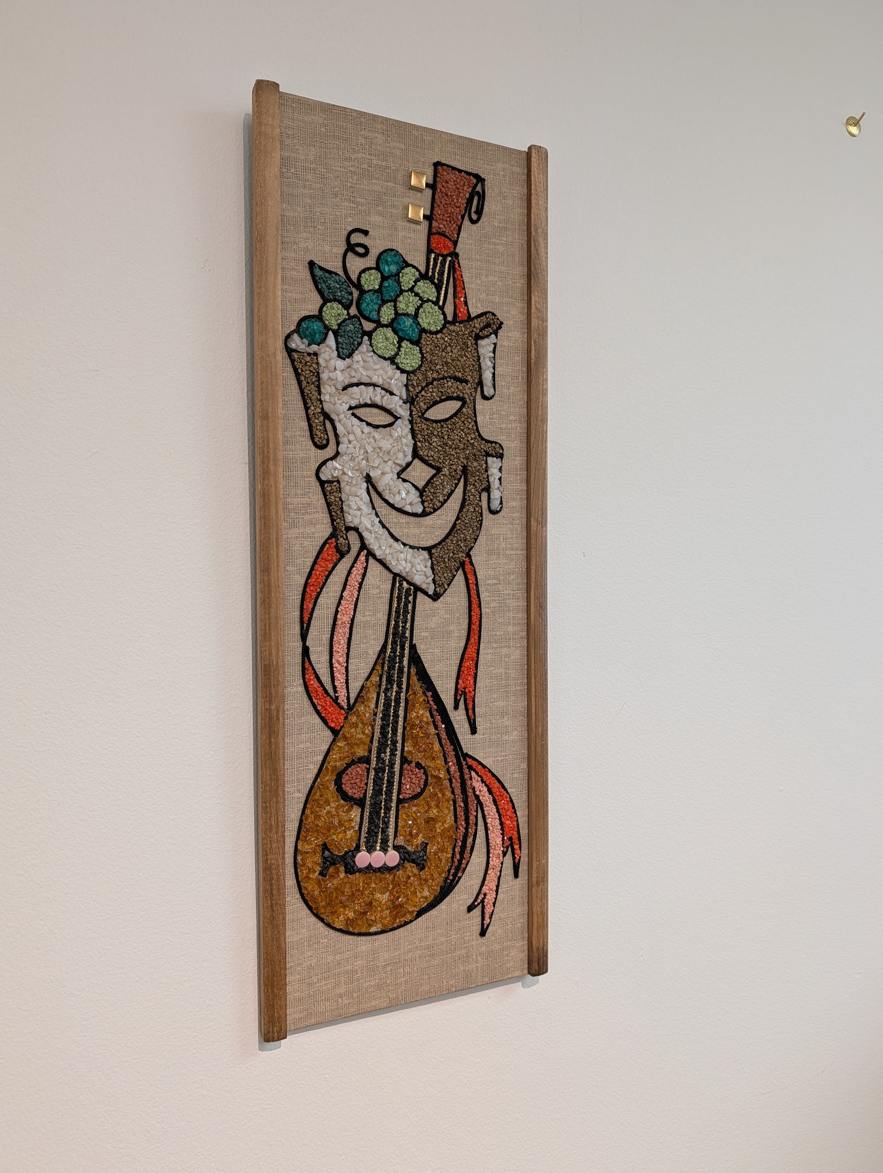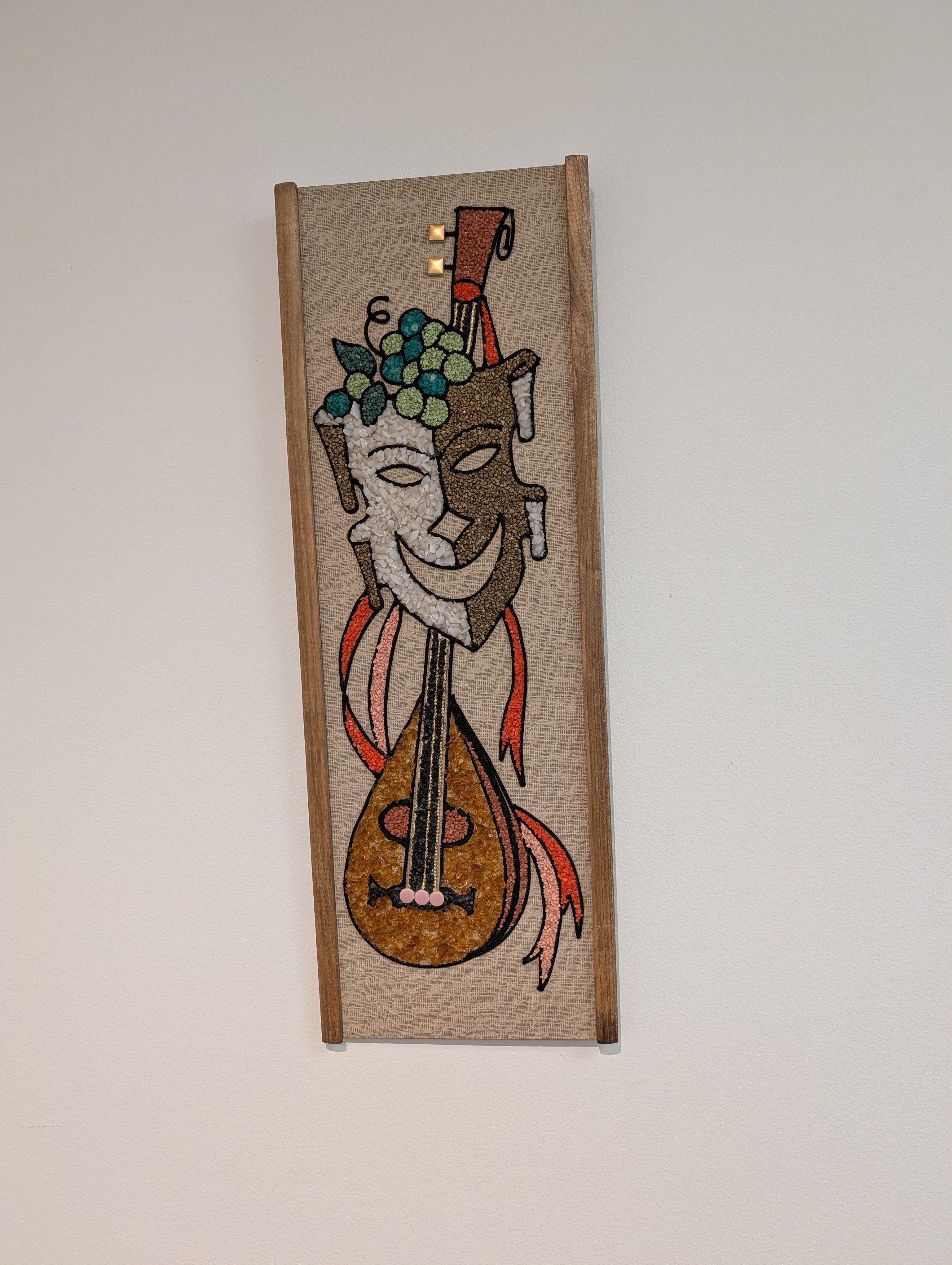 A fun piece of "gravel" art featuring a comedy mask with grapes and a lute!