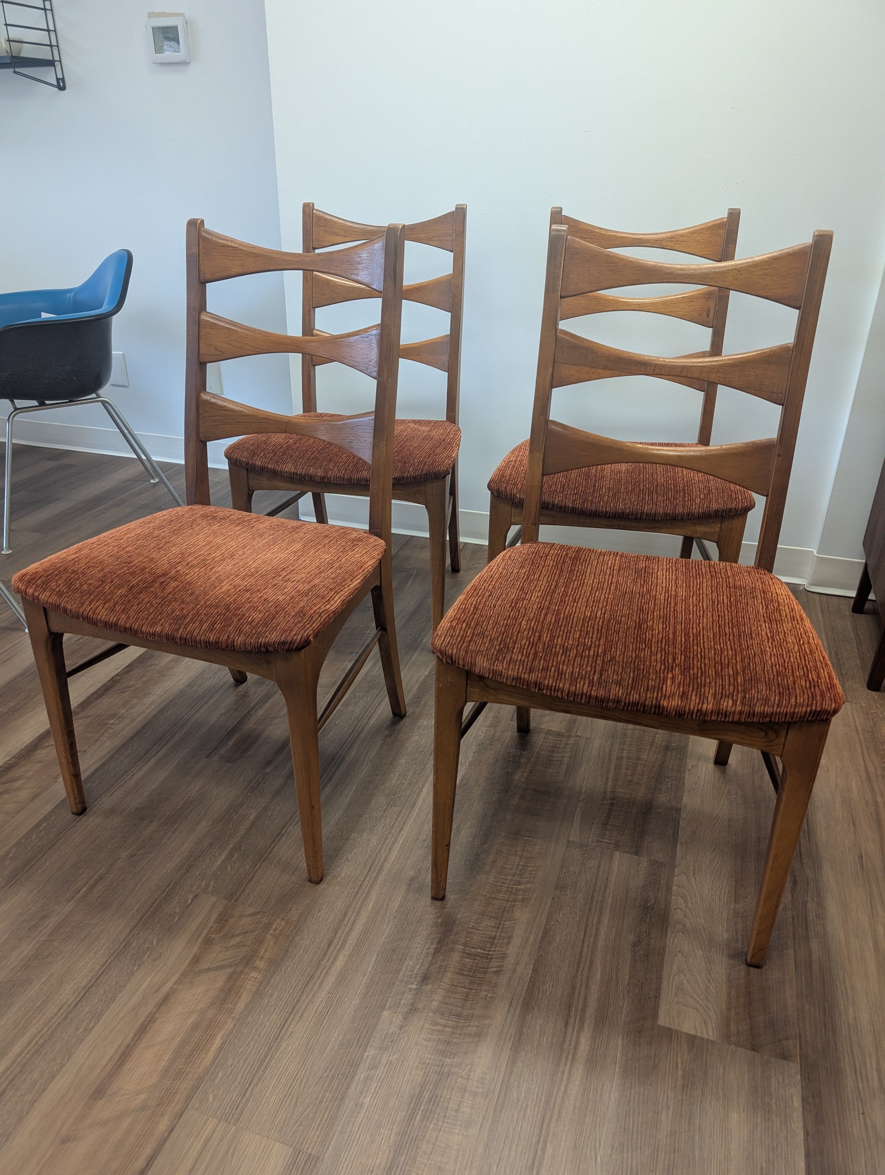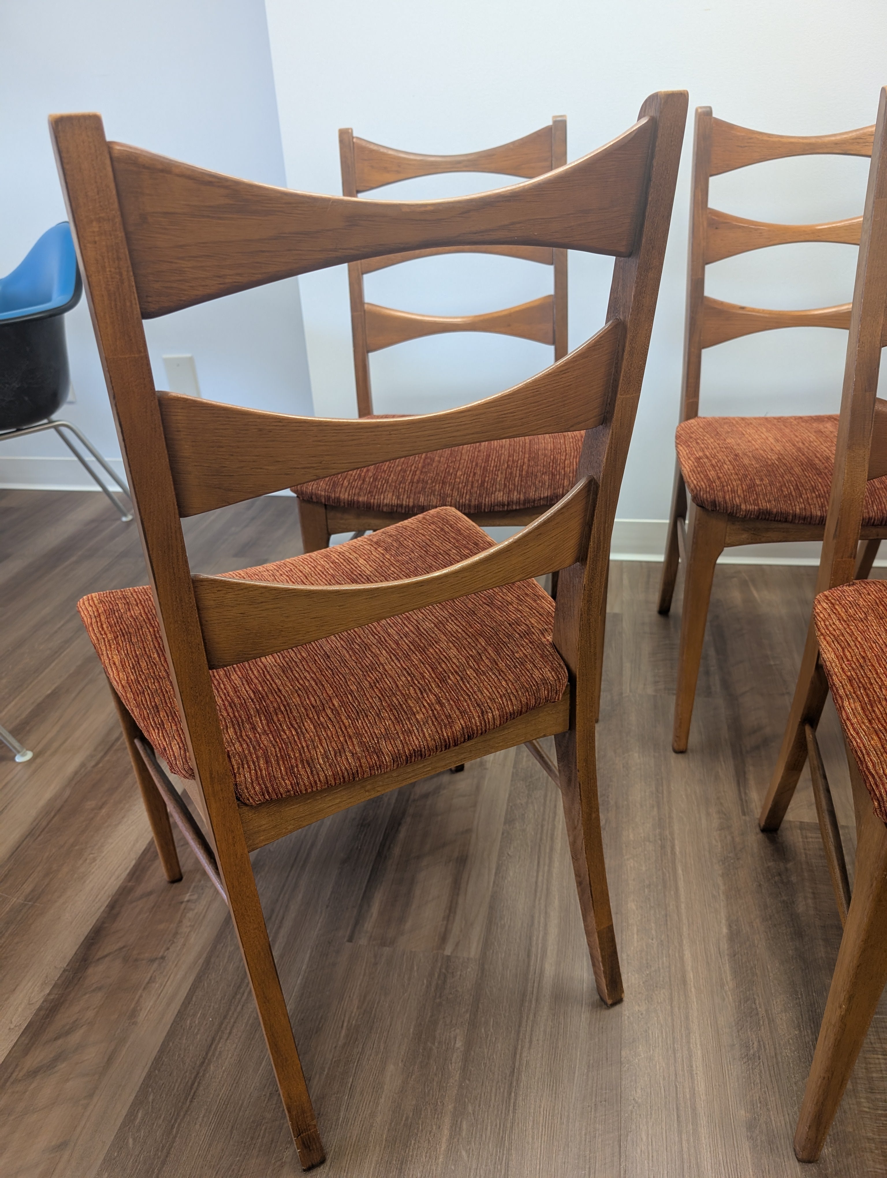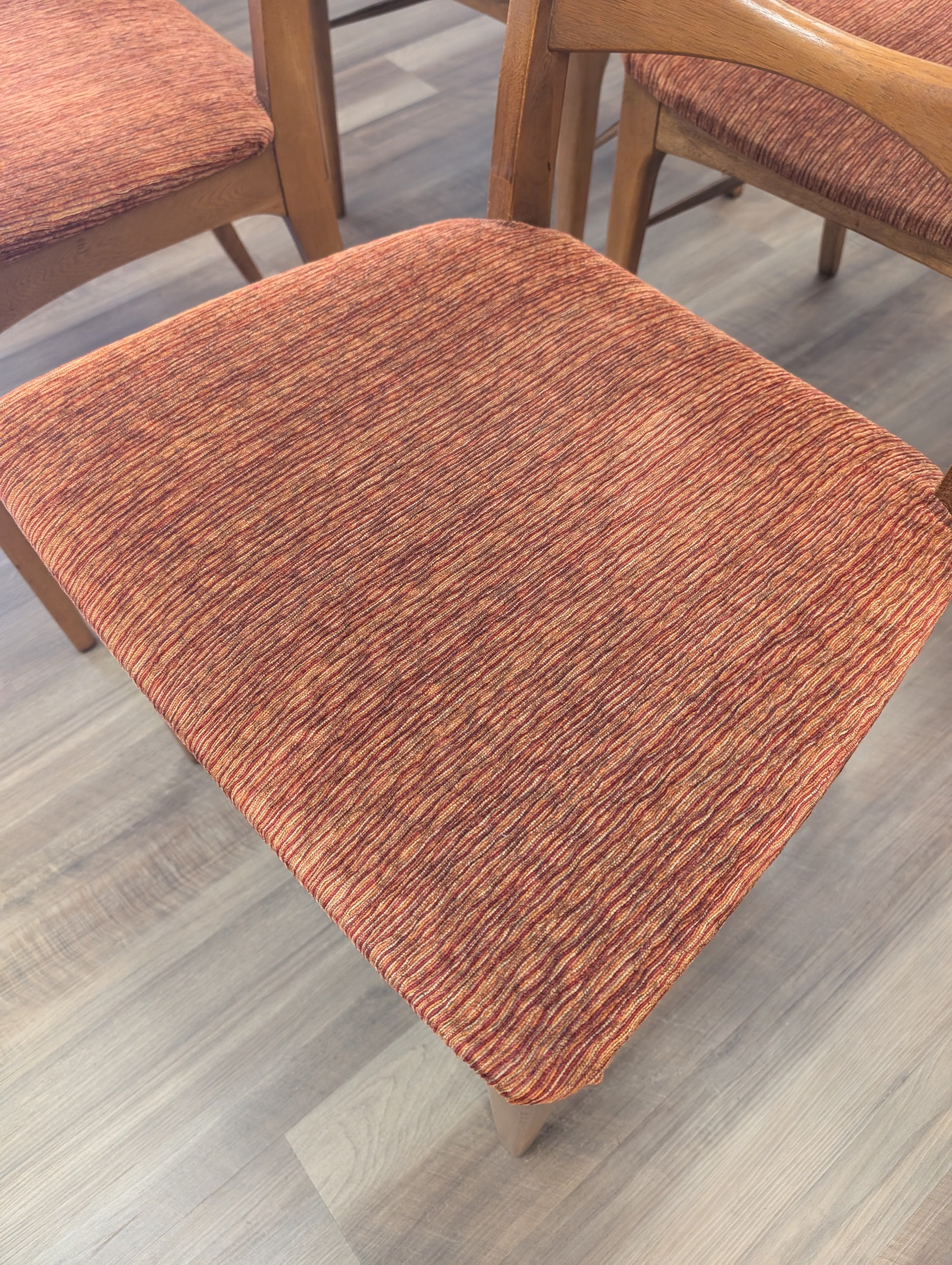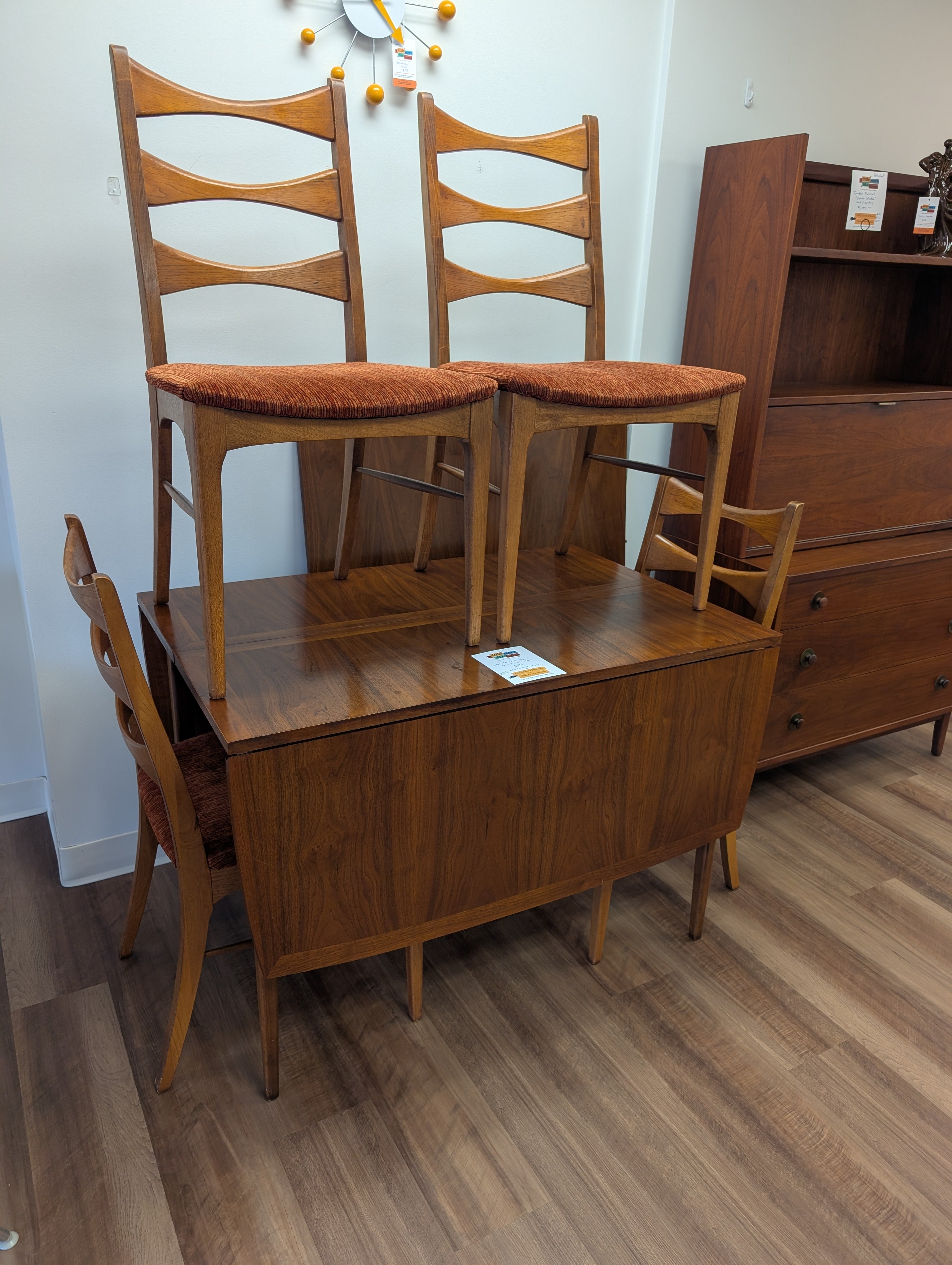 Looking for a dining set with a large table at a very reasonable price?  This Lane "Rhythm" dining set includes a dropleaf table with two leaves.  There are 4 chairs with a red orange upholstery.