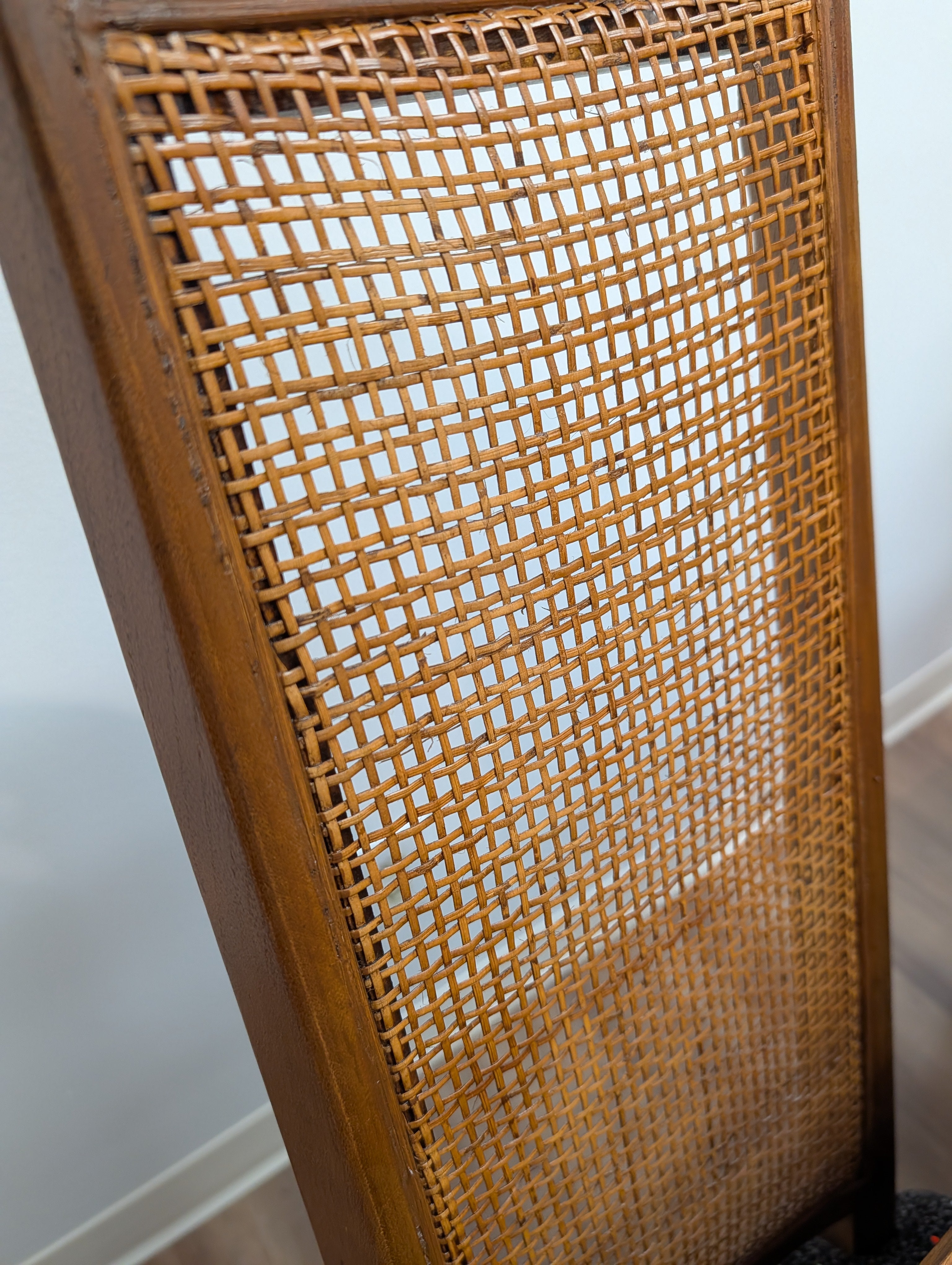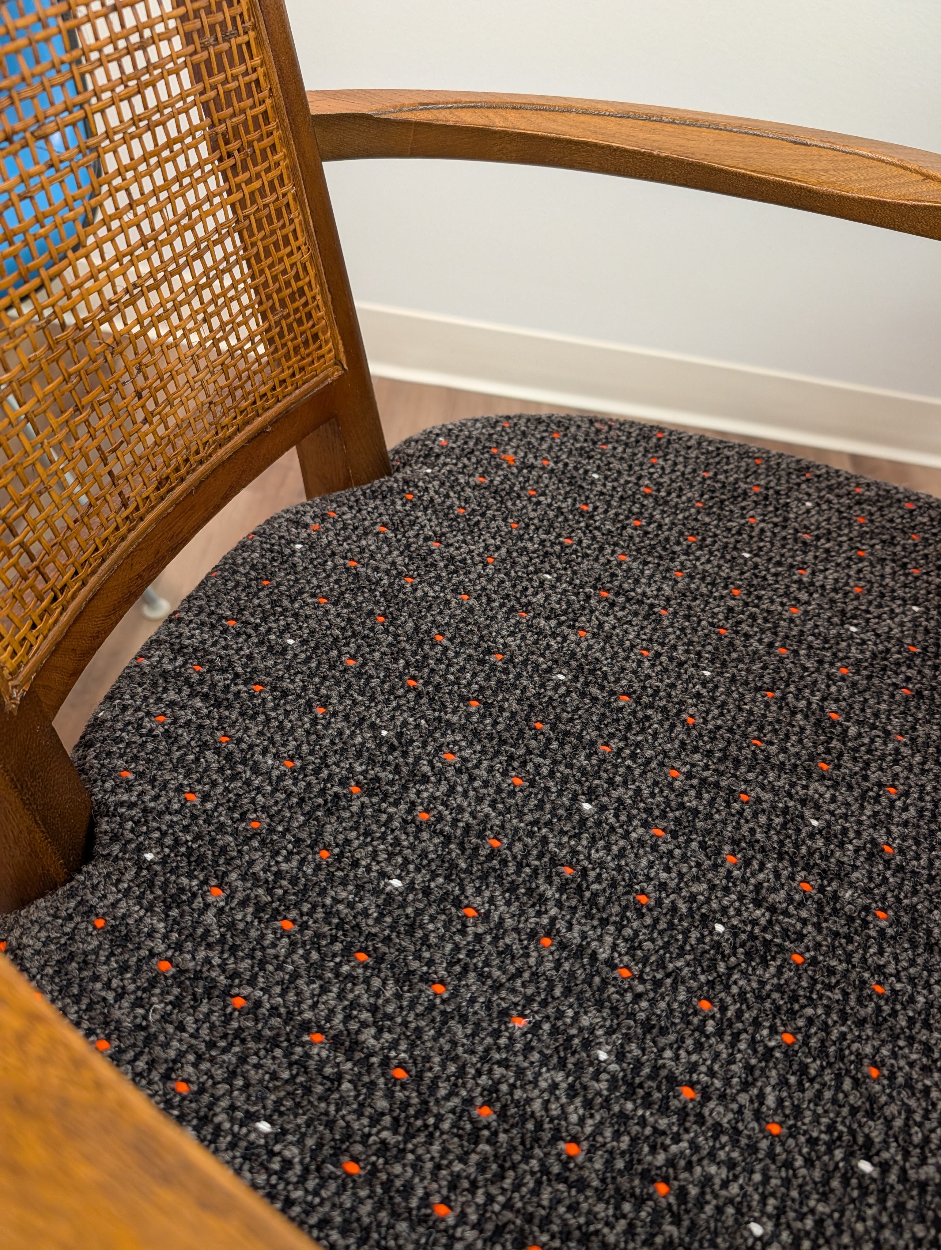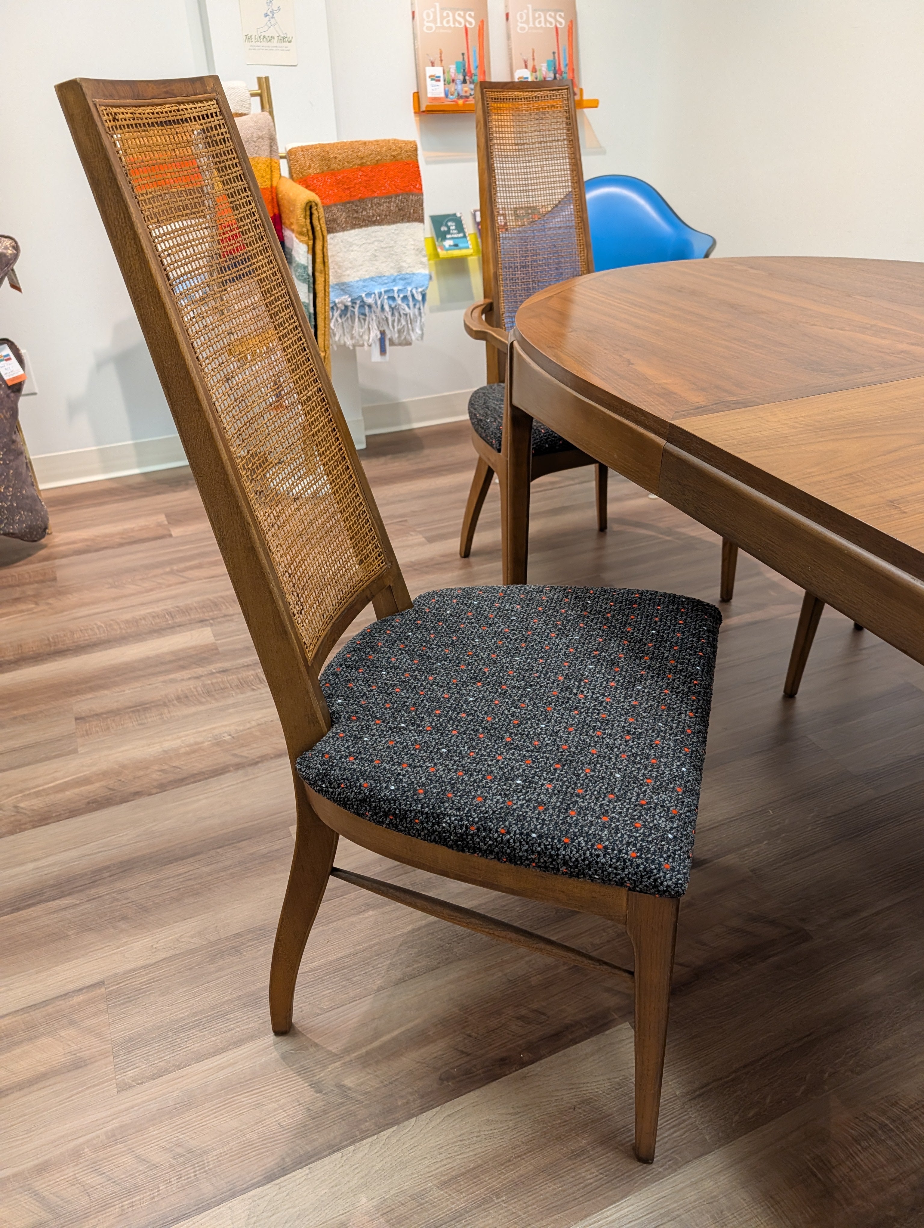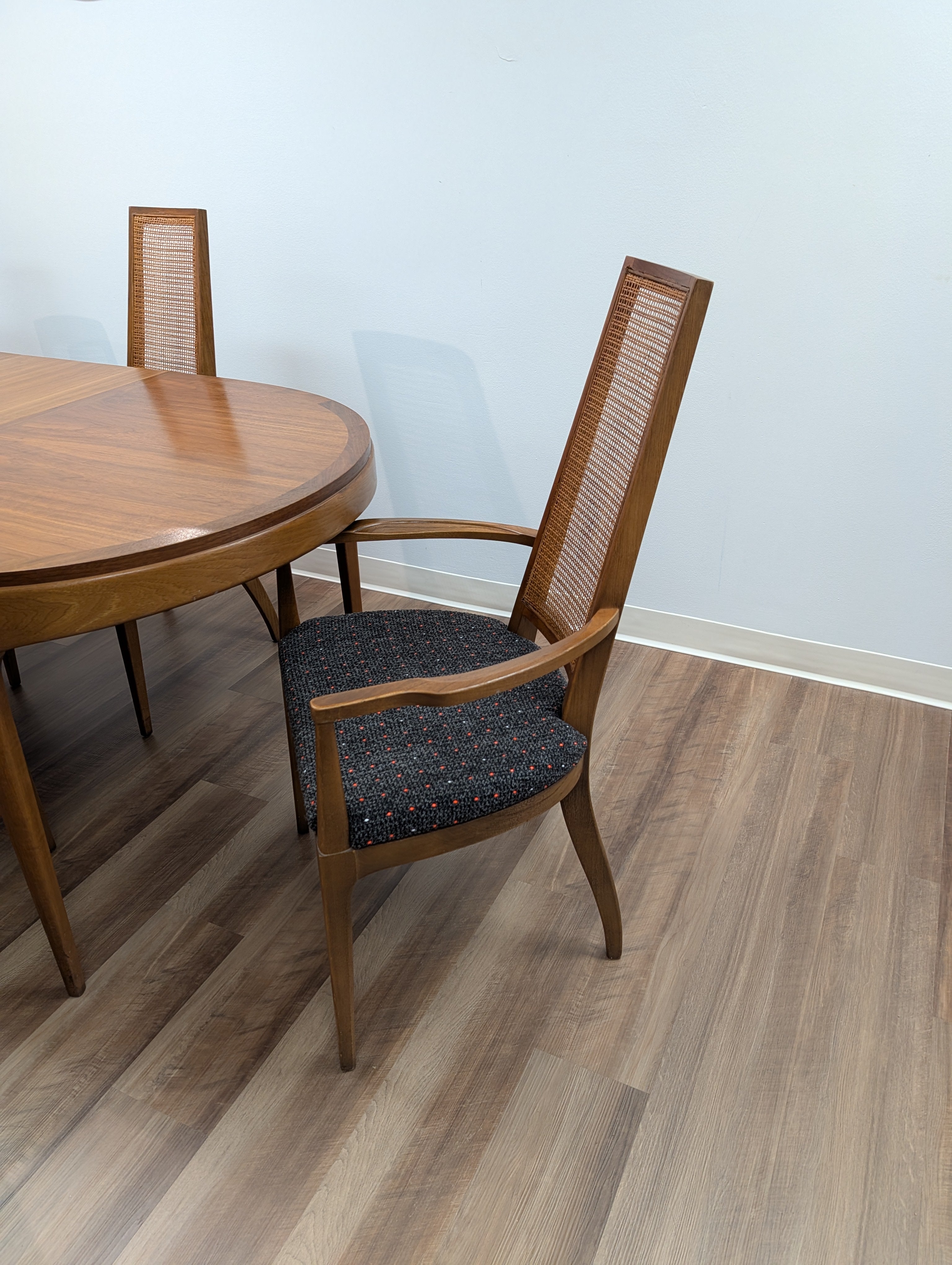 This large dining set from Lane's "Rhythm" collection includes an oval table with two leaves.  There are 4 side chairs and 2 captains chairs with new foam, batting and a cotton  and wool blend upholstery, "Momentum Tufted" from Modern Fabrics.  The back supports of the chairs are caned, which gives the set an airy effect.