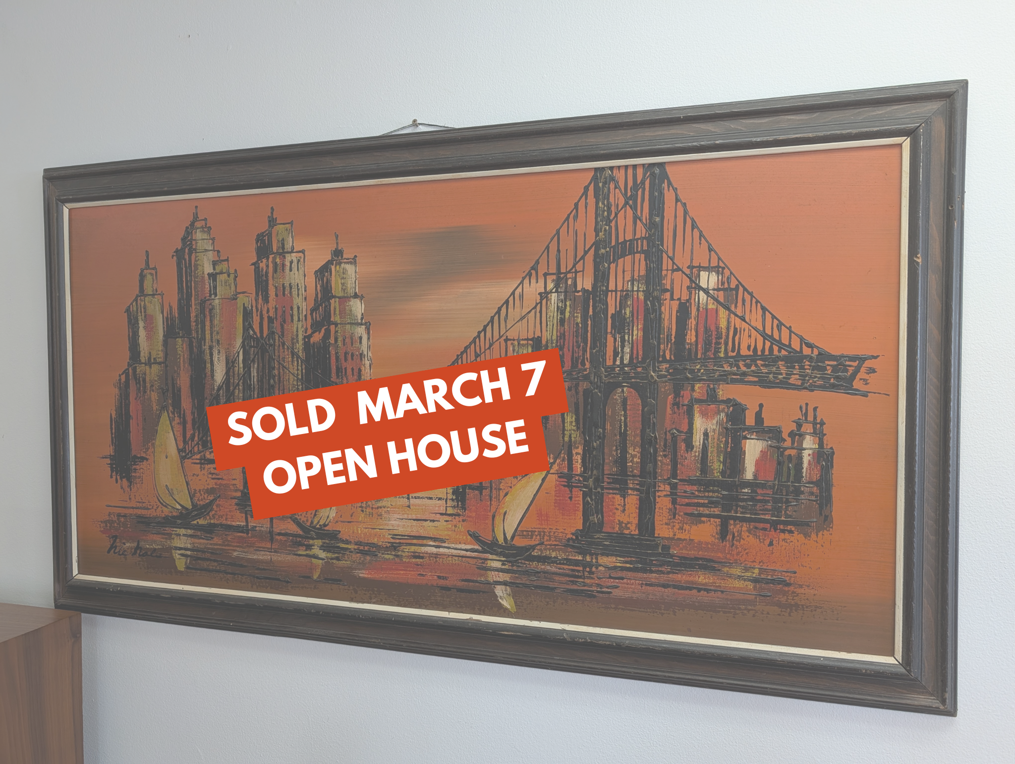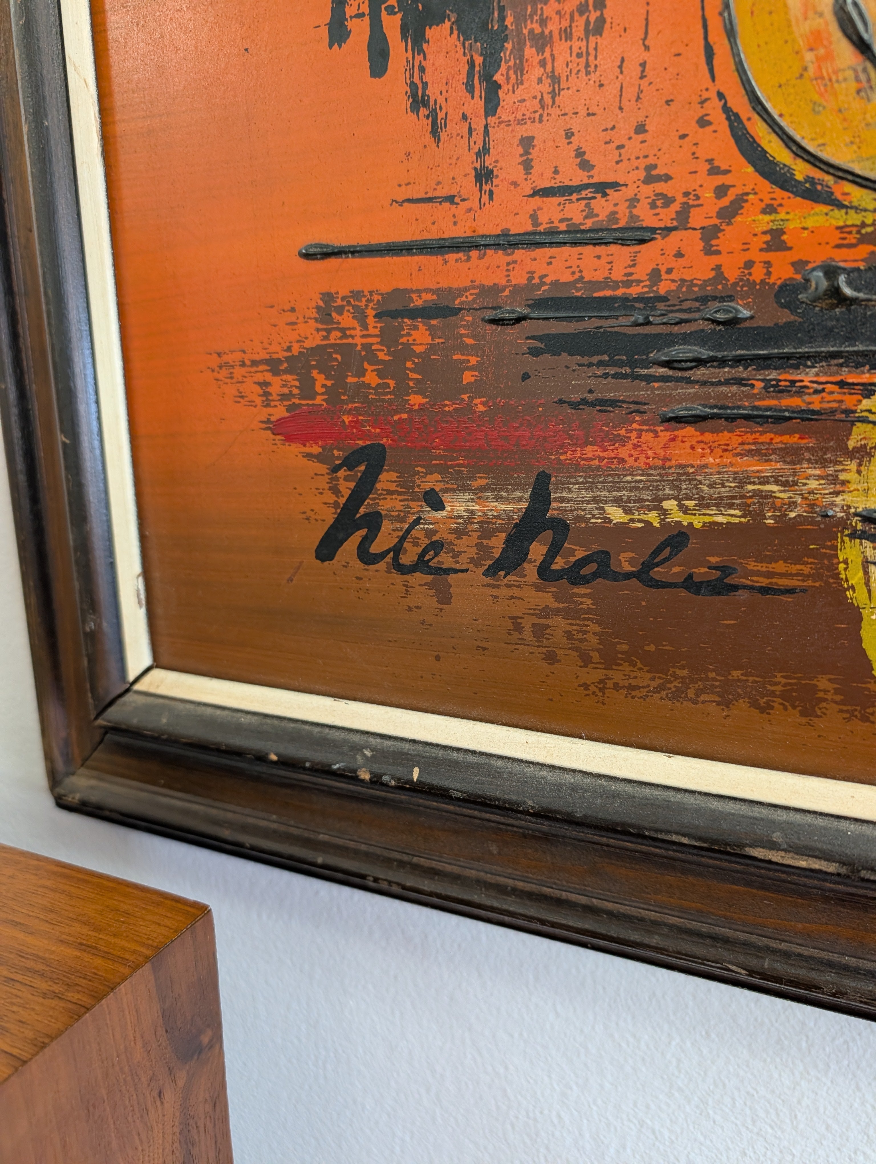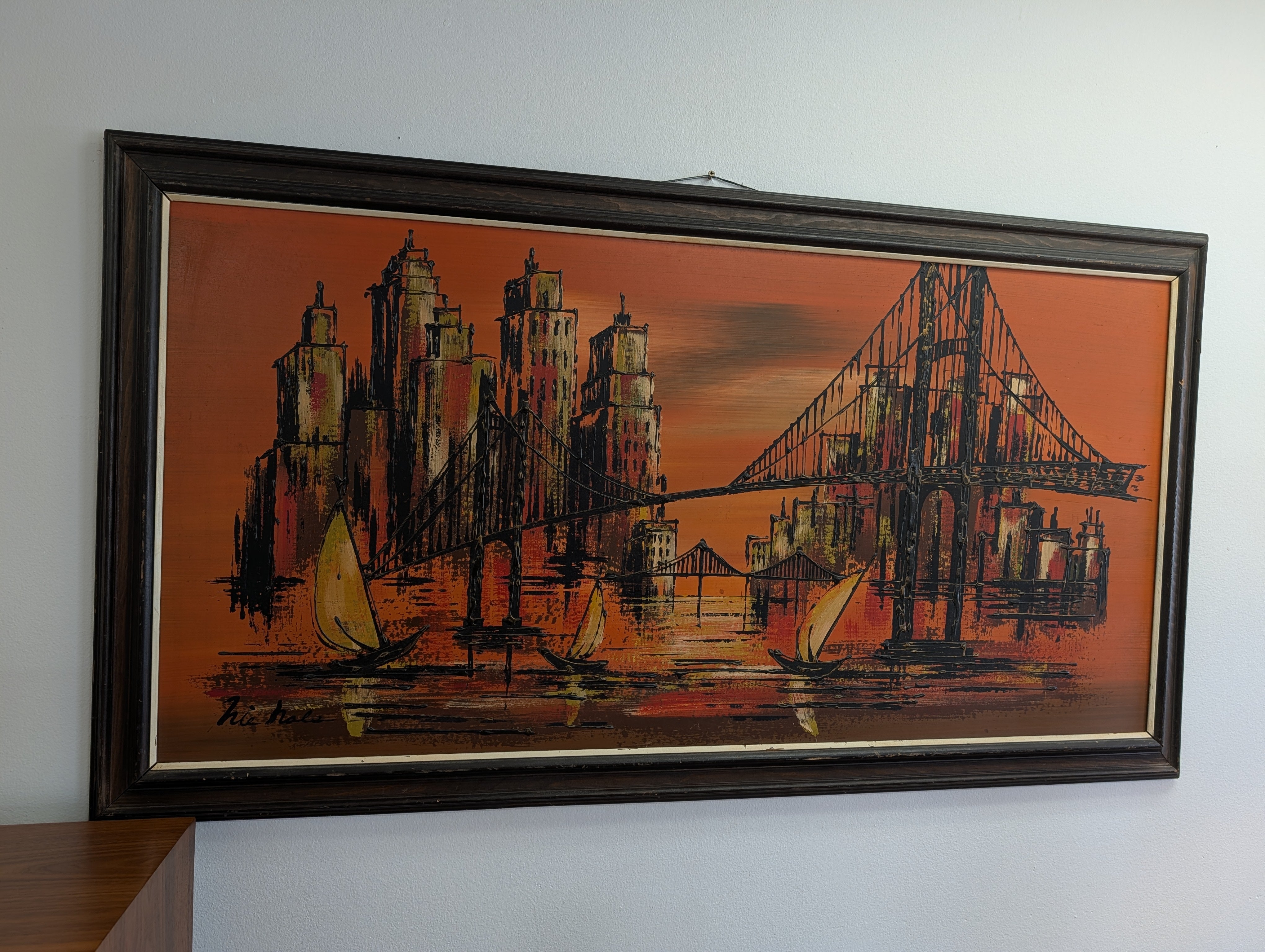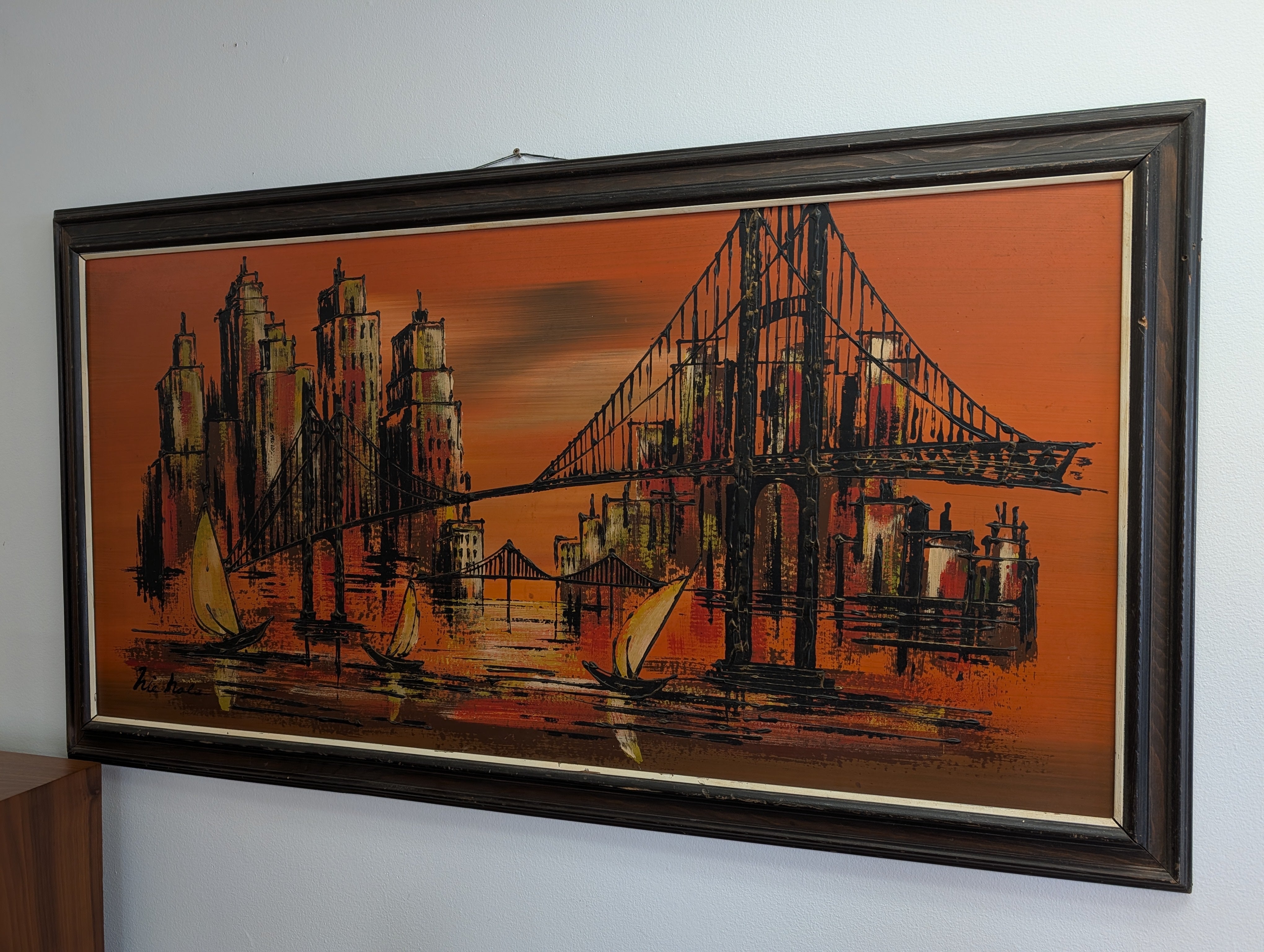 Large mid century artwork featuring a orange color scheme and bridge with cityscape and ships. We aren't quite sure what the signature says - but it includes a signature!