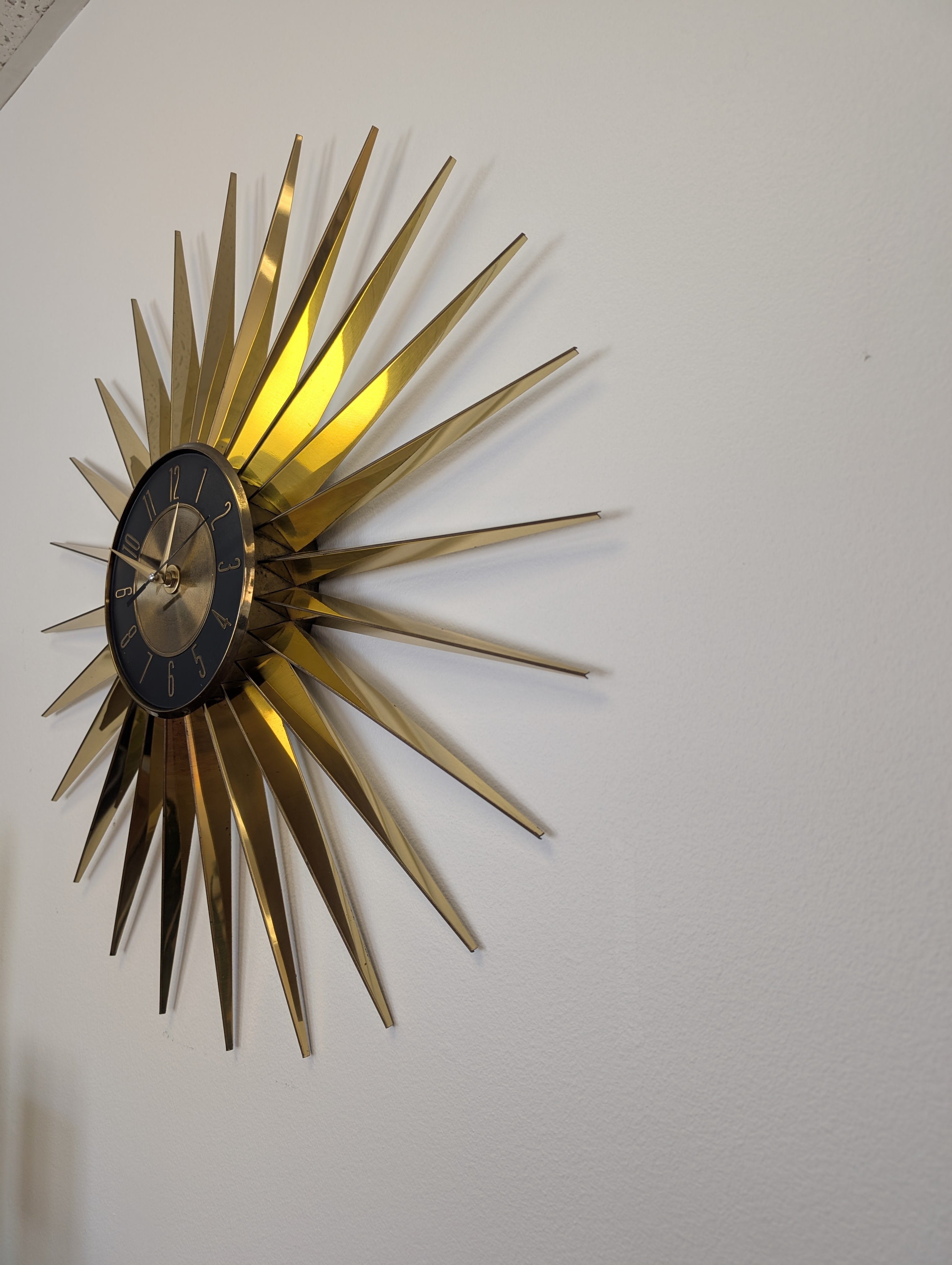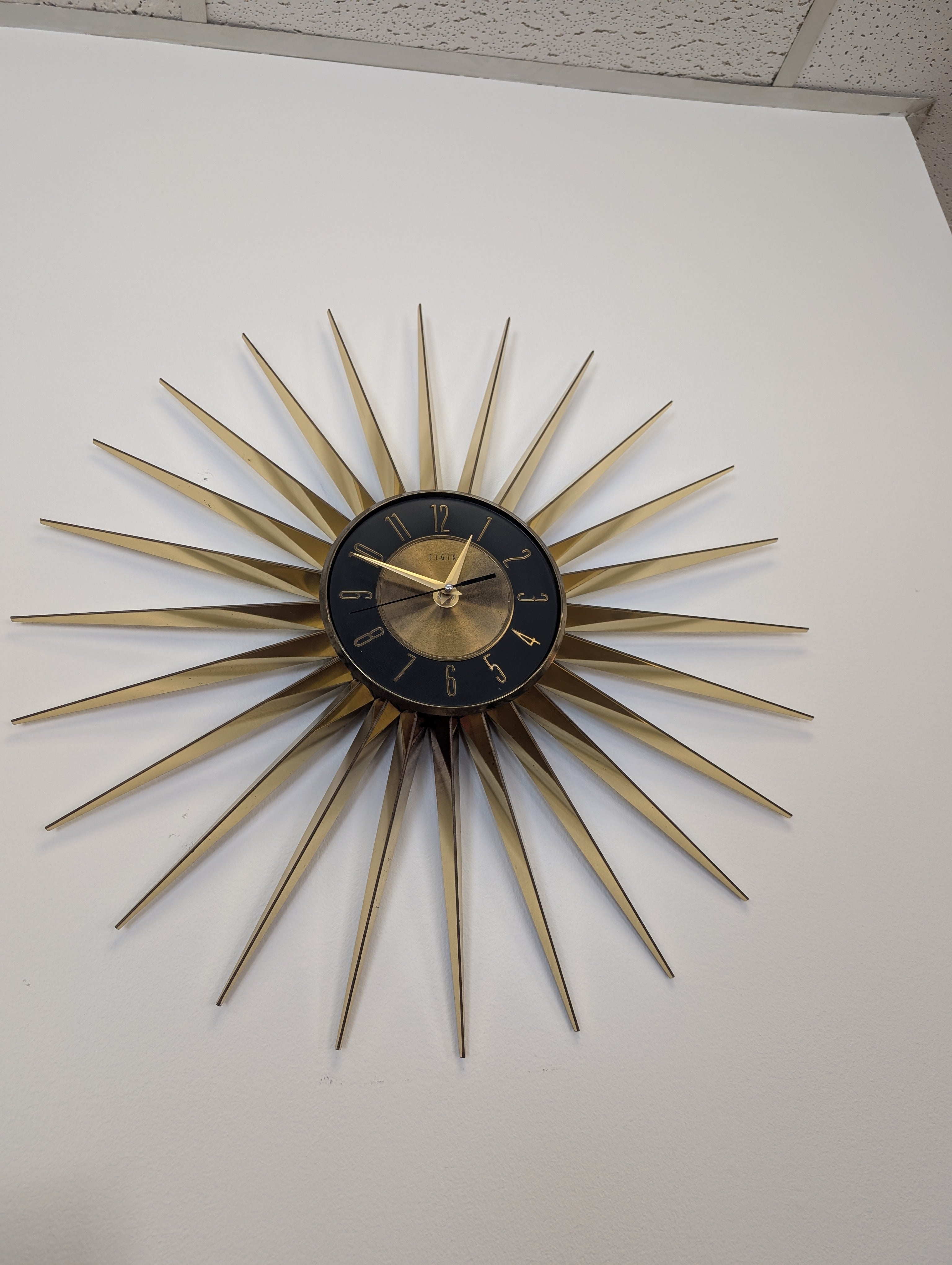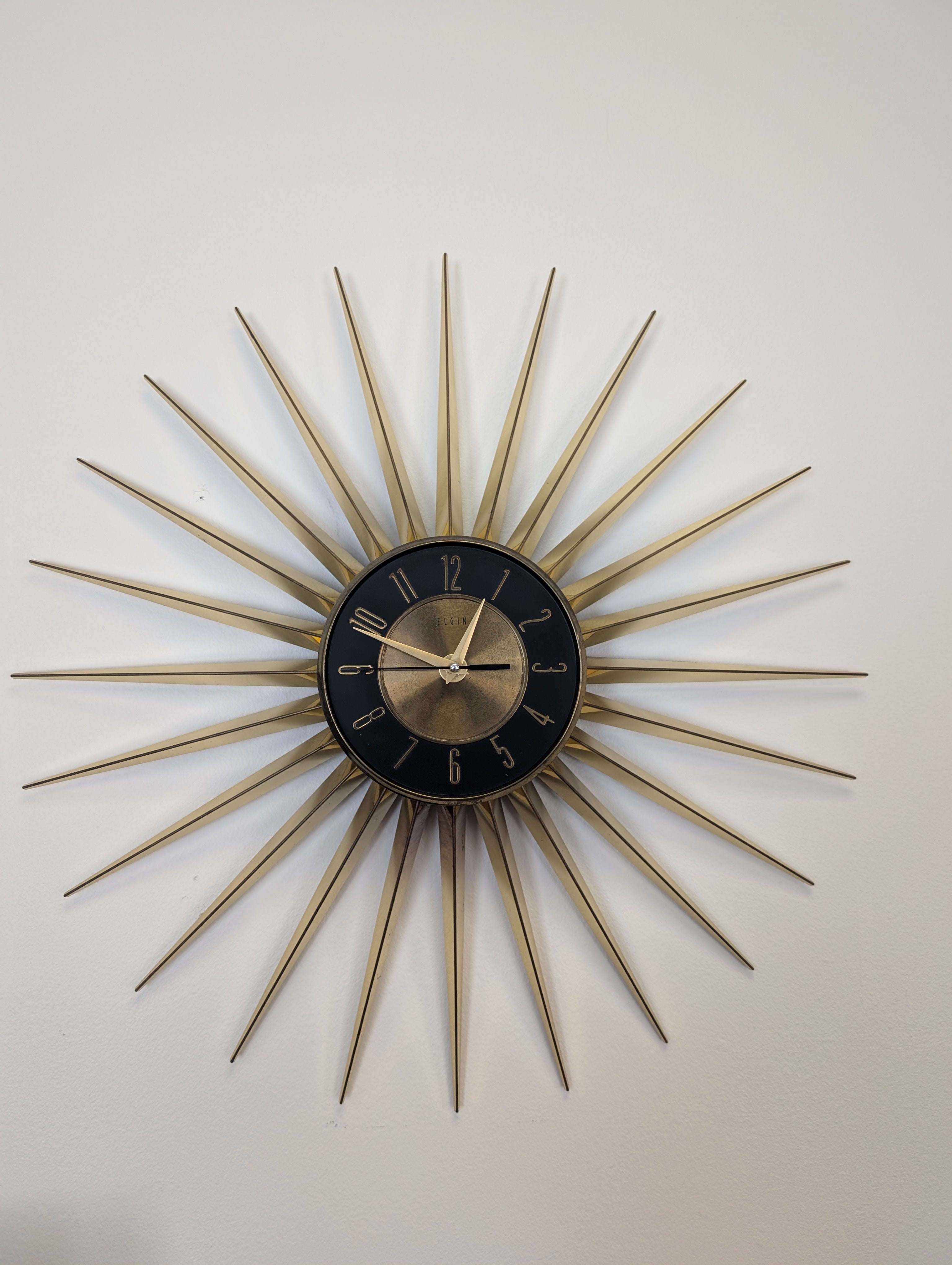 This is a radiant vintage Elgin Starburst with brass rays! Equipped with a new mechanism, it keeps perfect time.