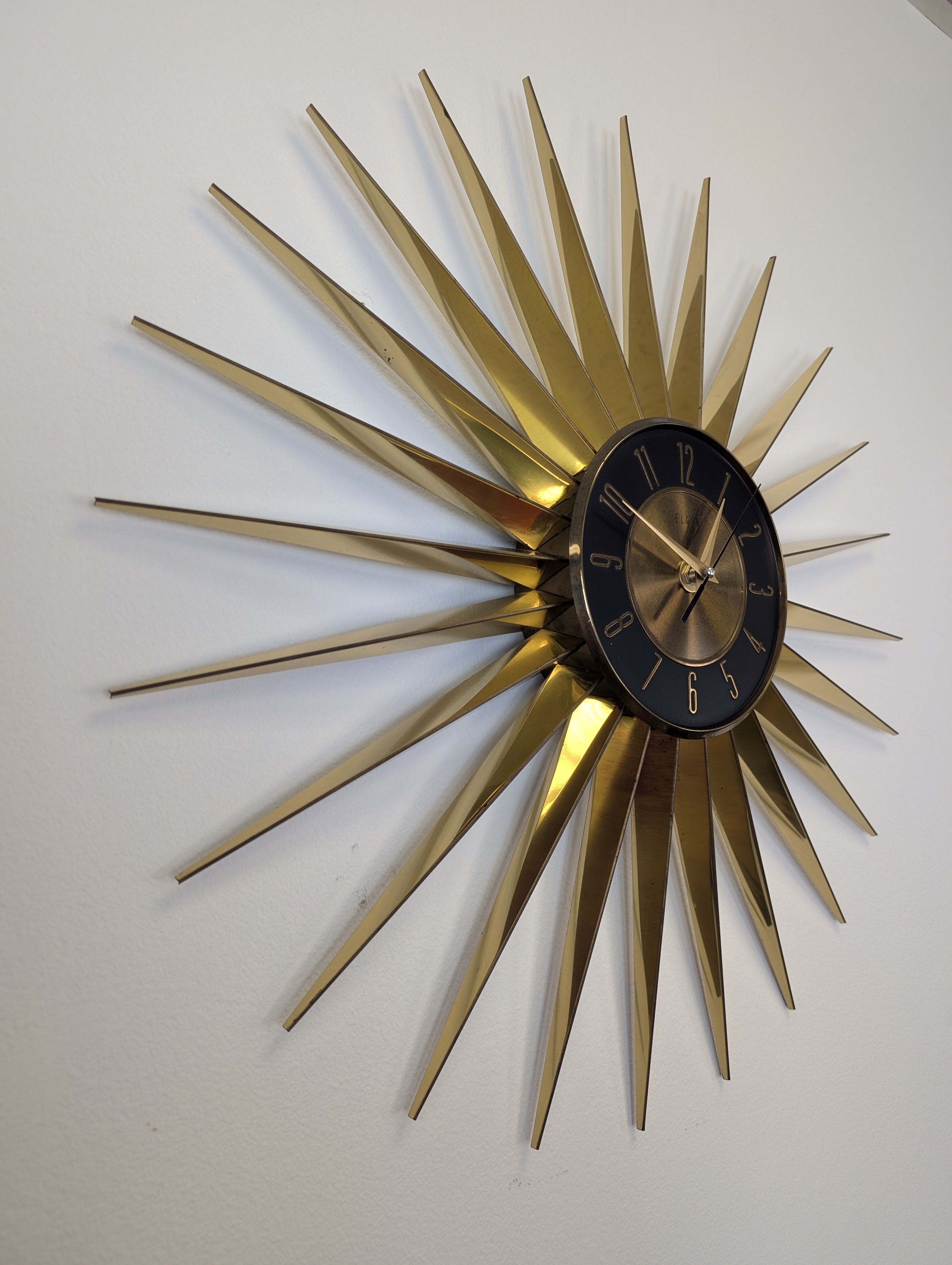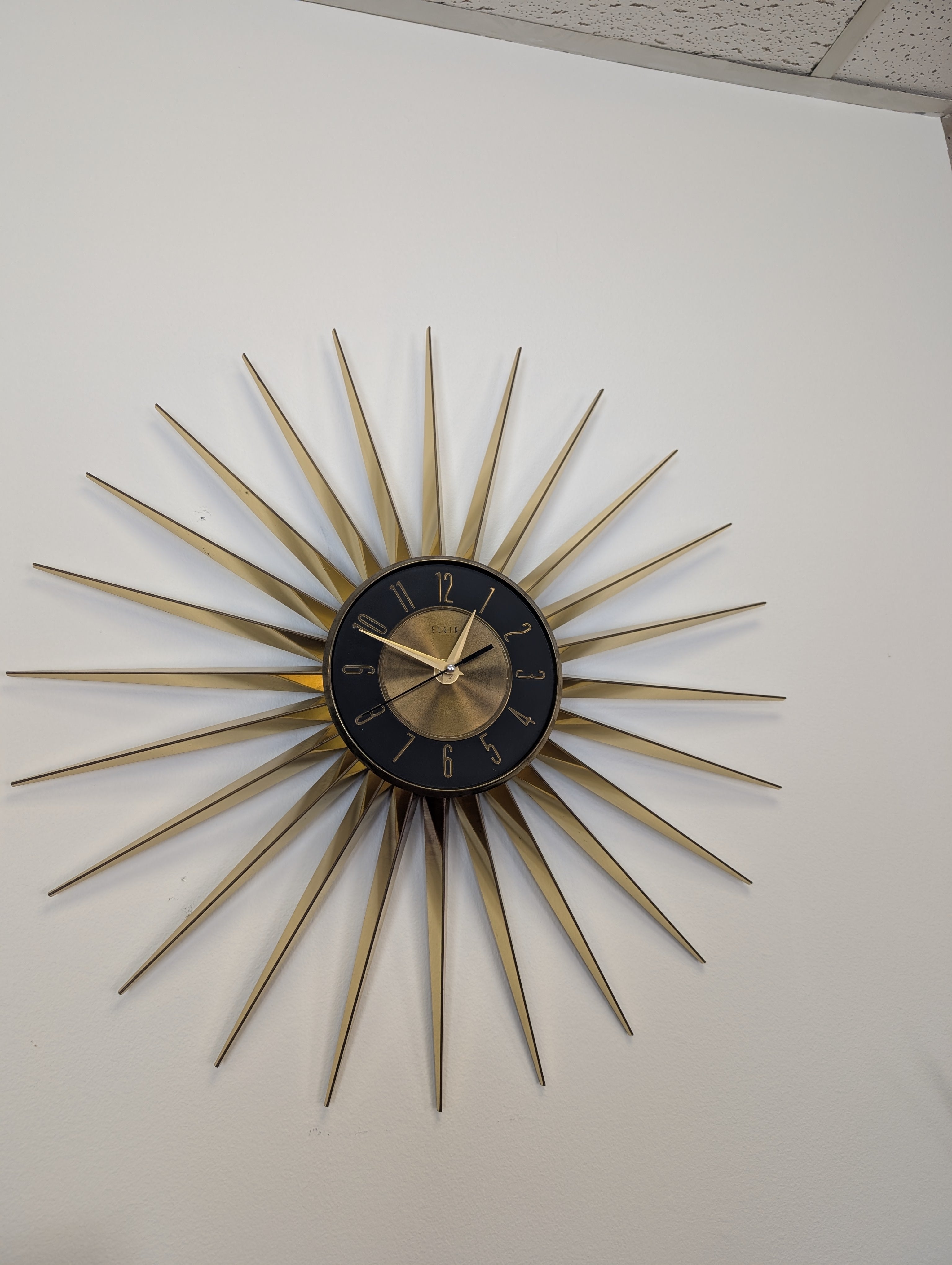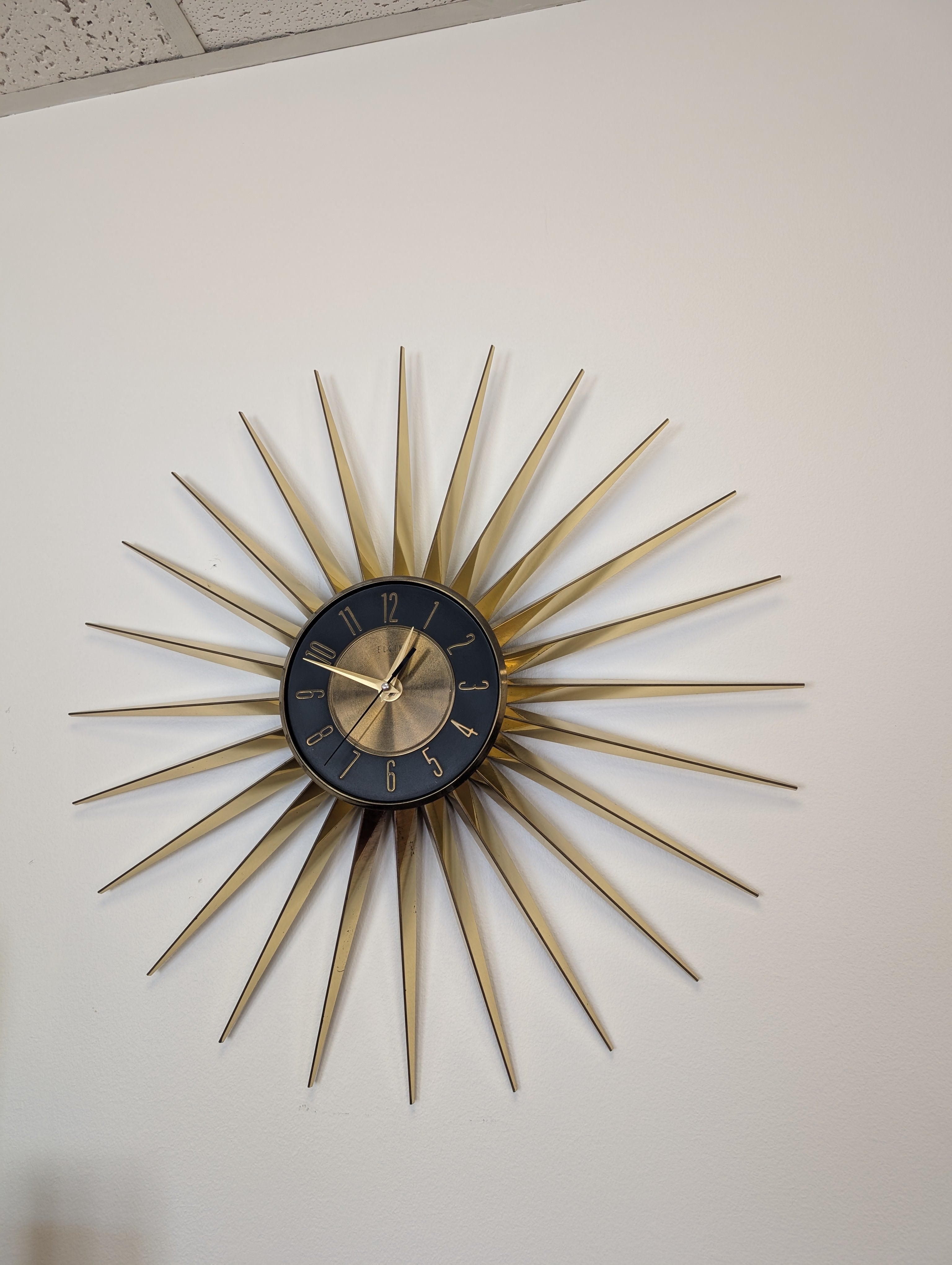 This is a radiant vintage Elgin Starburst with brass rays! Equipped with a new mechanism, it keeps perfect time.