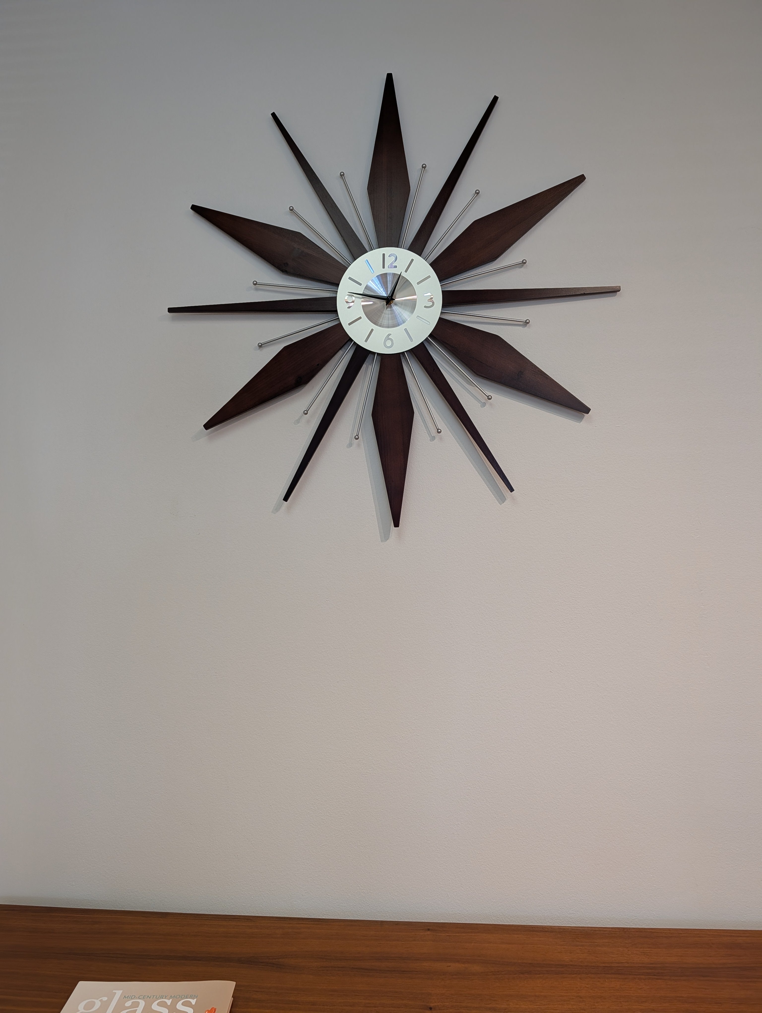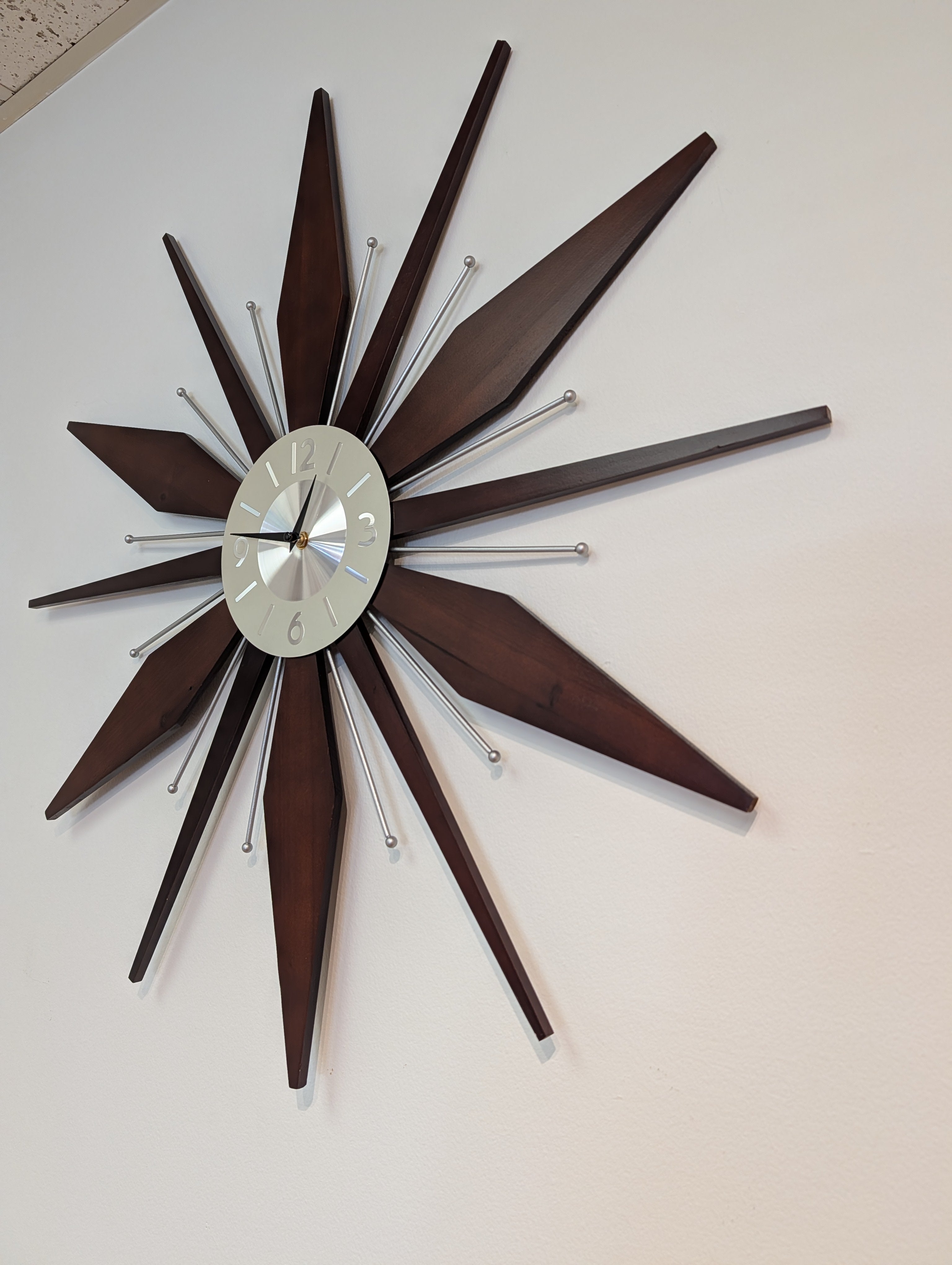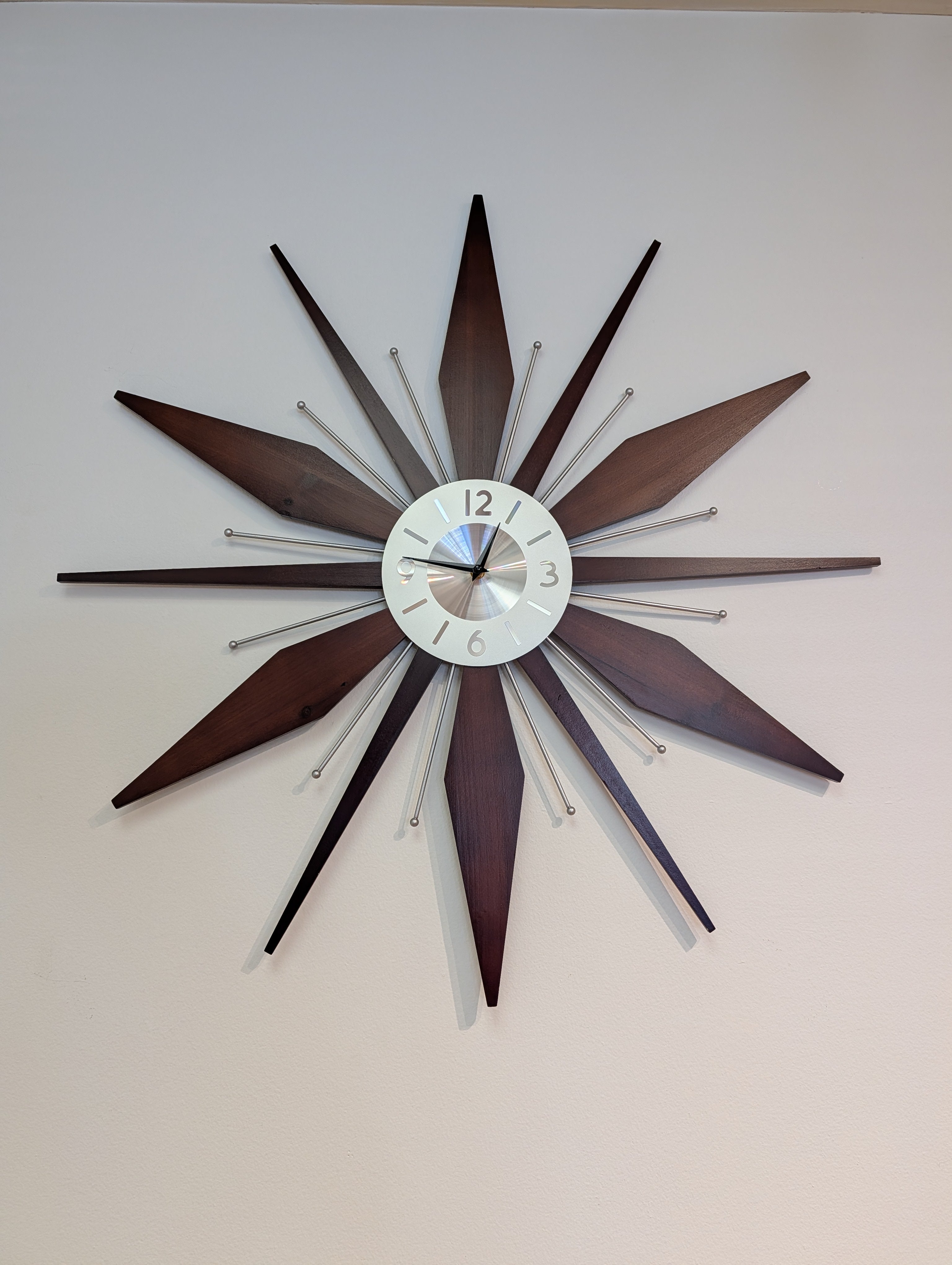 This listing is for one new, mid century modern style starburst clock featuring a brushed aluminum clock face and walnut rays.