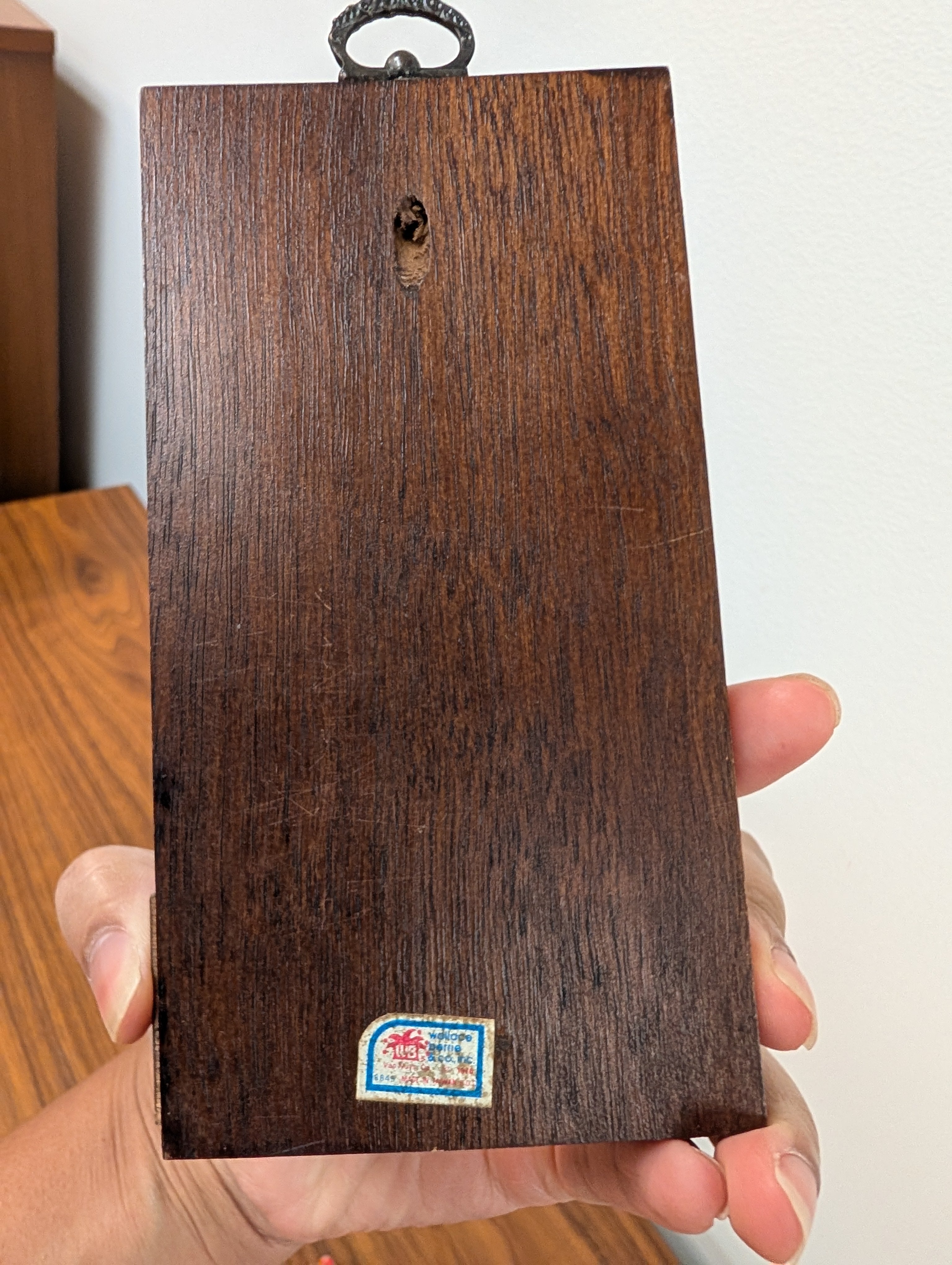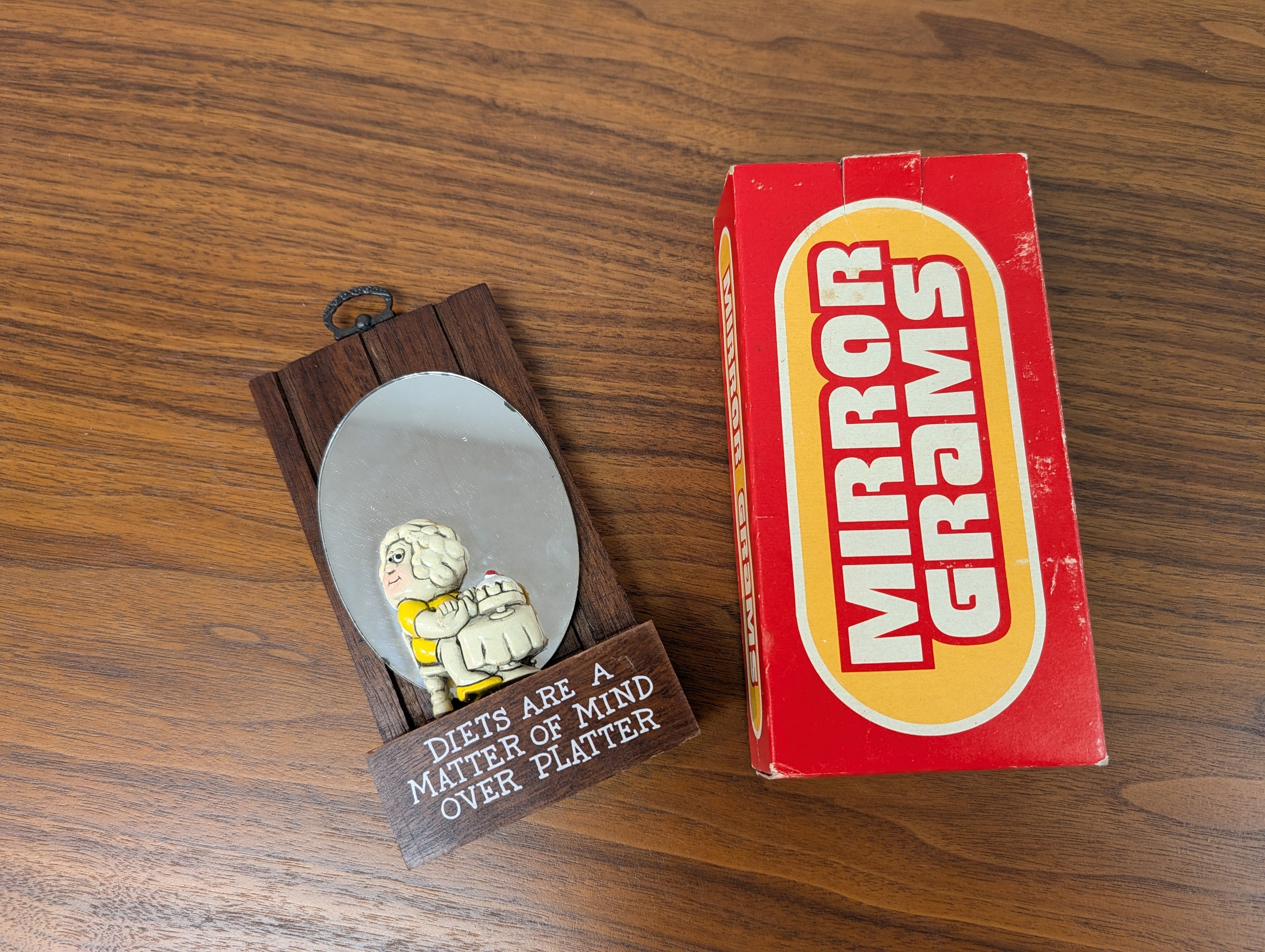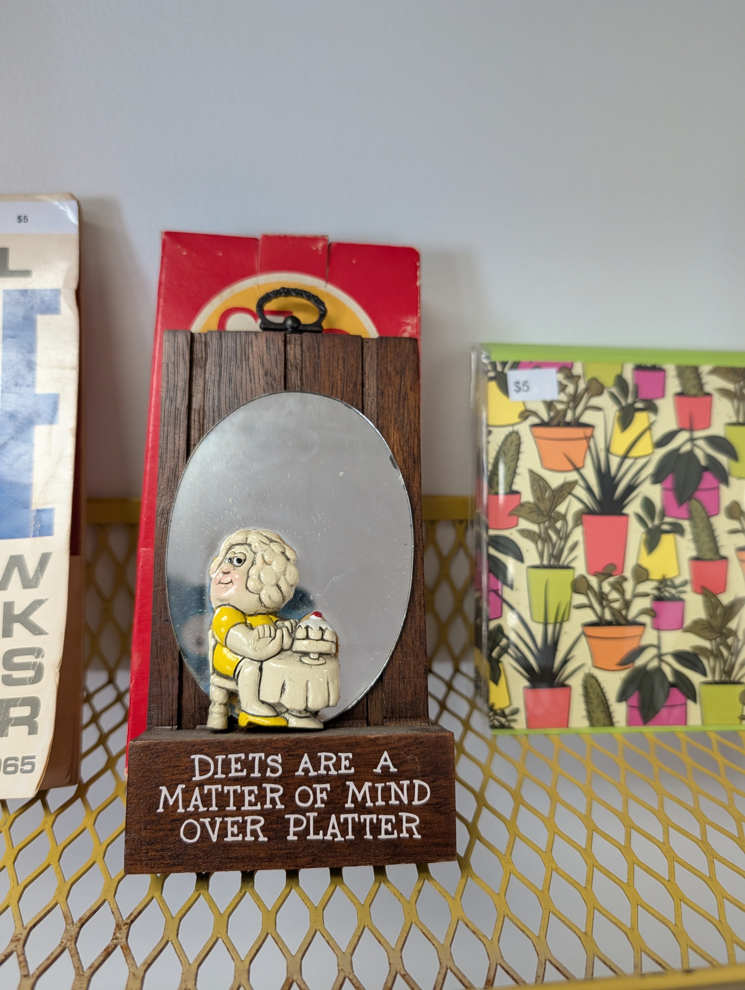 This is a cute 1970s "mirror gram" which includes a cartoon style figure and a comical message. On this particular version a woman sits at a table and it reads "Diets are a matter of mind over platter". Includes the original box! A great light-hearted gift.