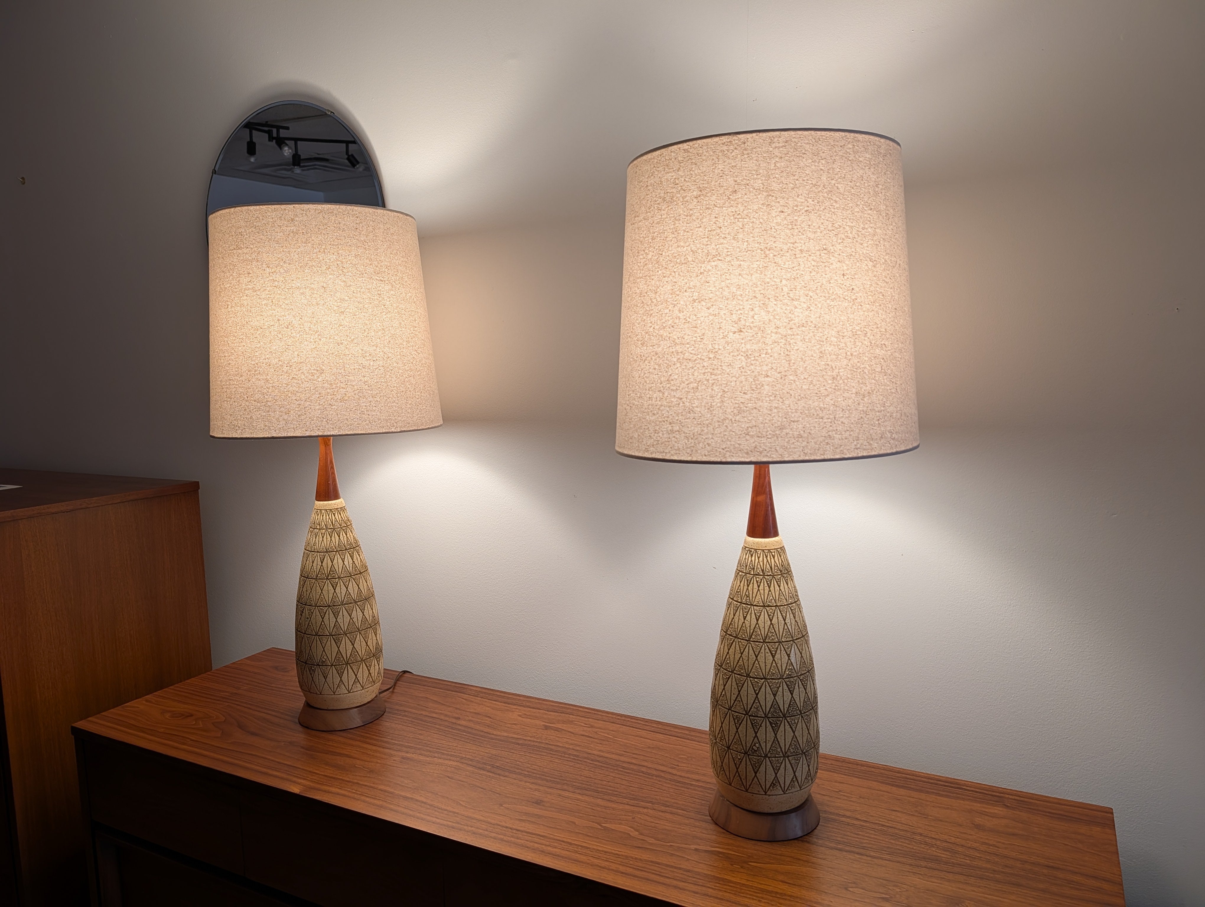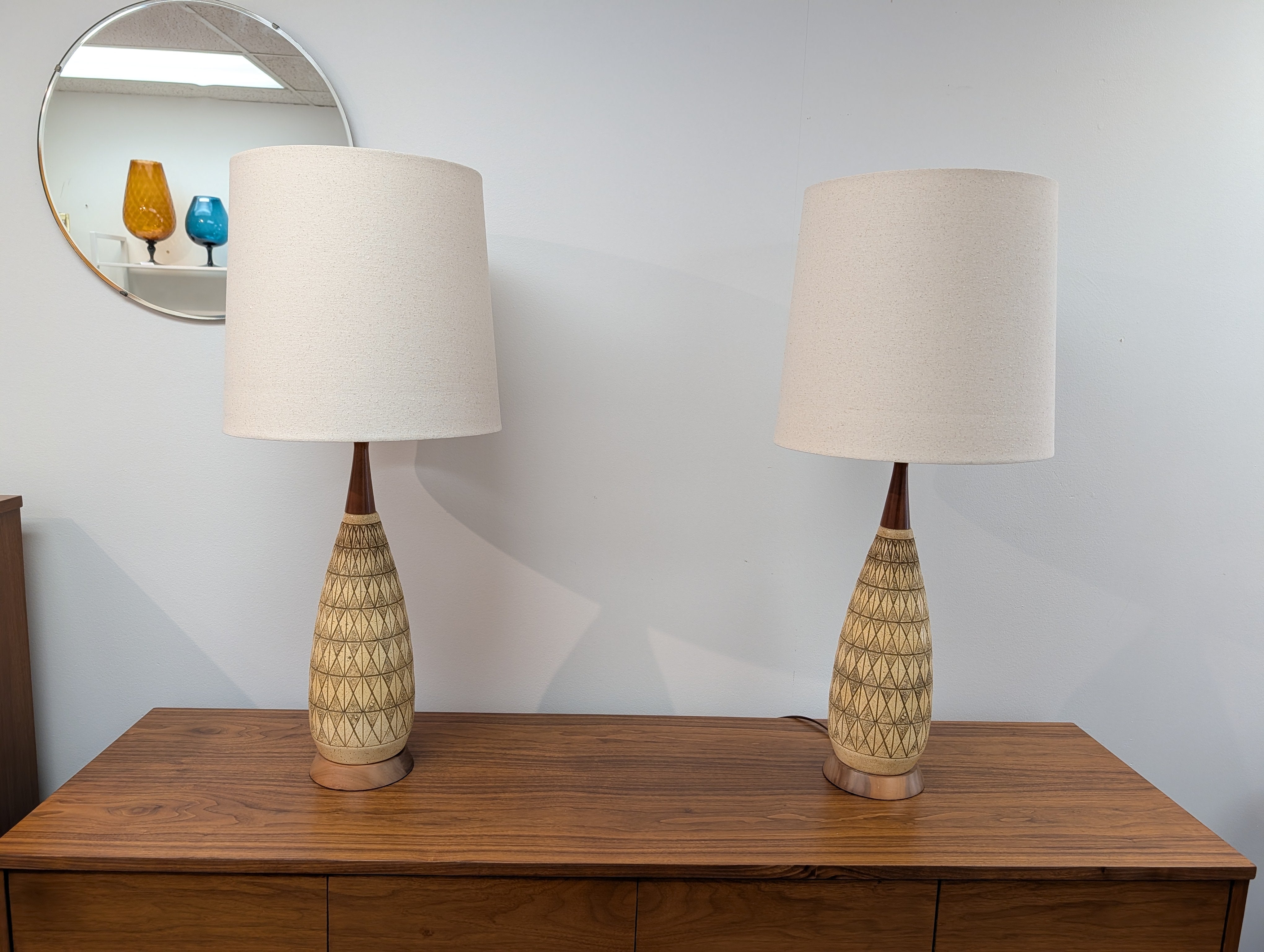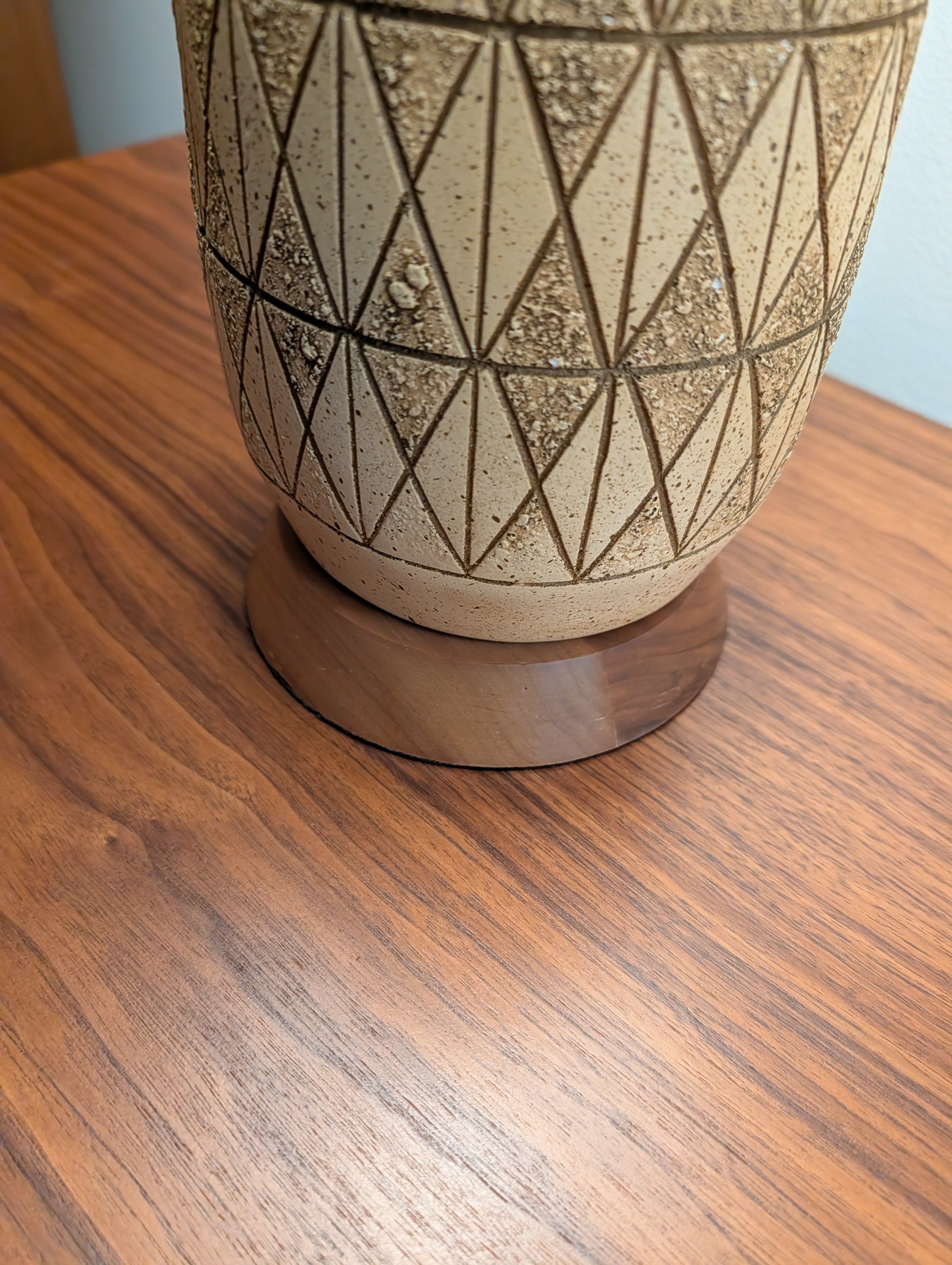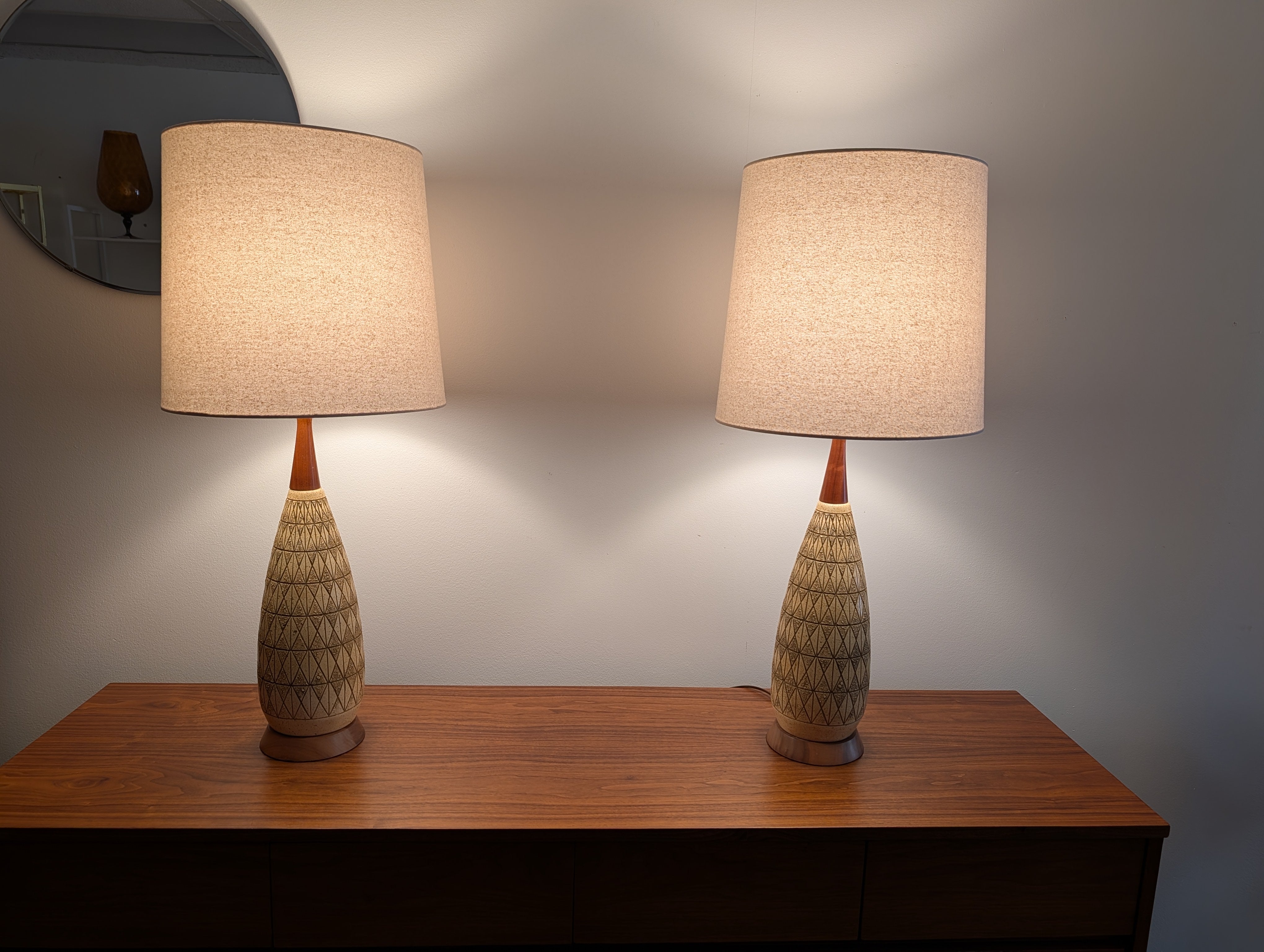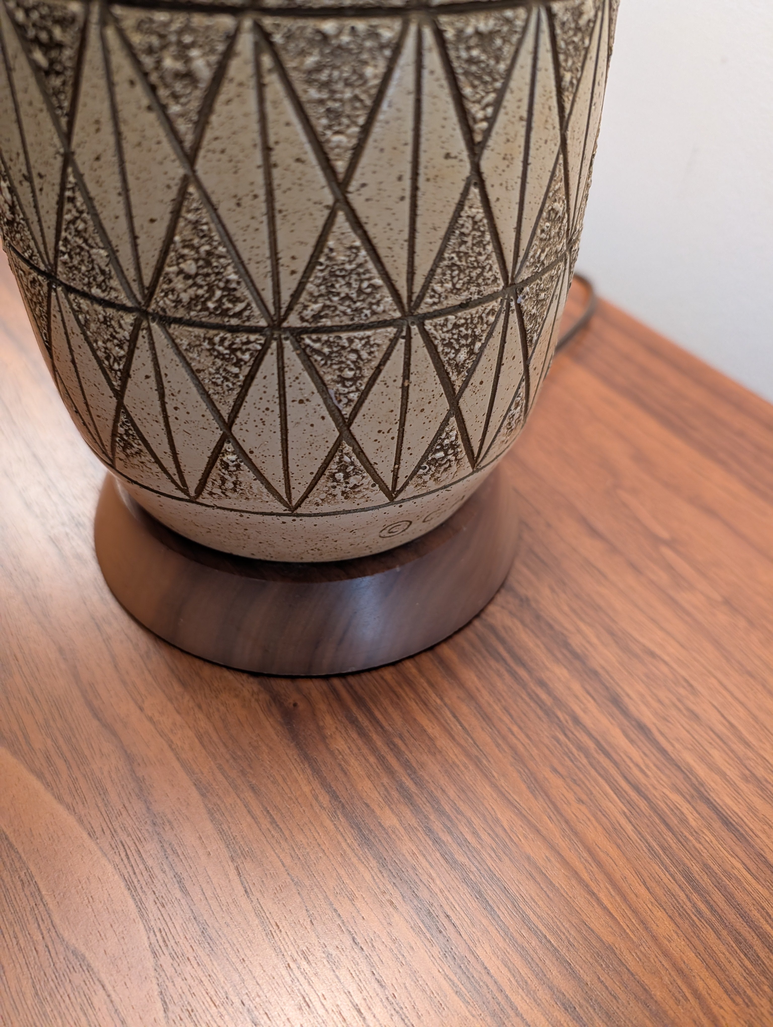 This is a handsome pair of mid century modern lamps that feature a geometric carved ceramic design and wood bases and necks. The lamps have new sockets, plugs and cords and have 3 lighting settings.