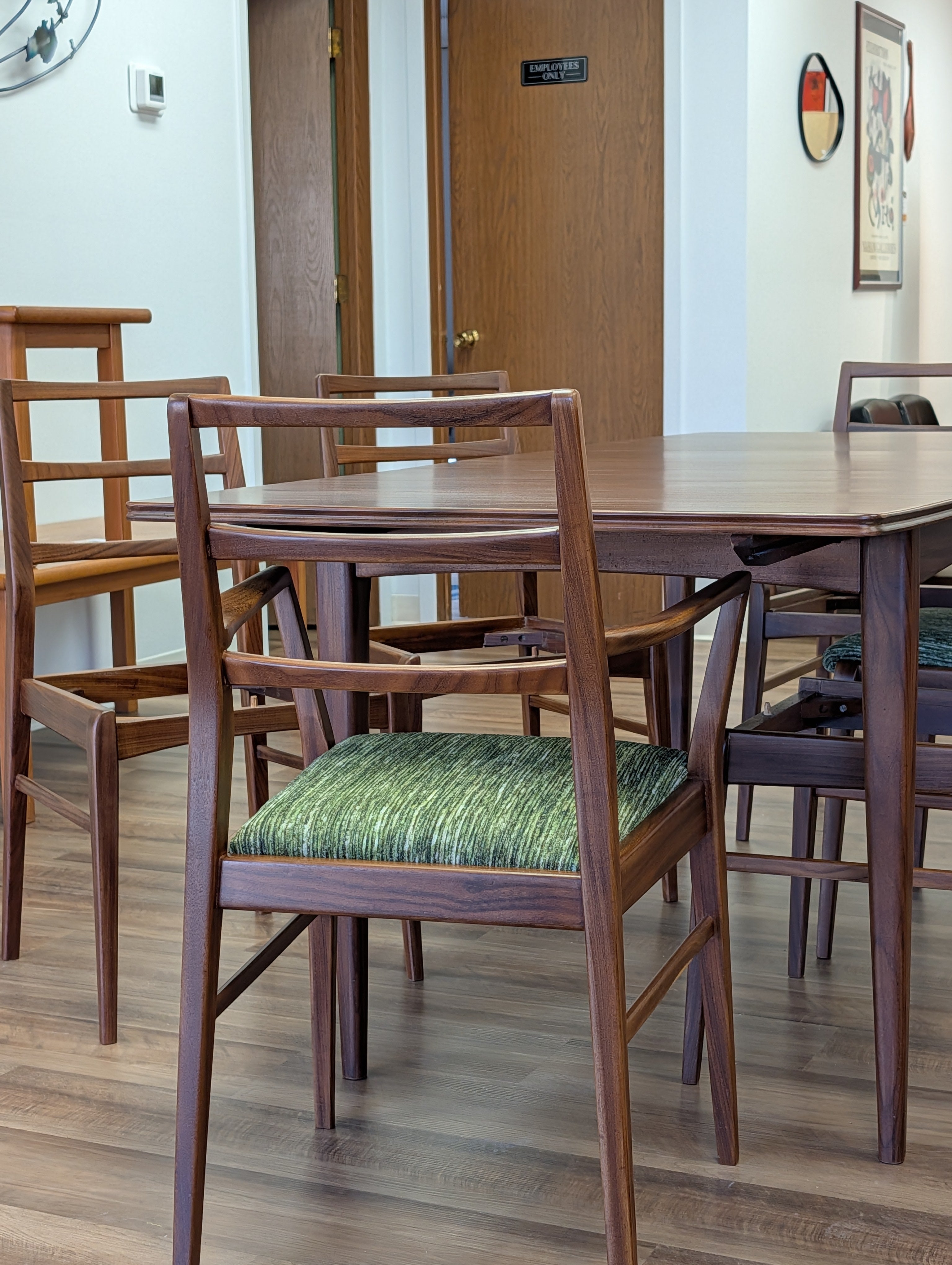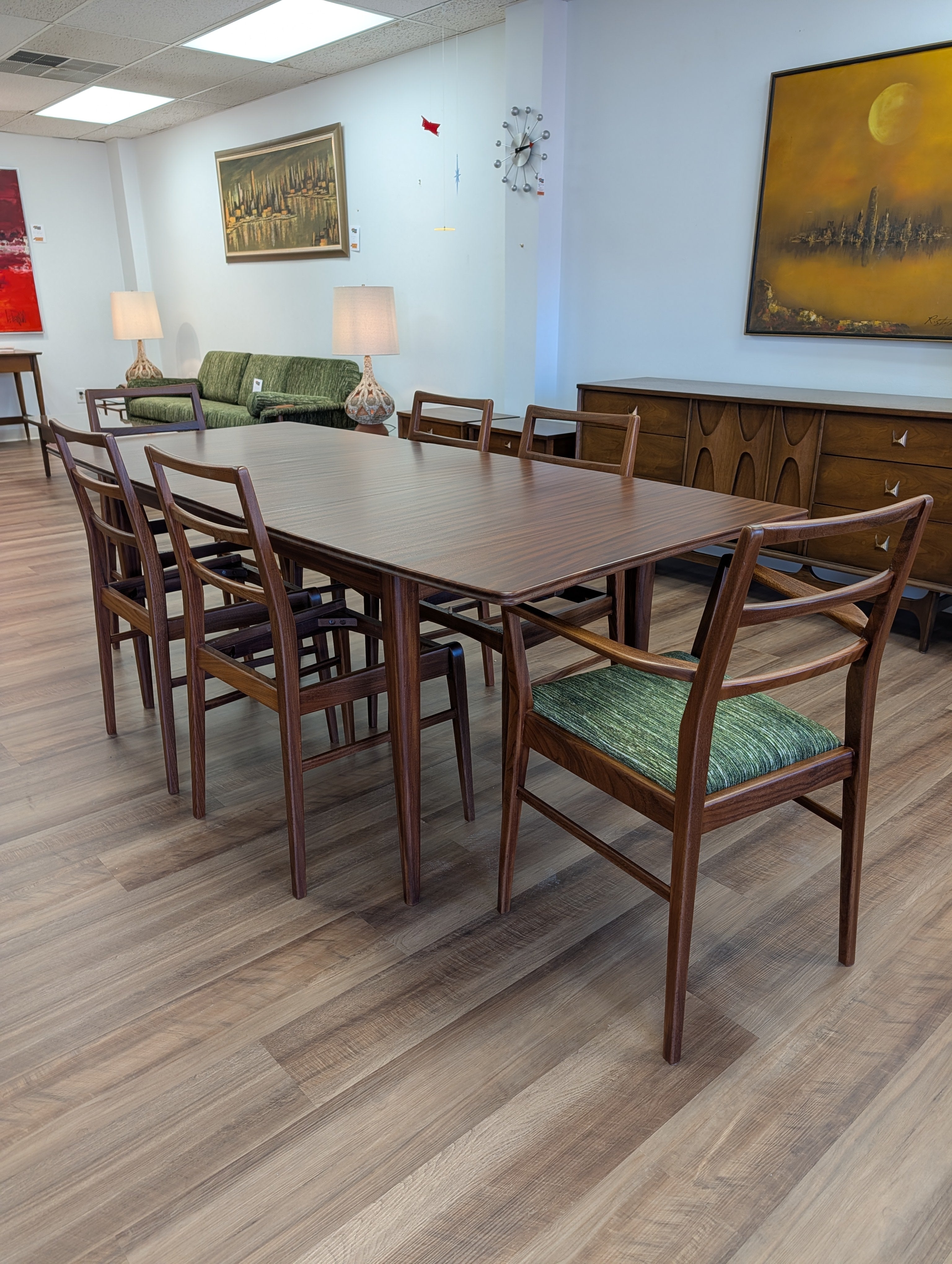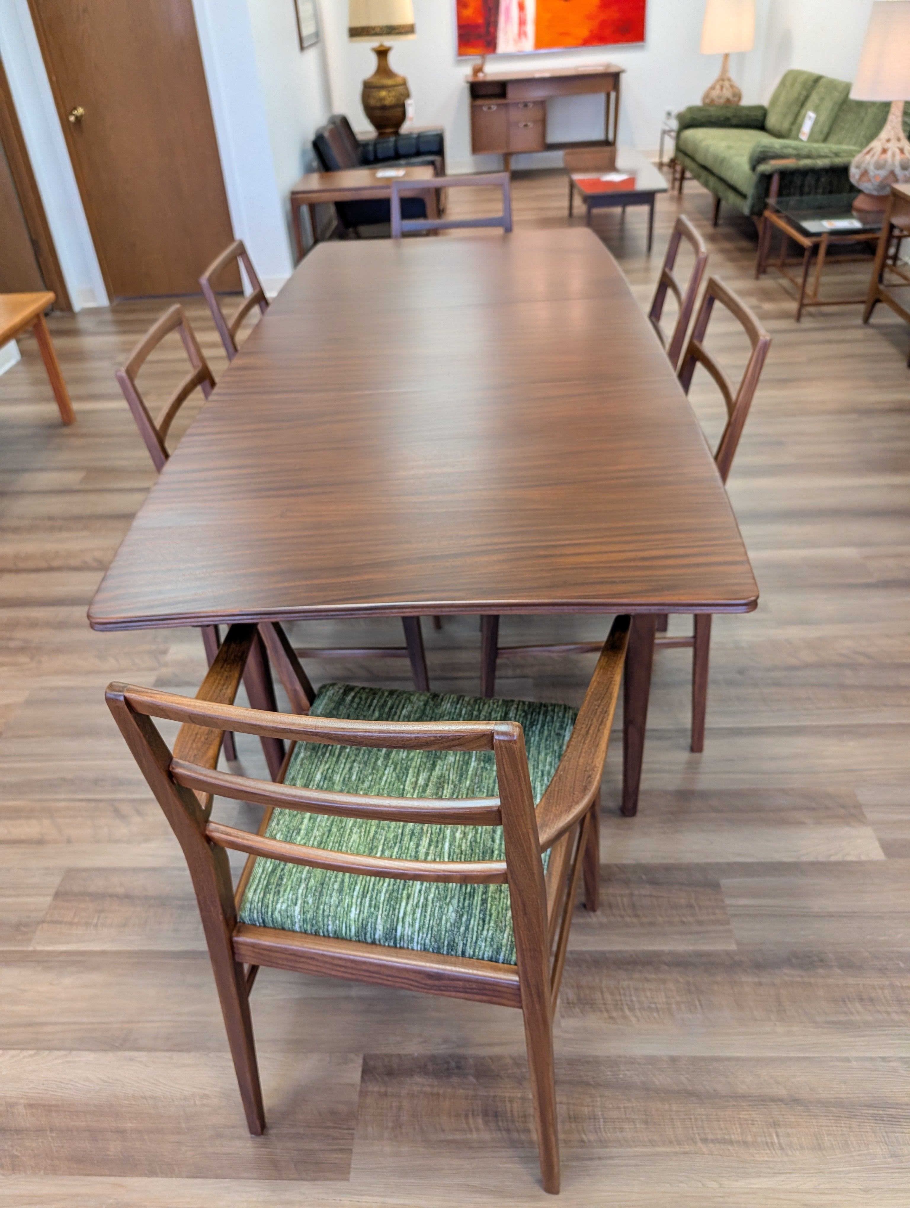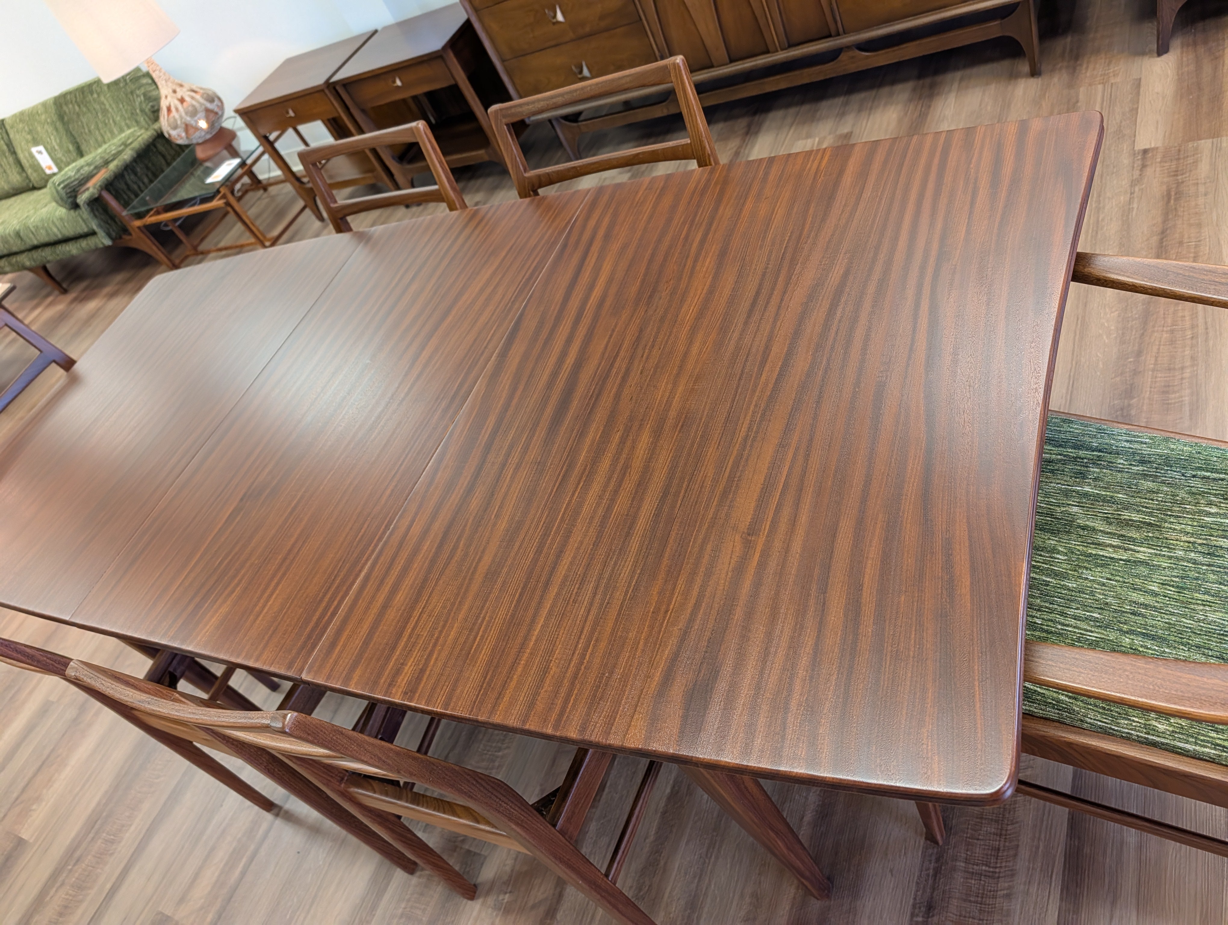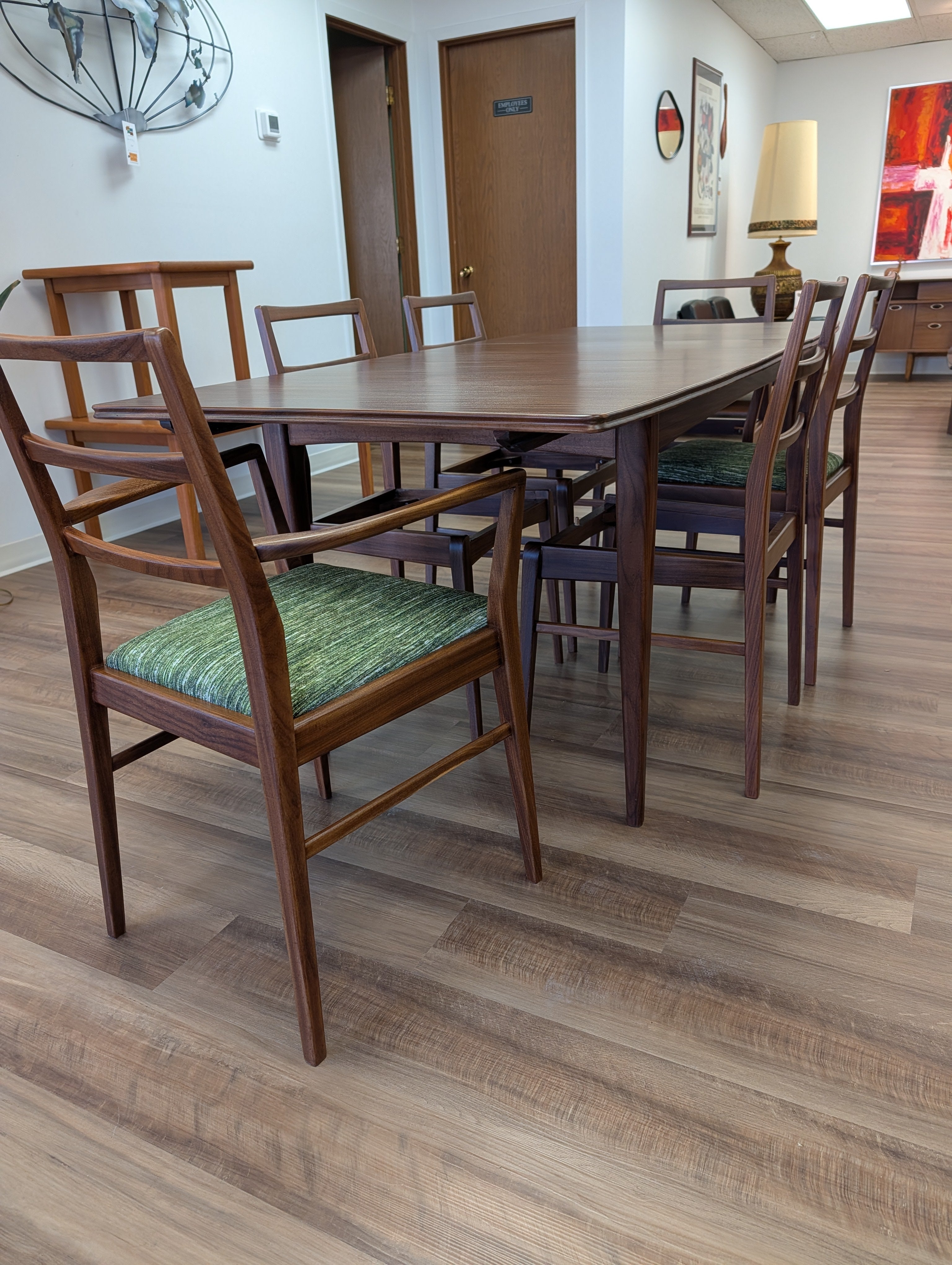 You've probably seen American mid century modern and maybe Danish - but what about British mid century modern! We're pleased to present a fully restored dining set crafted in solid Afromosia wood, designed by Richard Hornby for Fyne Ladye Furniture in the 1960s! This set is special, not only because it not often seen in the United States, but also because of the way it was designed. The leaf nests easily within the table and you can even remove the table top on either side! The 6 chairs include two captains chairs and four side chairs. Refreshed with new green chenille upholstery, you can actually pop the seats on and off of a single dowel.