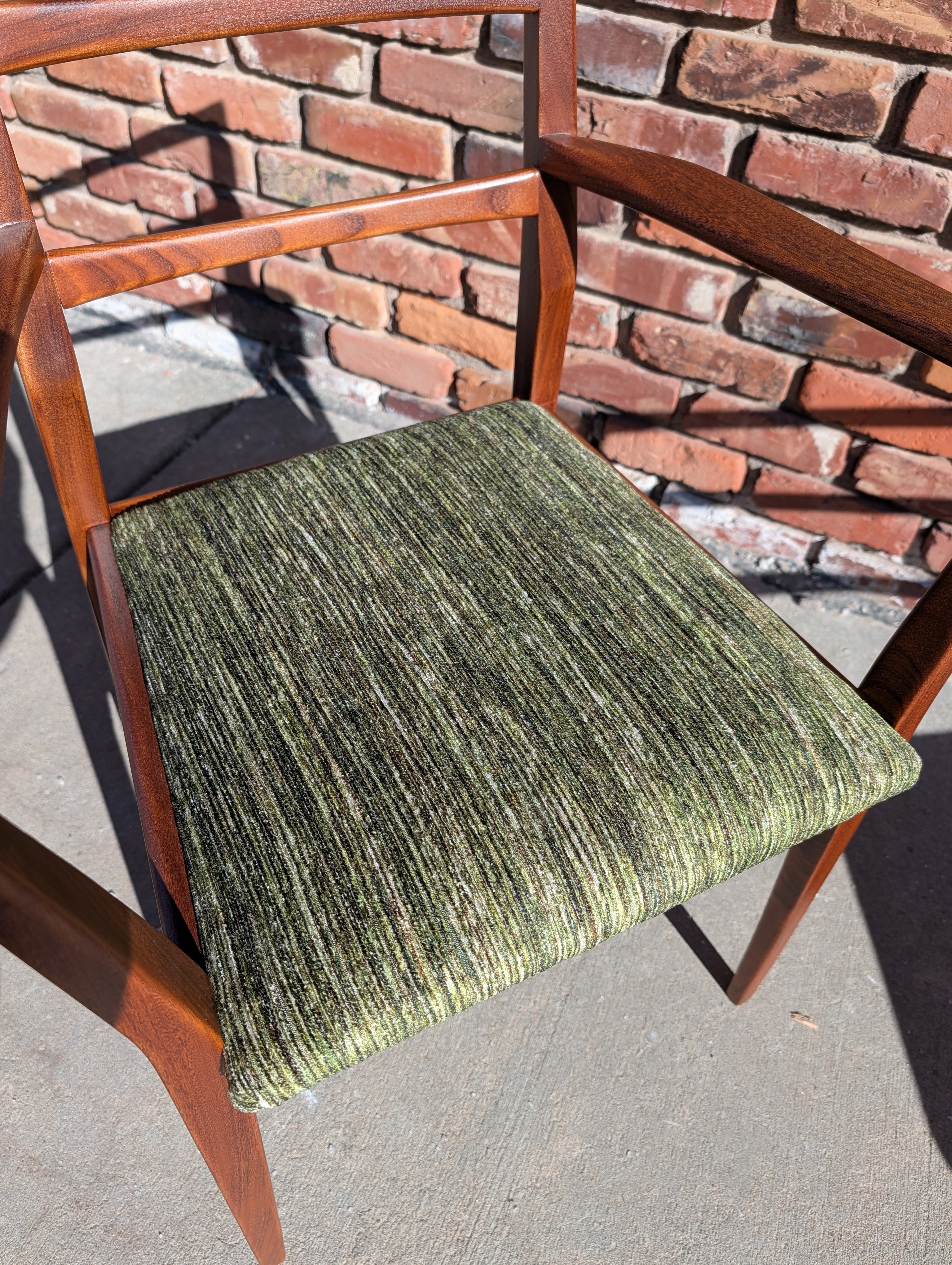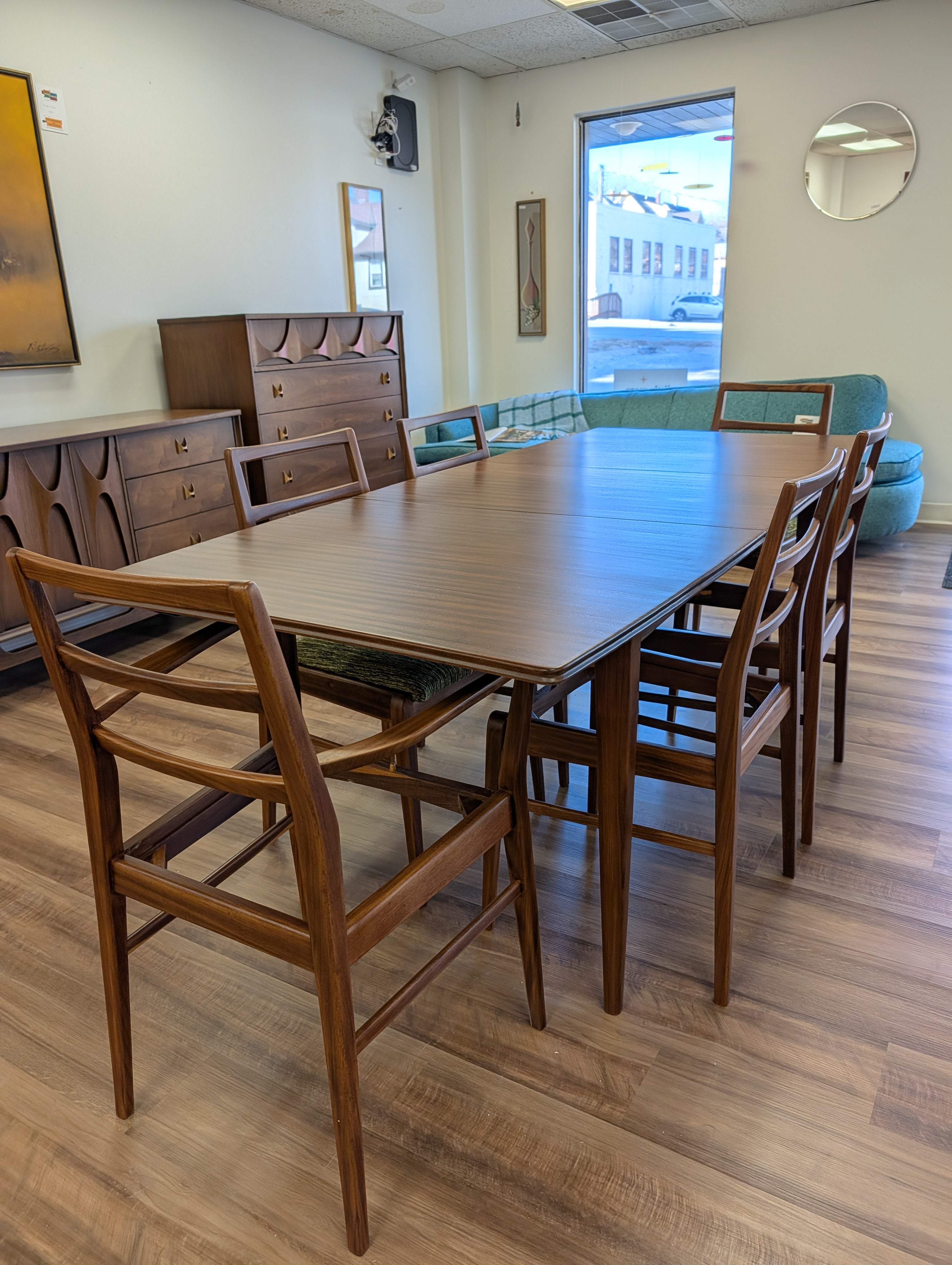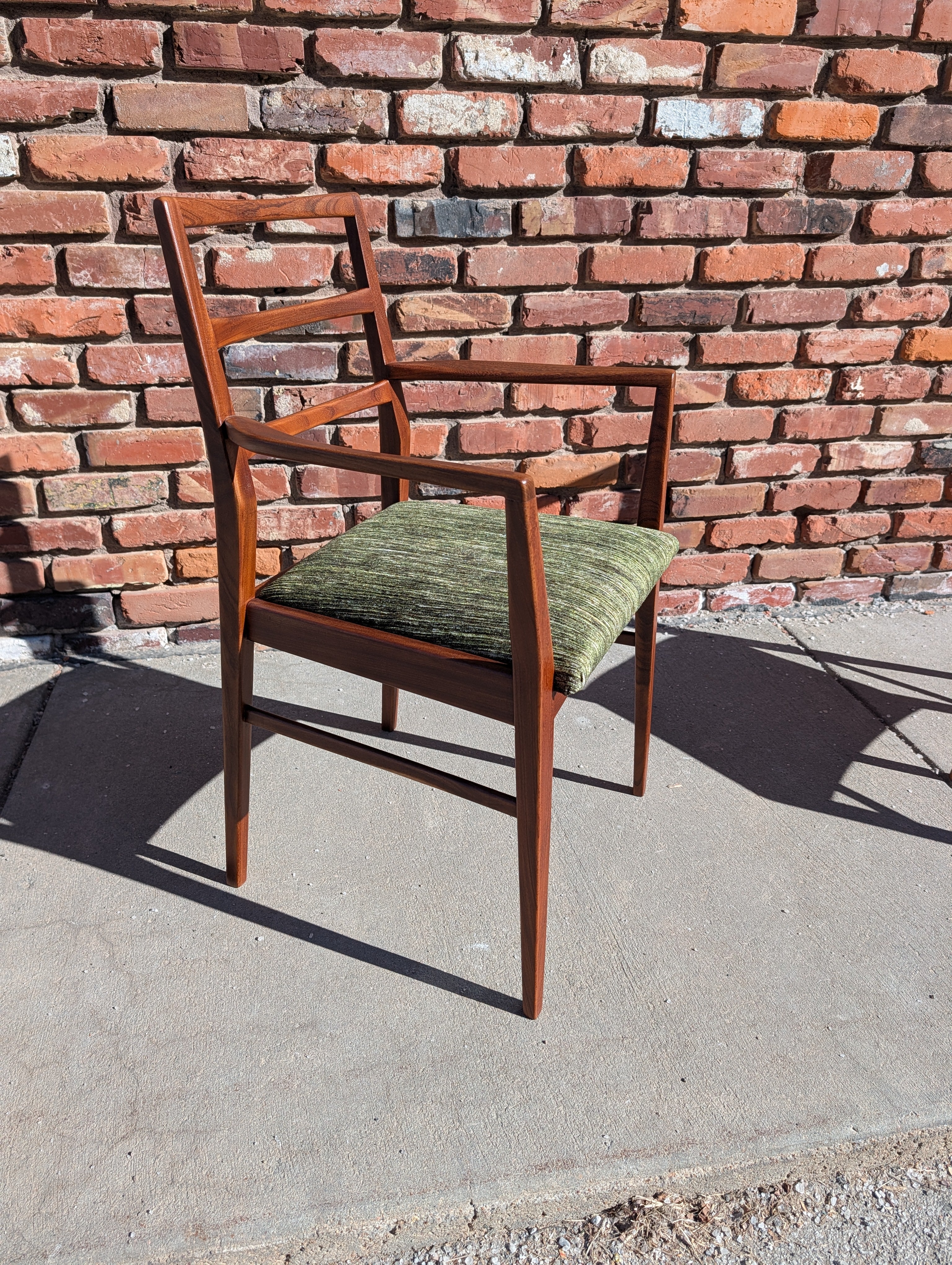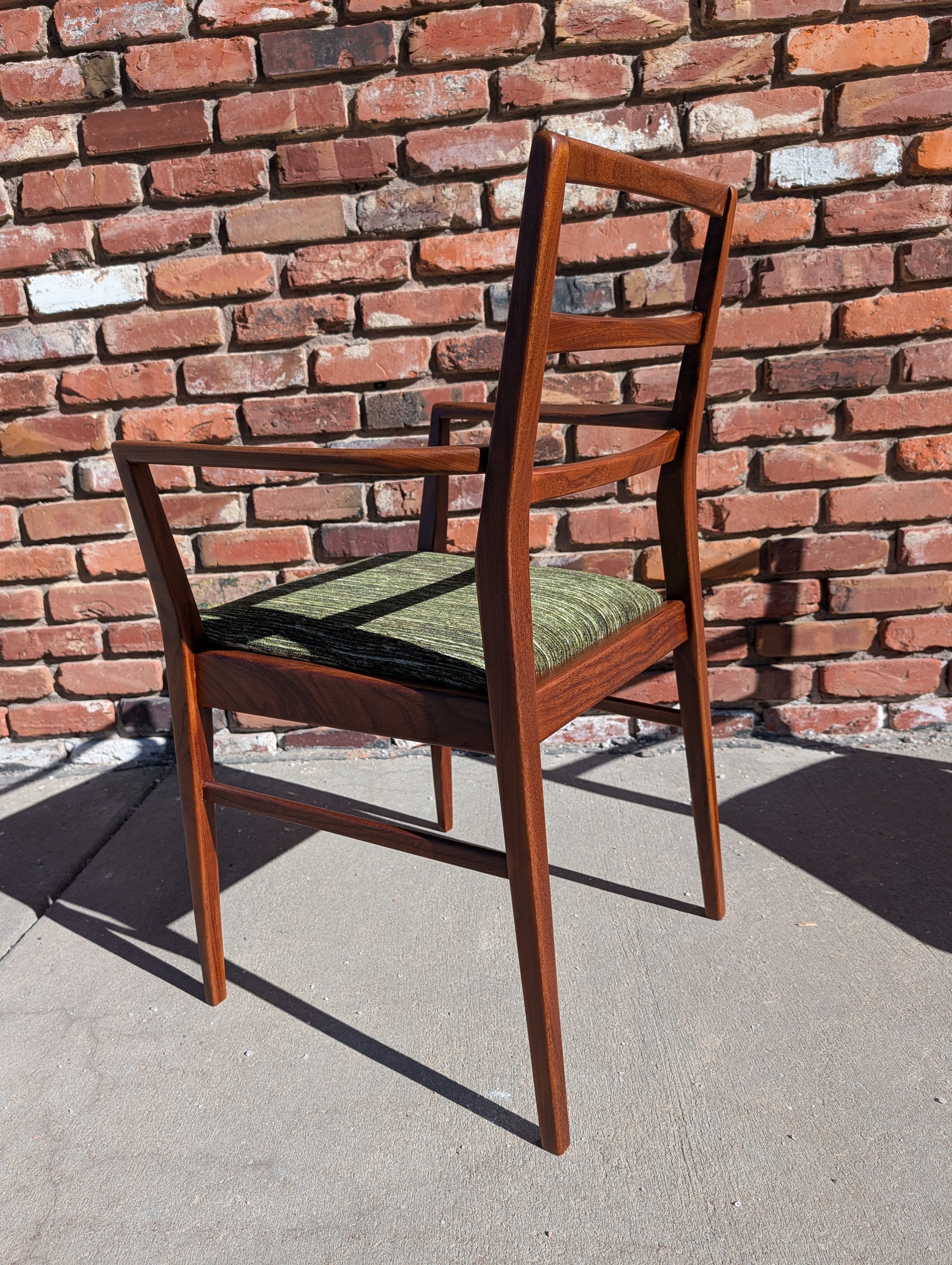 You've probably seen American mid century modern and maybe Danish - but what about British mid century modern! We're pleased to present a fully restored dining set crafted in solid Afromosia wood, designed by Richard Hornby for Fyne Ladye Furniture in the 1960s! This set is special, not only because it not often seen in the United States, but also because of the way it was designed. The leaf nests easily within the table and you can even remove the table top on either side! The 6 chairs include two captains chairs and four side chairs. Refreshed with new green chenille upholstery, you can actually pop the seats on and off of a single dowel.