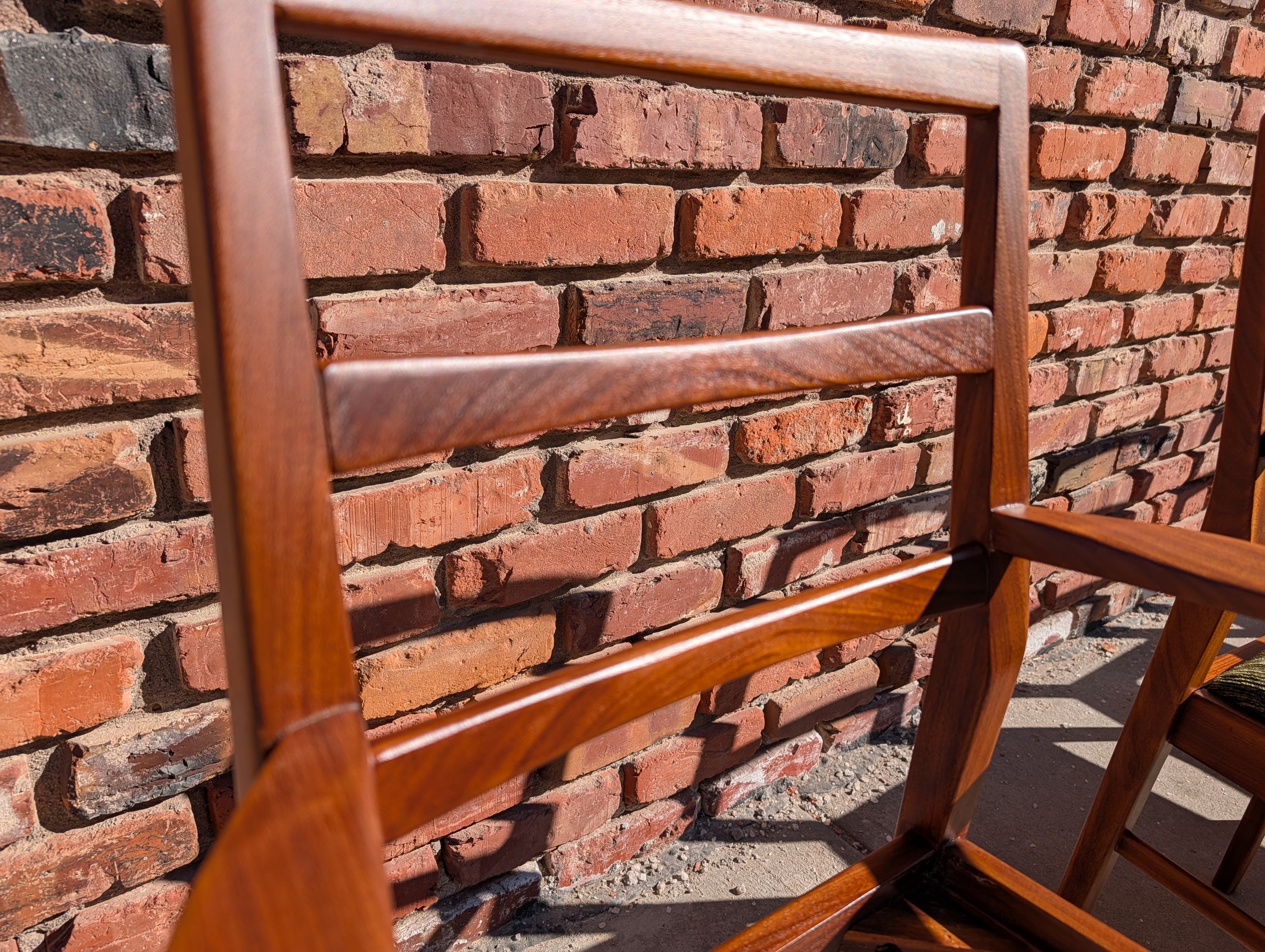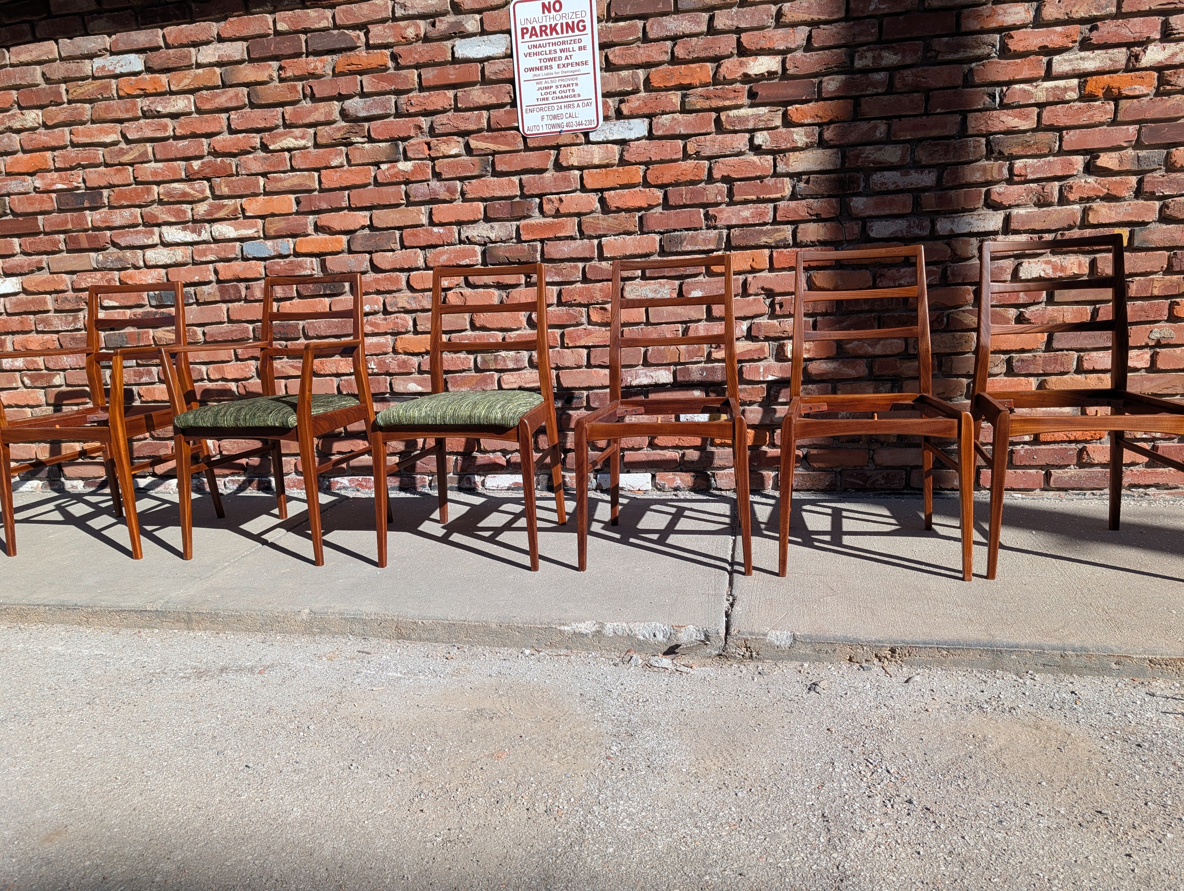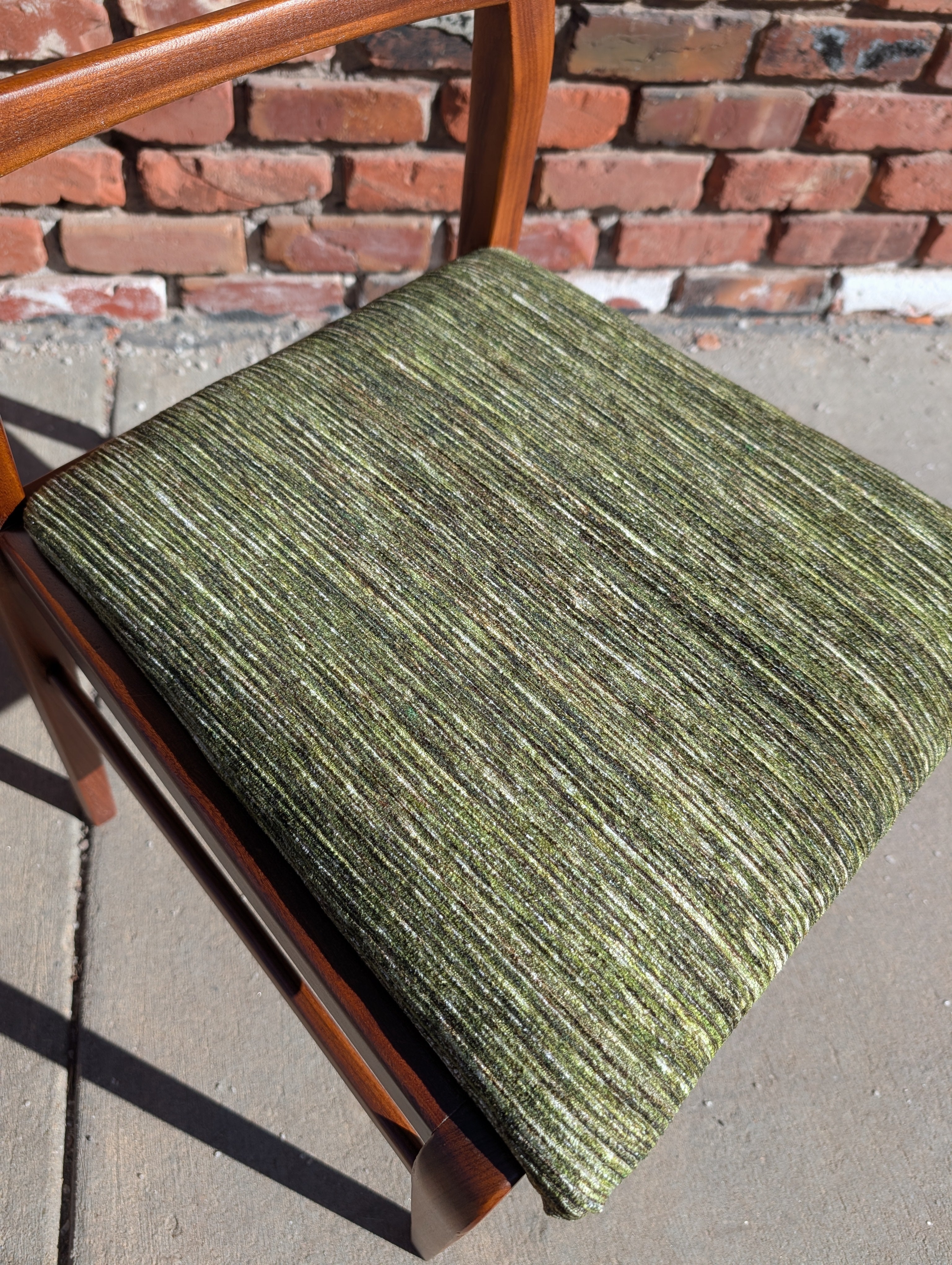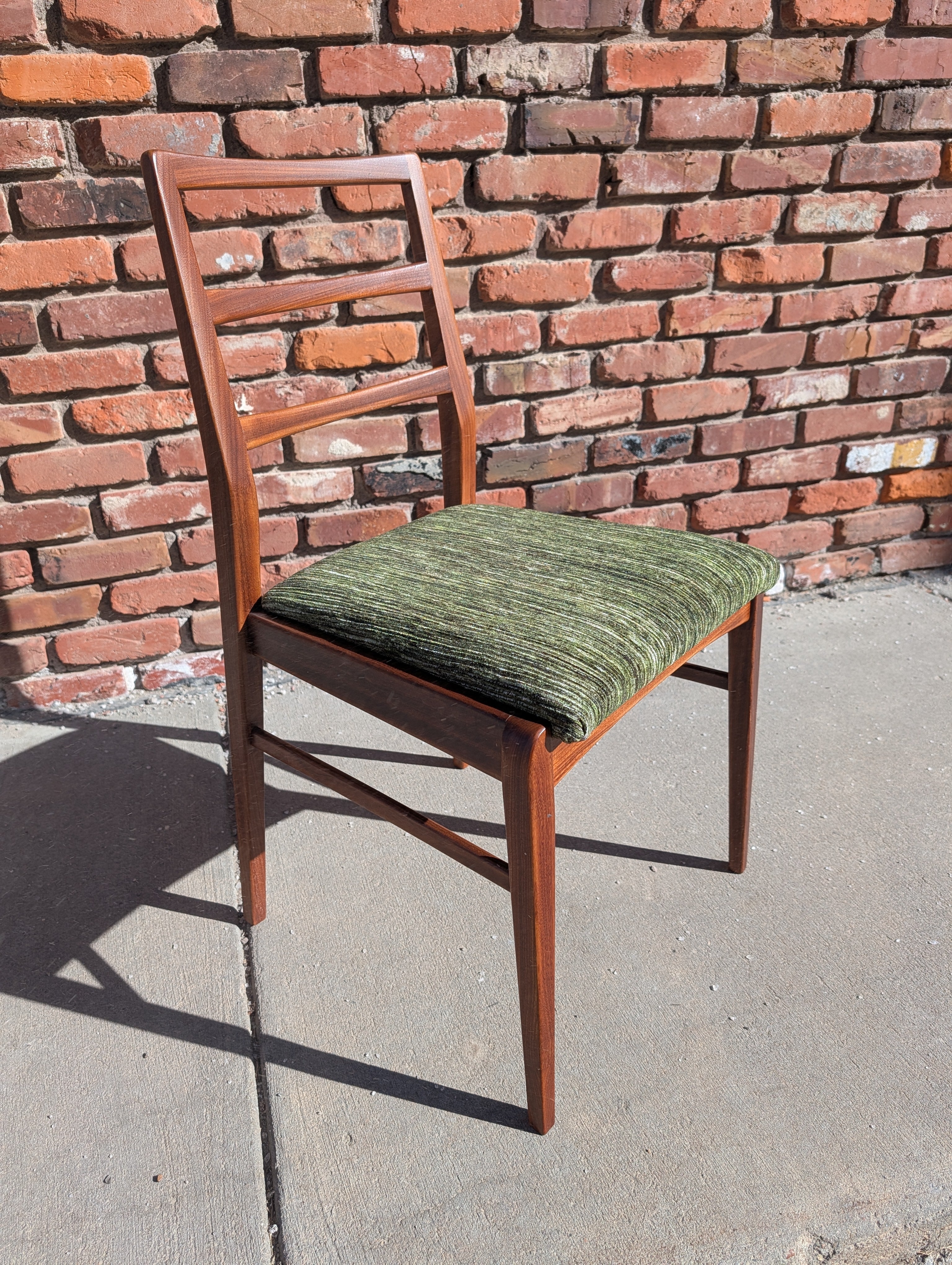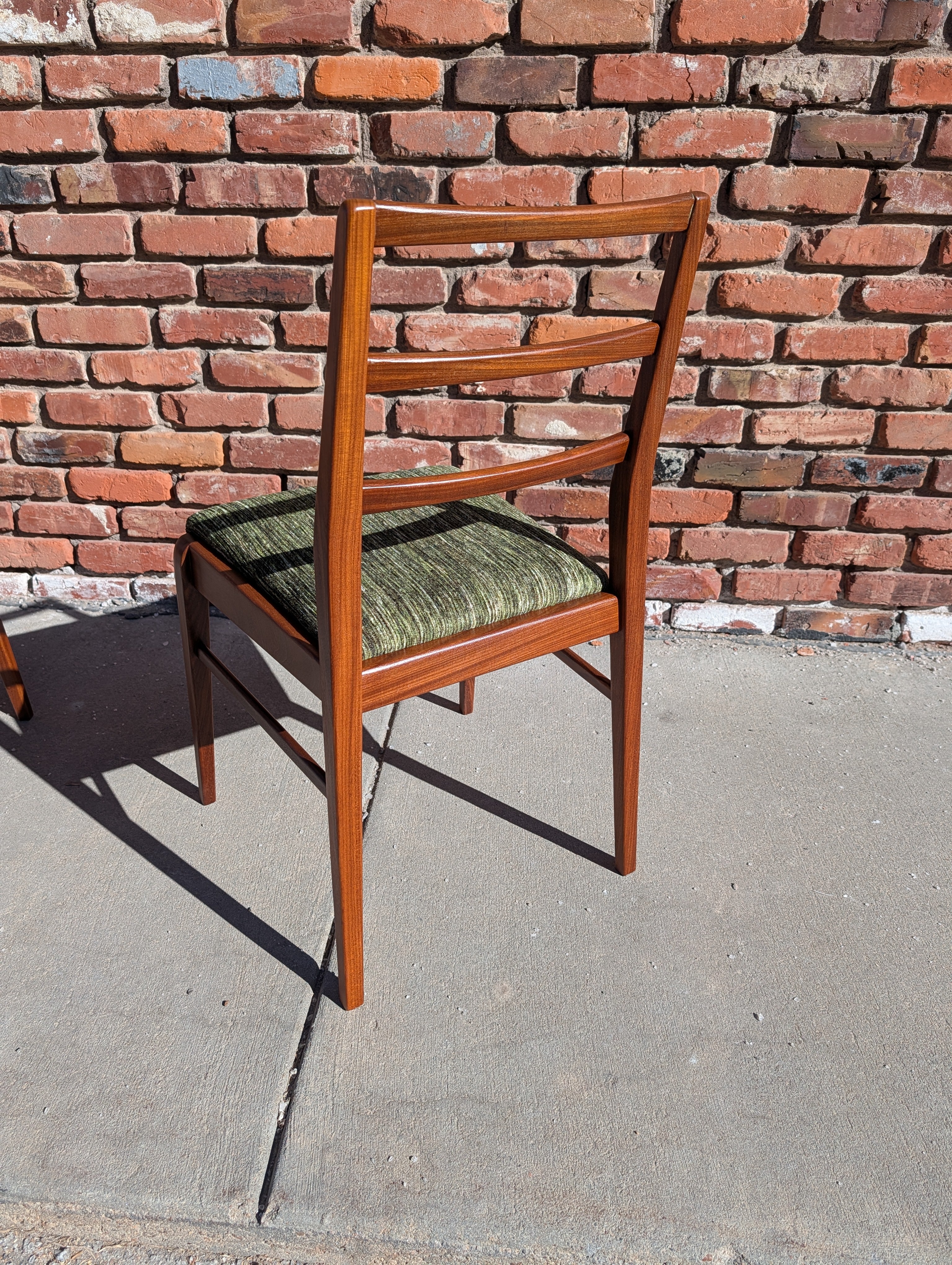 You've probably seen American mid century modern and maybe Danish - but what about British mid century modern! We're pleased to present a fully restored dining set crafted in solid Afromosia wood, designed by Richard Hornby for Fyne Ladye Furniture in the 1960s! This set is special, not only because it not often seen in the United States, but also because of the way it was designed. The leaf nests easily within the table and you can even remove the table top on either side! The 6 chairs include two captains chairs and four side chairs. Refreshed with new green chenille upholstery, you can actually pop the seats on and off of a single dowel.