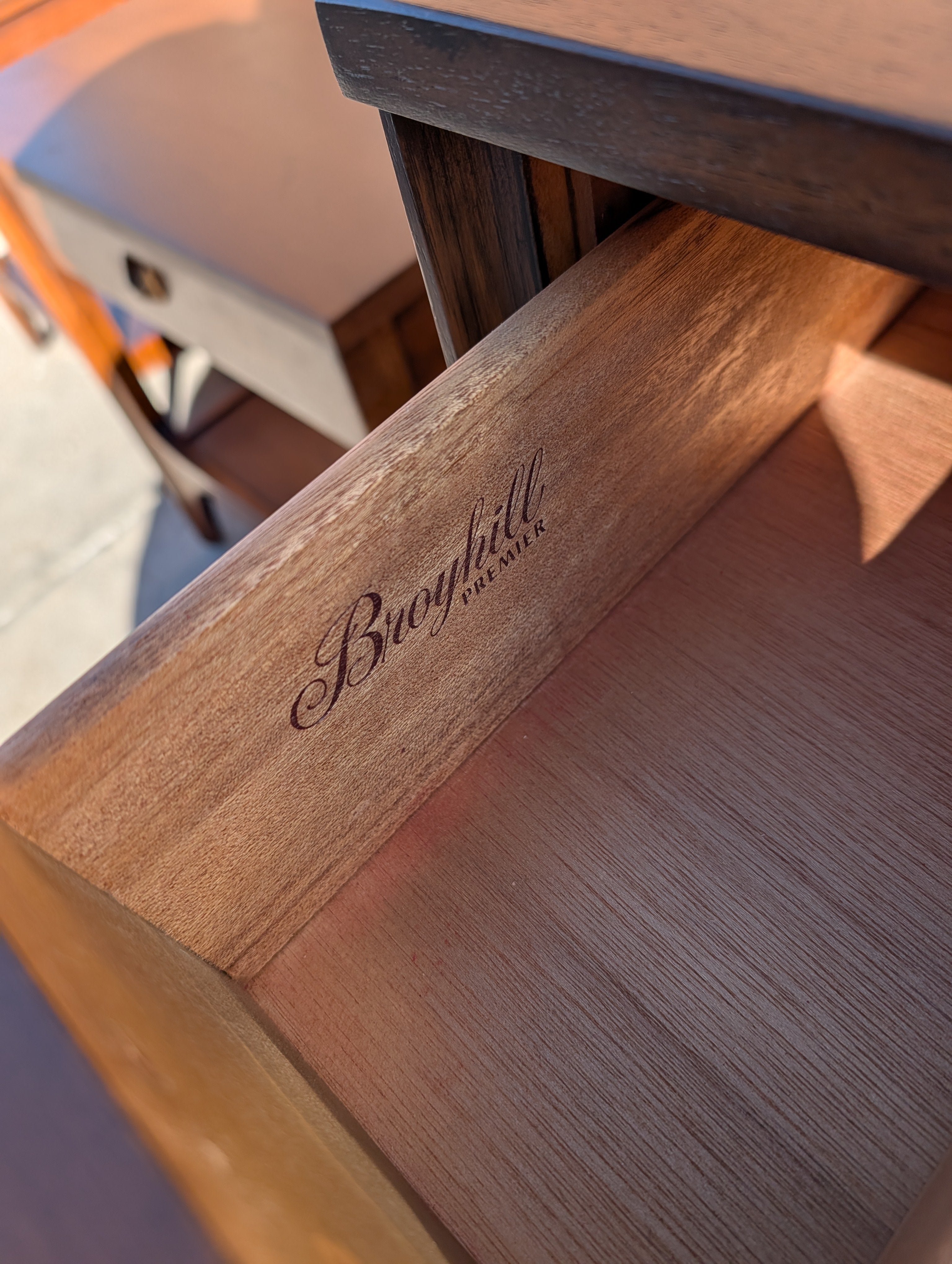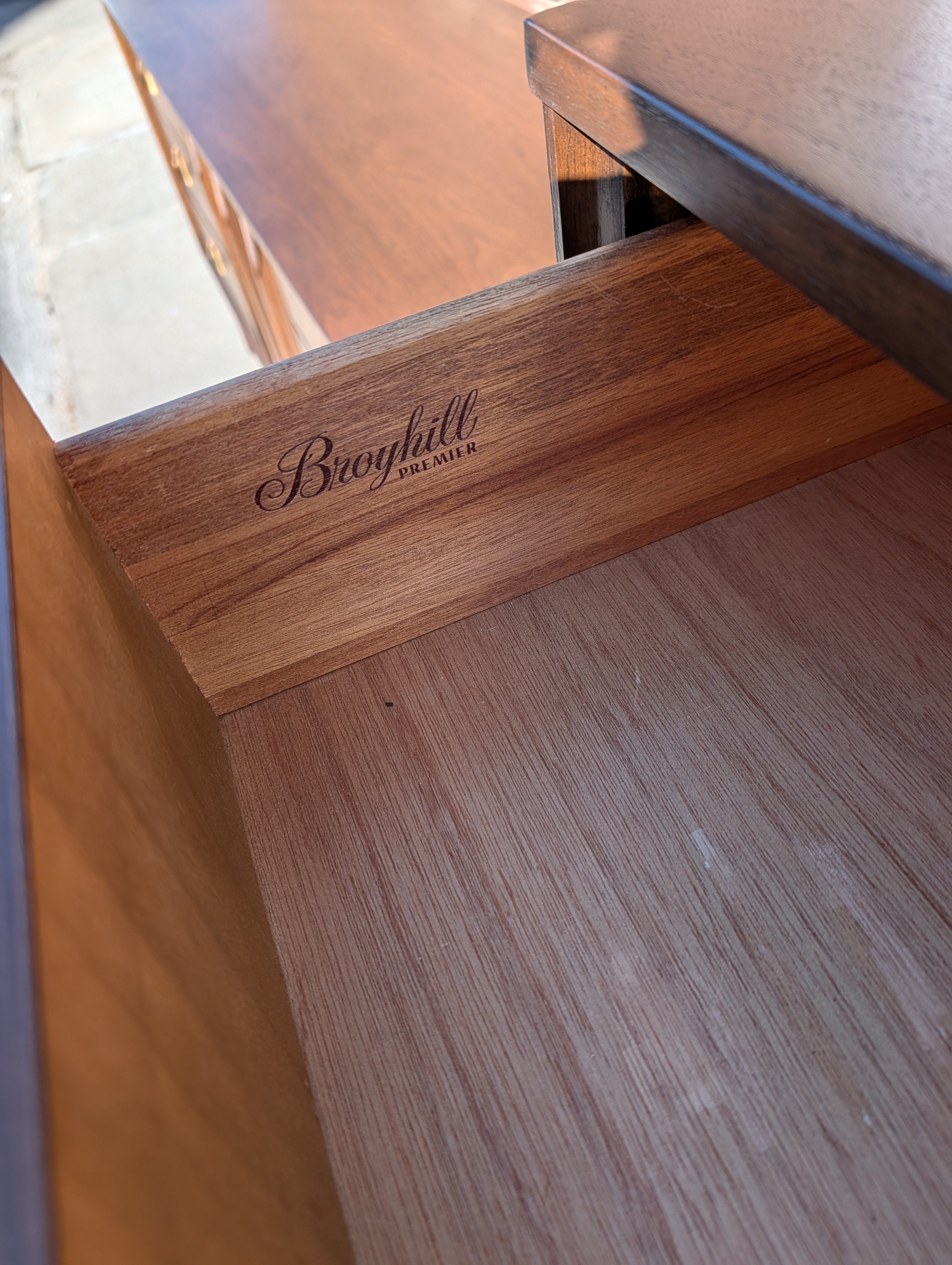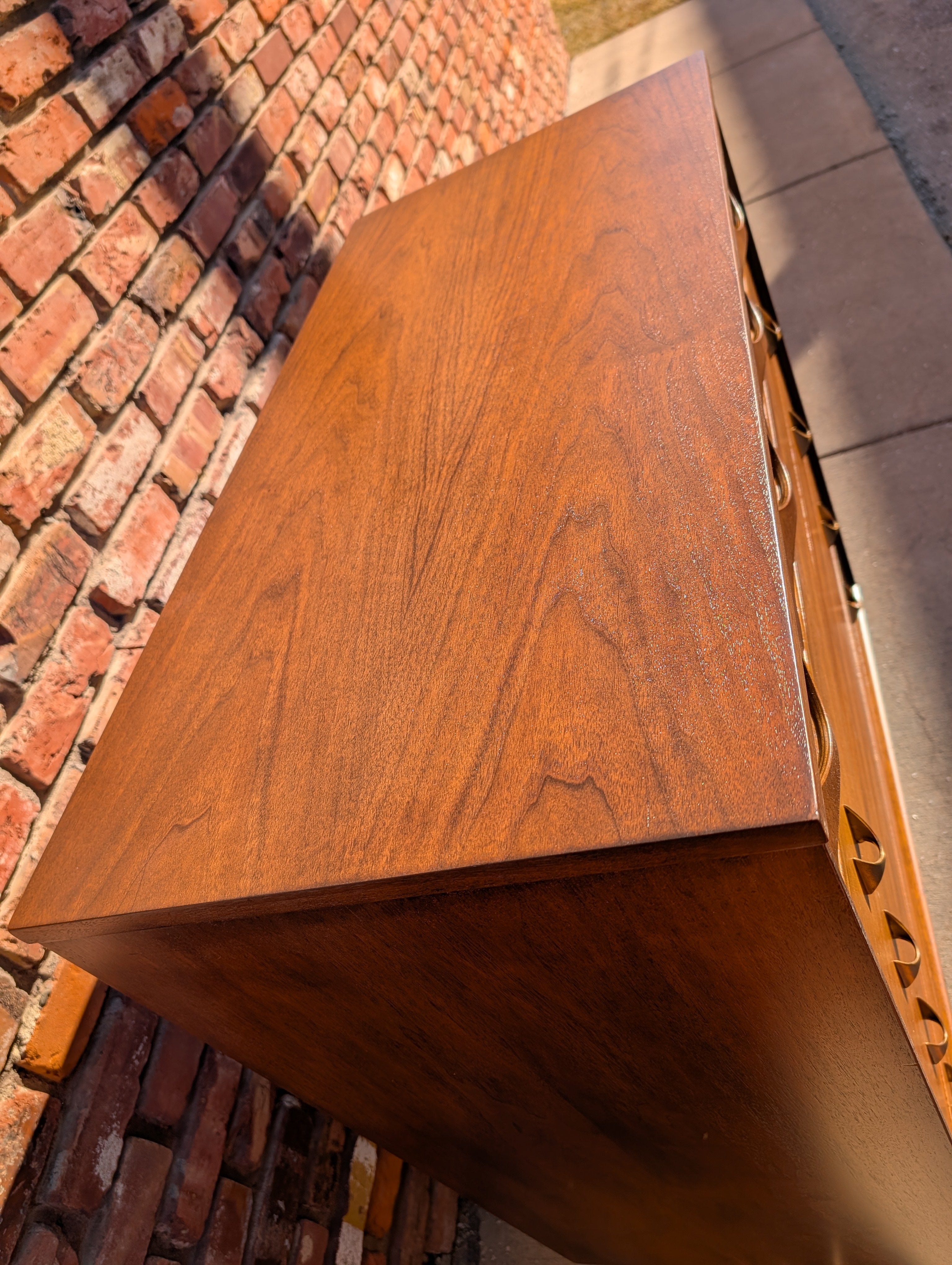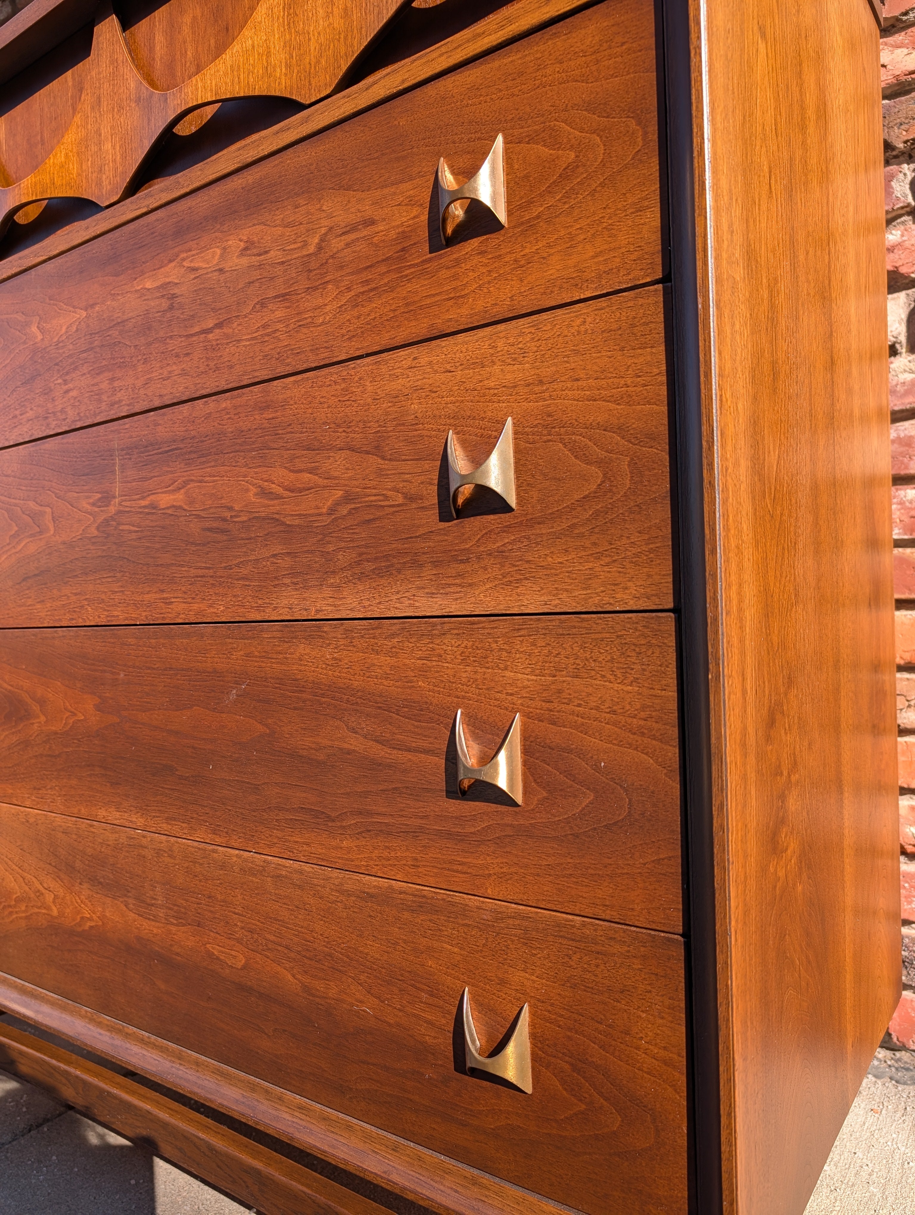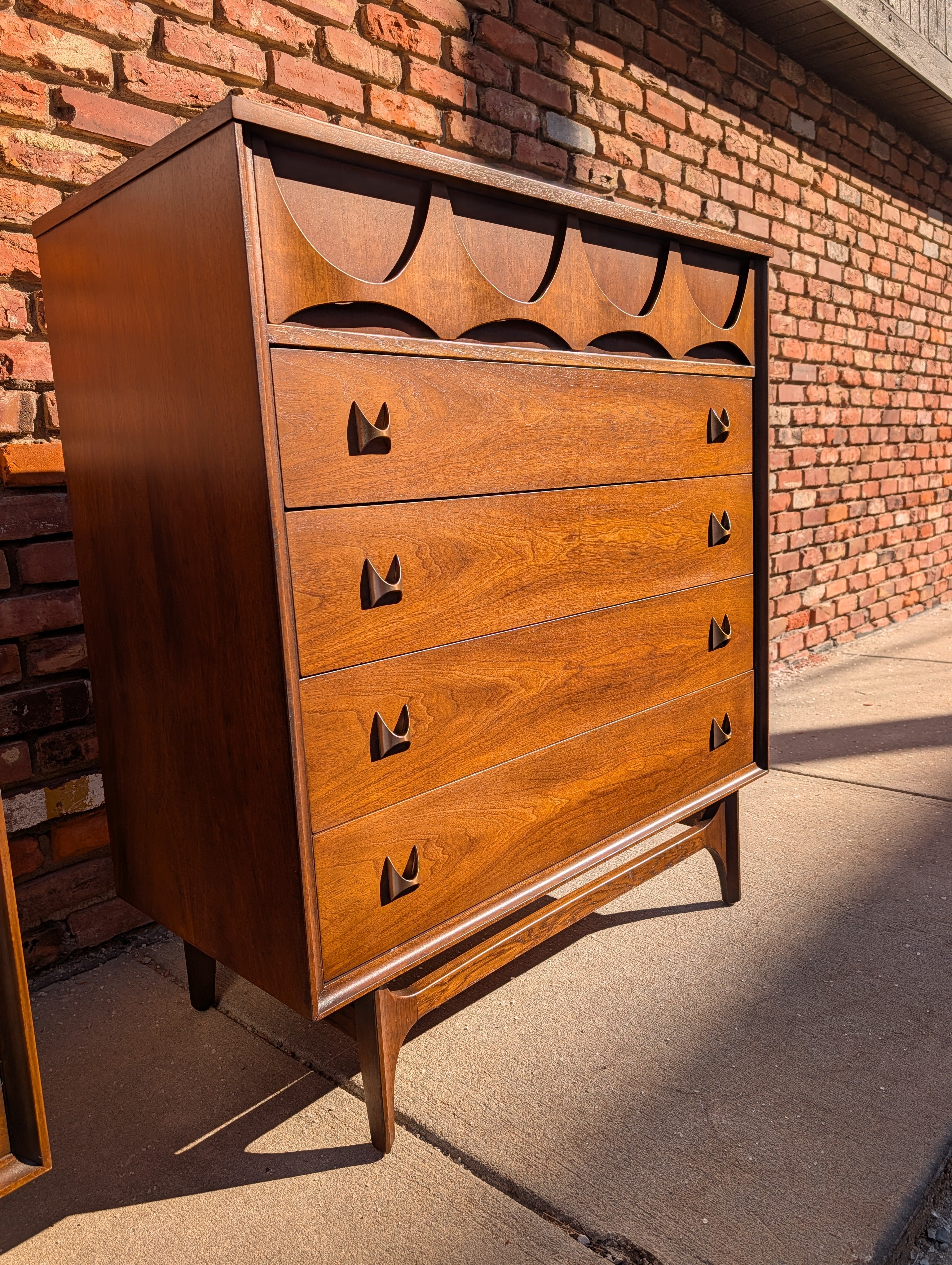 This tallboy five drawer dresser is from the distinctive Broyhill "Brasilia" line. It has been professionally refinished (top and touch up) and is in excellent condition with very minimal signs of wear.