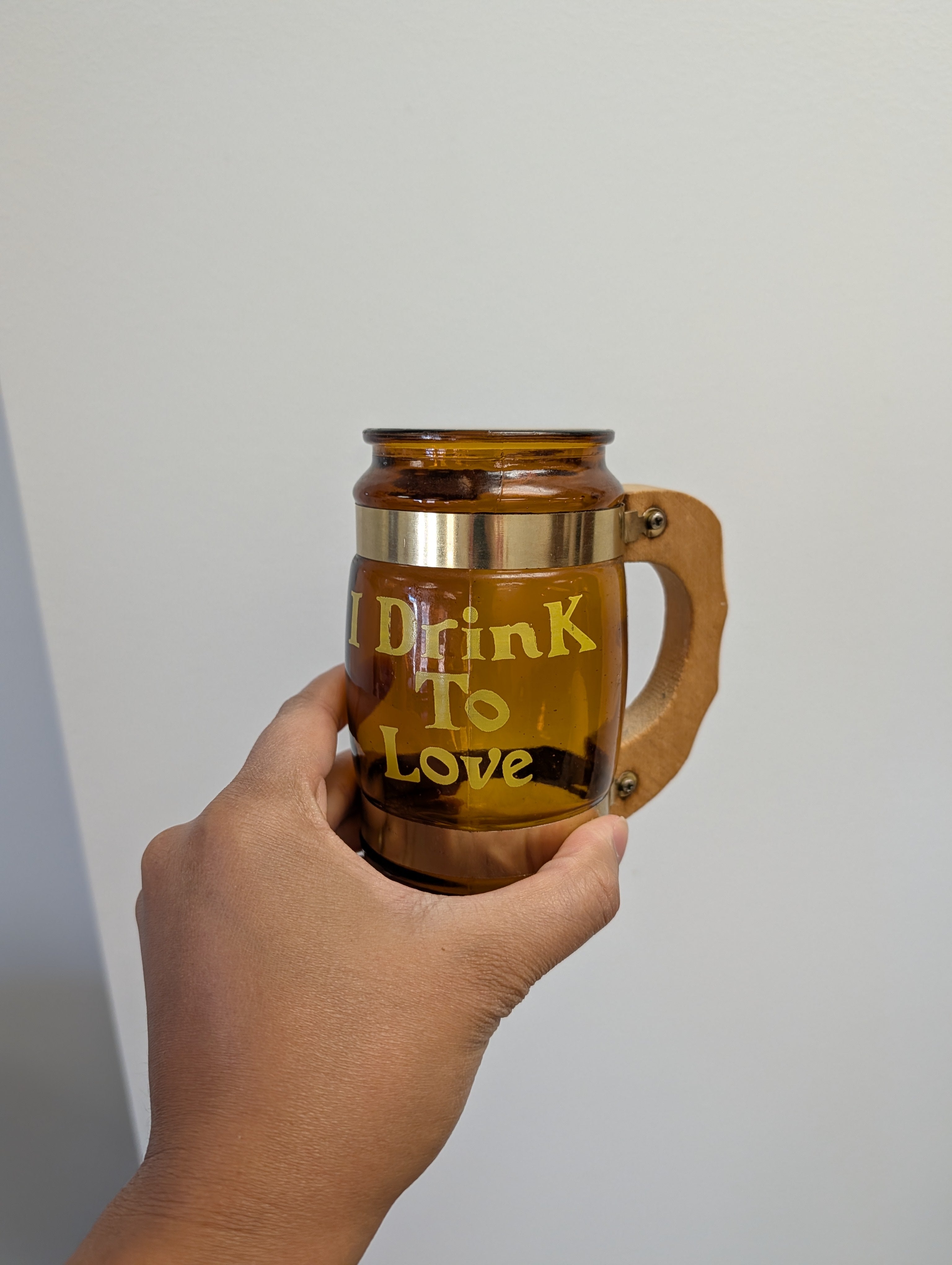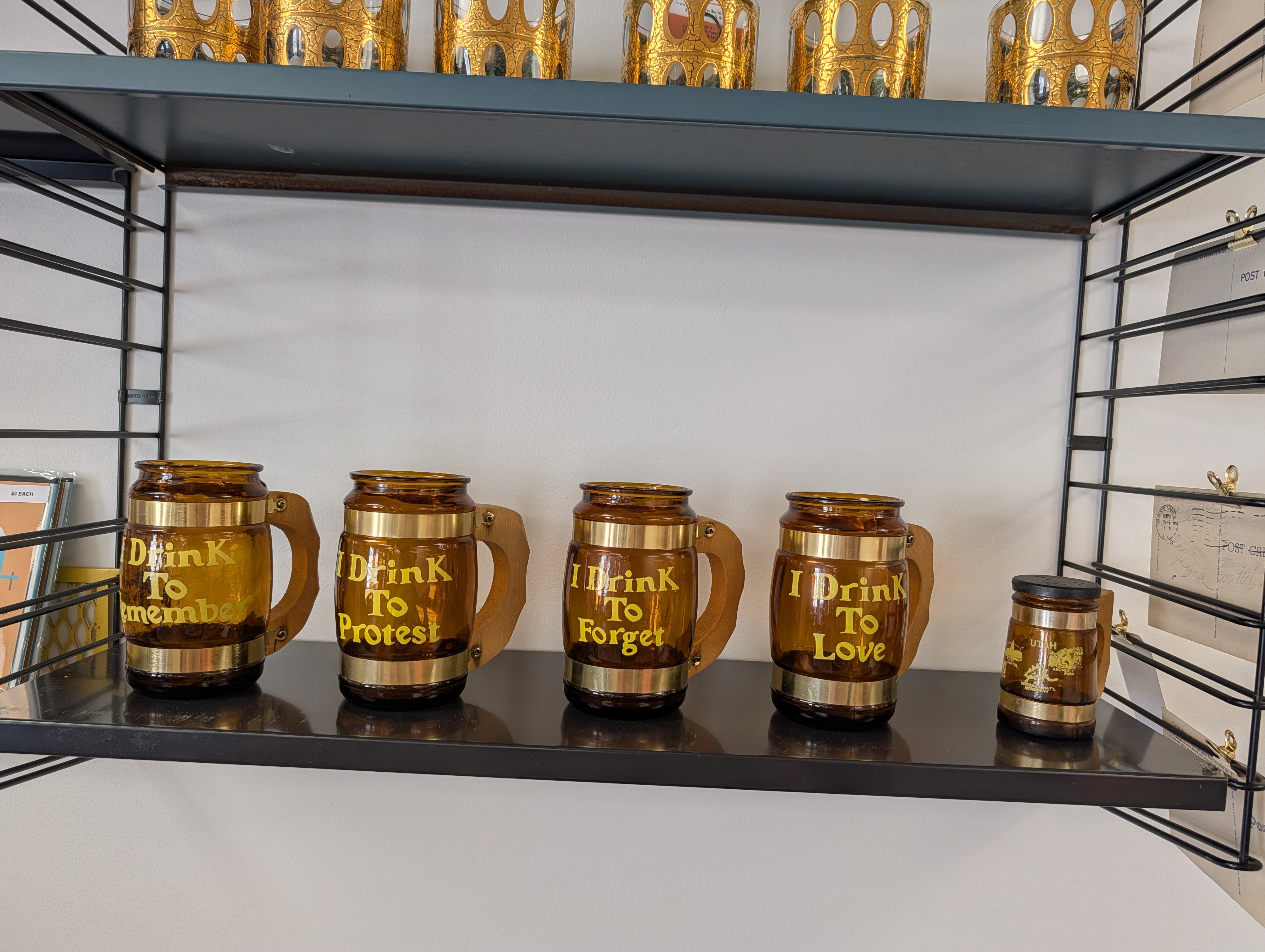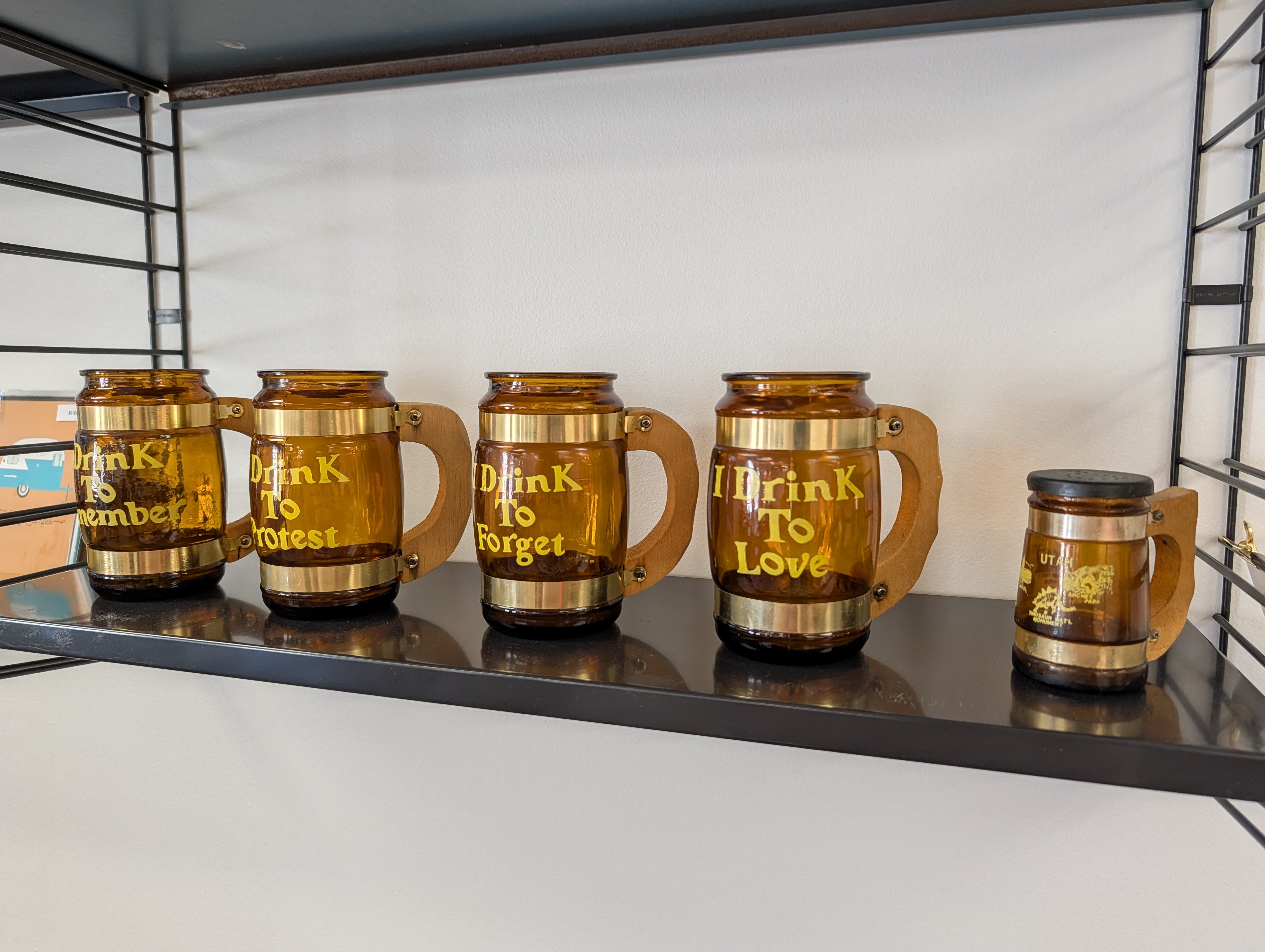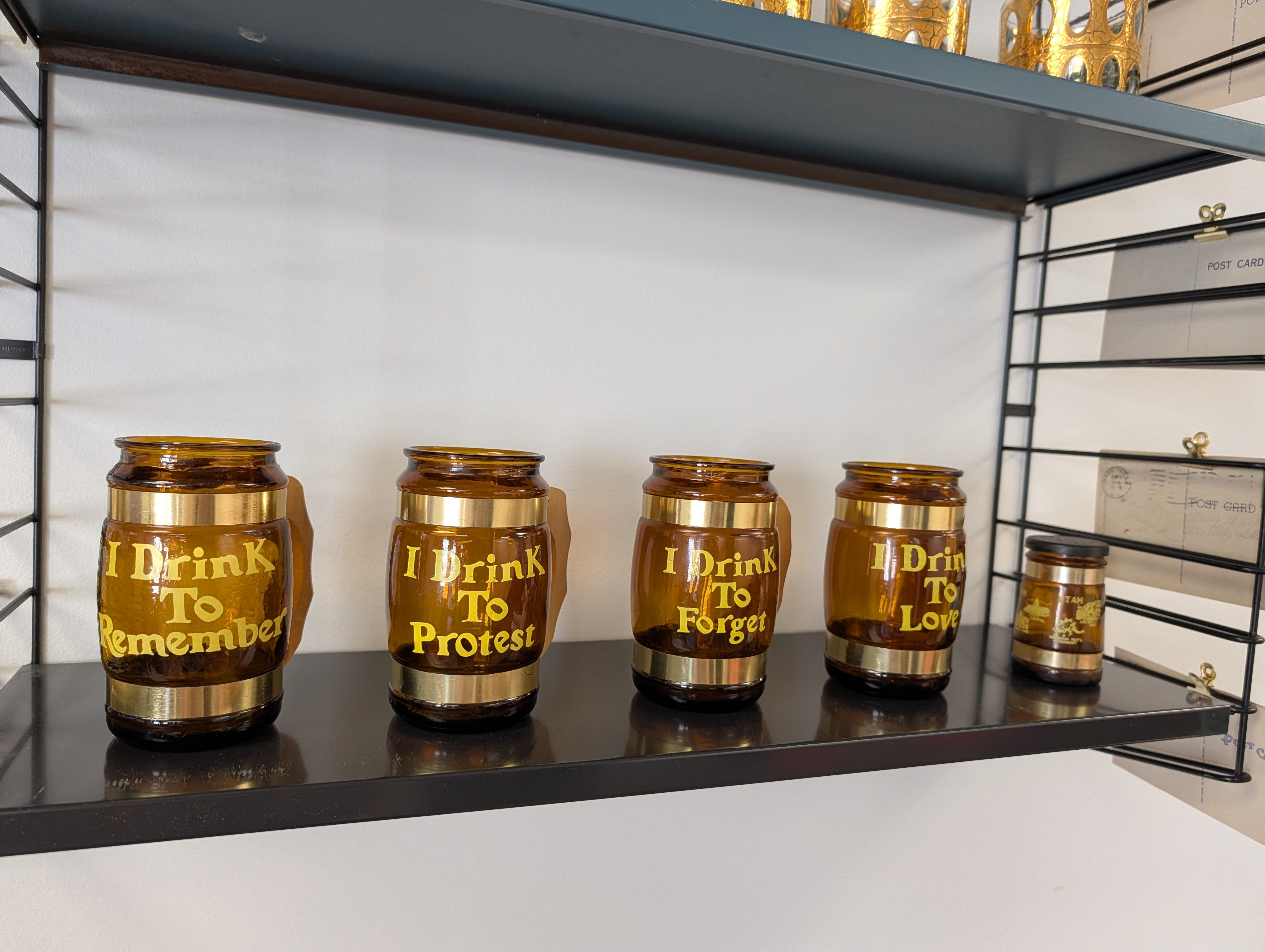 This listing is for a set of 4 amber Siesta Ware beer mugs. Each one has a saying in yellow font "I Drink To Remember", "I Drink To Protest", "I Drink To Protest", and "I Drink To Love". The mugs are in great condition - hand washing recommended.