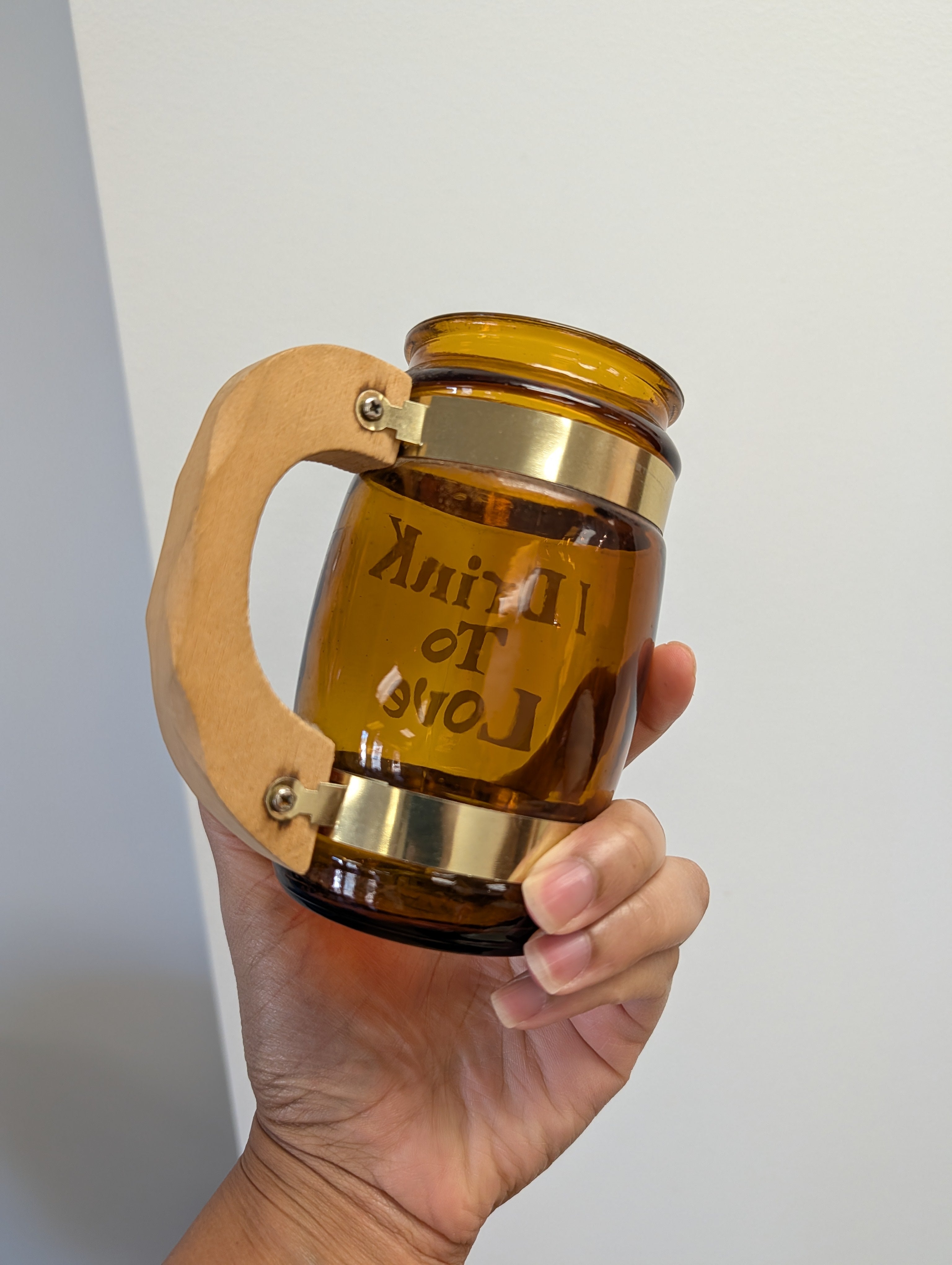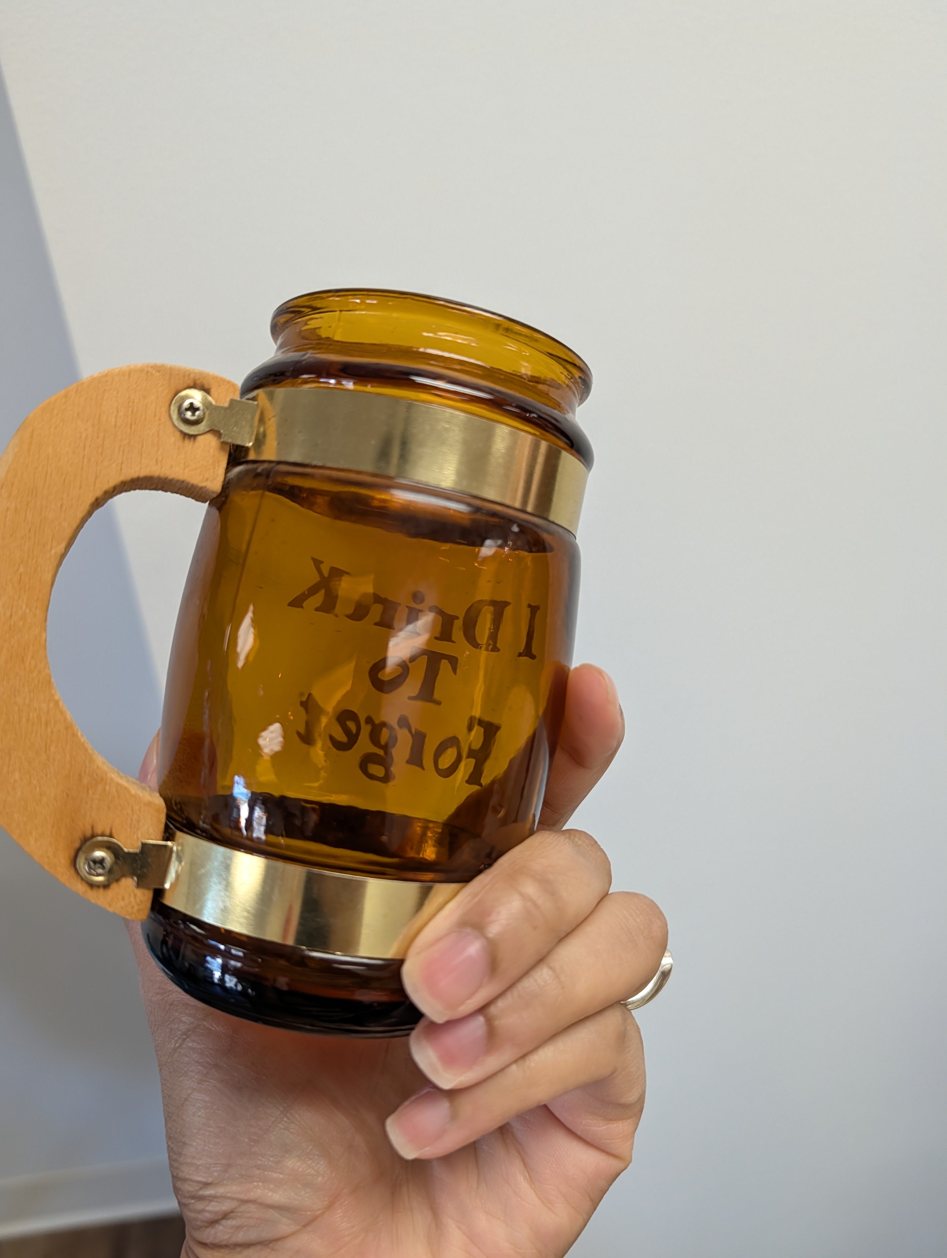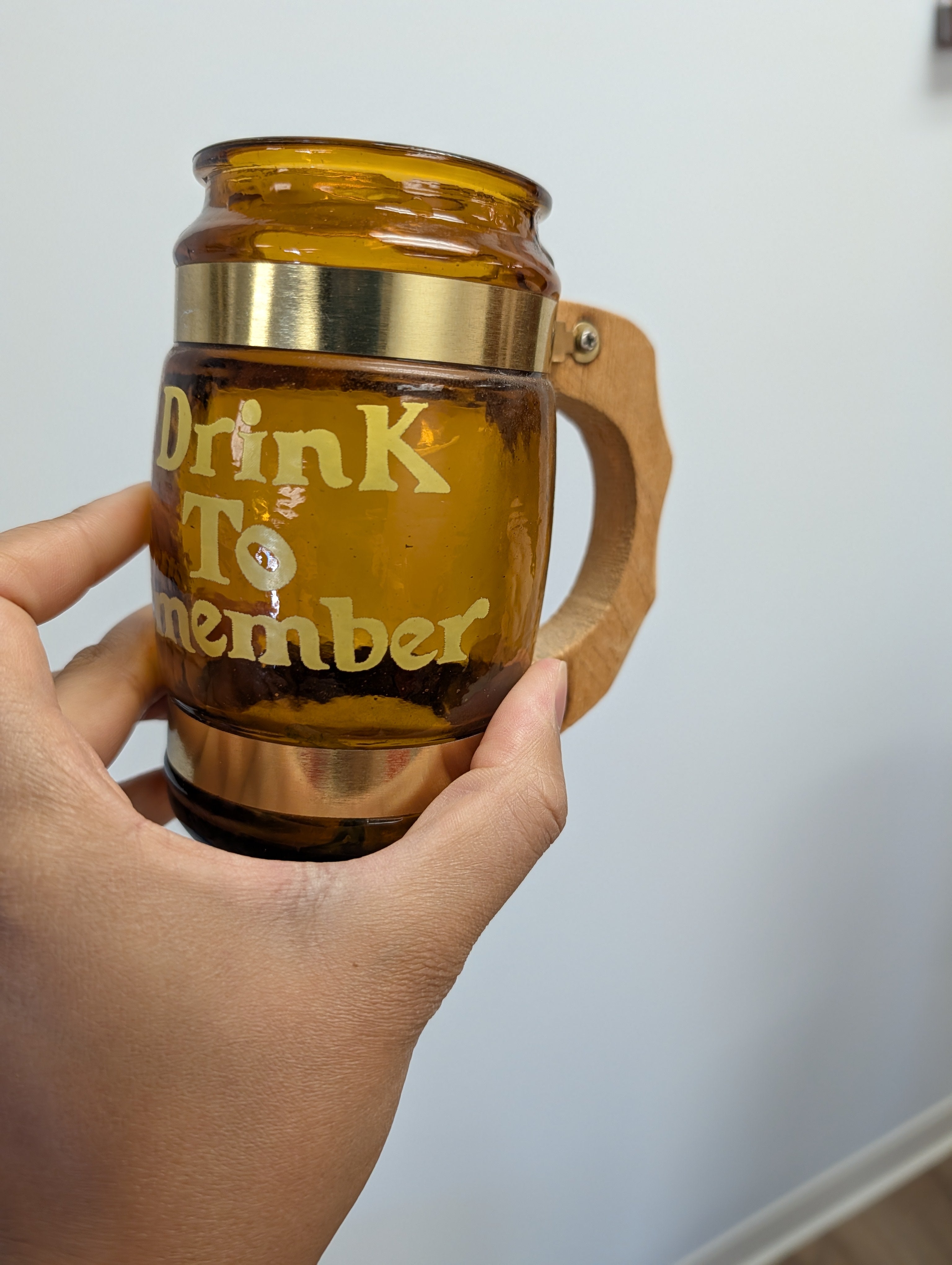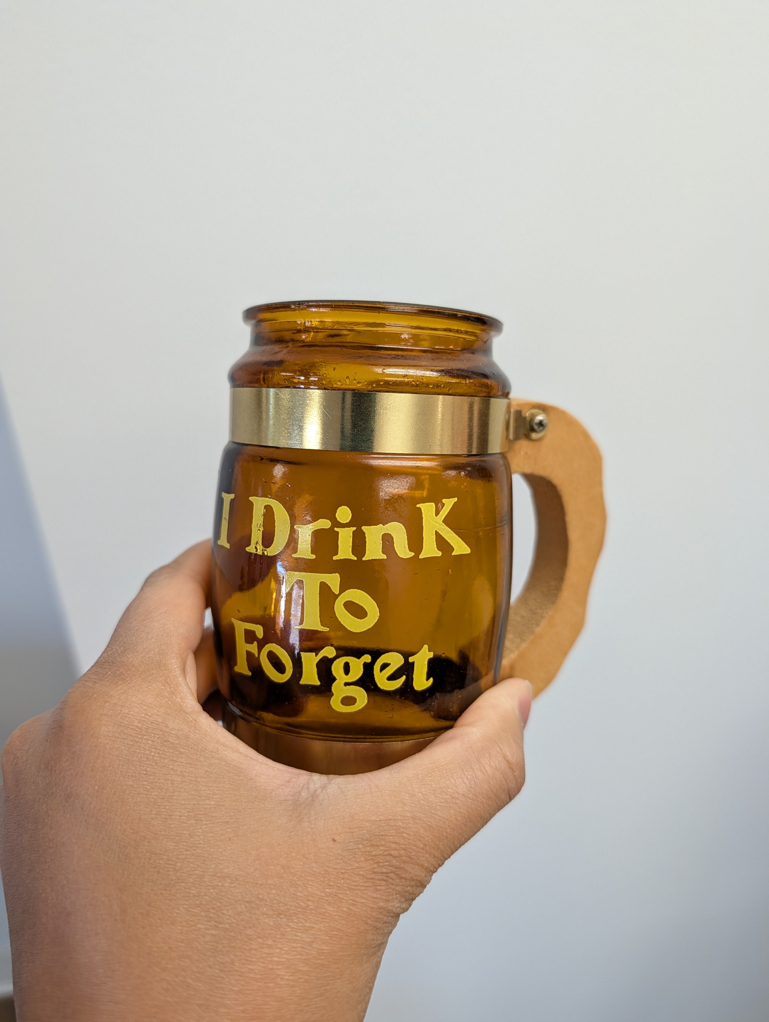 This listing is for a set of 4 amber Siesta Ware beer mugs. Each one has a saying in yellow font "I Drink To Remember", "I Drink To Protest", "I Drink To Protest", and "I Drink To Love". The mugs are in great condition - hand washing recommended.